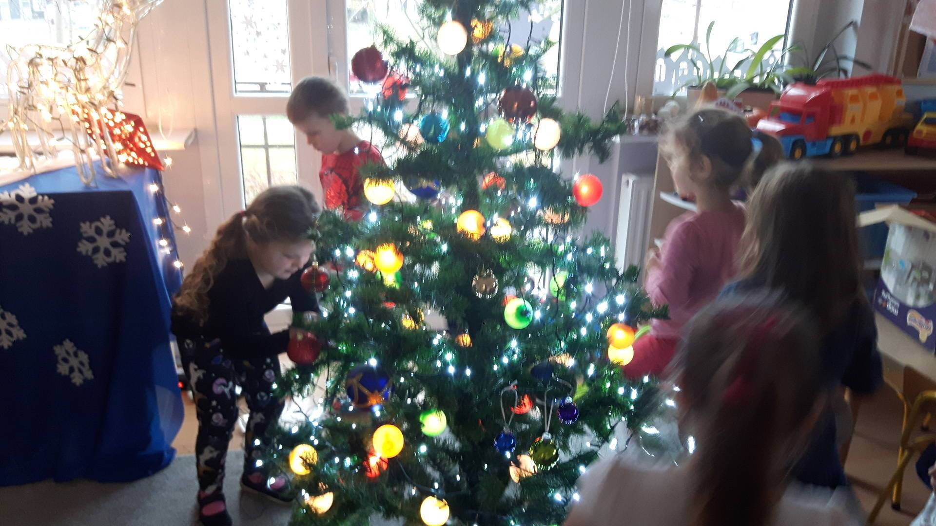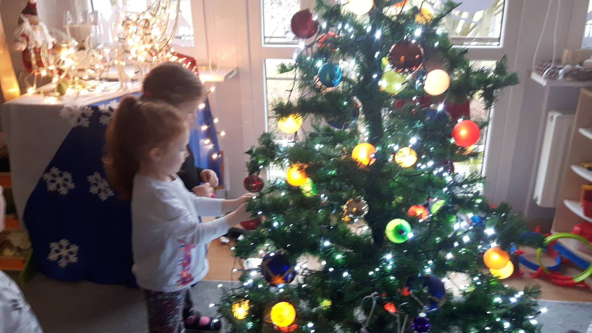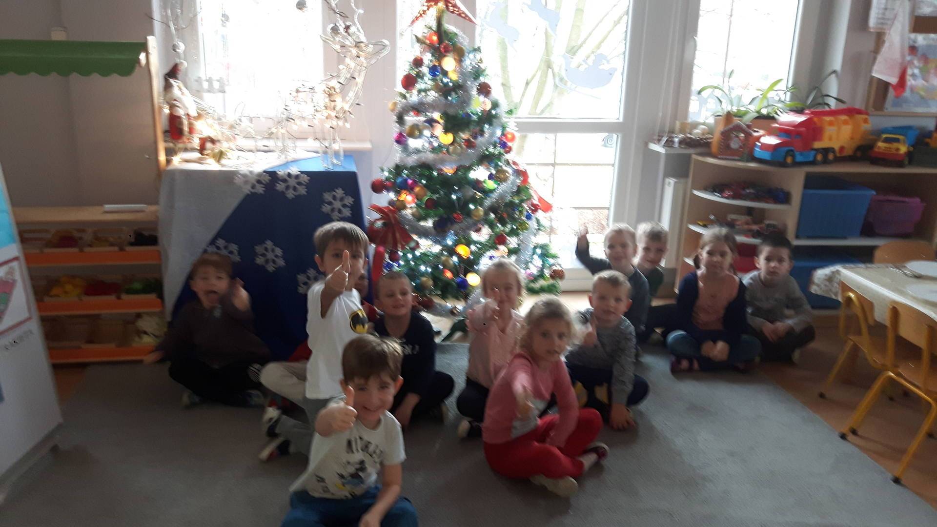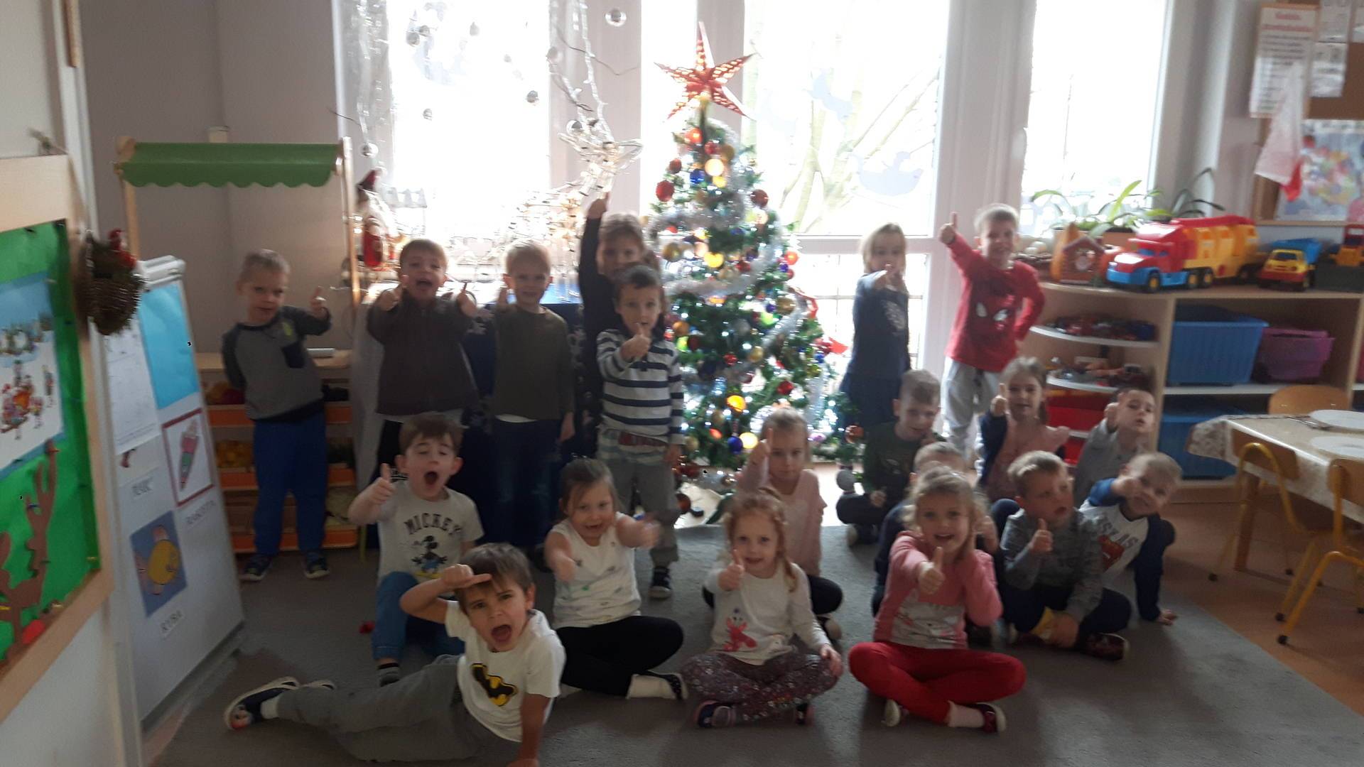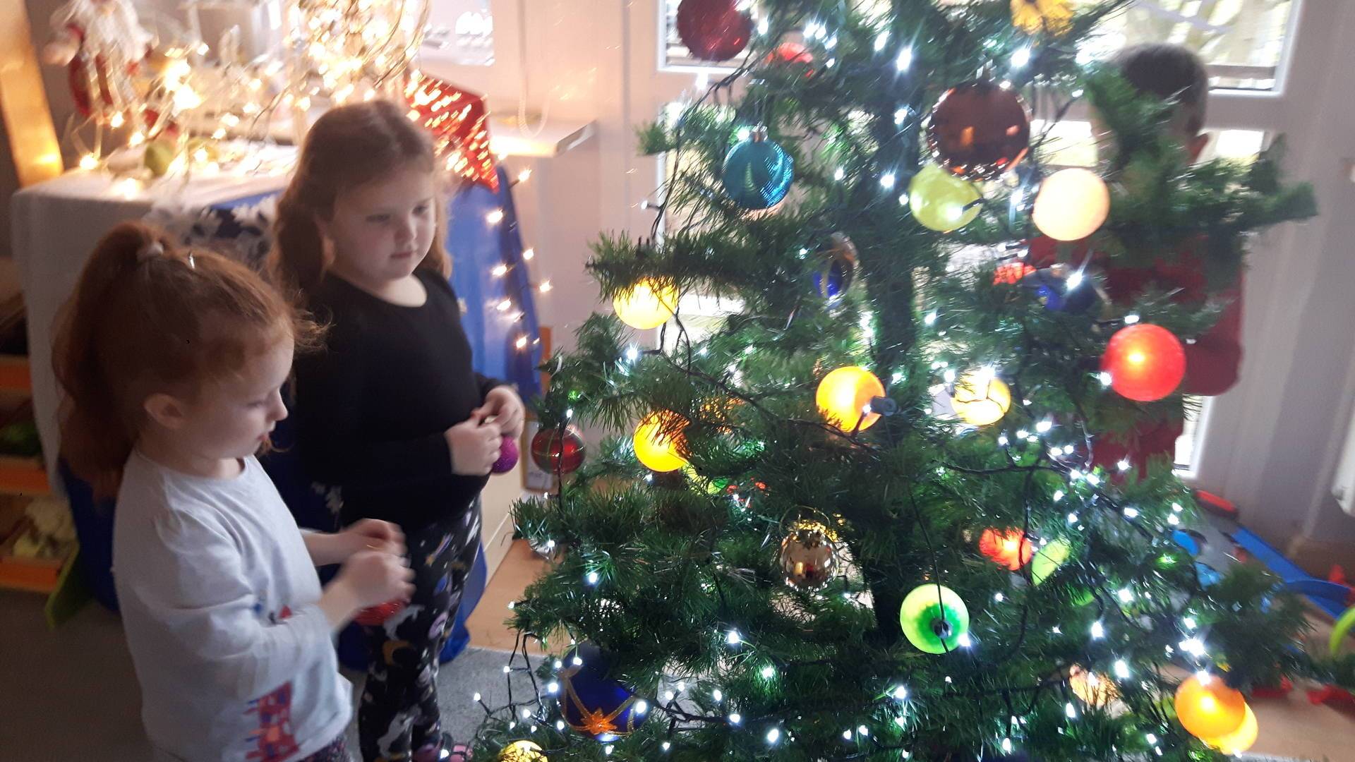 Zbliżają się święta Bożego Narodzenia a ich głównym symbolem jest choinka. I również w przedszkolu ją ubieraliśmy. Bombki, łańcuchy i lampki, każde dziecko chciało pomóc i z radością ozdabiało nasze grupowe drzewko.