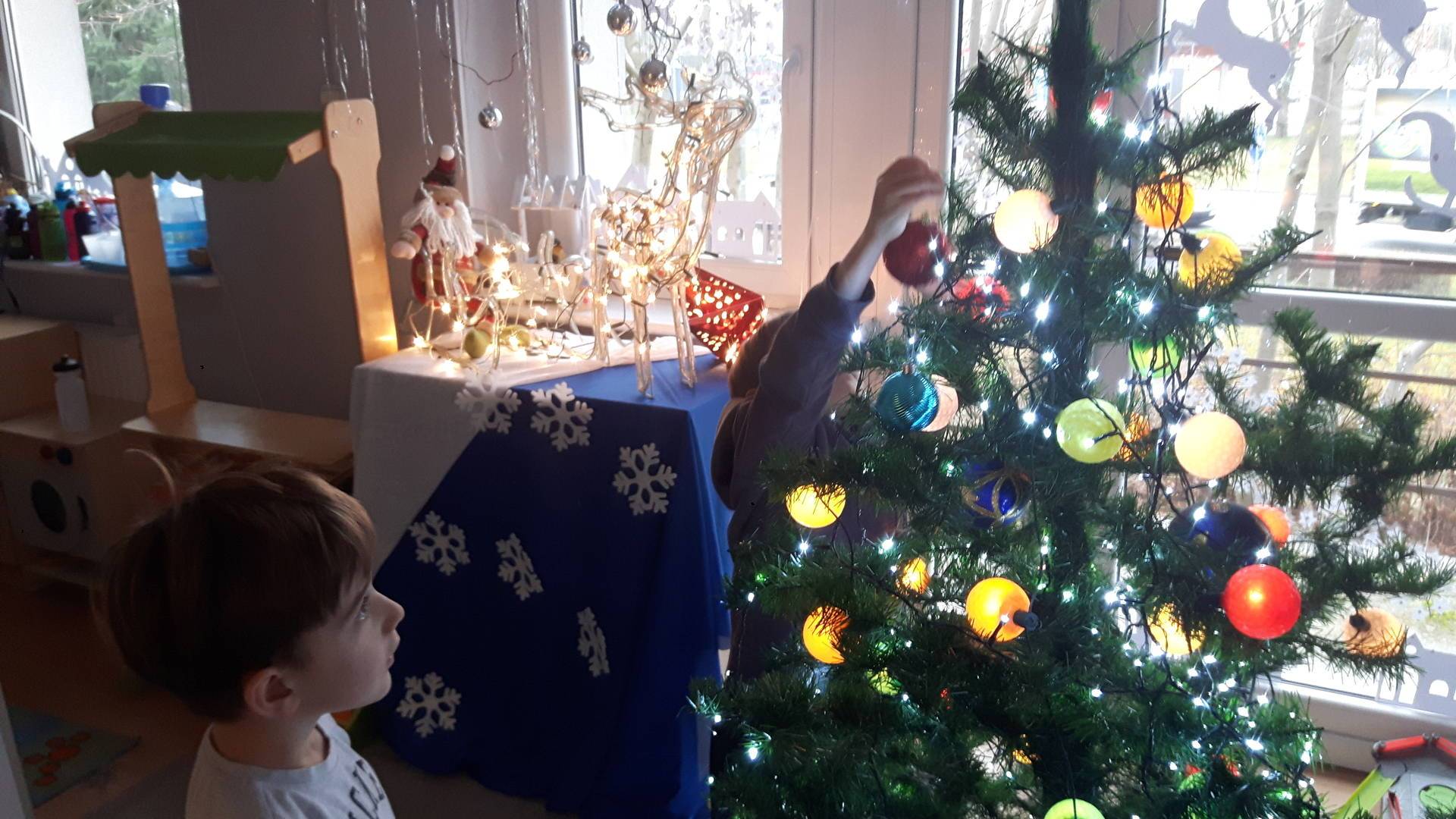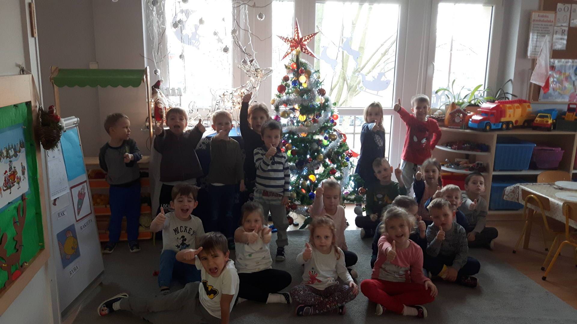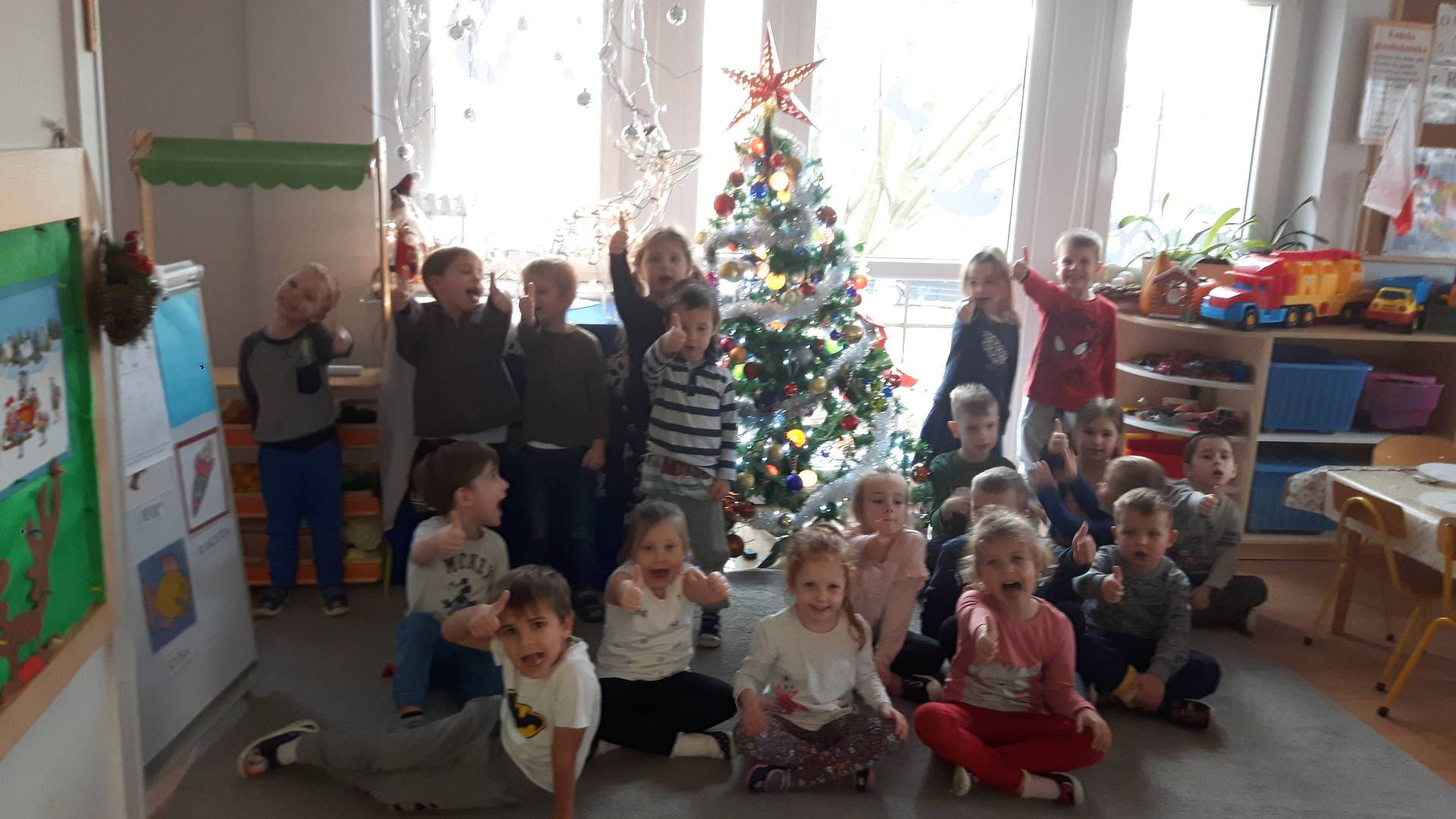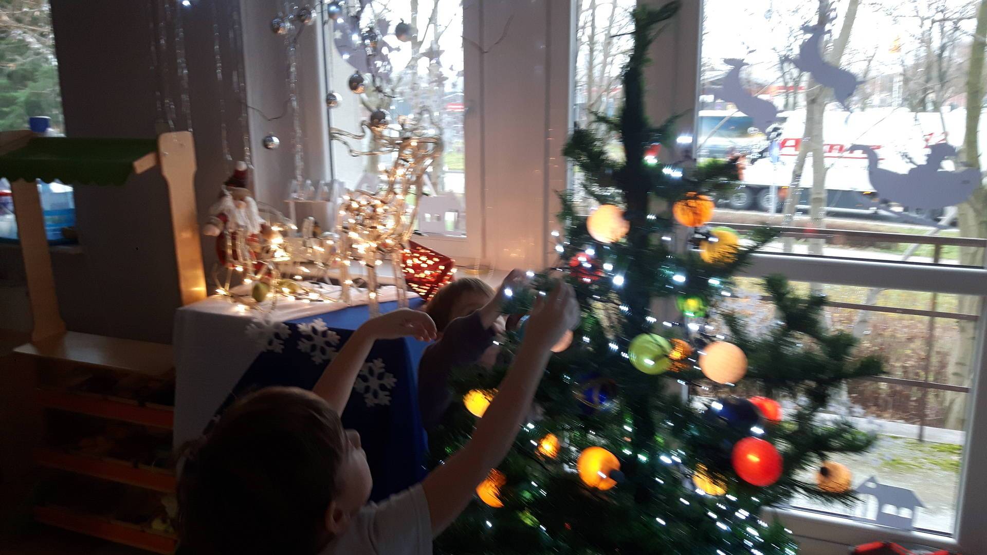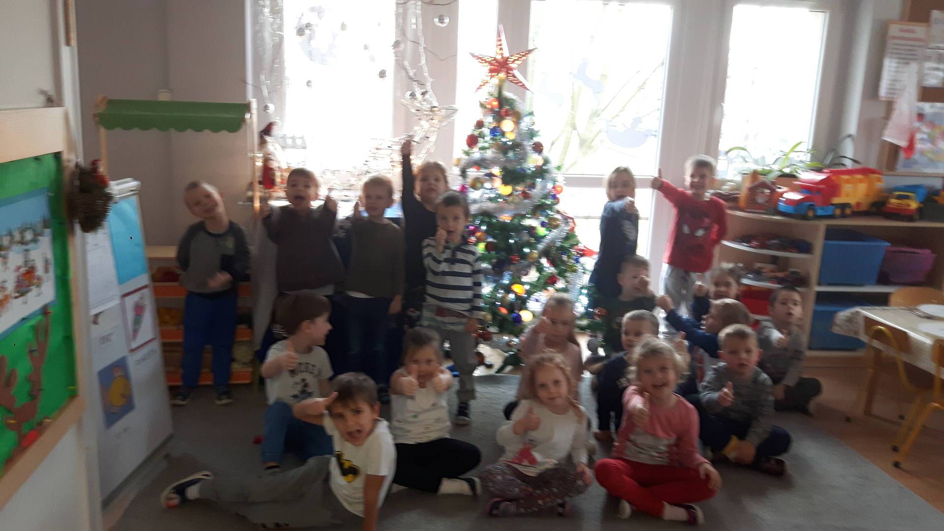 Zbliżają się święta Bożego Narodzenia a ich głównym symbolem jest choinka. I również w przedszkolu ją ubieraliśmy. Bombki, łańcuchy i lampki, każde dziecko chciało pomóc i z radością ozdabiało nasze grupowe drzewko.