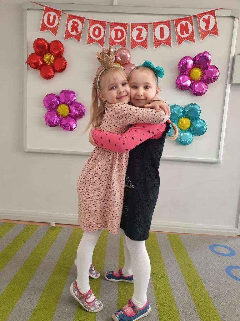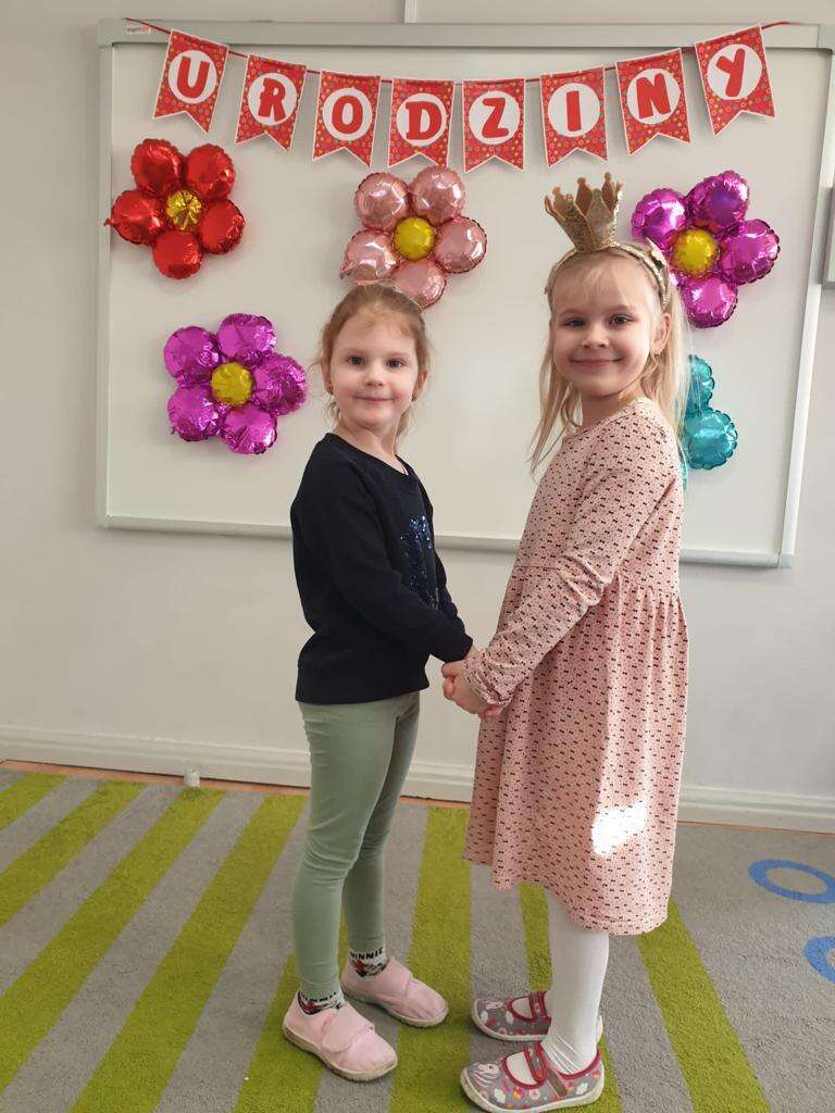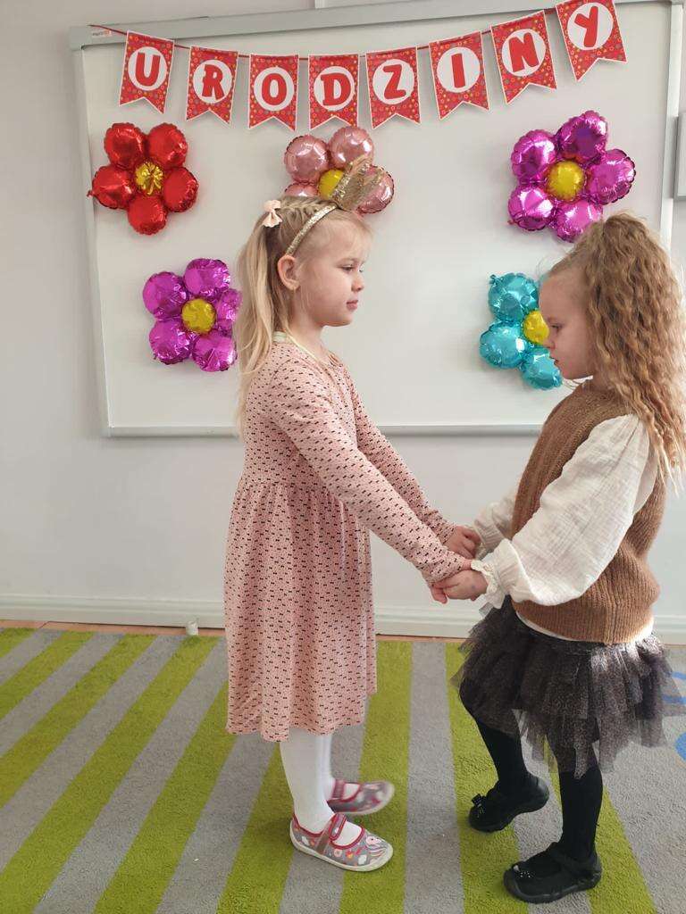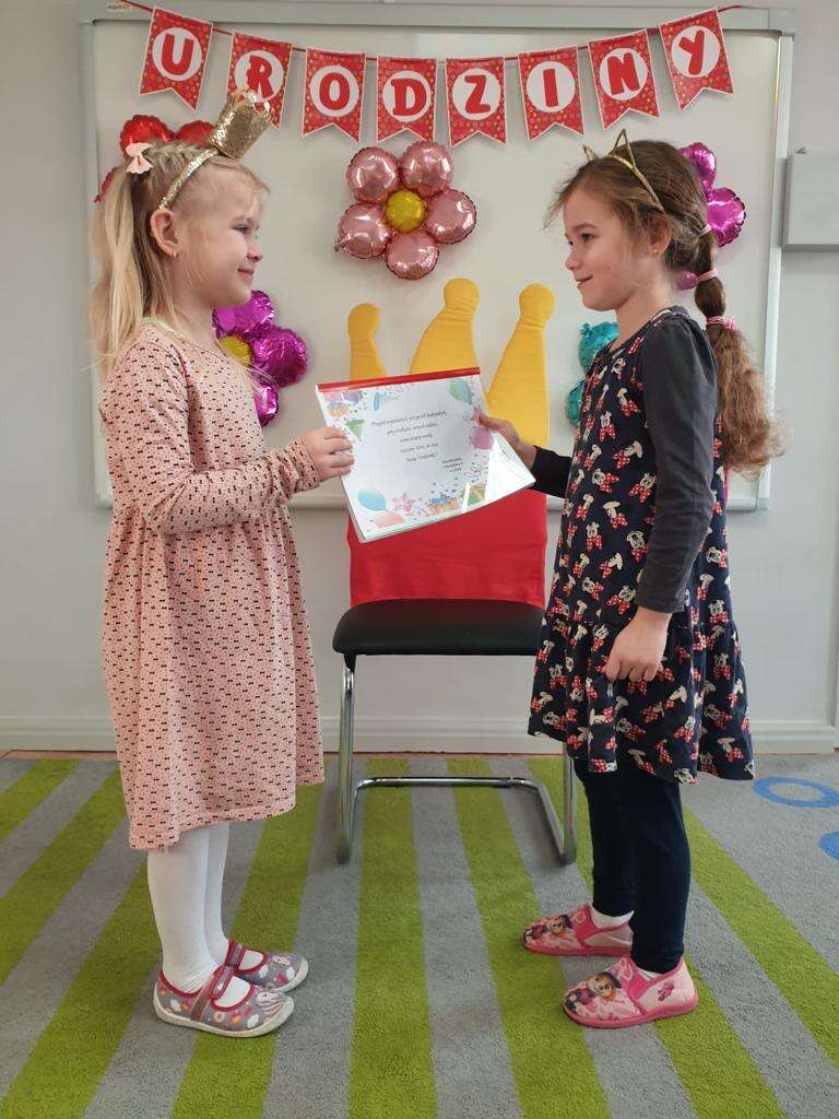 Natalka siedzi z albumem urodzinowym a obok niej stoją dwie dziewczynki