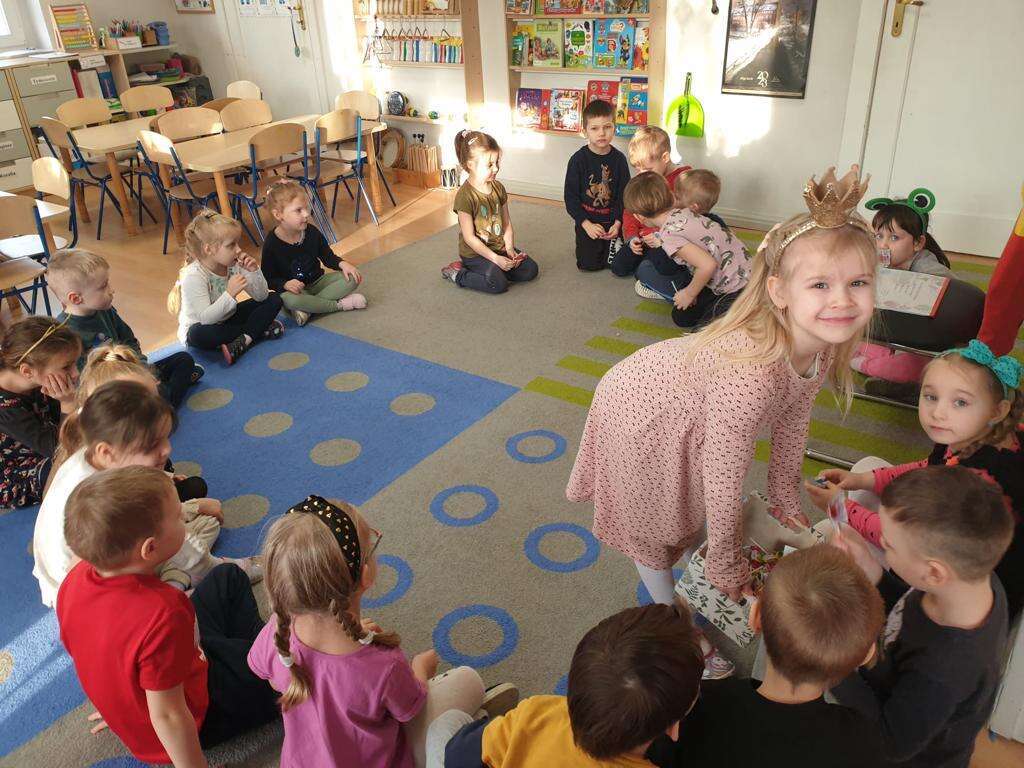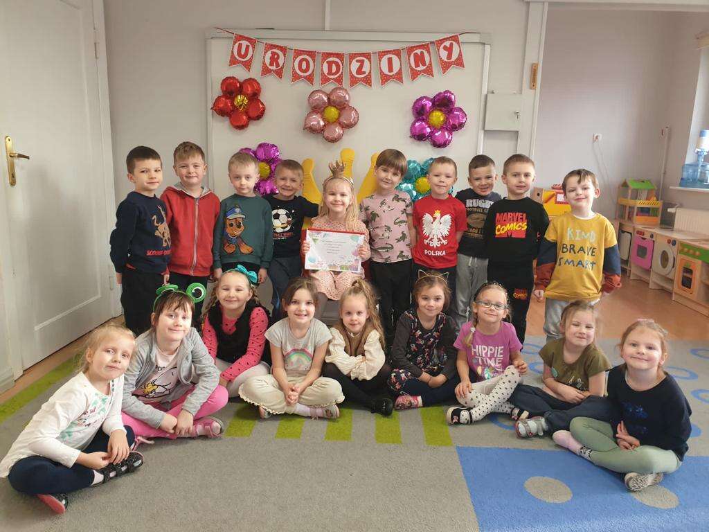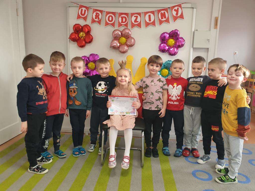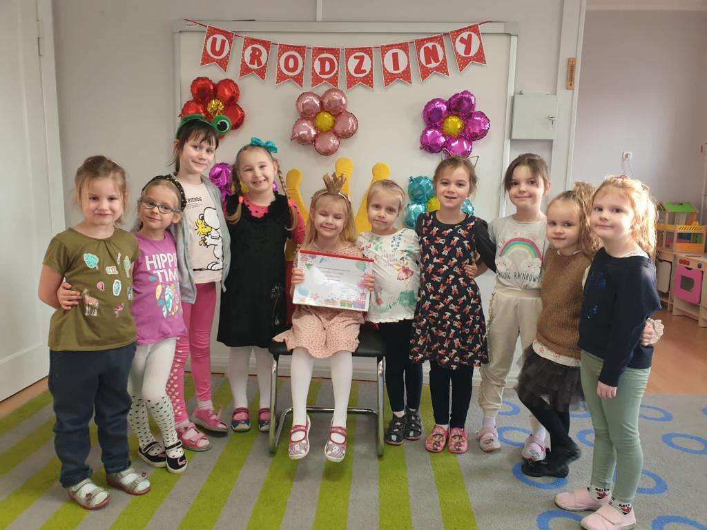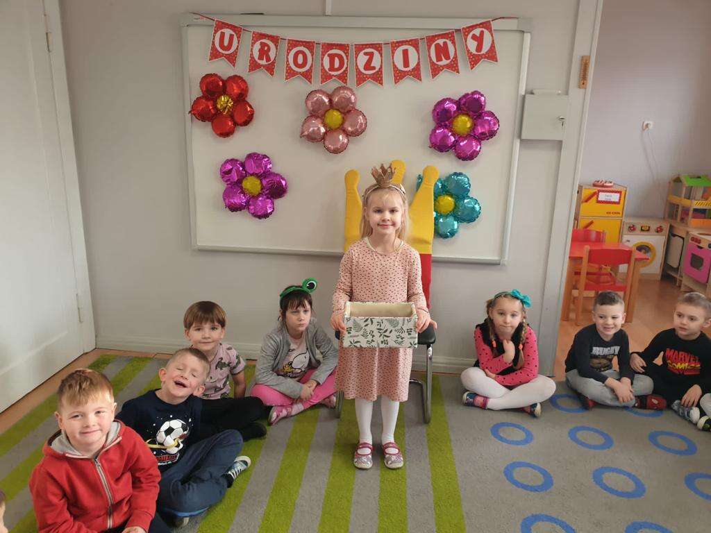 Natalka siedzi z albumem urodzinowym a dookoła niej stoją dzieci