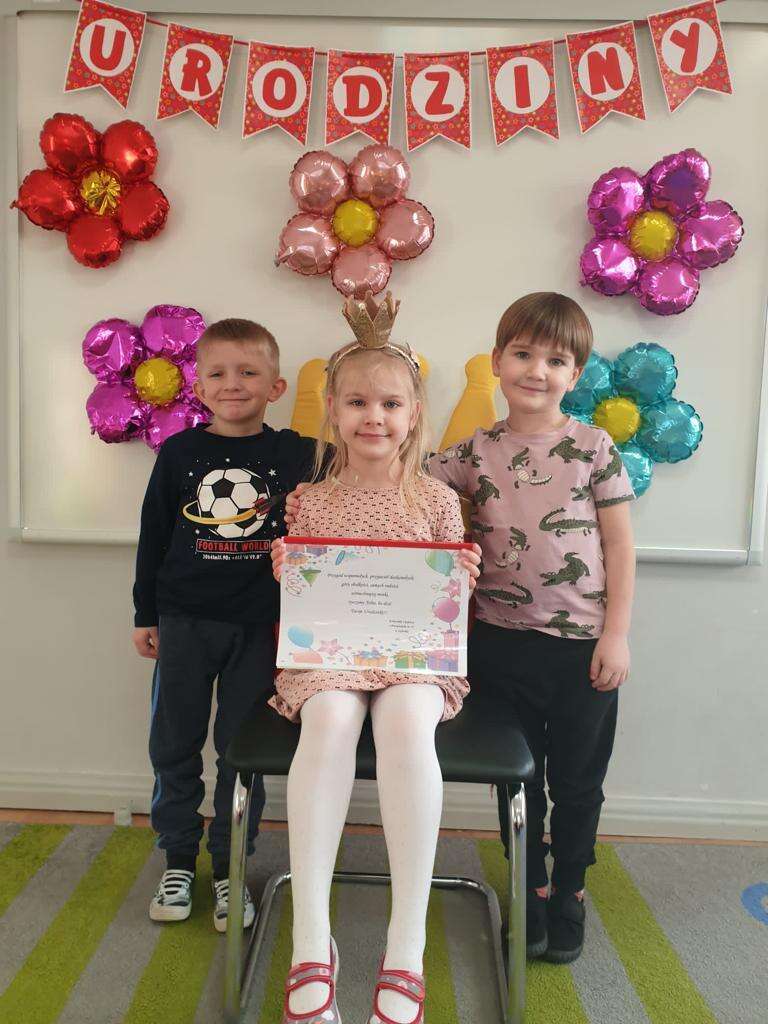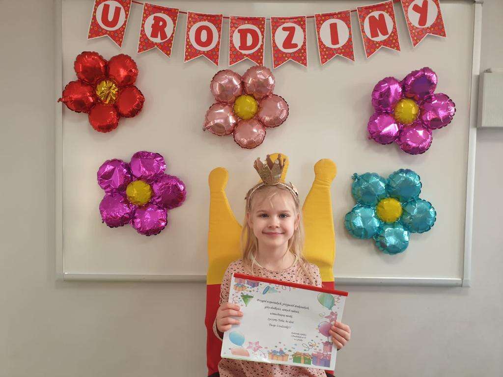 Natalka siedzi z albumem urodzinowym na tle dekoracji