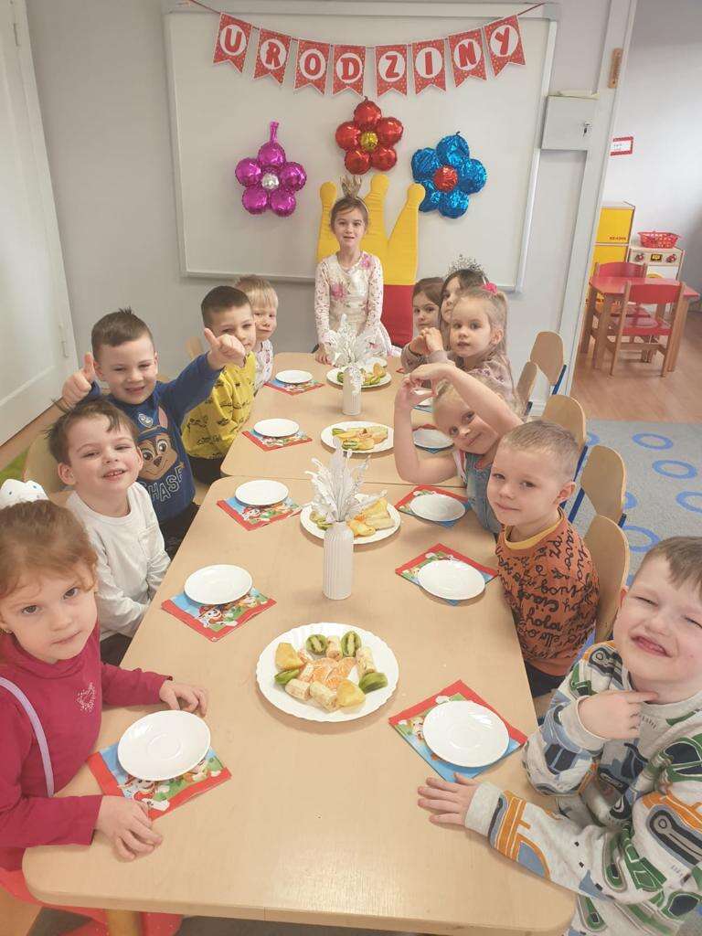 Dzieci siedzą z jubilatką przy wspólnym stole