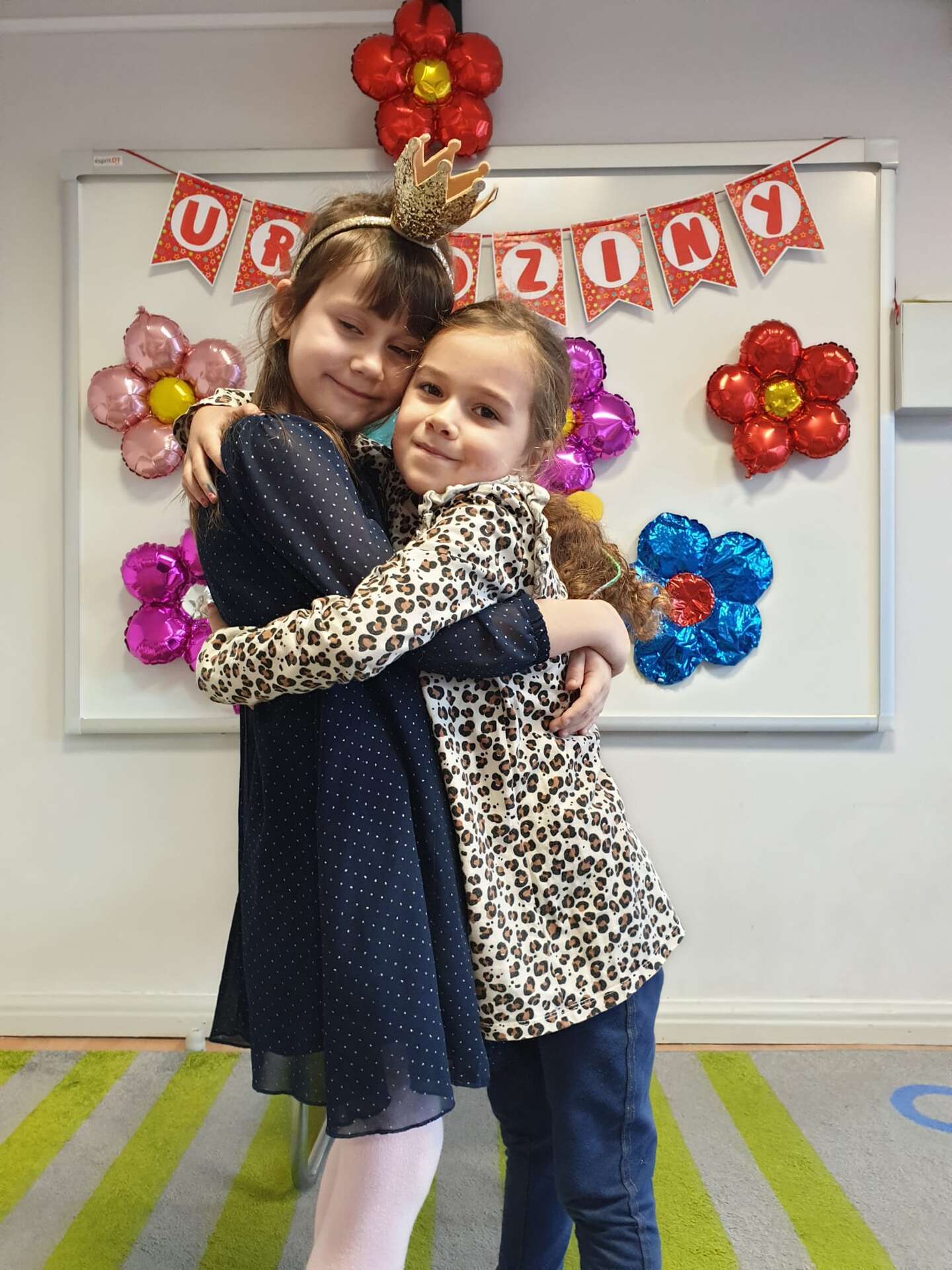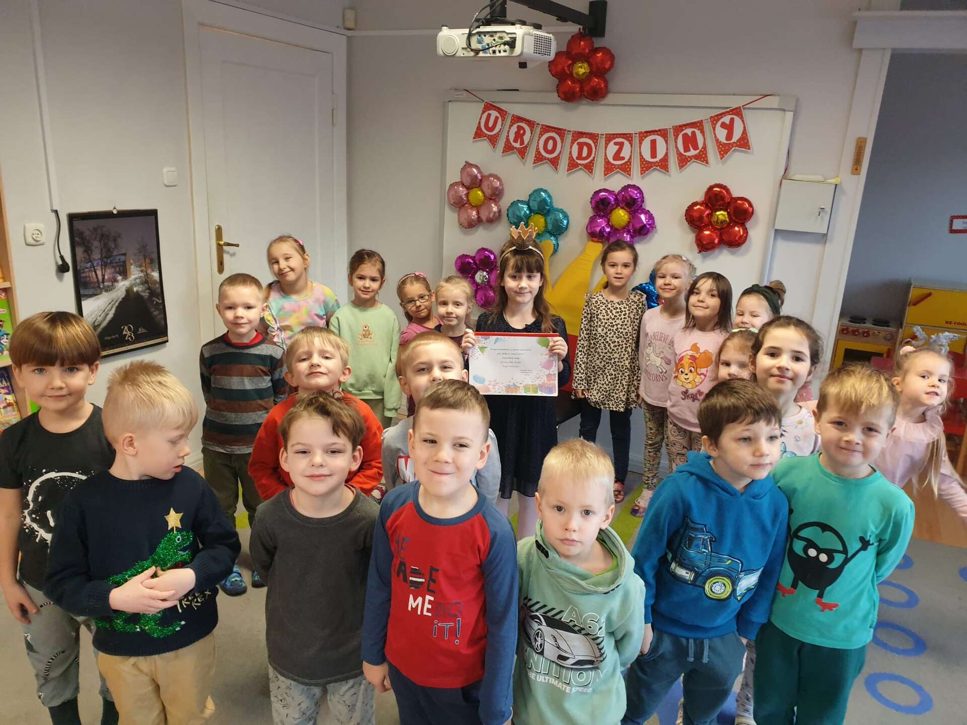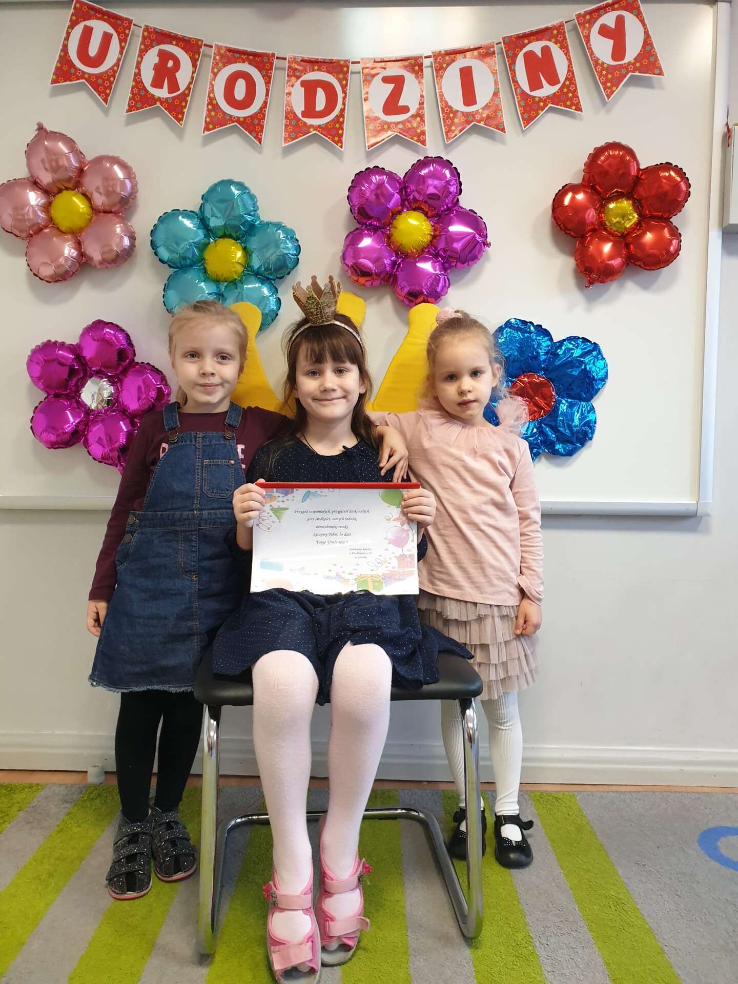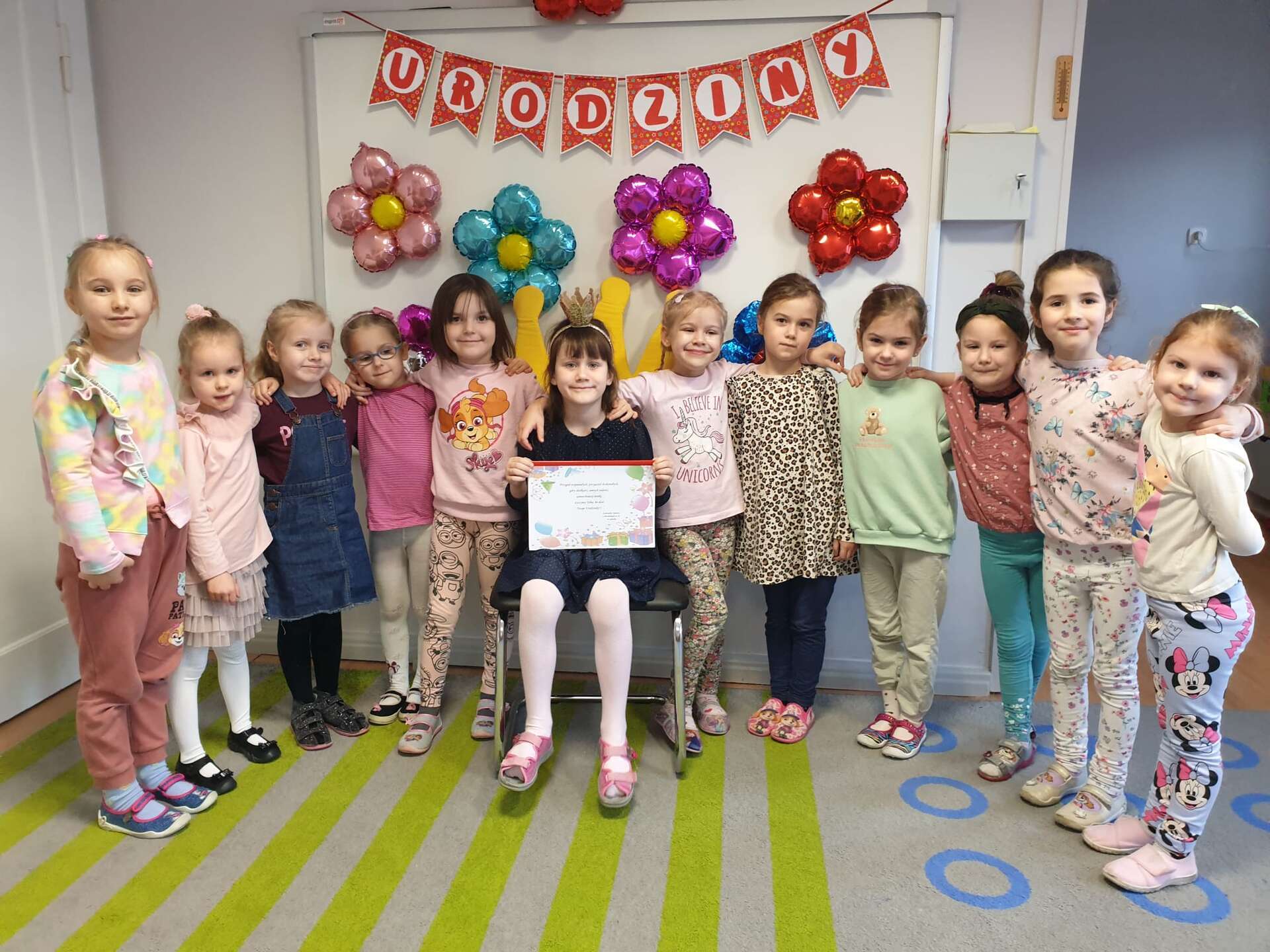 Kornelka ogląda swój prezent urodzinami z koleżankami i kolegami