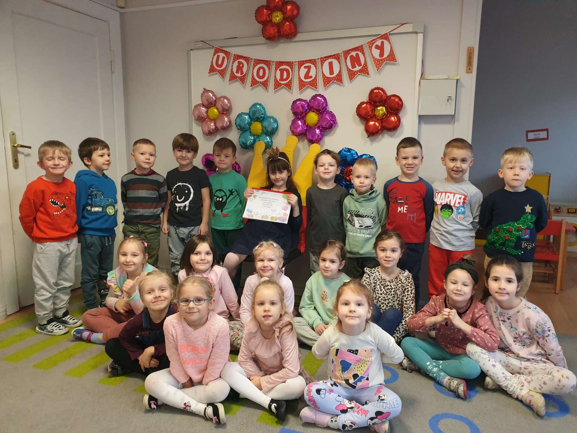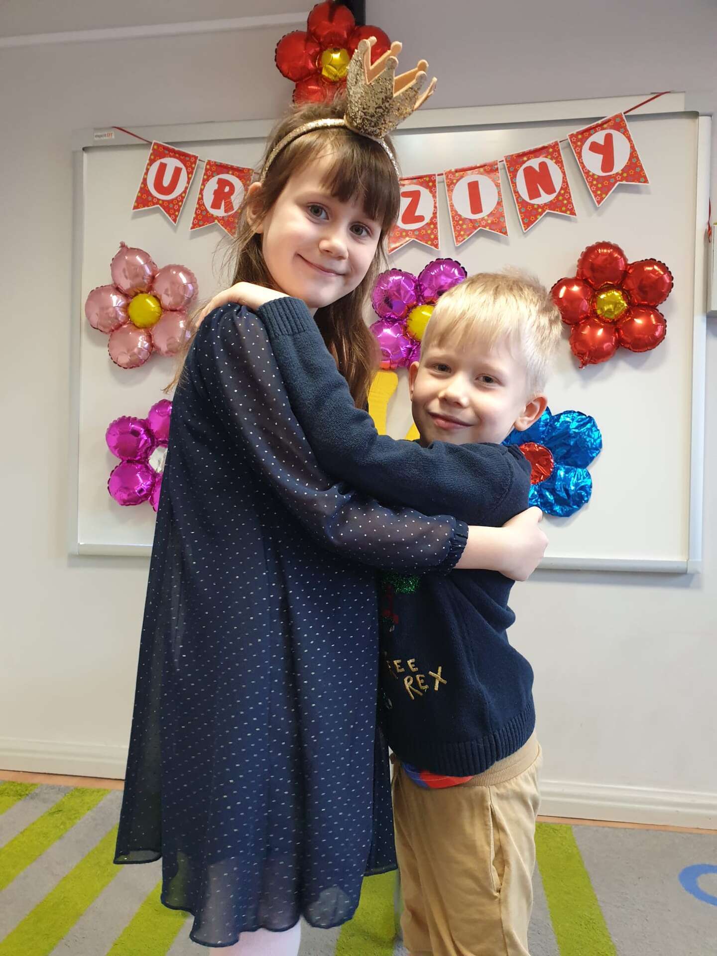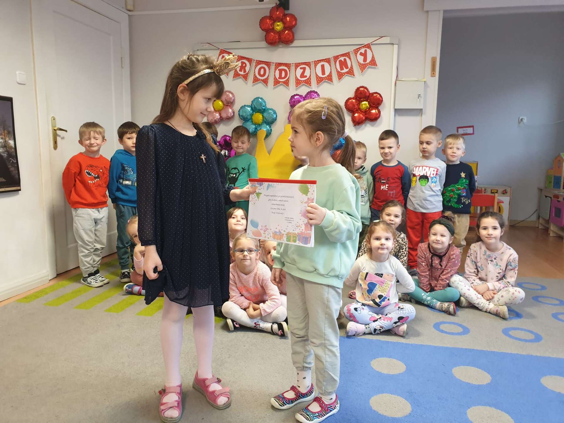 Kornelka ogląda swój prezent urodzinami z koleżankami i kolegami