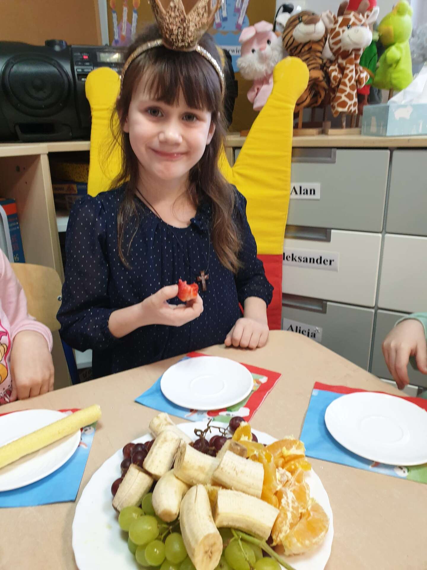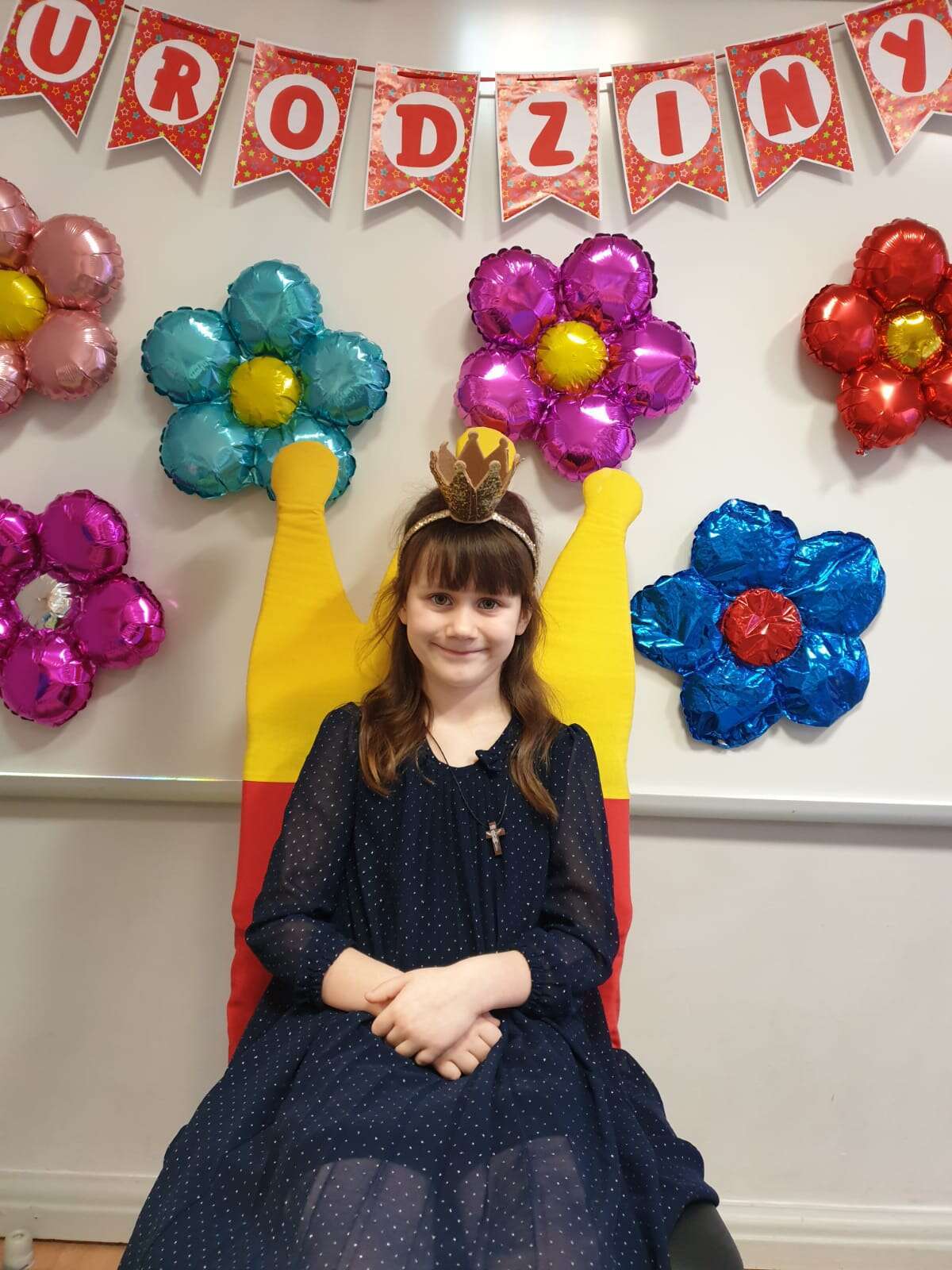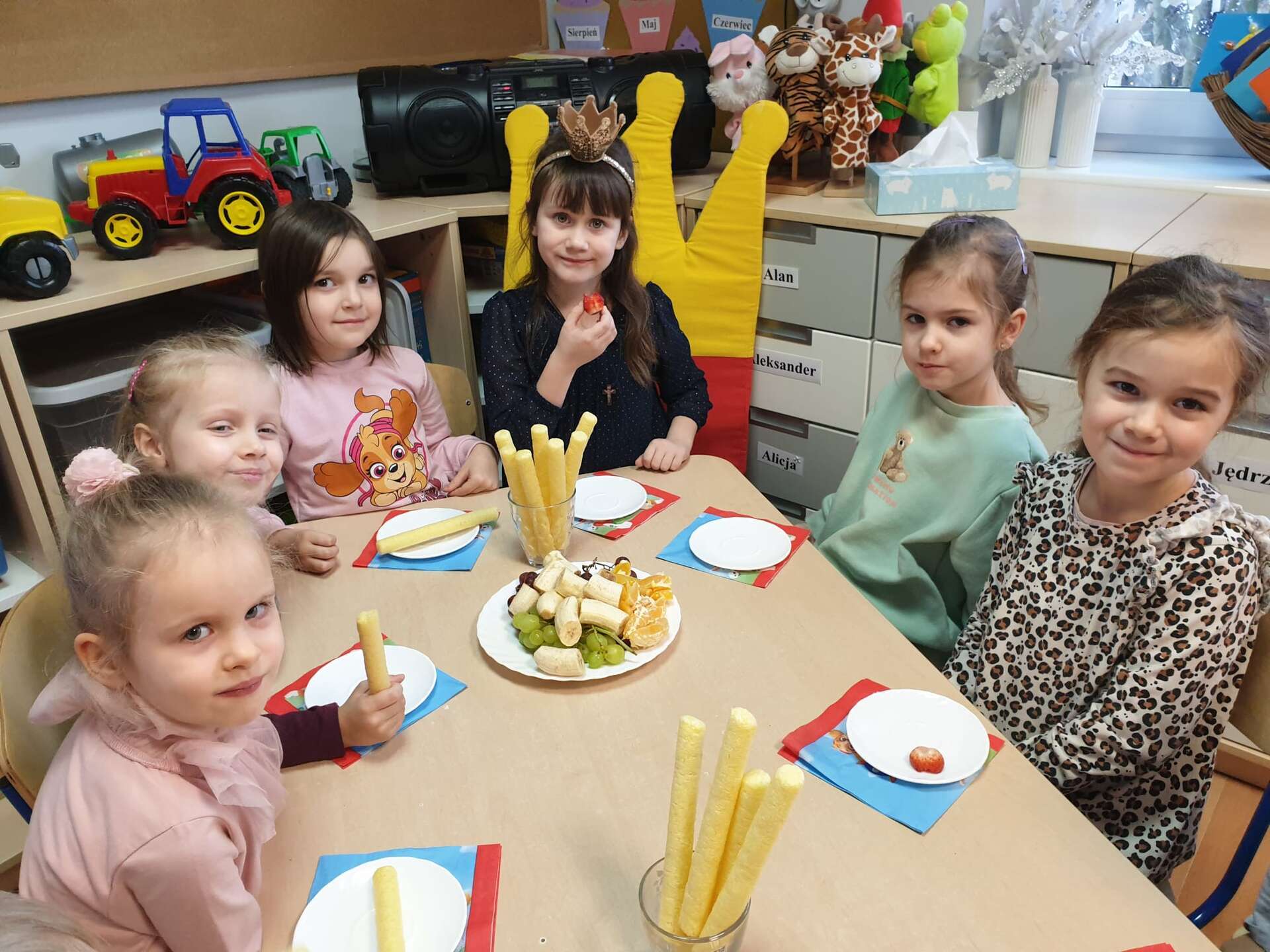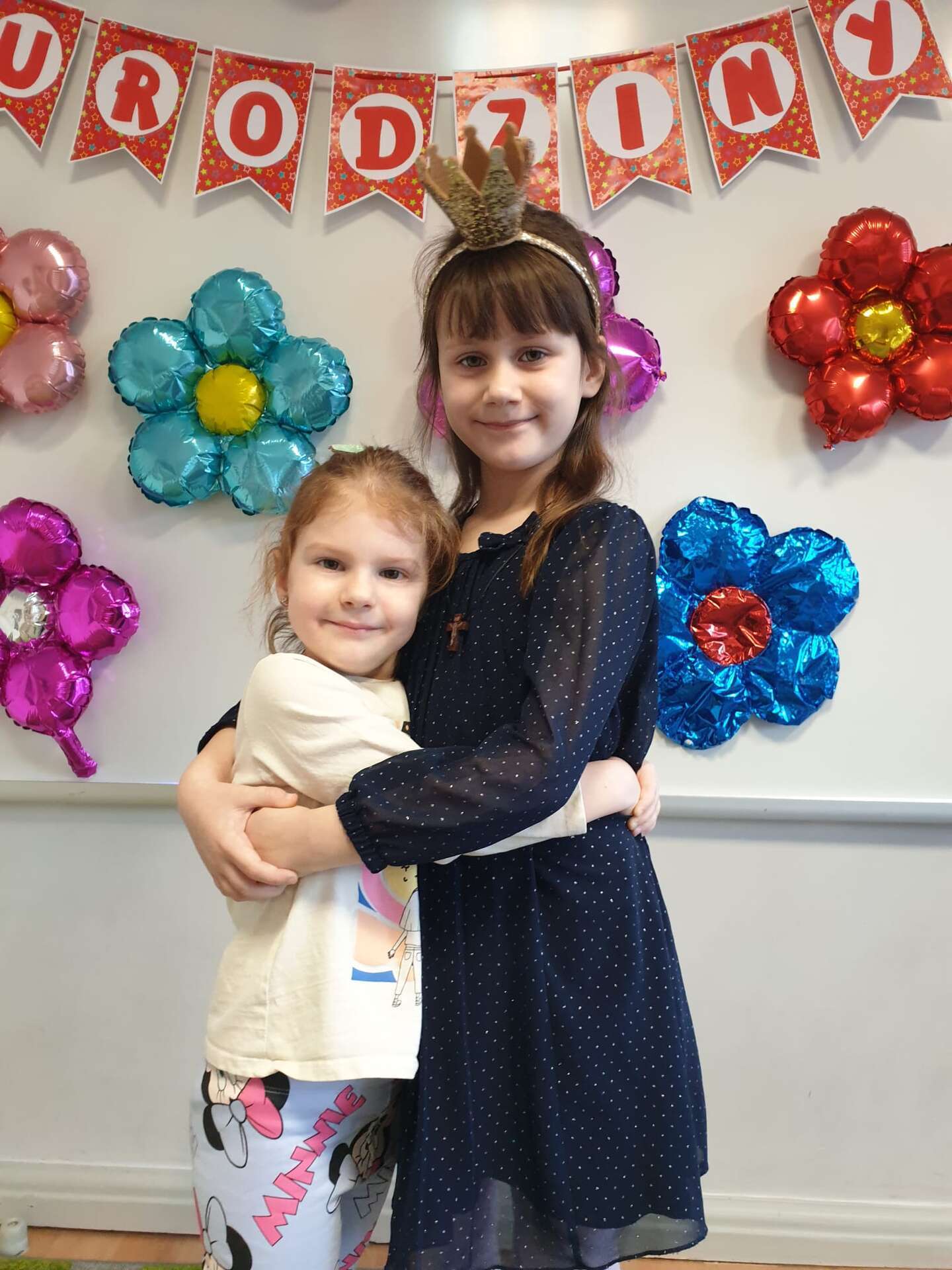 Kornelka ogląda swój prezent urodzinami z koleżankami i kolegami
