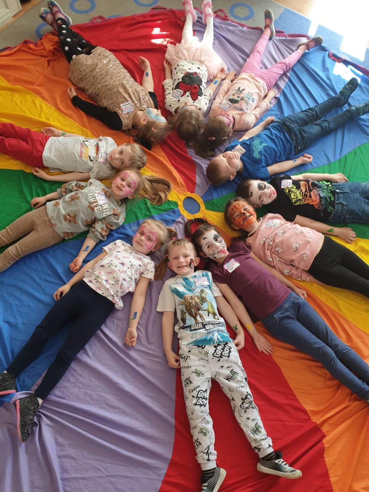 Dzieci leżą na chuscie animacyjnej