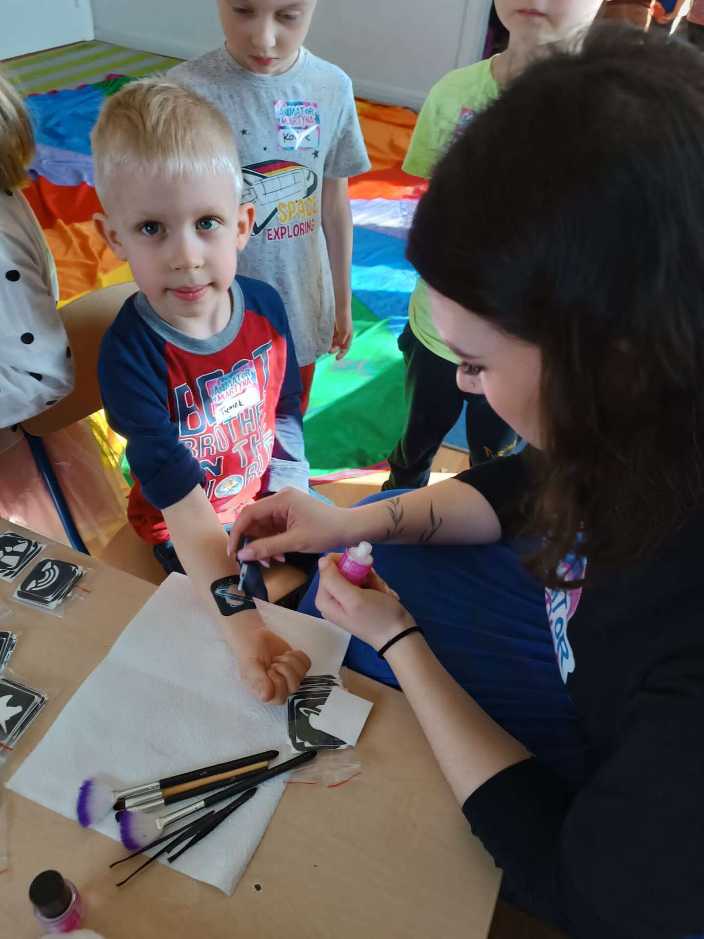 Pani maluje chłopcu tatuaż