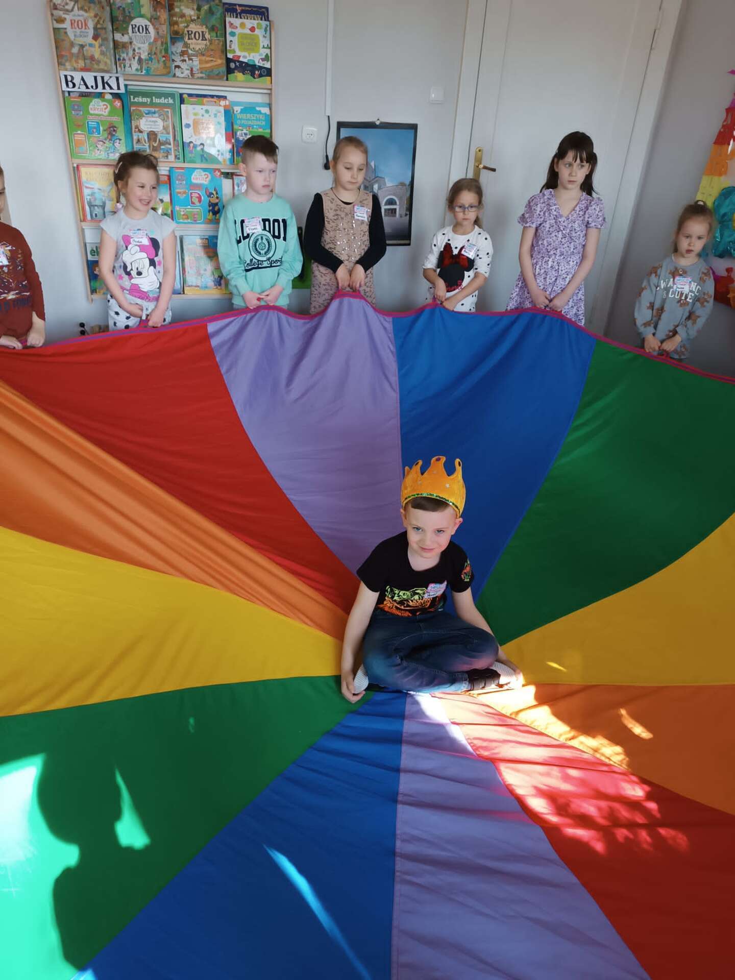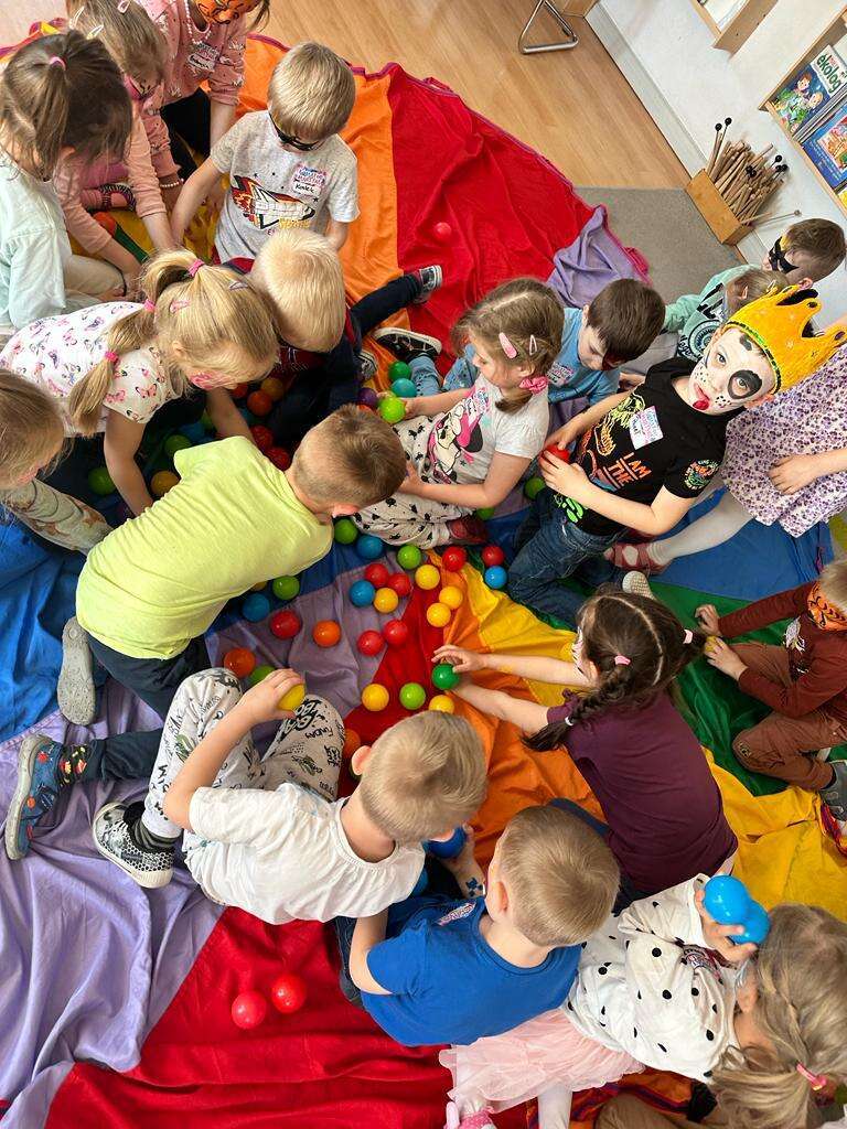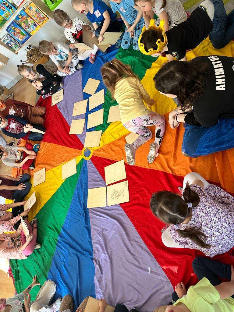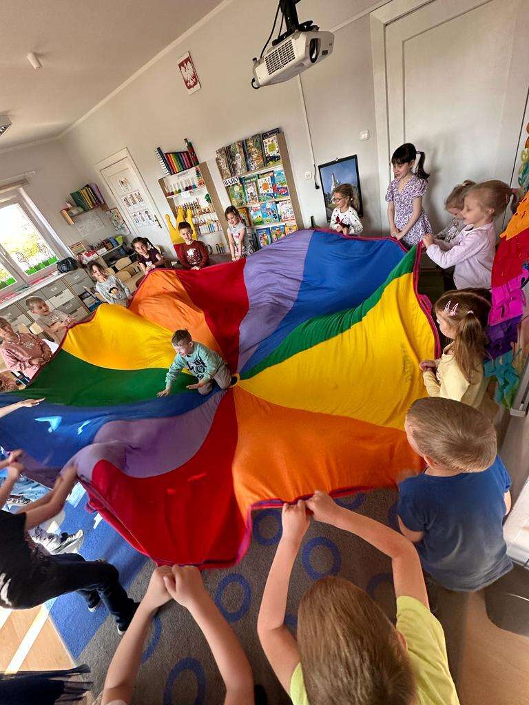 Dzieci bawiące się chustą animacyjną