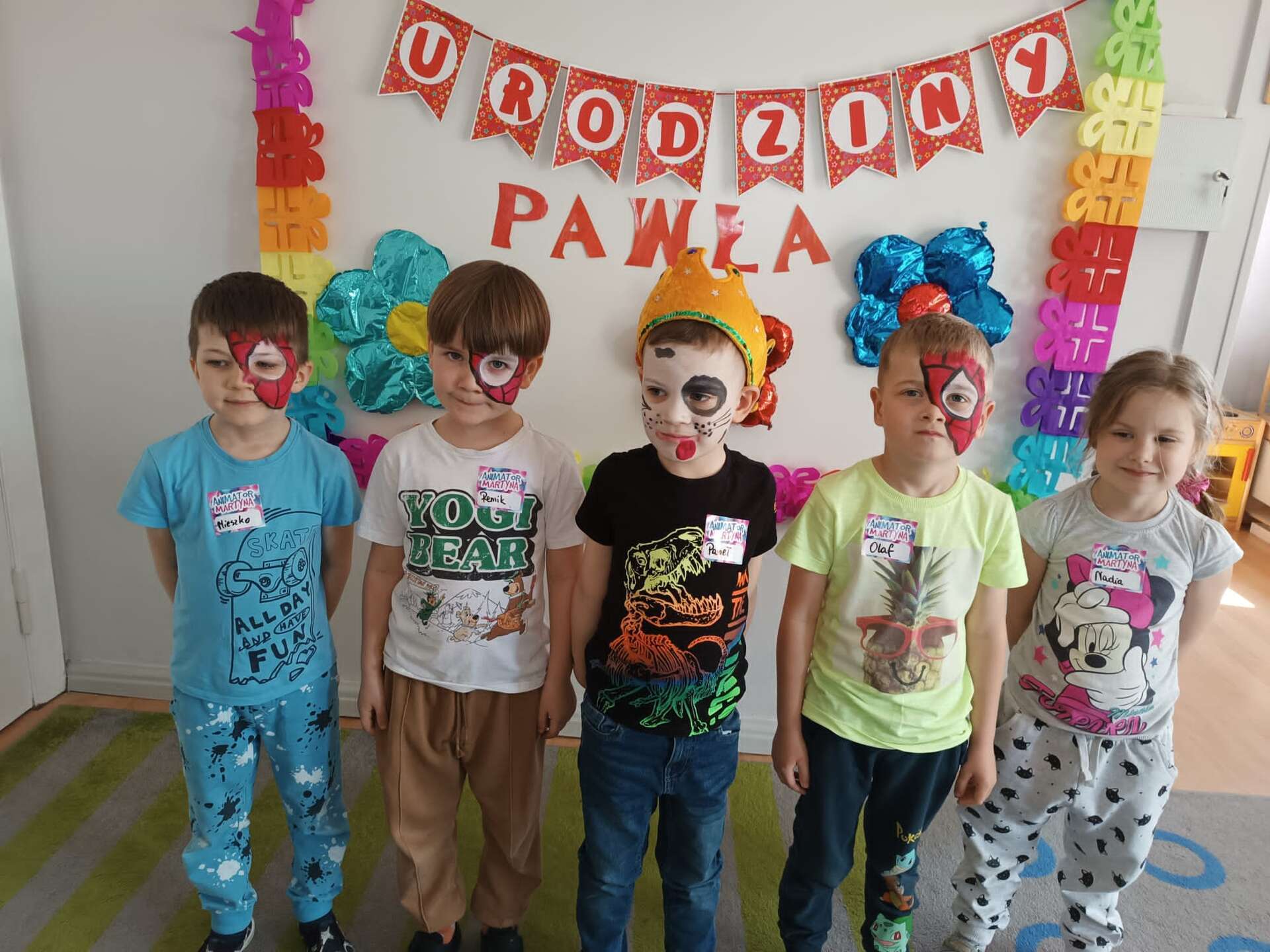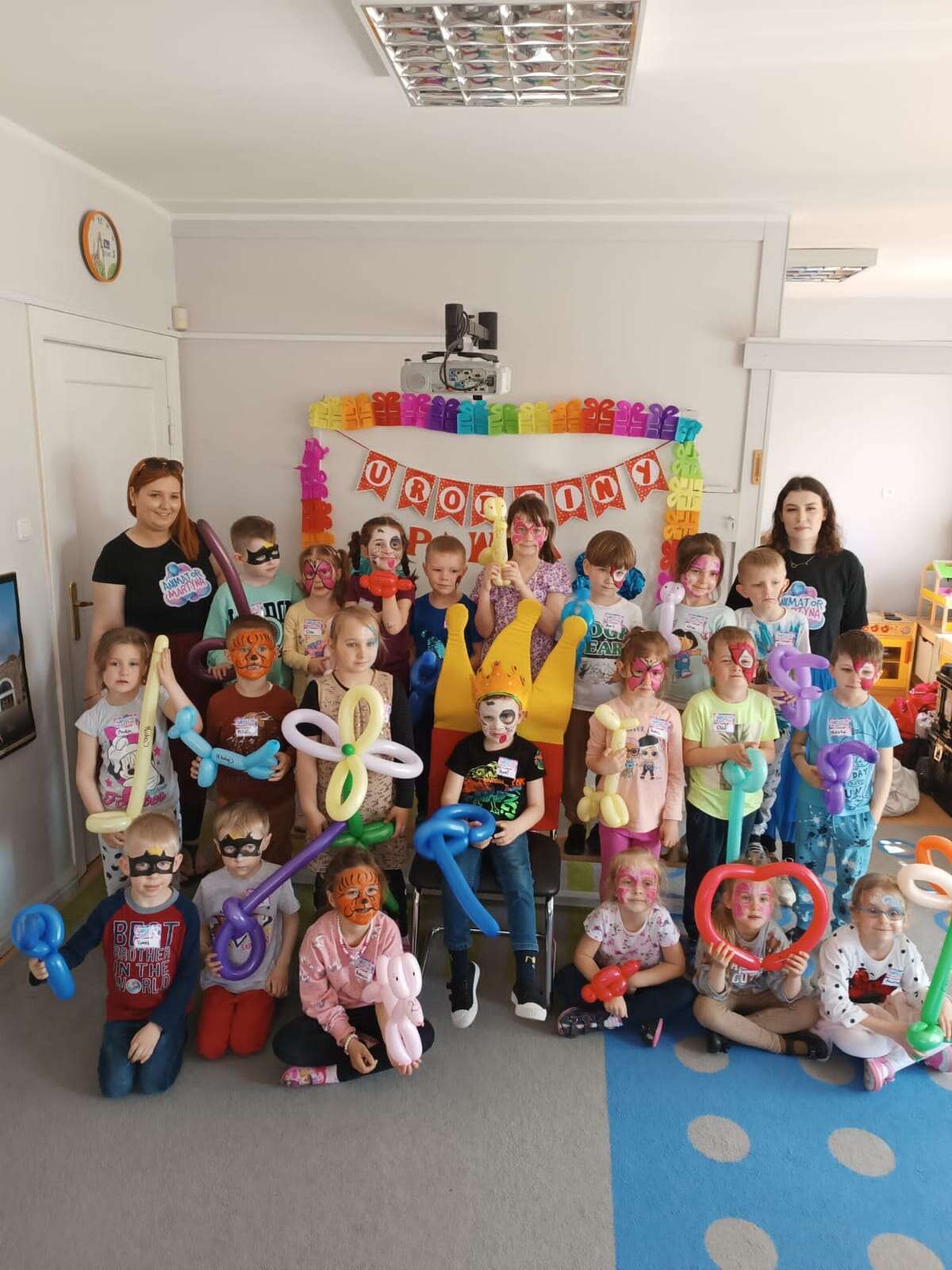 Grupa dzieci z solenizantem i animatorkami
