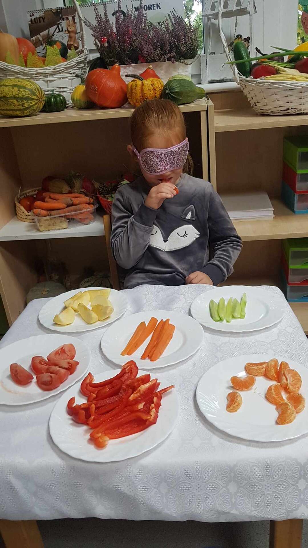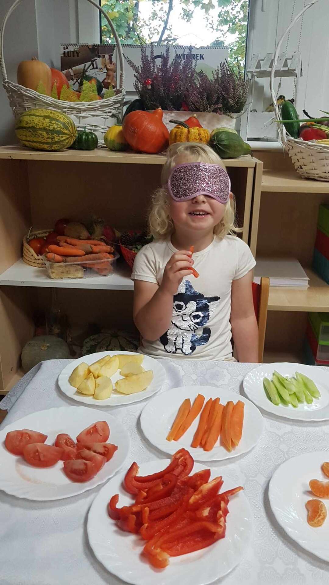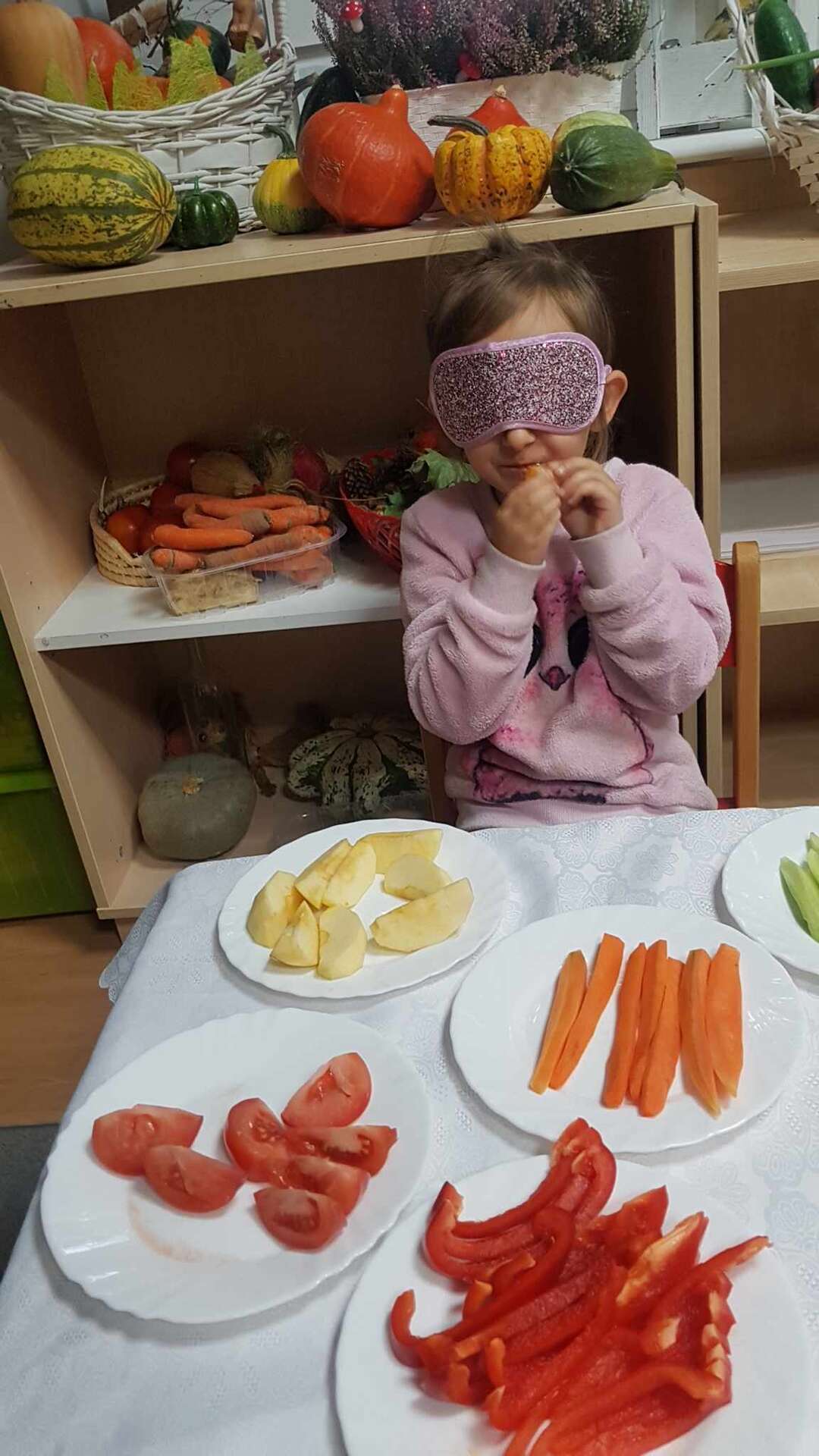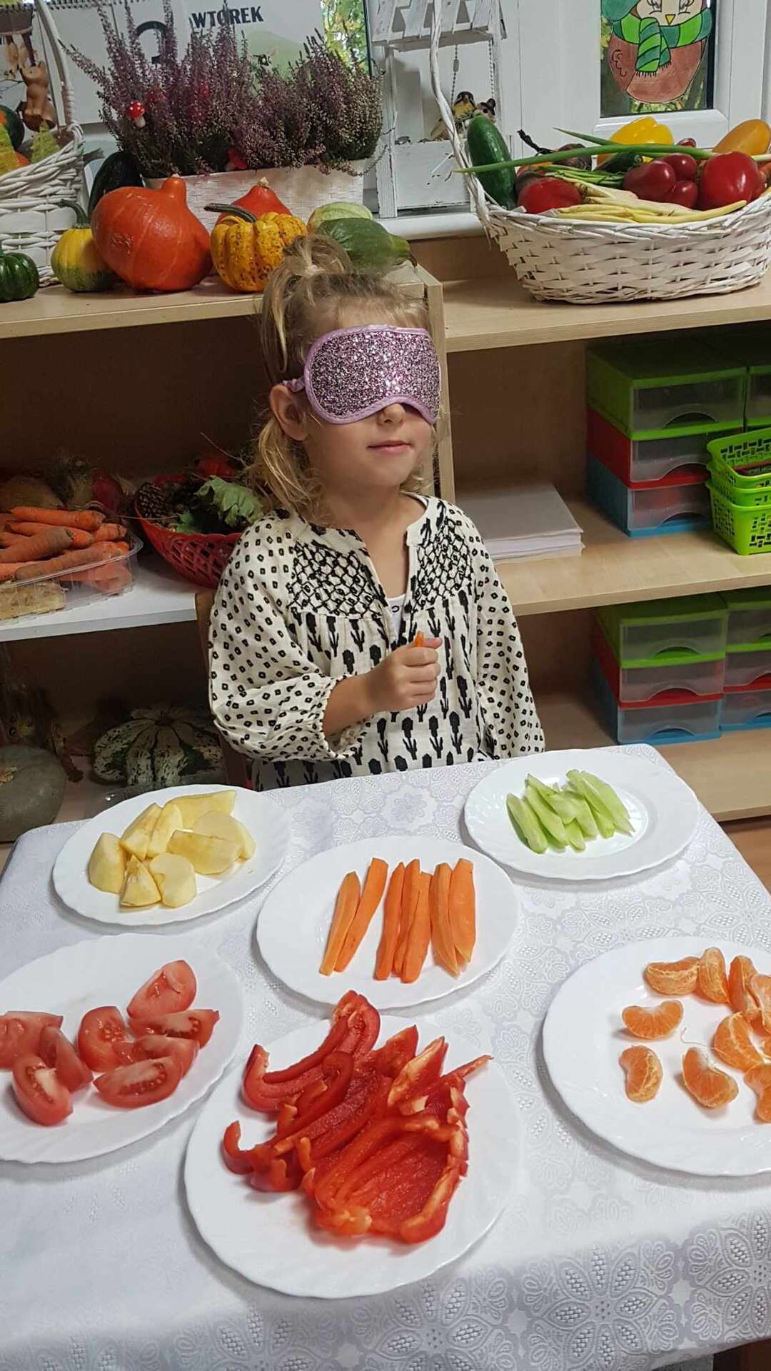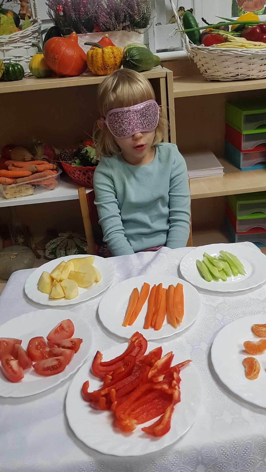 Dzieci smakują warzyw z zamkniętymi oczami