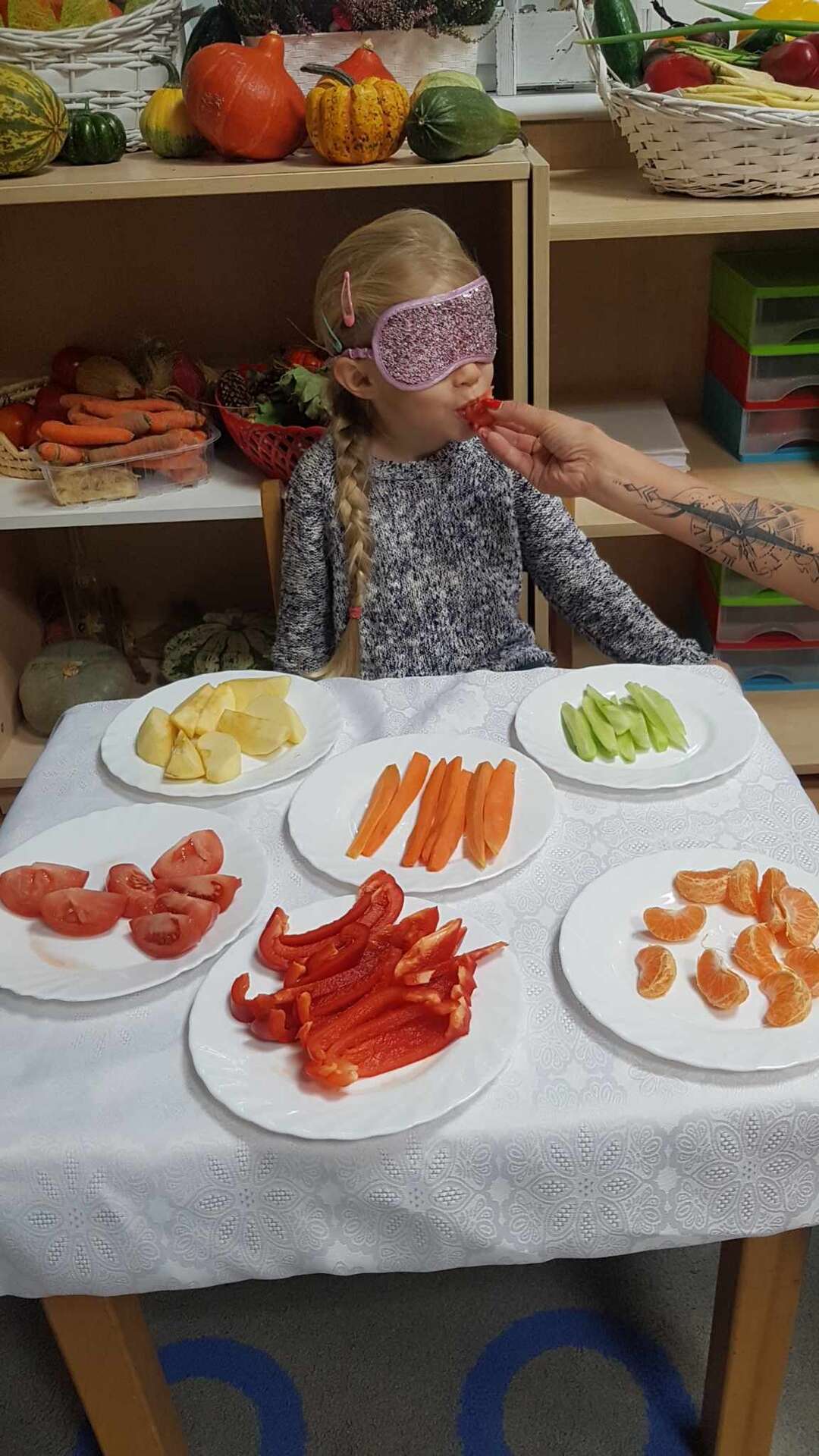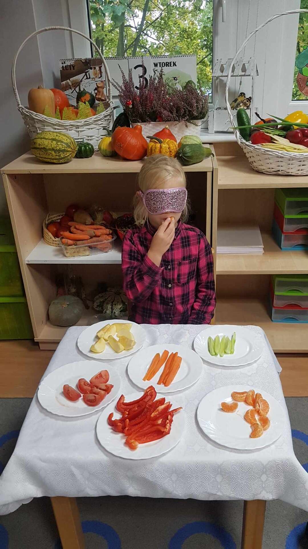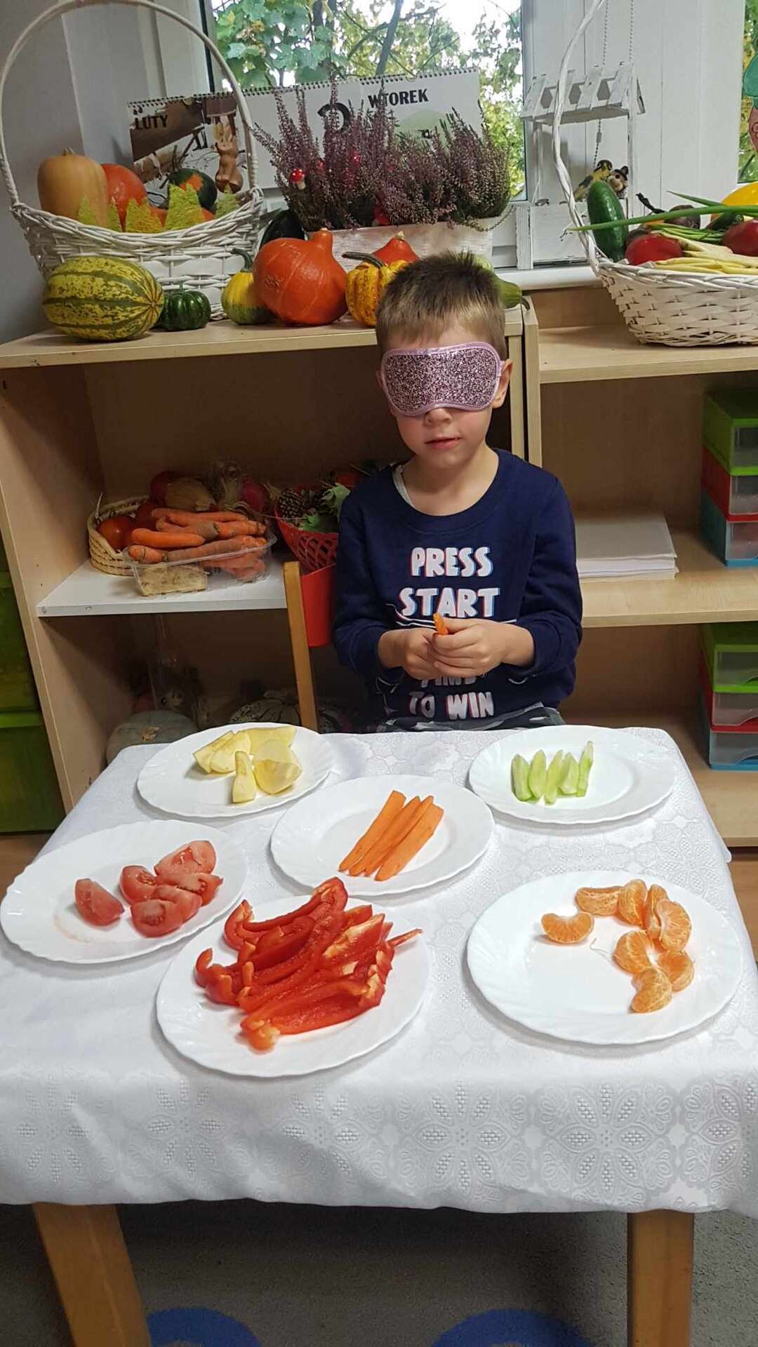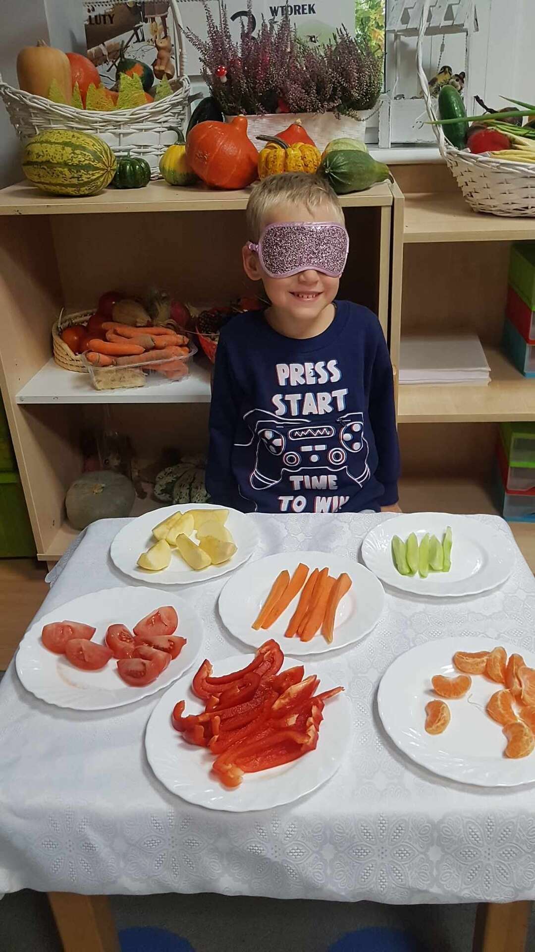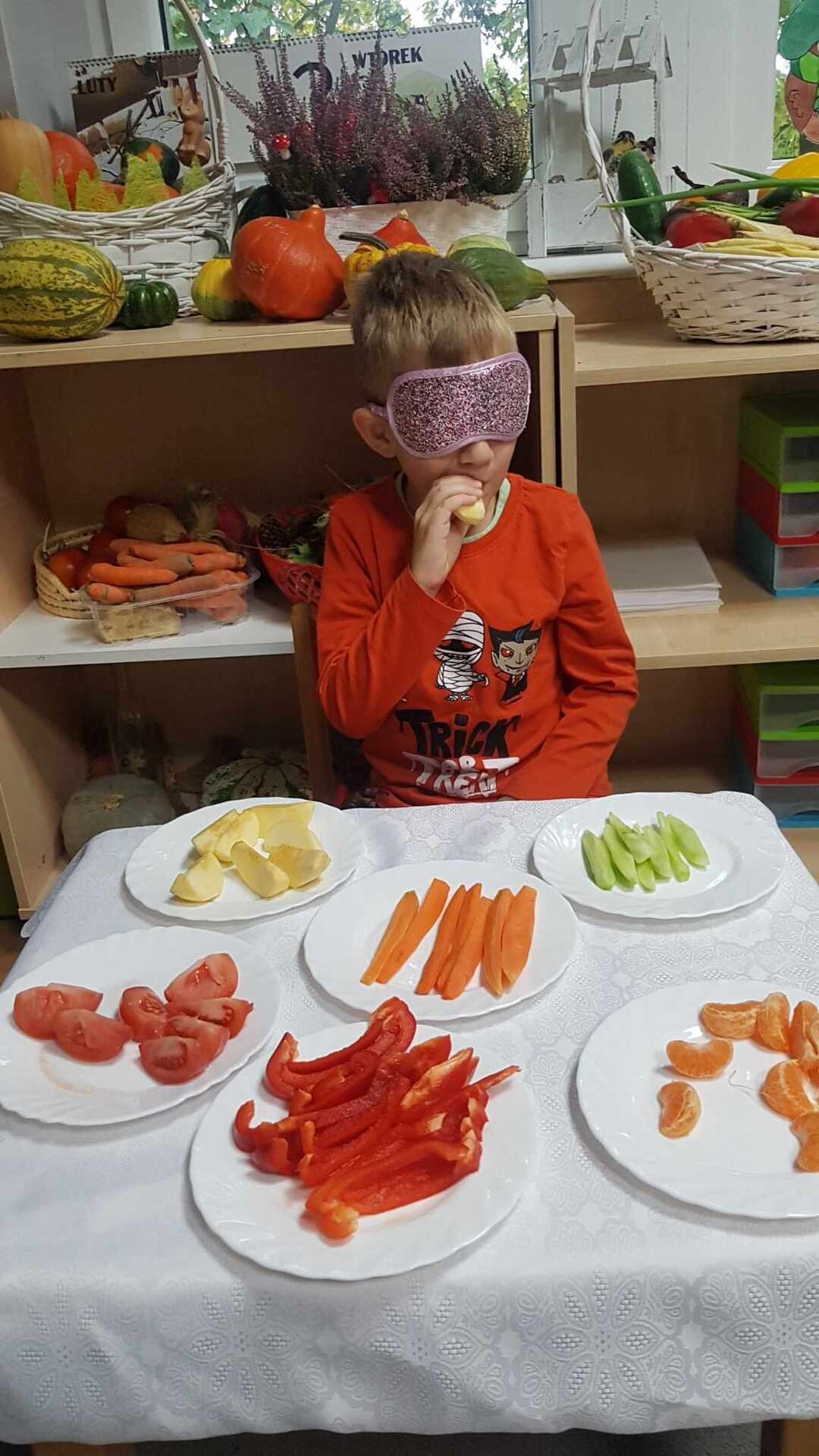 Dzieci smakują warzyw z zamkniętymi oczami