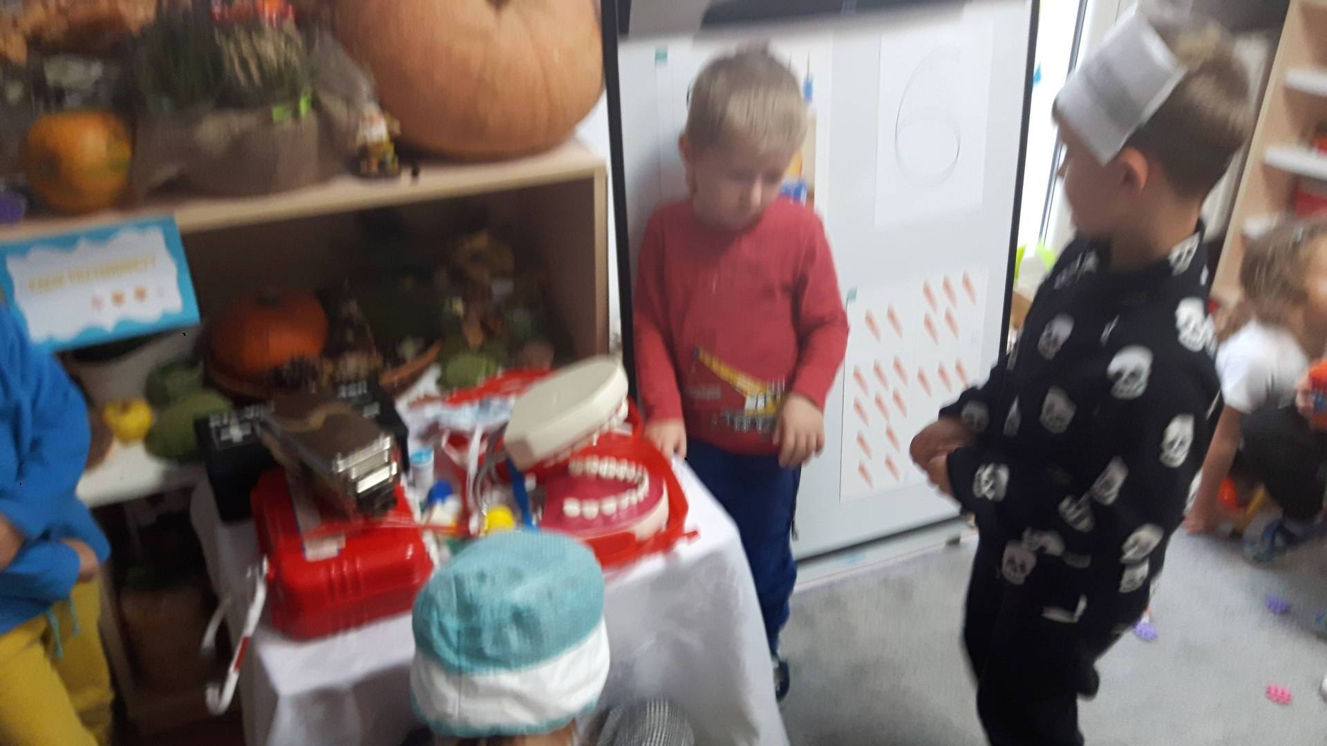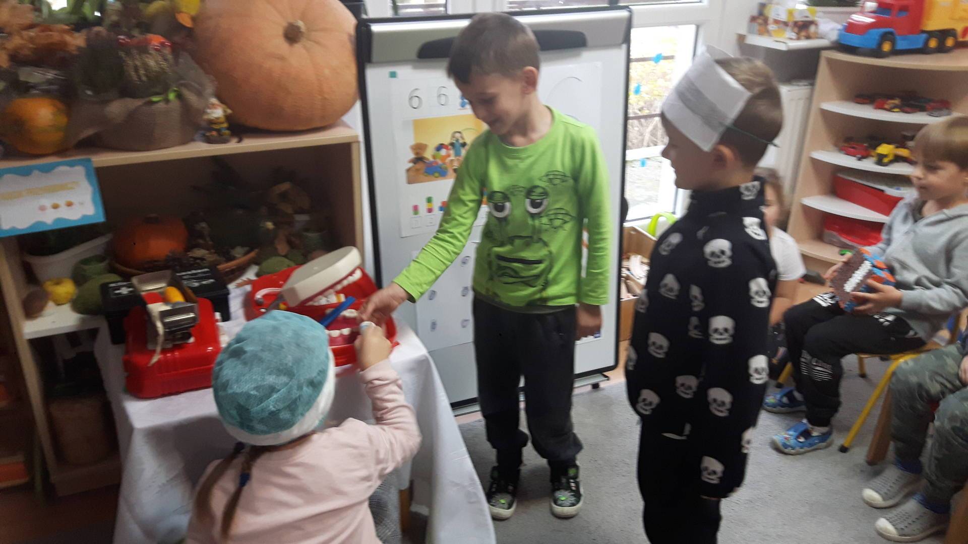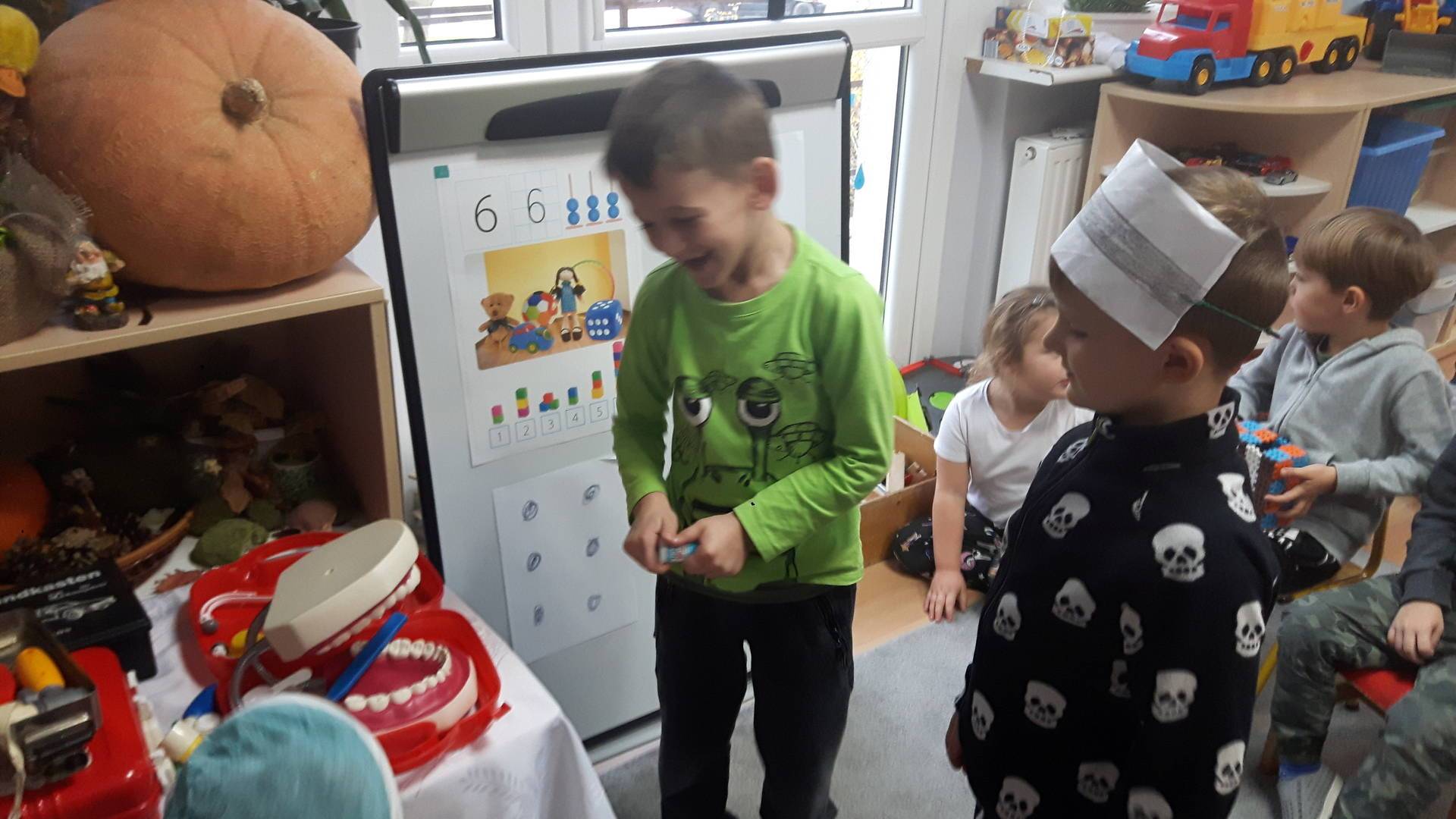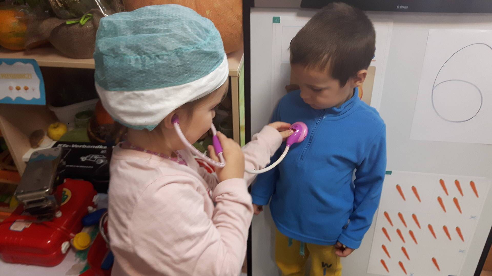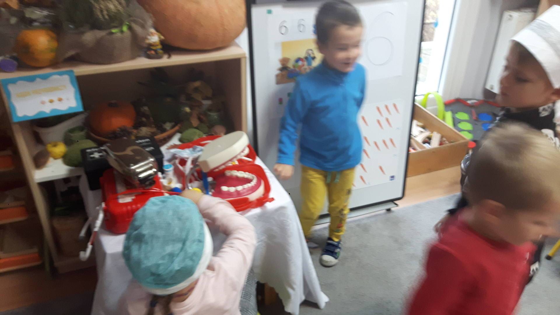 w tym tygodniu zajmujemy się zdrowiem: dowiadujemy się, co powinniśmy jeść, by mieć dużo siły i energii, i jak się ubierać, żeby nie zachorować. Wiemy jak należy poprawnie szczotkować zęby i gdzie się udać kiedy nas coś boli. Rozpoznawaliśmy różne gabinety lekarskie oraz narzędzia niezbędne w pracy lekarzy różnych specjalności, na przykład pediatry, stomatologa, laryngologa. Dużo czasu poświęcamy na zabawy ruchowe, bo ruch to zdrowie: biegaliśmy, skakaliśmy, rzucaliśmy woreczkami do celu.