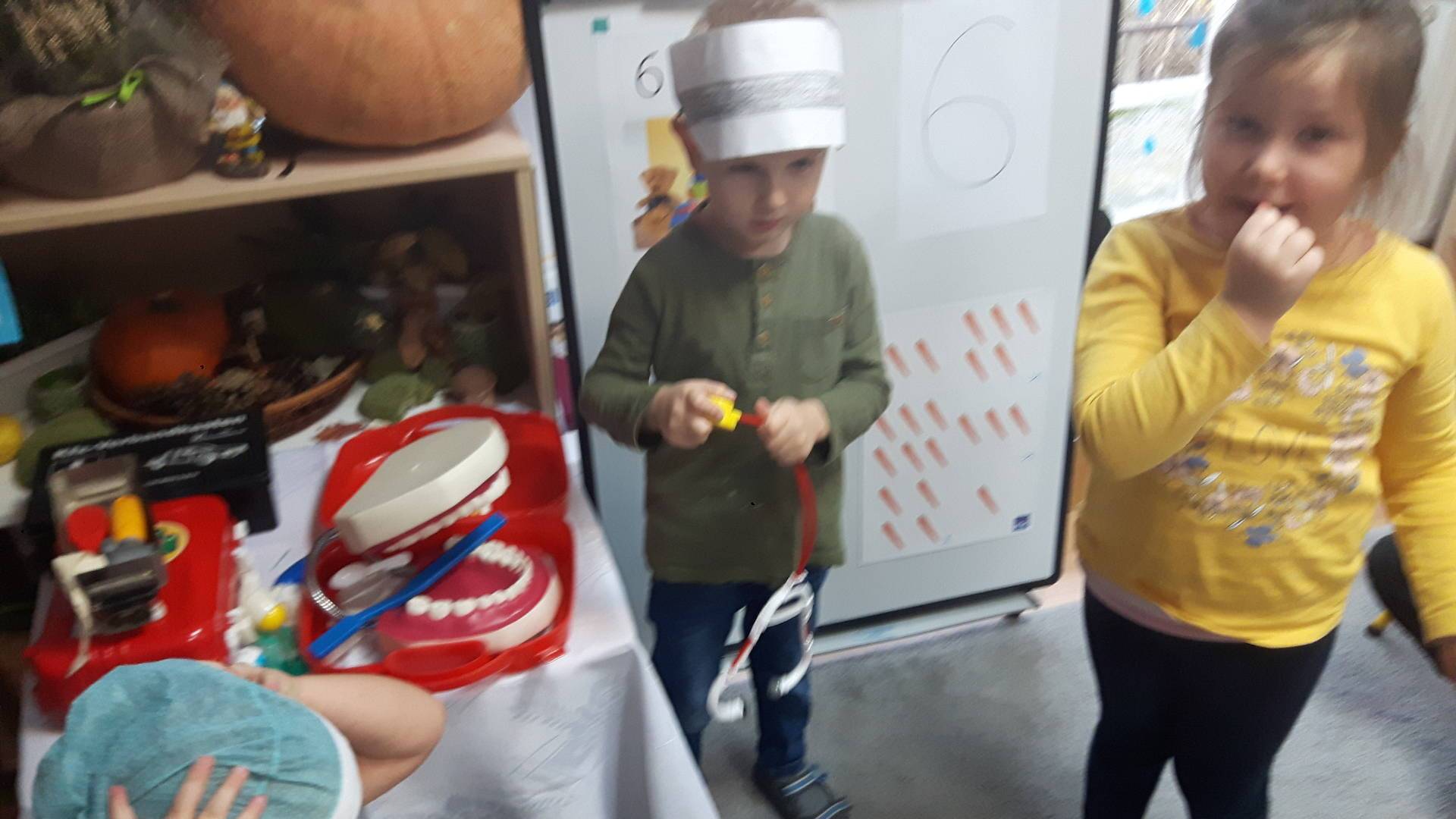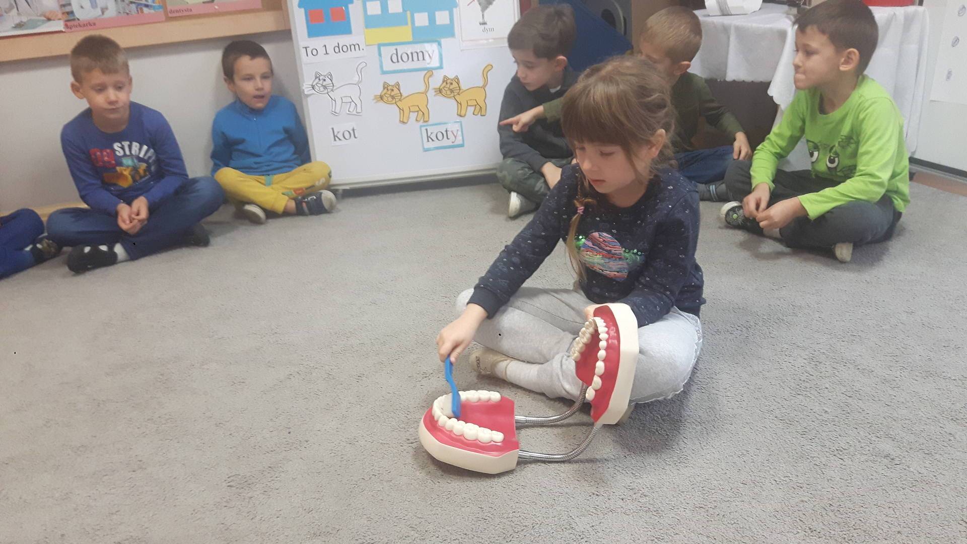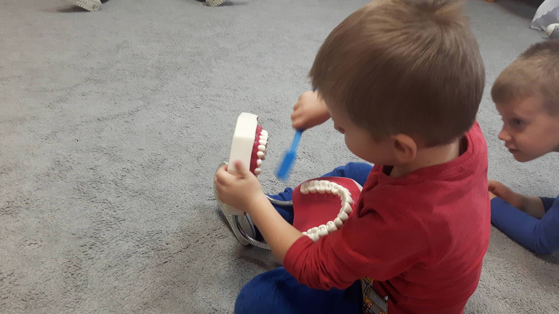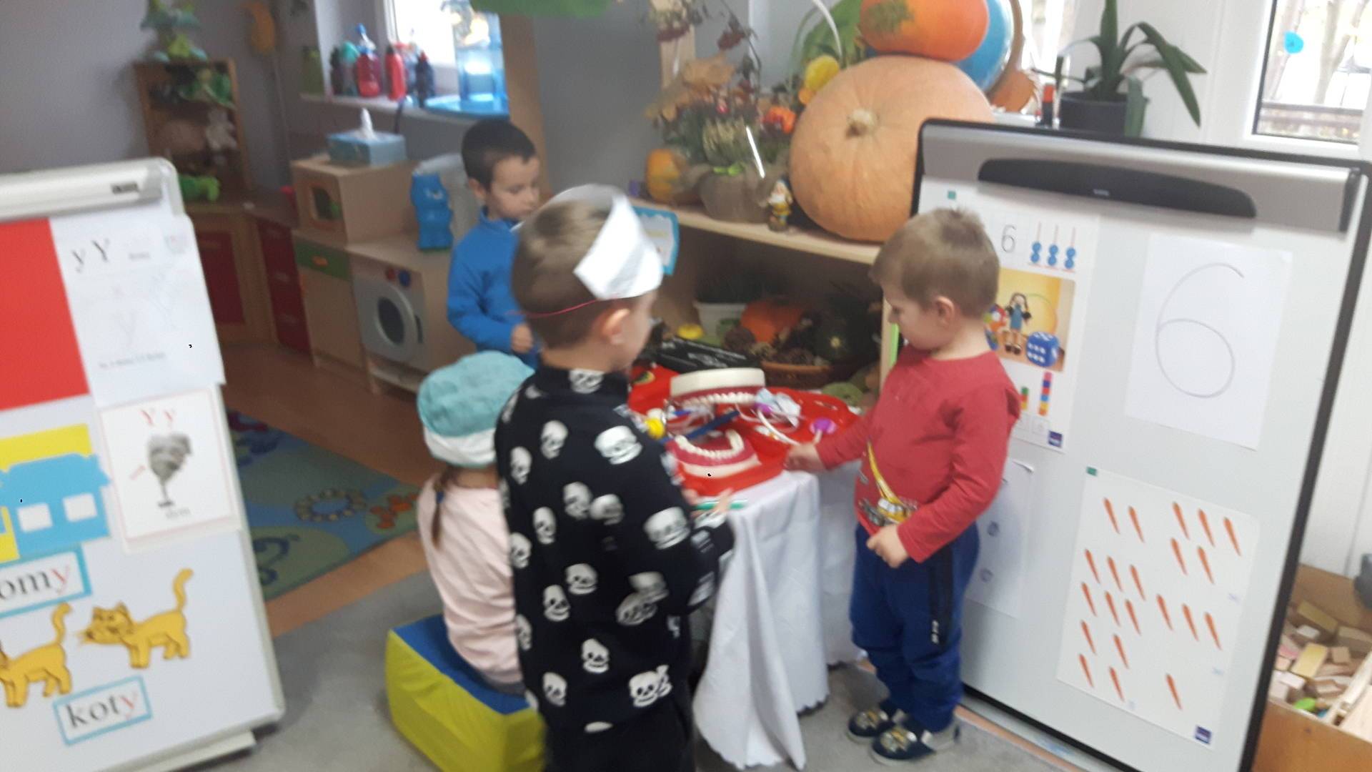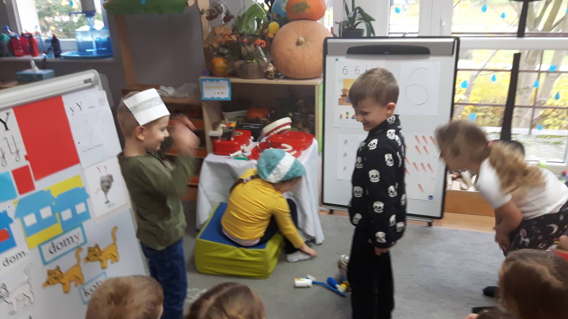 w tym tygodniu zajmujemy się zdrowiem: dowiadujemy się, co powinniśmy jeść, by mieć dużo siły i energii, i jak się ubierać, żeby nie zachorować. Wiemy jak należy poprawnie szczotkować zęby i gdzie się udać kiedy nas coś boli. Rozpoznawaliśmy różne gabinety lekarskie oraz narzędzia niezbędne w pracy lekarzy różnych specjalności, na przykład pediatry, stomatologa, laryngologa. Dużo czasu poświęcamy na zabawy ruchowe, bo ruch to zdrowie: biegaliśmy, skakaliśmy, rzucaliśmy woreczkami do celu.
