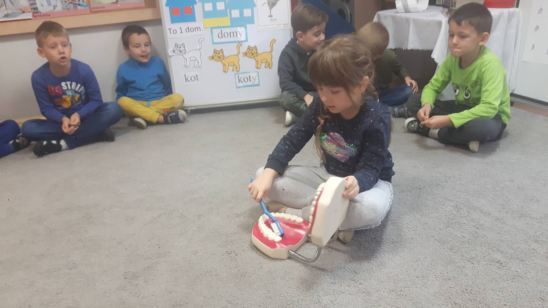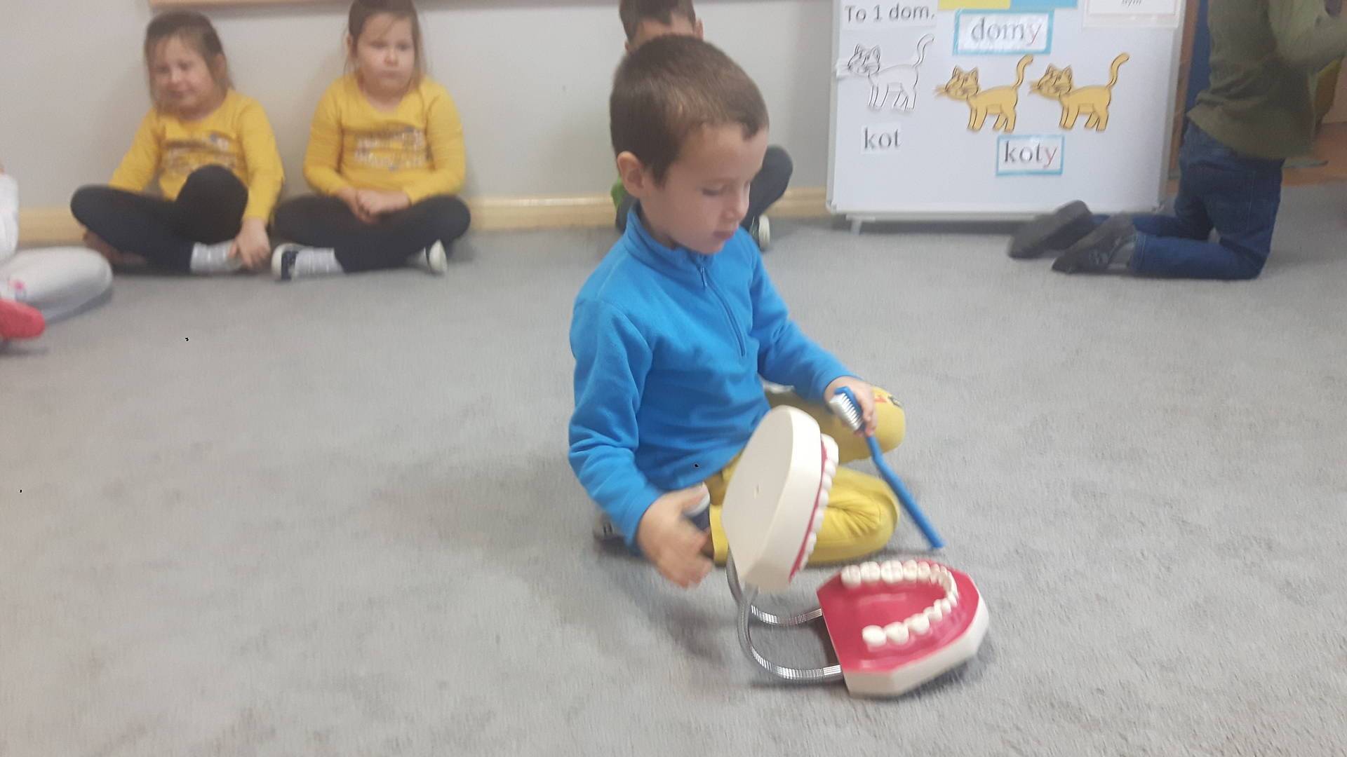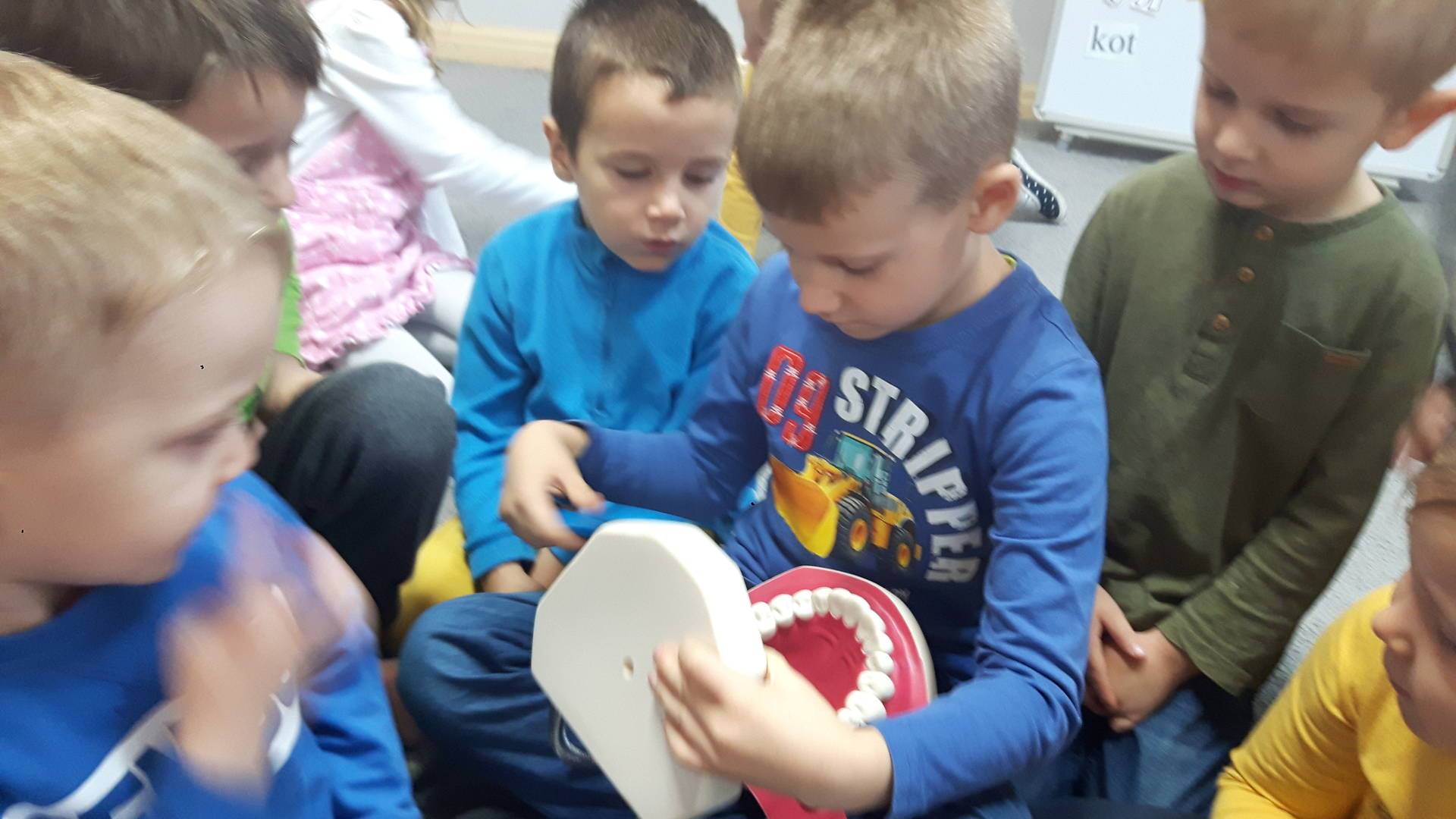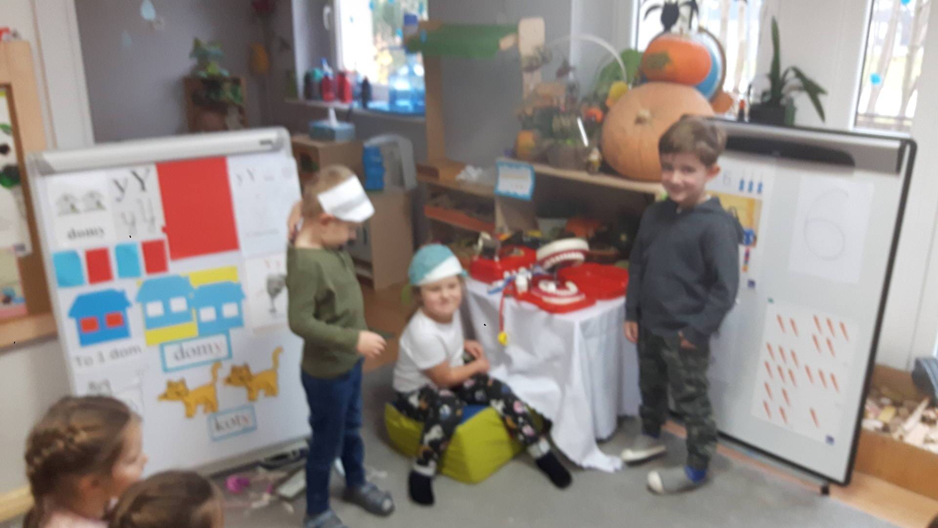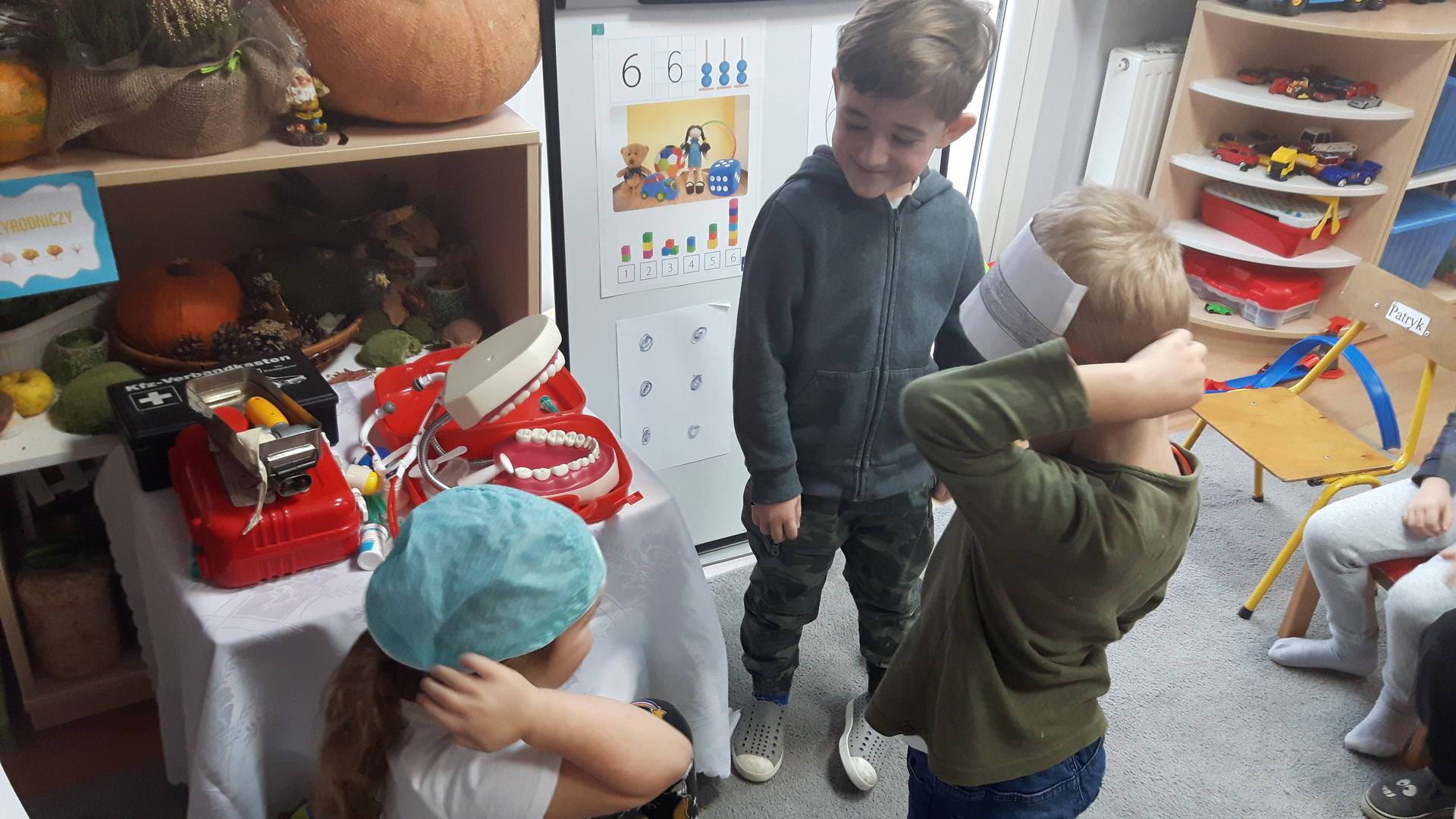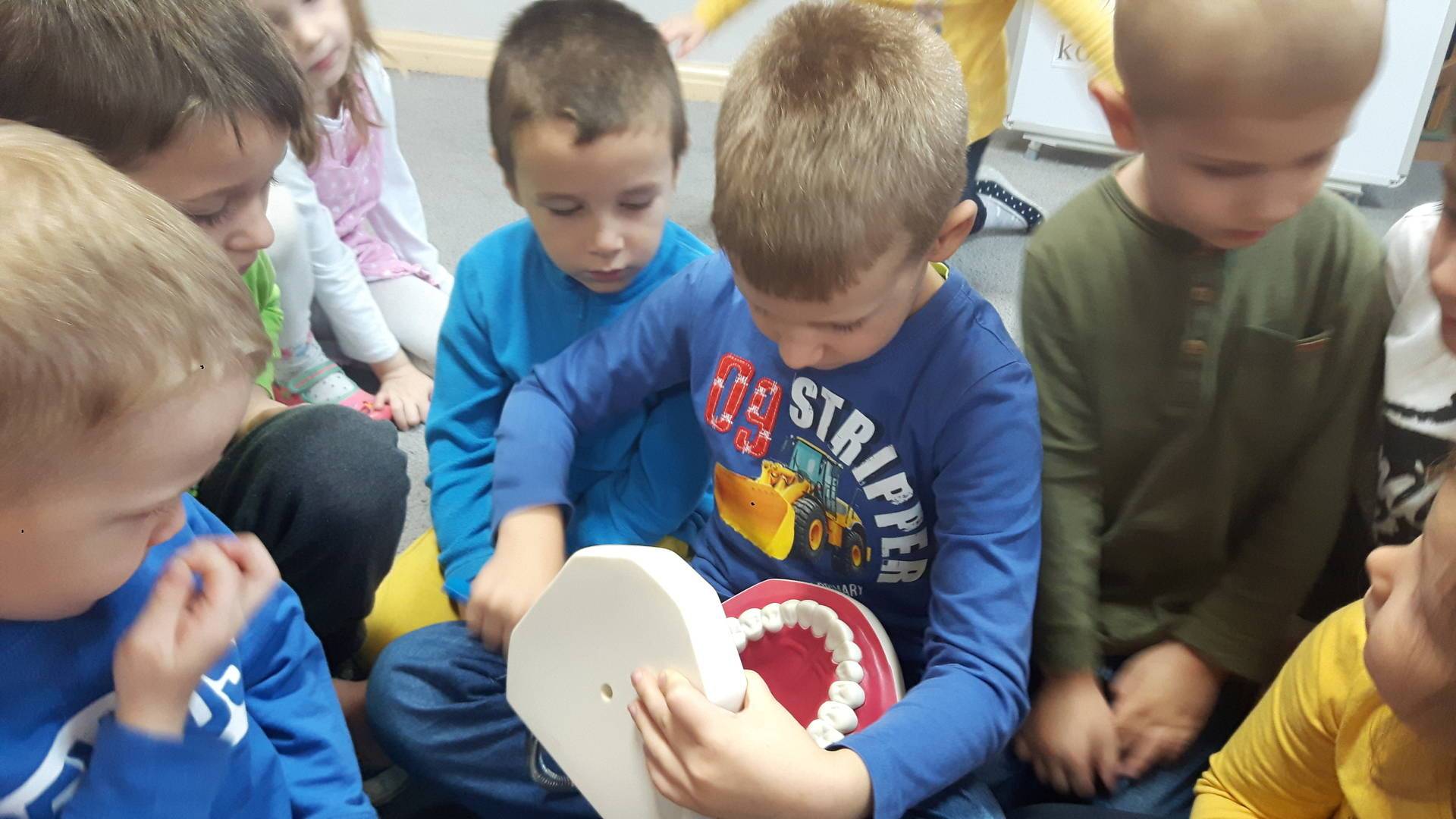 w tym tygodniu zajmujemy się zdrowiem: dowiadujemy się, co powinniśmy jeść, by mieć dużo siły i energii, i jak się ubierać, żeby nie zachorować. Wiemy jak należy poprawnie szczotkować zęby i gdzie się udać kiedy nas coś boli. Rozpoznawaliśmy różne gabinety lekarskie oraz narzędzia niezbędne w pracy lekarzy różnych specjalności, na przykład pediatry, stomatologa, laryngologa. Dużo czasu poświęcamy na zabawy ruchowe, bo ruch to zdrowie: biegaliśmy, skakaliśmy, rzucaliśmy woreczkami do celu.