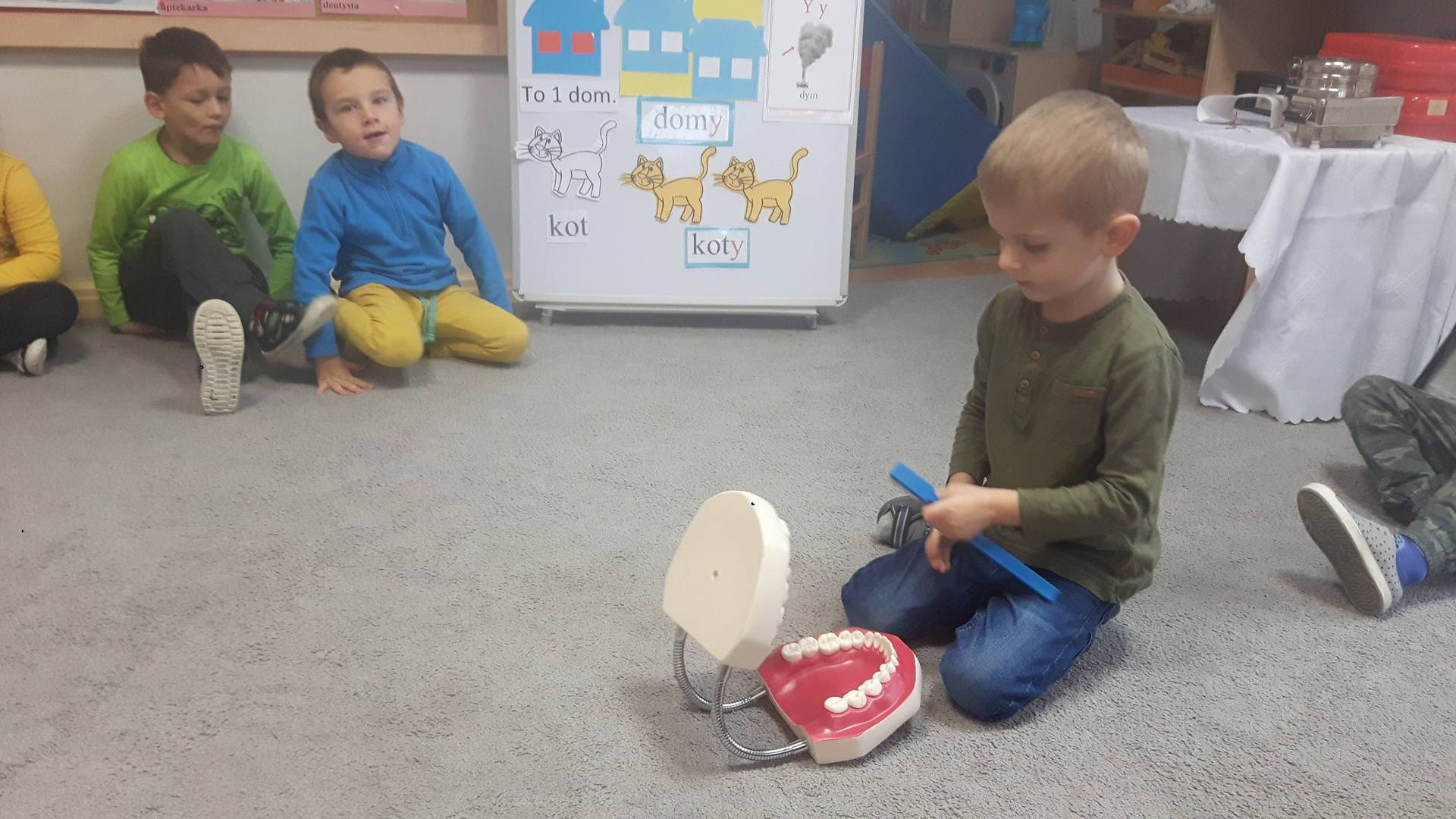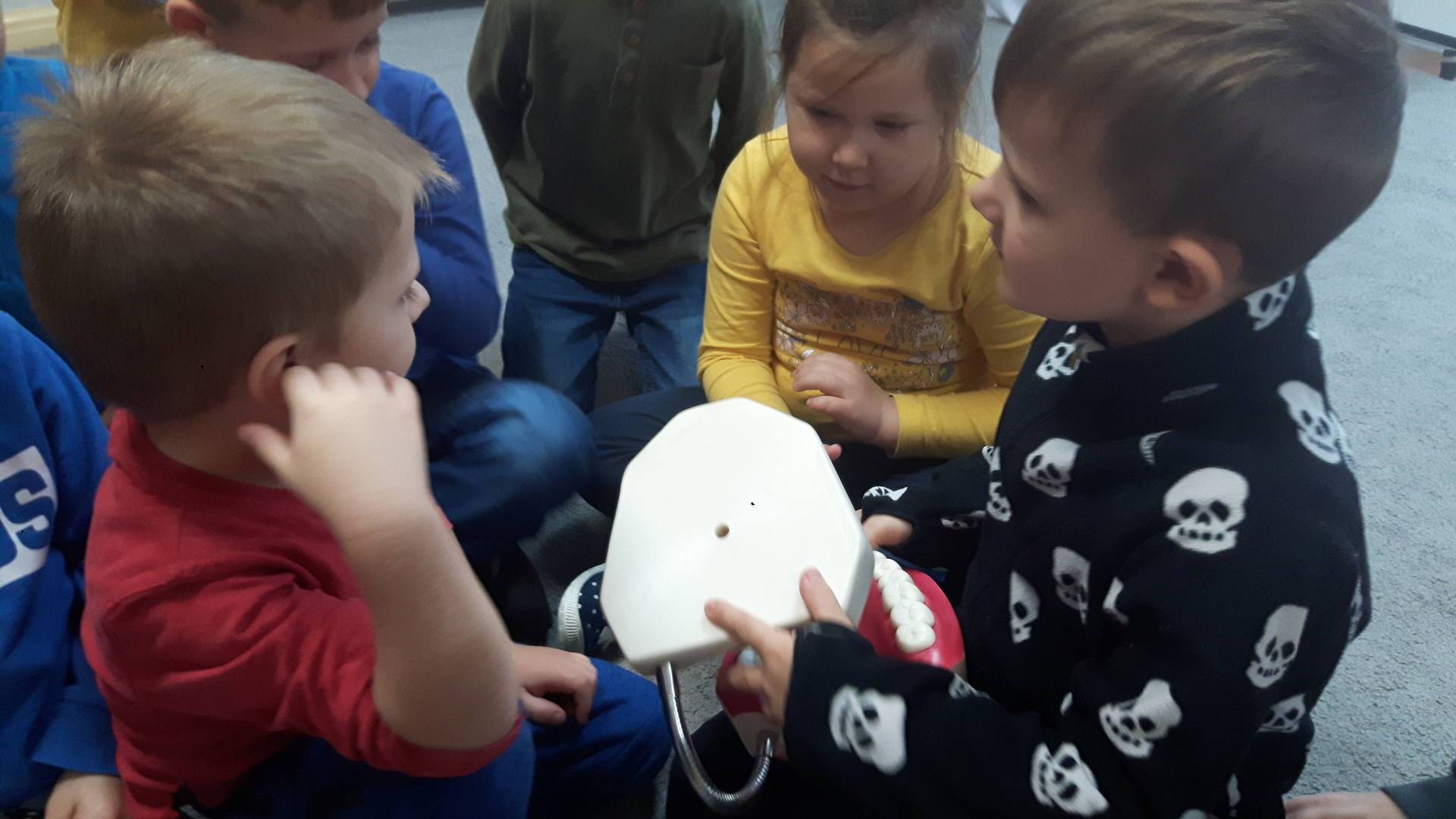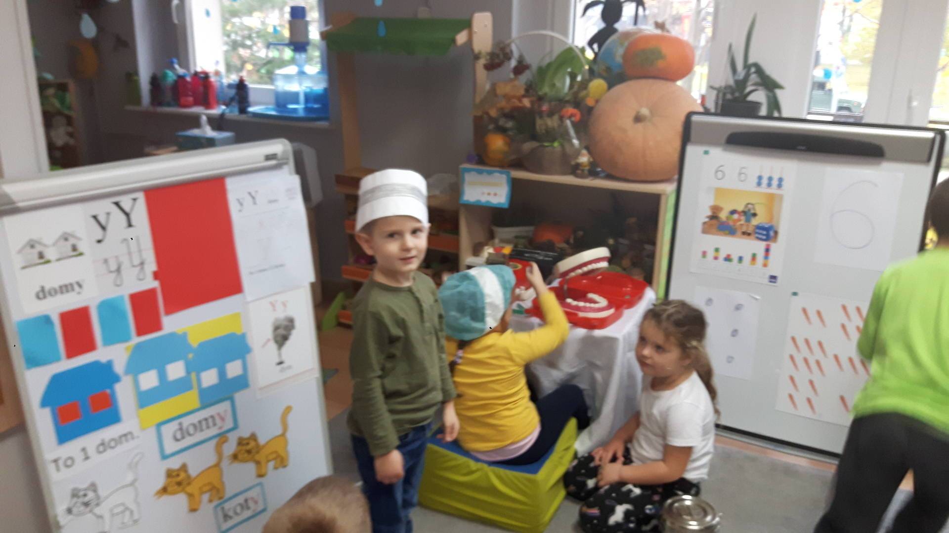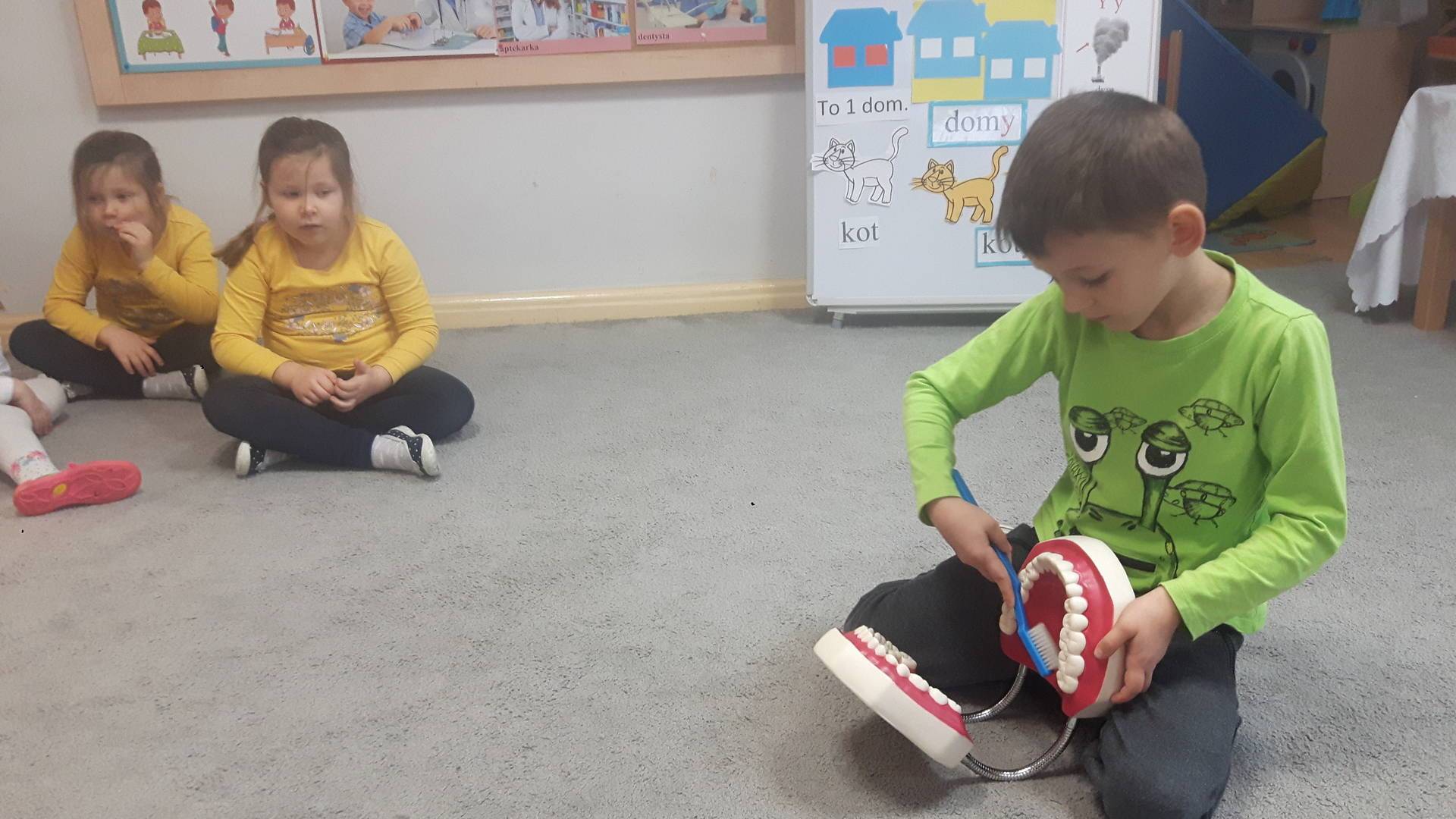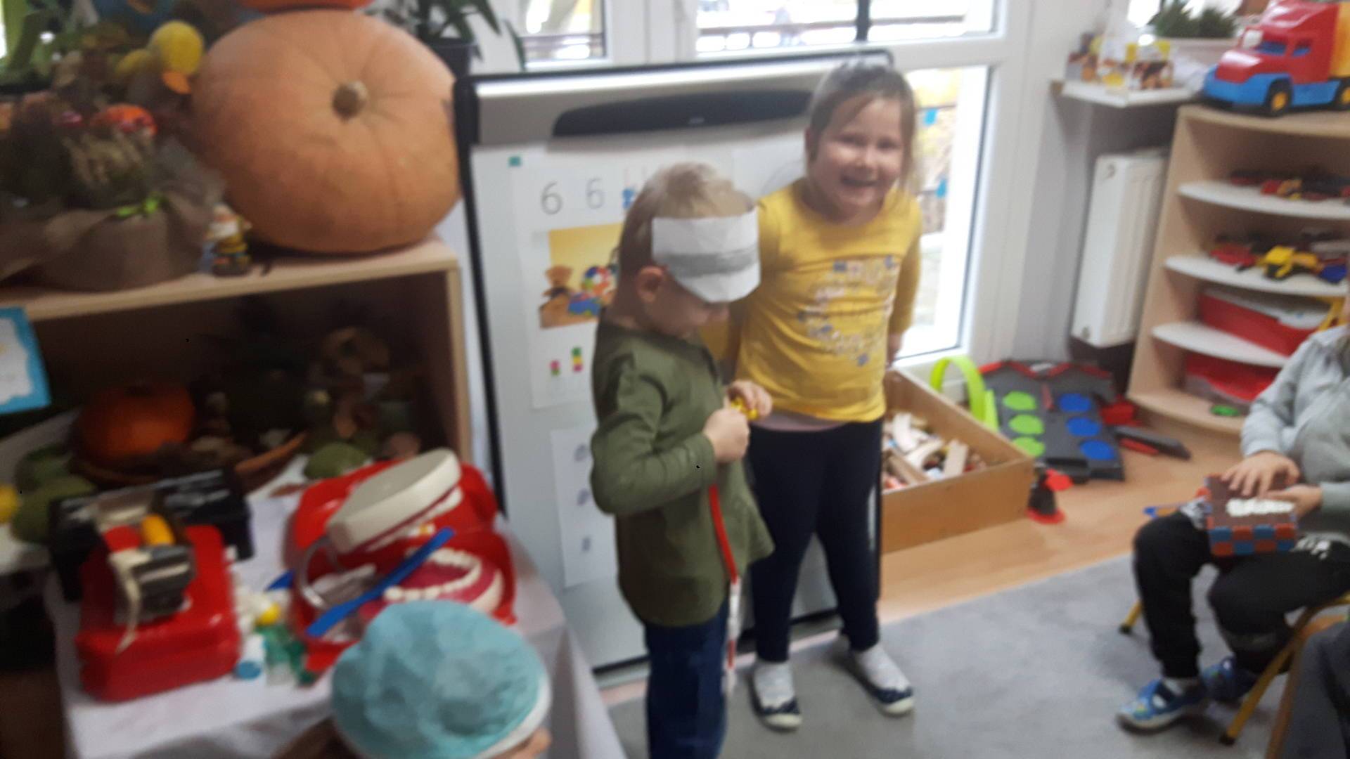 w tym tygodniu zajmujemy się zdrowiem: dowiadujemy się, co powinniśmy jeść, by mieć dużo siły i energii, i jak się ubierać, żeby nie zachorować. Wiemy jak należy poprawnie szczotkować zęby i gdzie się udać kiedy nas coś boli. Rozpoznawaliśmy różne gabinety lekarskie oraz narzędzia niezbędne w pracy lekarzy różnych specjalności, na przykład pediatry, stomatologa, laryngologa. Dużo czasu poświęcamy na zabawy ruchowe, bo ruch to zdrowie: biegaliśmy, skakaliśmy, rzucaliśmy woreczkami do celu.
