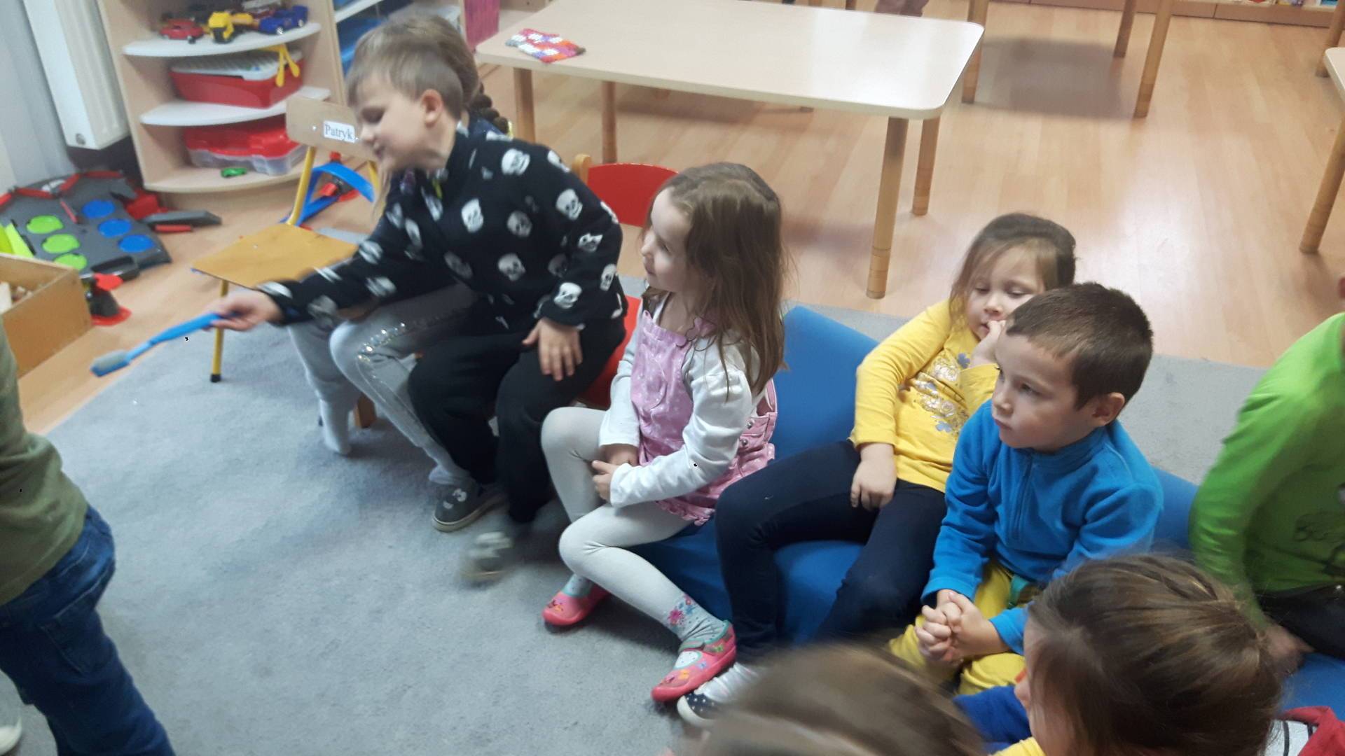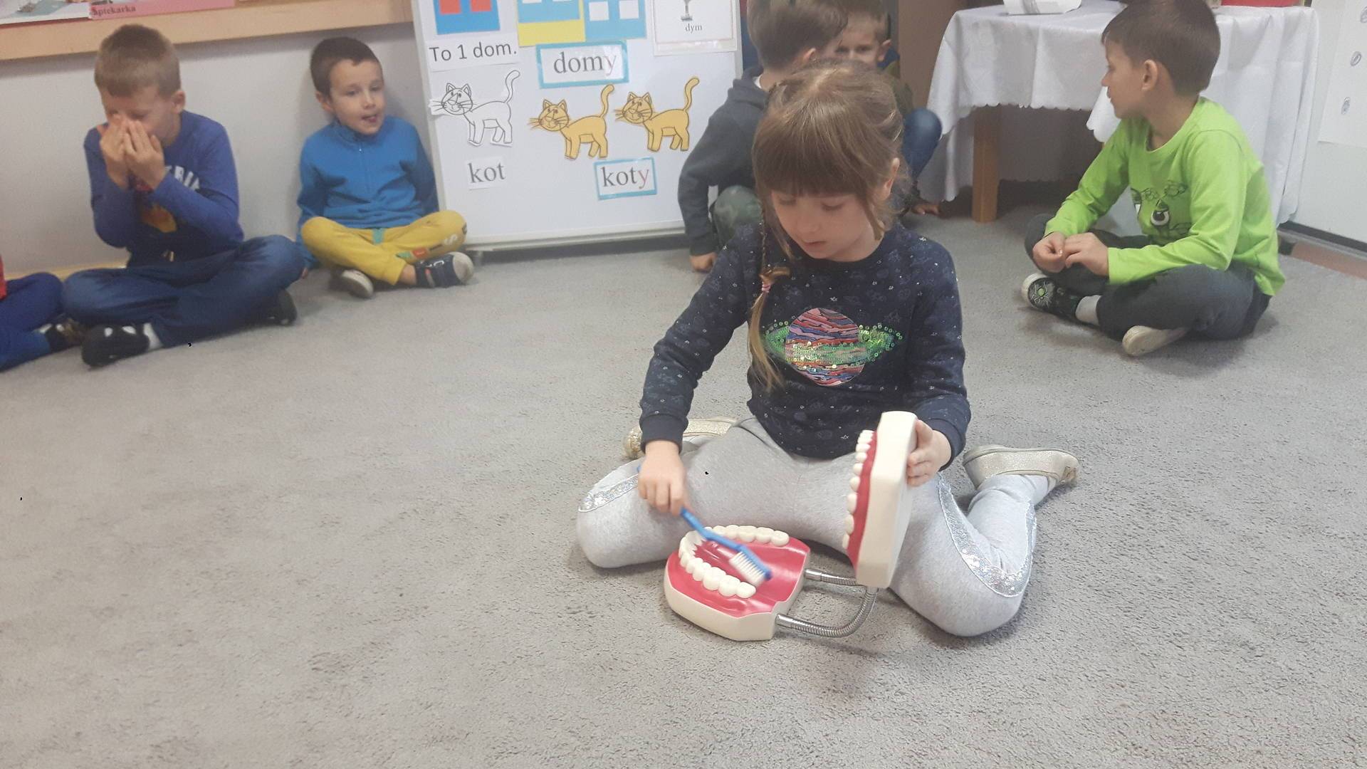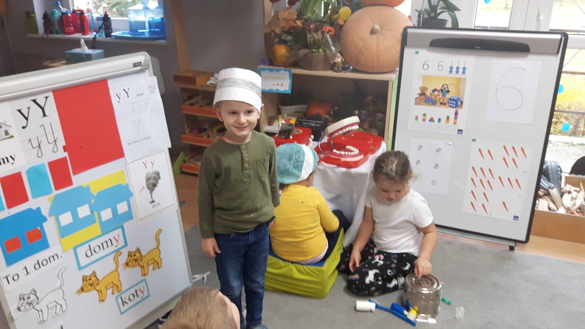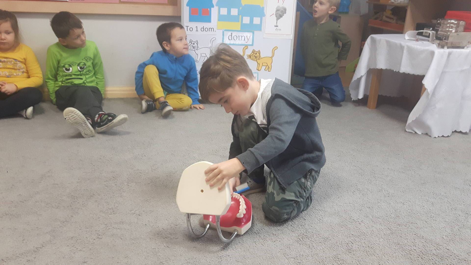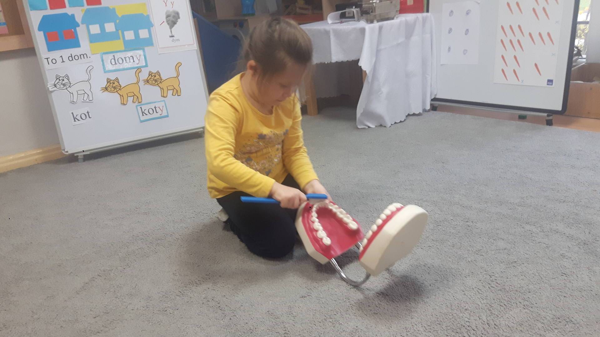 w tym tygodniu zajmujemy się zdrowiem: dowiadujemy się, co powinniśmy jeść, by mieć dużo siły i energii, i jak się ubierać, żeby nie zachorować. Wiemy jak należy poprawnie szczotkować zęby i gdzie się udać kiedy nas coś boli. Rozpoznawaliśmy różne gabinety lekarskie oraz narzędzia niezbędne w pracy lekarzy różnych specjalności, na przykład pediatry, stomatologa, laryngologa. Dużo czasu poświęcamy na zabawy ruchowe, bo ruch to zdrowie: biegaliśmy, skakaliśmy, rzucaliśmy woreczkami do celu.