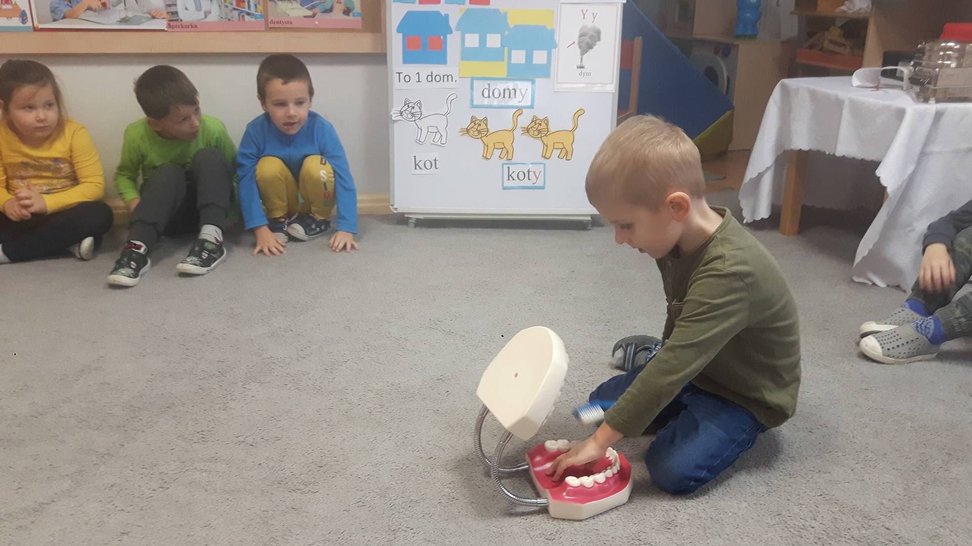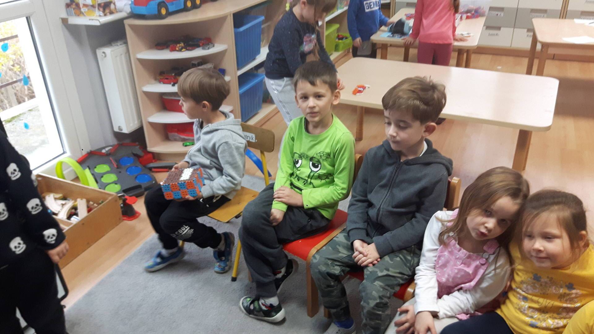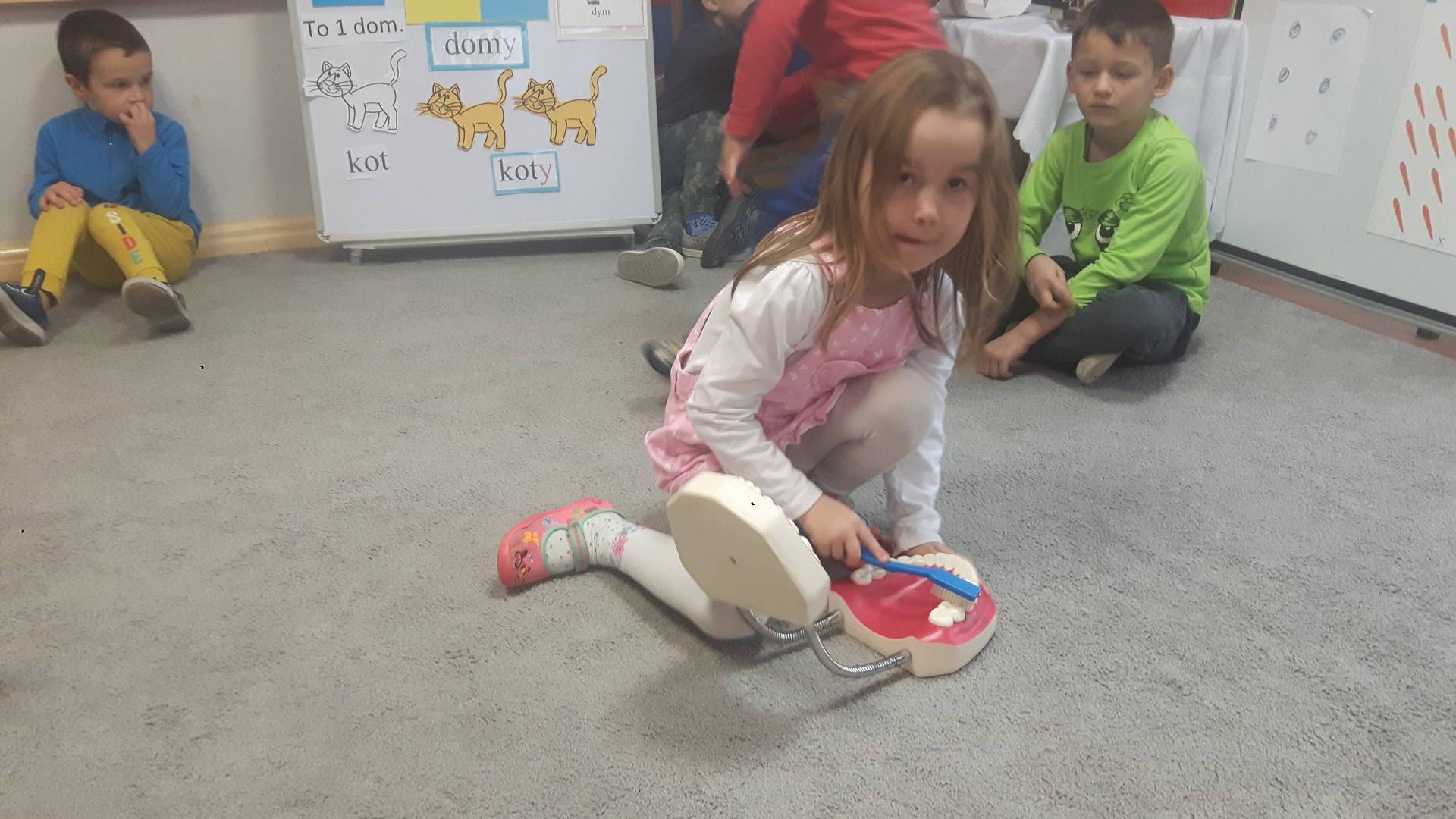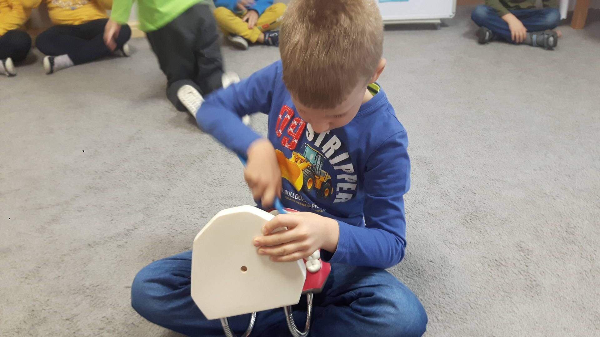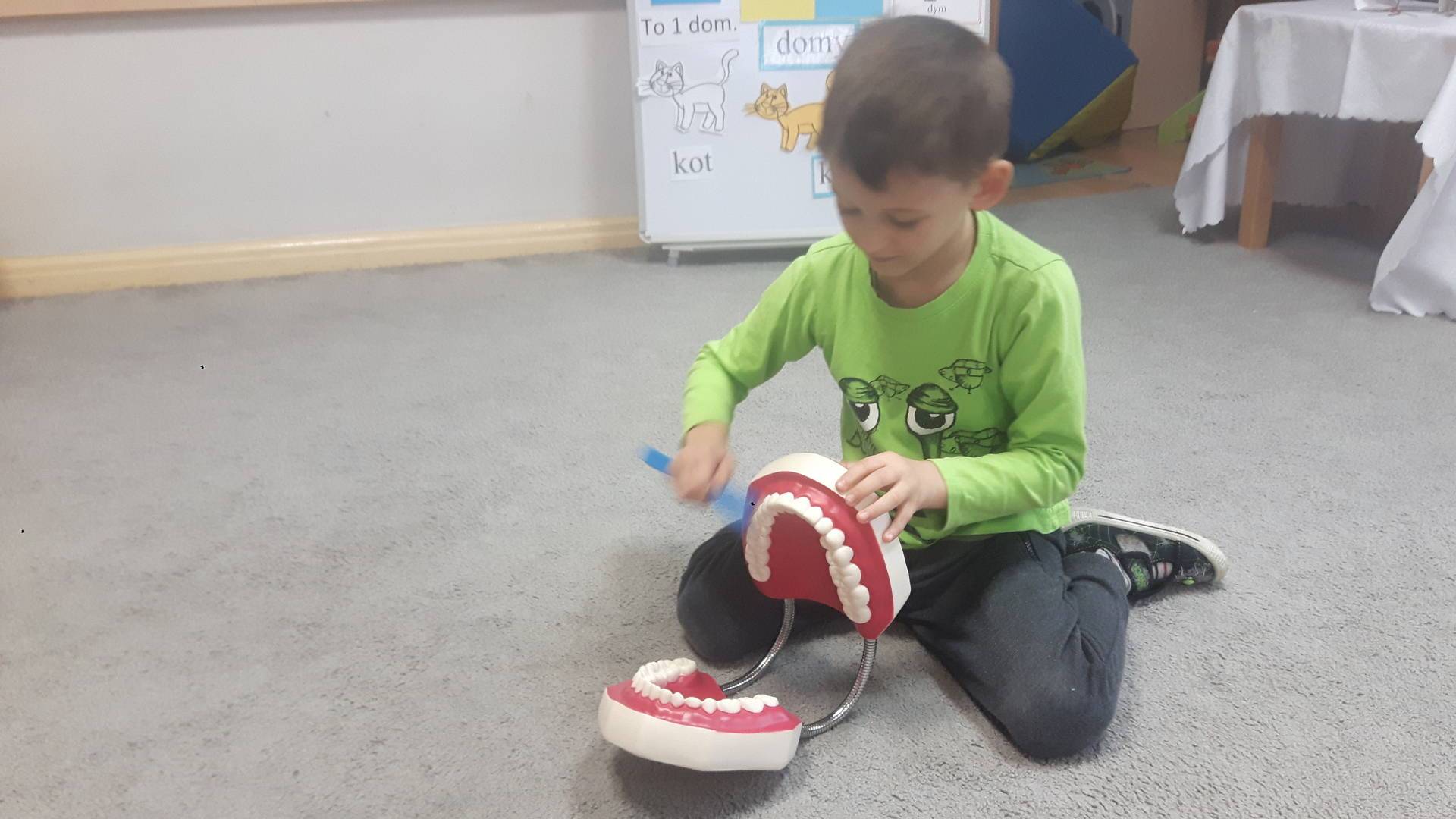 w tym tygodniu zajmujemy się zdrowiem: dowiadujemy się, co powinniśmy jeść, by mieć dużo siły i energii, i jak się ubierać, żeby nie zachorować. Wiemy jak należy poprawnie szczotkować zęby i gdzie się udać kiedy nas coś boli. Rozpoznawaliśmy różne gabinety lekarskie oraz narzędzia niezbędne w pracy lekarzy różnych specjalności, na przykład pediatry, stomatologa, laryngologa. Dużo czasu poświęcamy na zabawy ruchowe, bo ruch to zdrowie: biegaliśmy, skakaliśmy, rzucaliśmy woreczkami do celu.