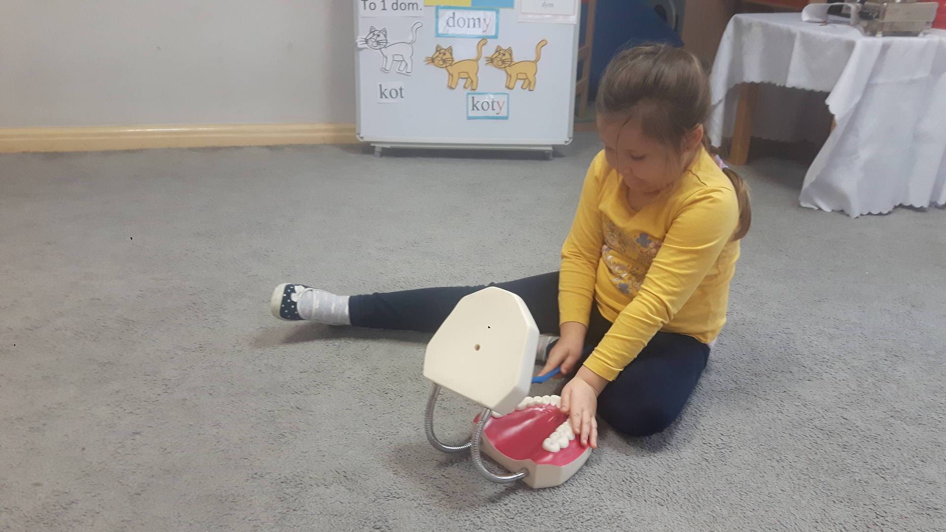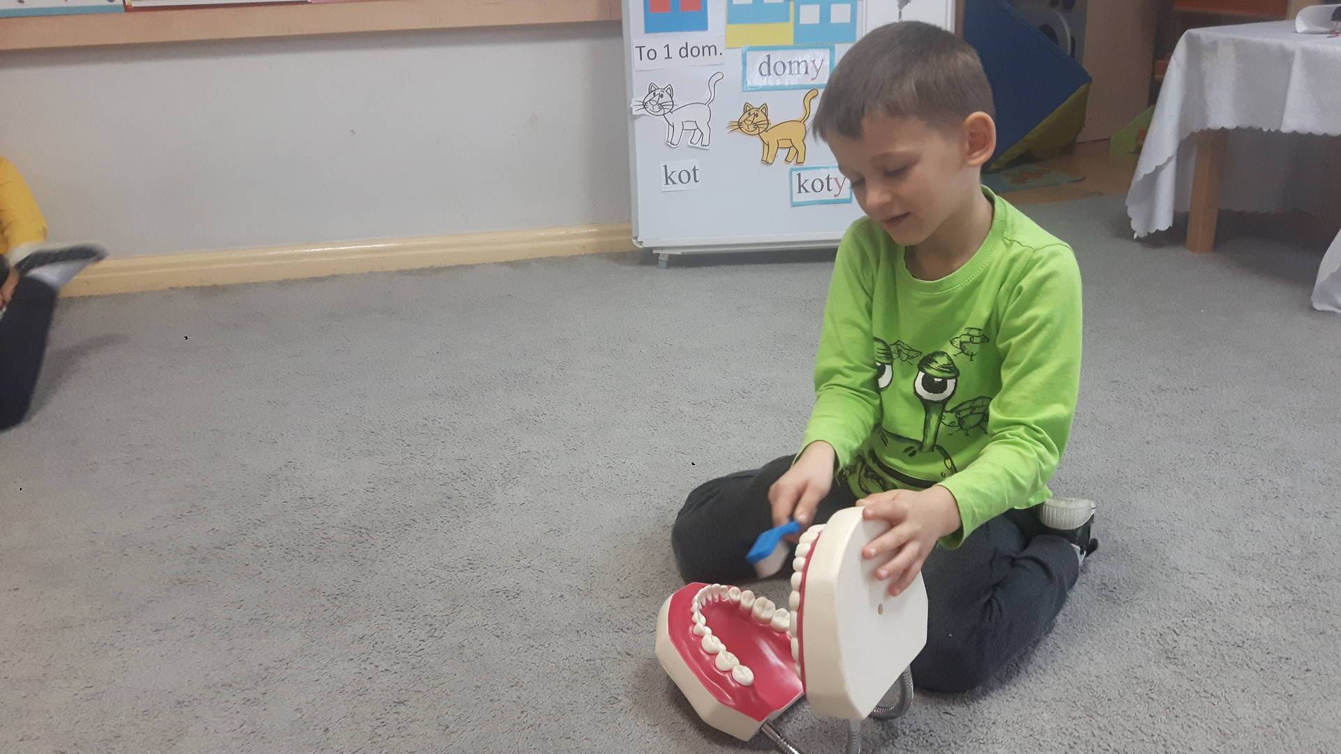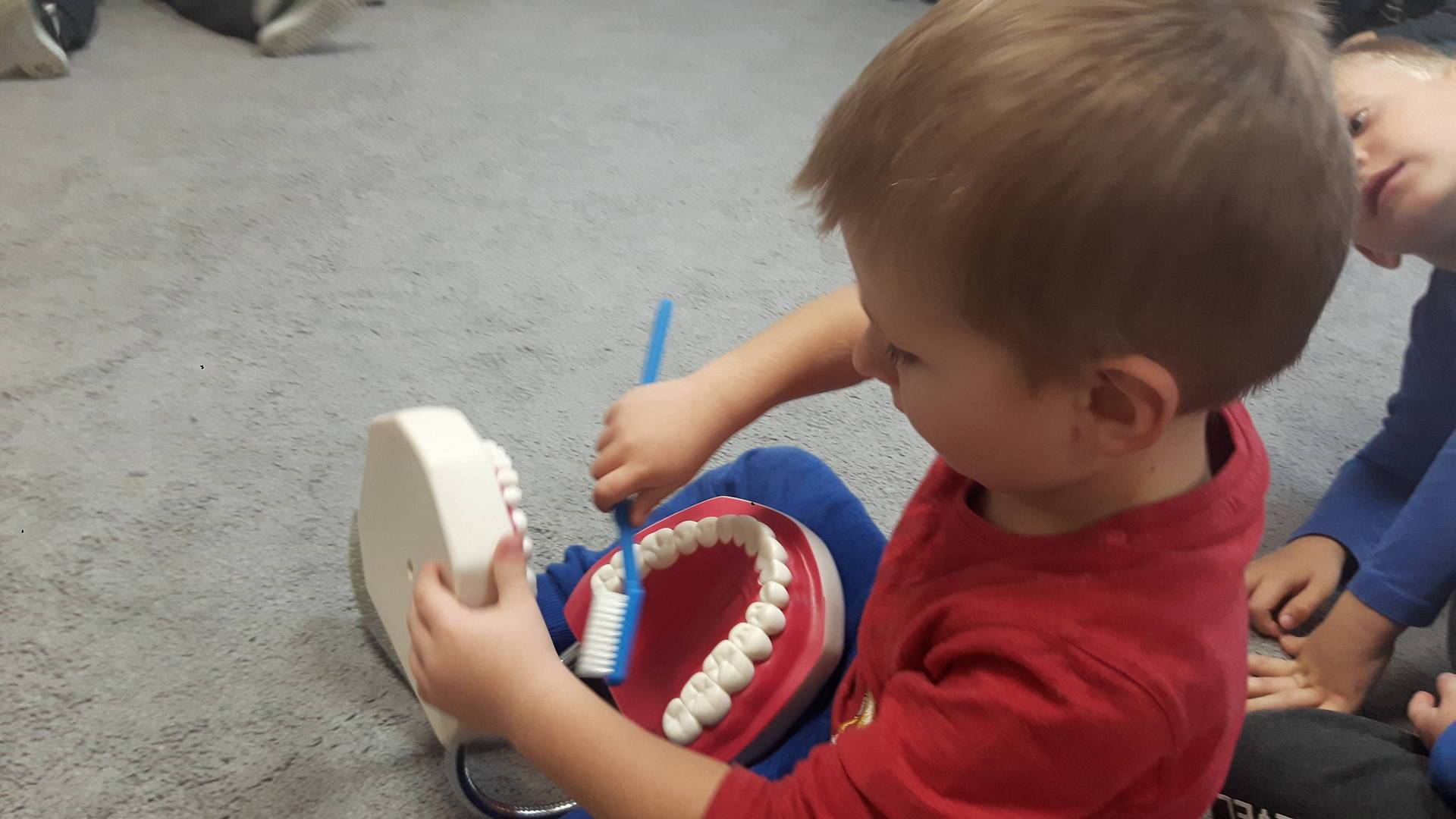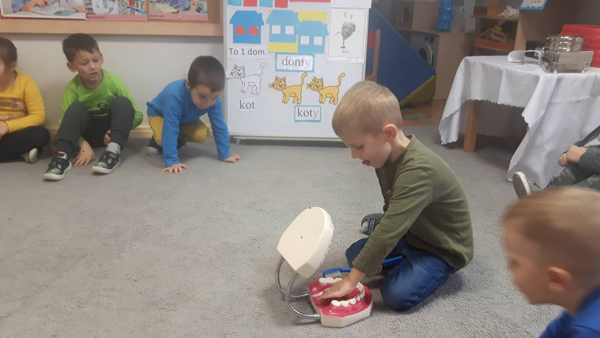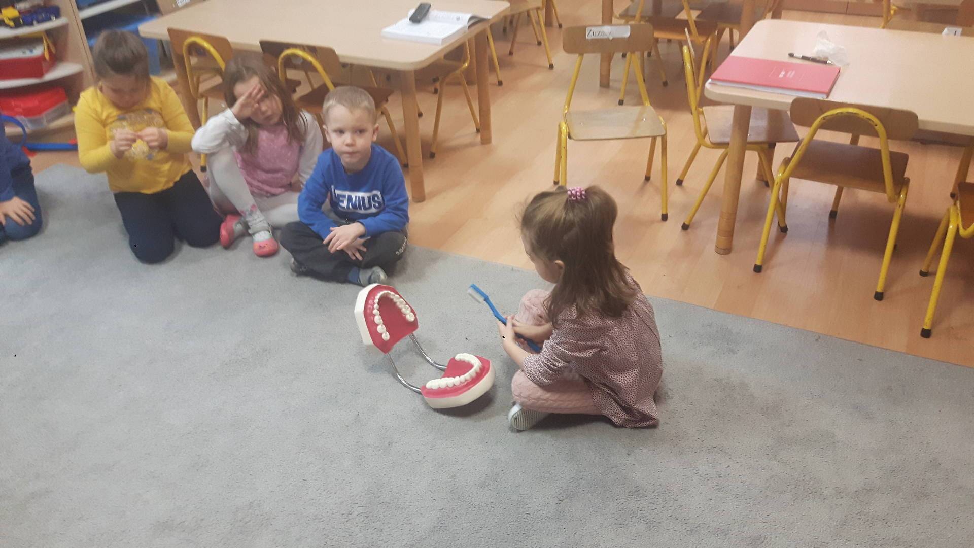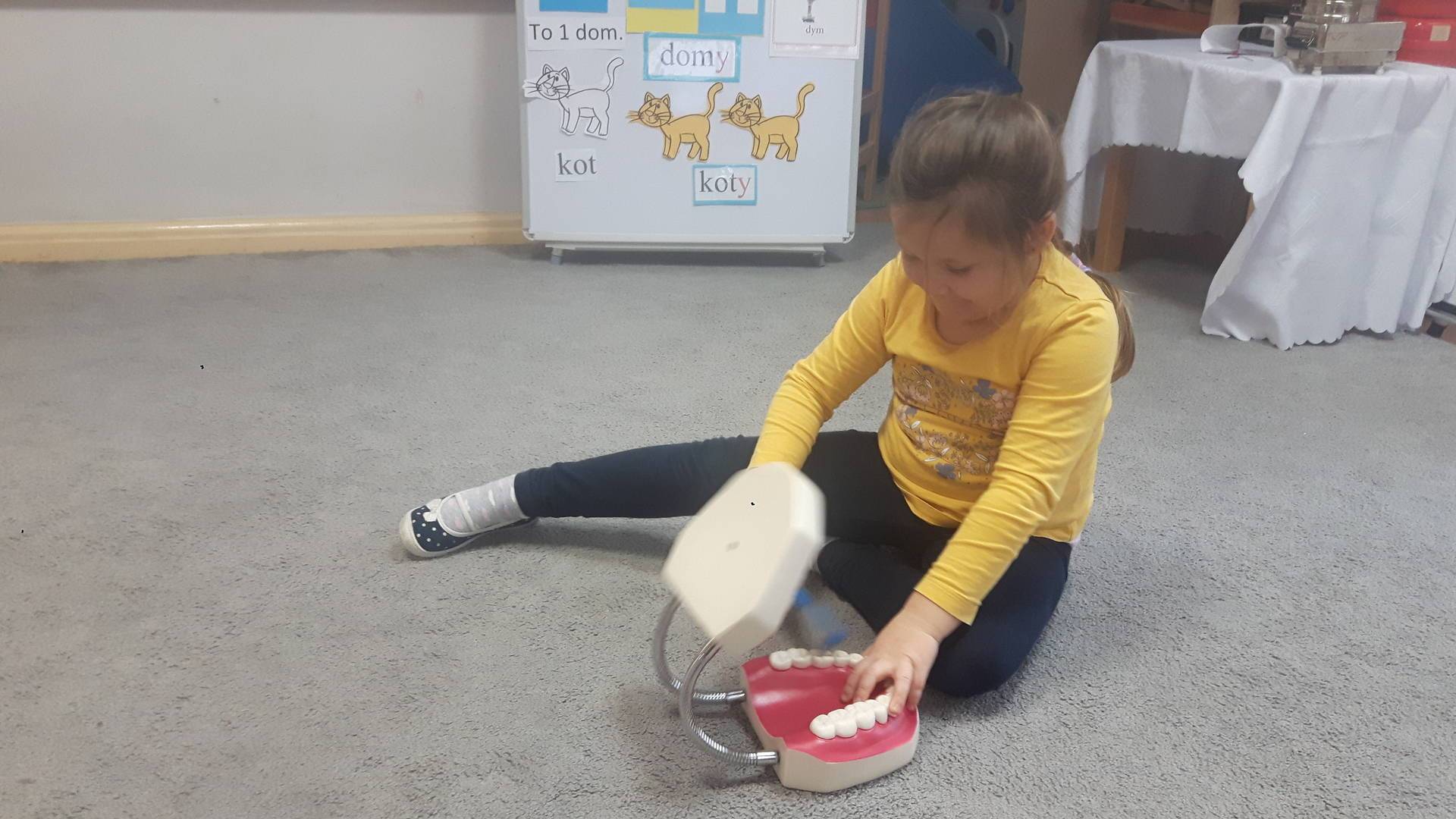 w tym tygodniu zajmujemy się zdrowiem: dowiadujemy się, co powinniśmy jeść, by mieć dużo siły i energii, i jak się ubierać, żeby nie zachorować. Wiemy jak należy poprawnie szczotkować zęby i gdzie się udać kiedy nas coś boli. Rozpoznawaliśmy różne gabinety lekarskie oraz narzędzia niezbędne w pracy lekarzy różnych specjalności, na przykład pediatry, stomatologa, laryngologa. Dużo czasu poświęcamy na zabawy ruchowe, bo ruch to zdrowie: biegaliśmy, skakaliśmy, rzucaliśmy woreczkami do celu.