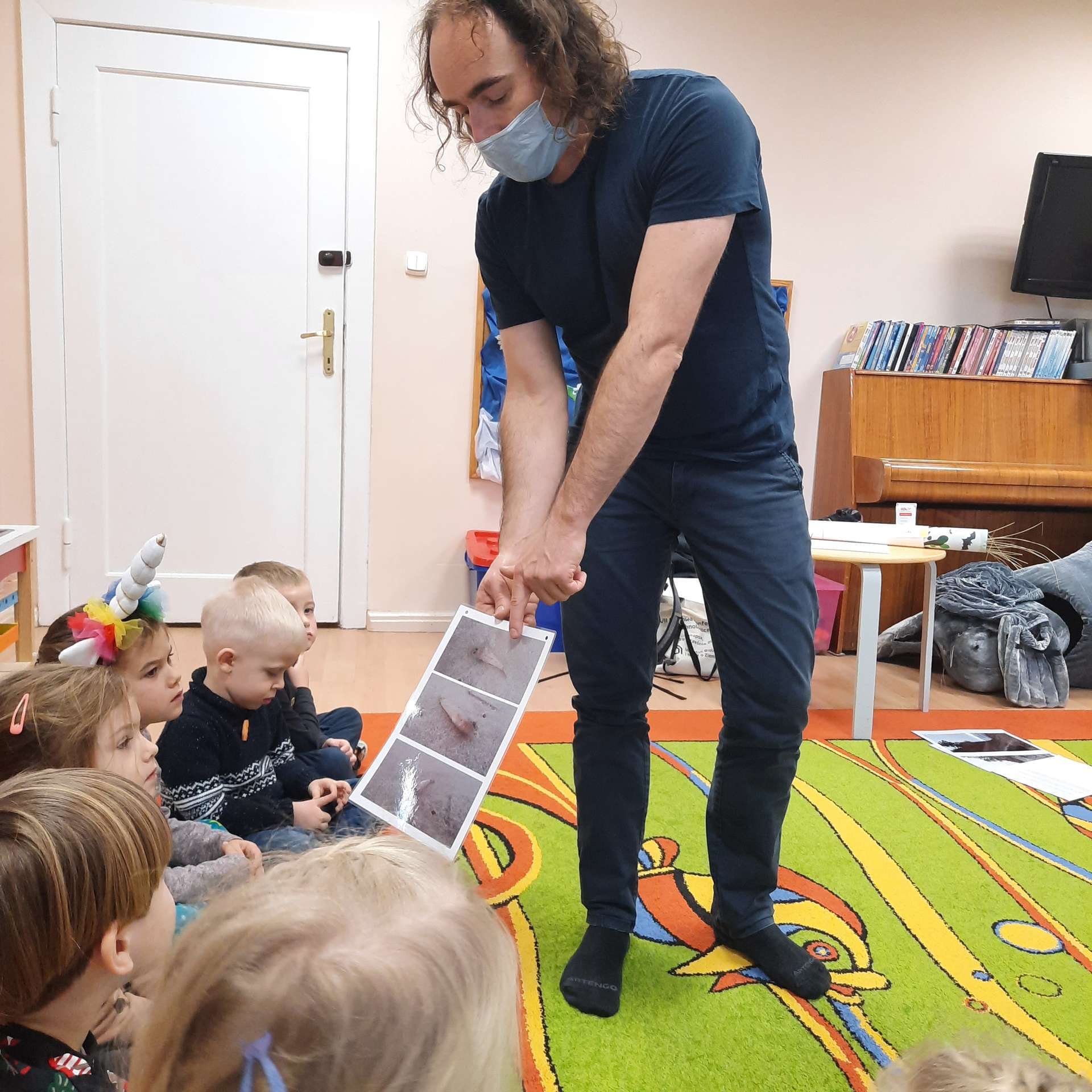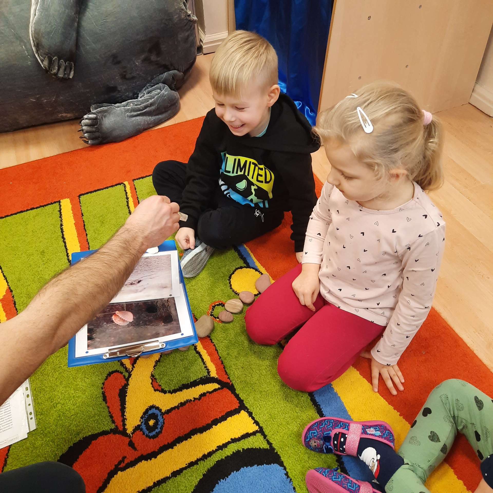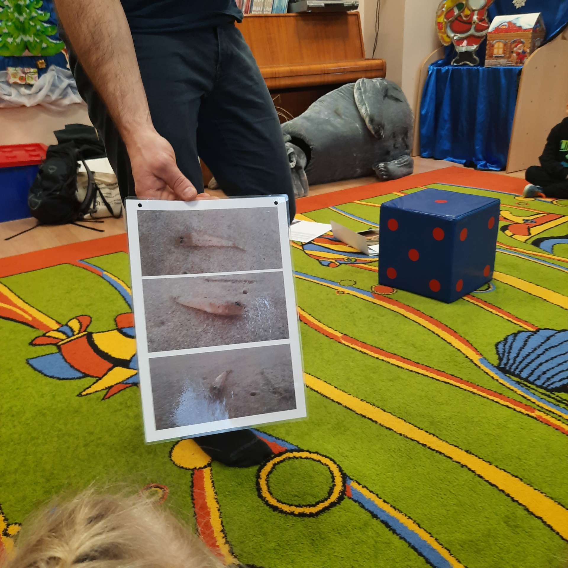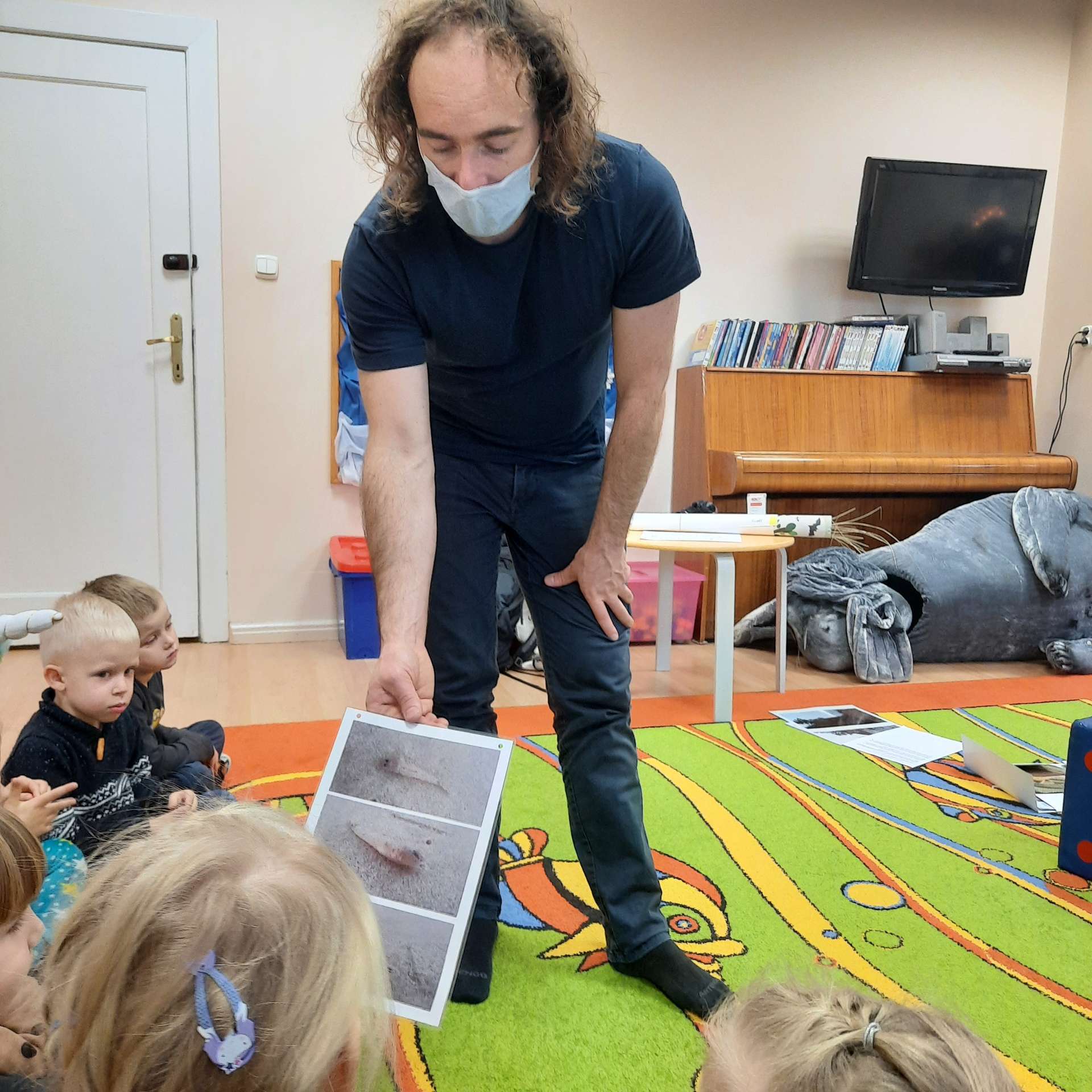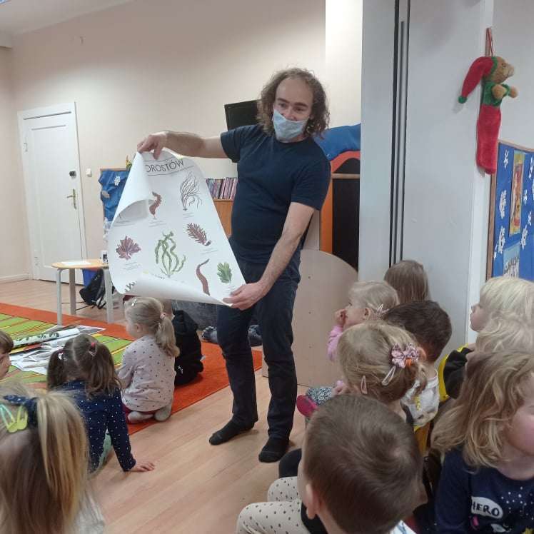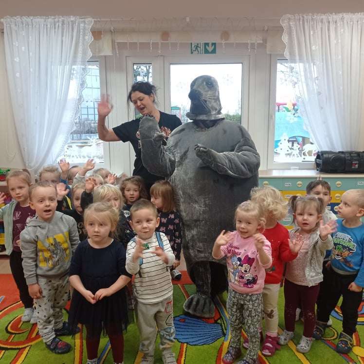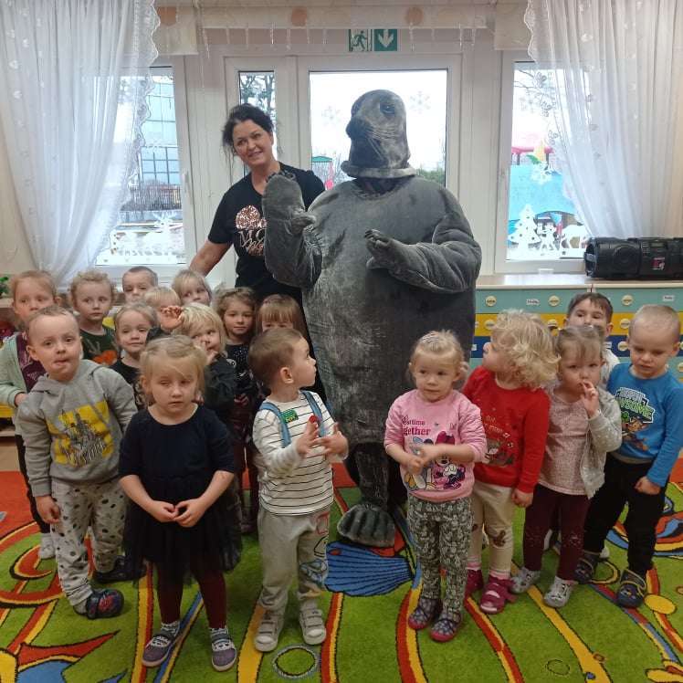 Zajęcia rozpoczęły się od przywitania z niesamowitym gościem - foką. Podczas zajęć dzieci dowiedziały się wielu ciekawostek o zwierzętach morskich, rybach, roślinności i wydmach. Podczas zajęć wykorzystano wierszyki i rymowanki związane z naszym Morzem Bałtyckim. Dzięki nim dzieci szybko przyswoiły nowe wiadomości.