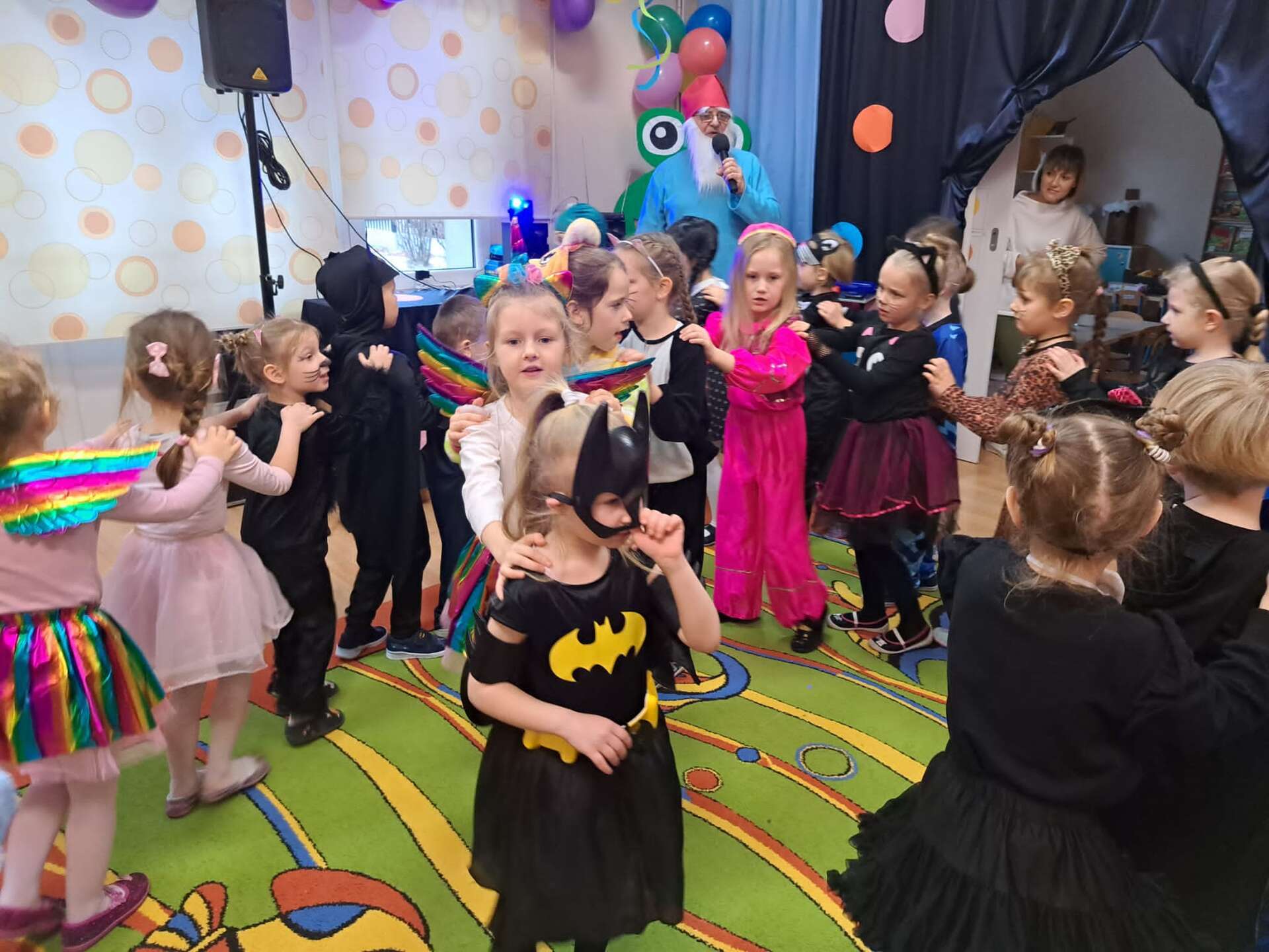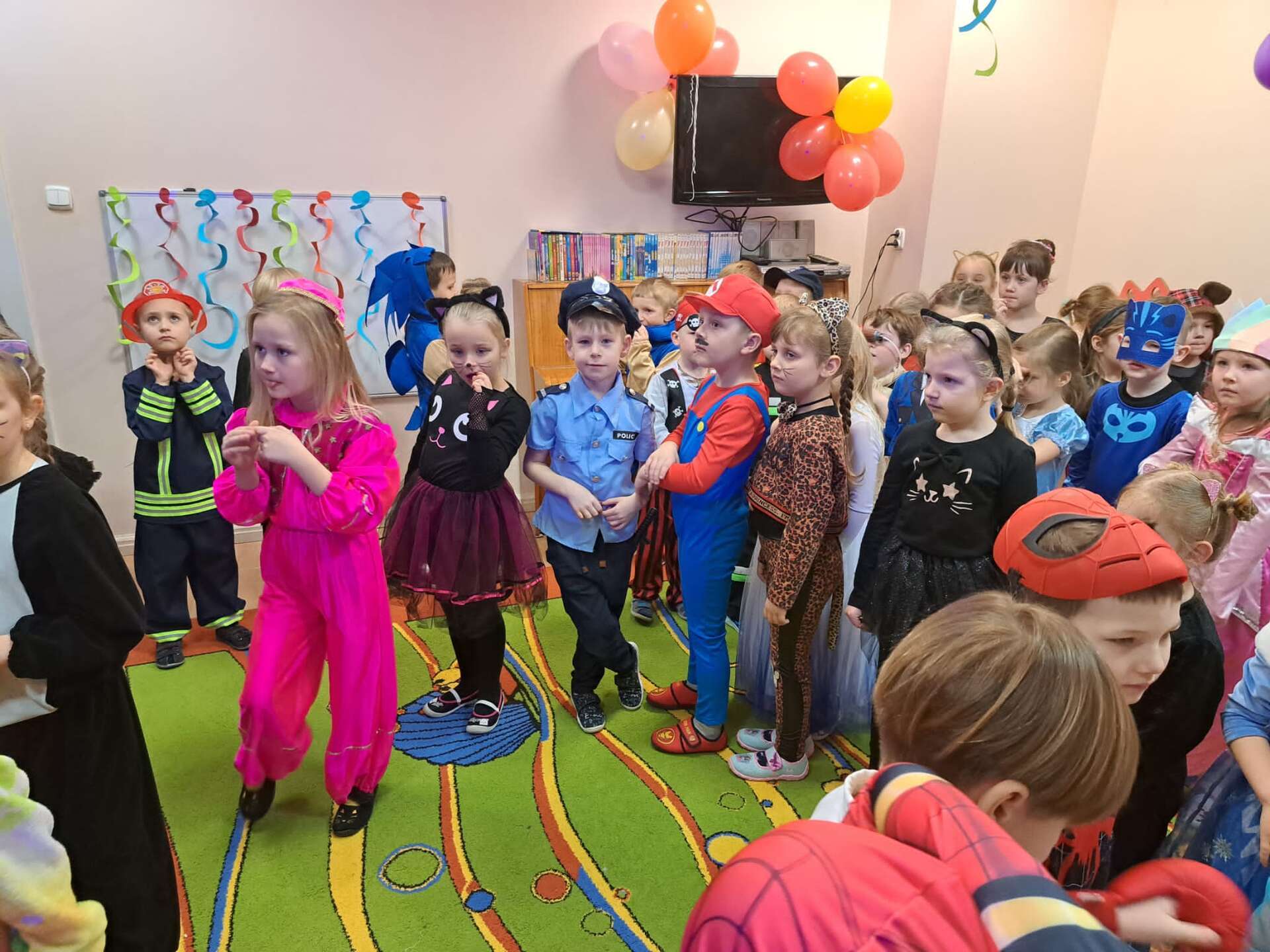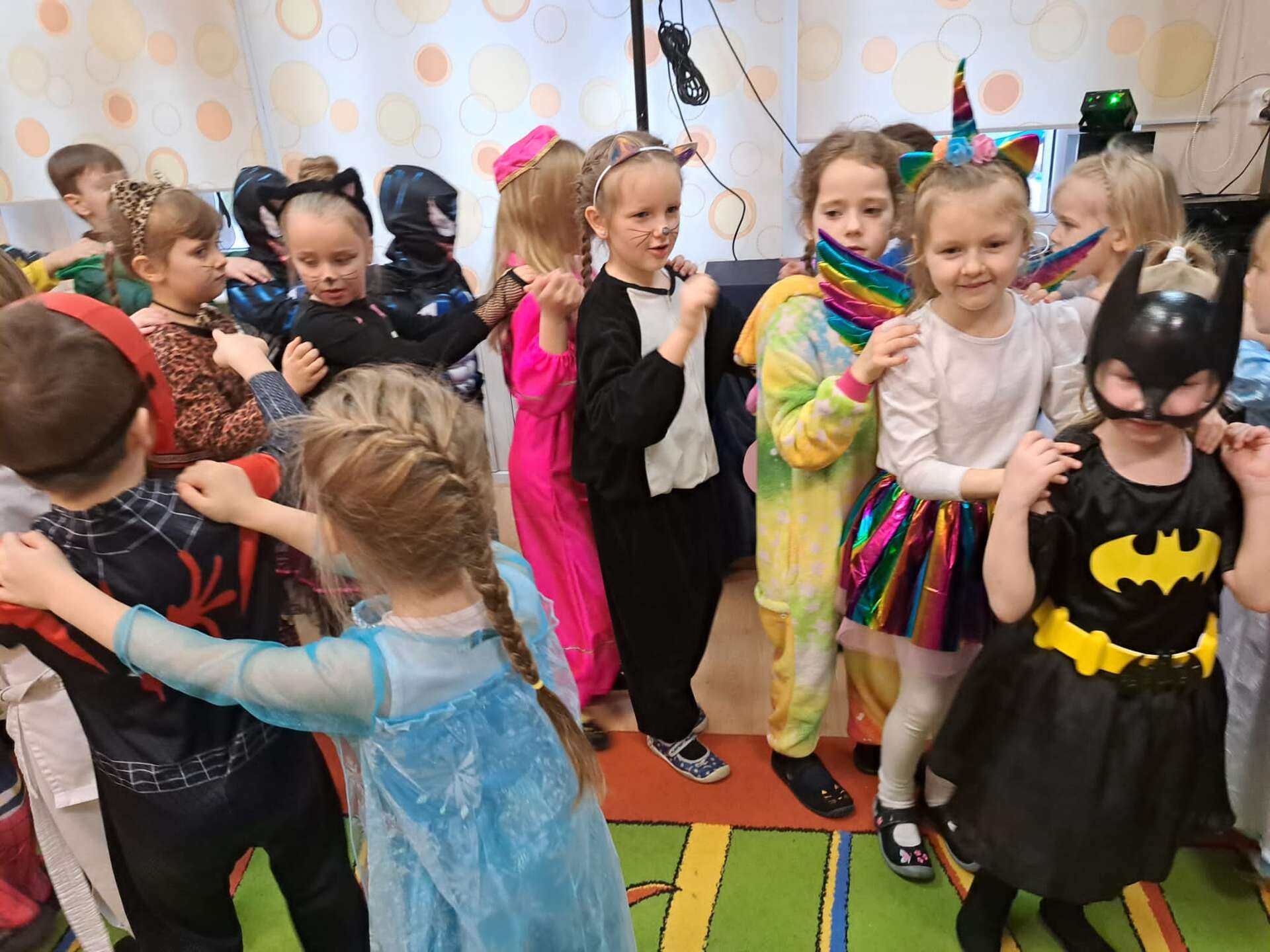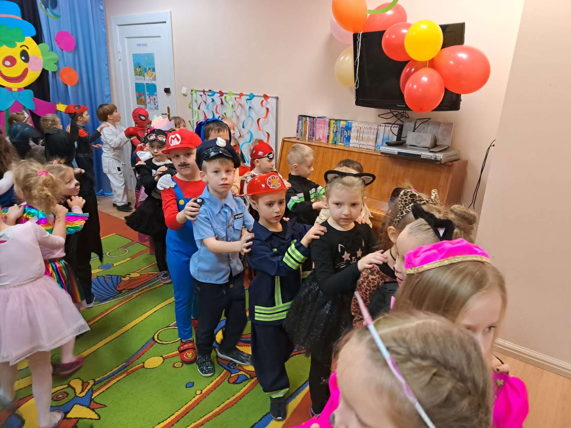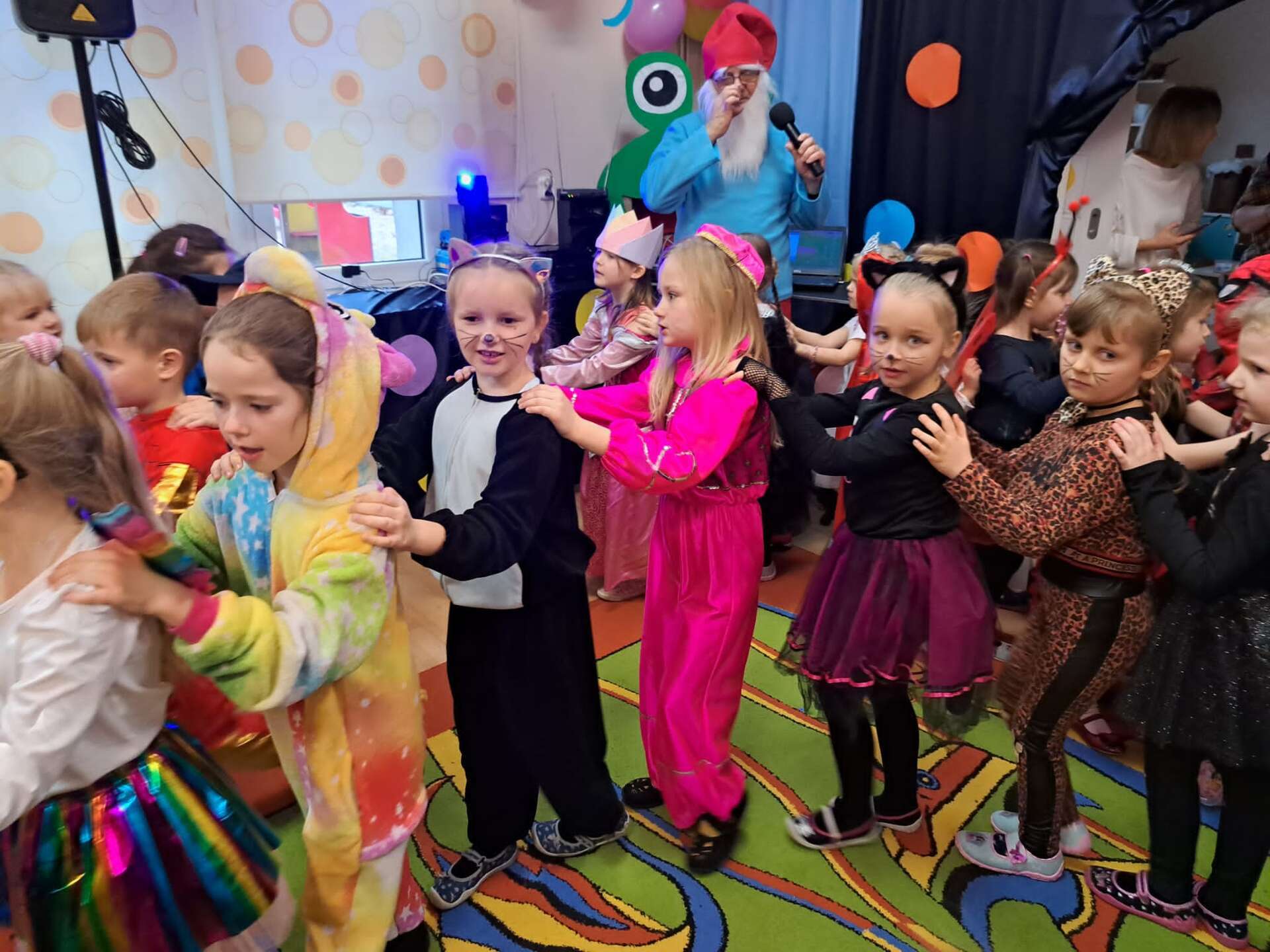 Grupa dzieci ustawiona w "pociąg" bawi się na balu