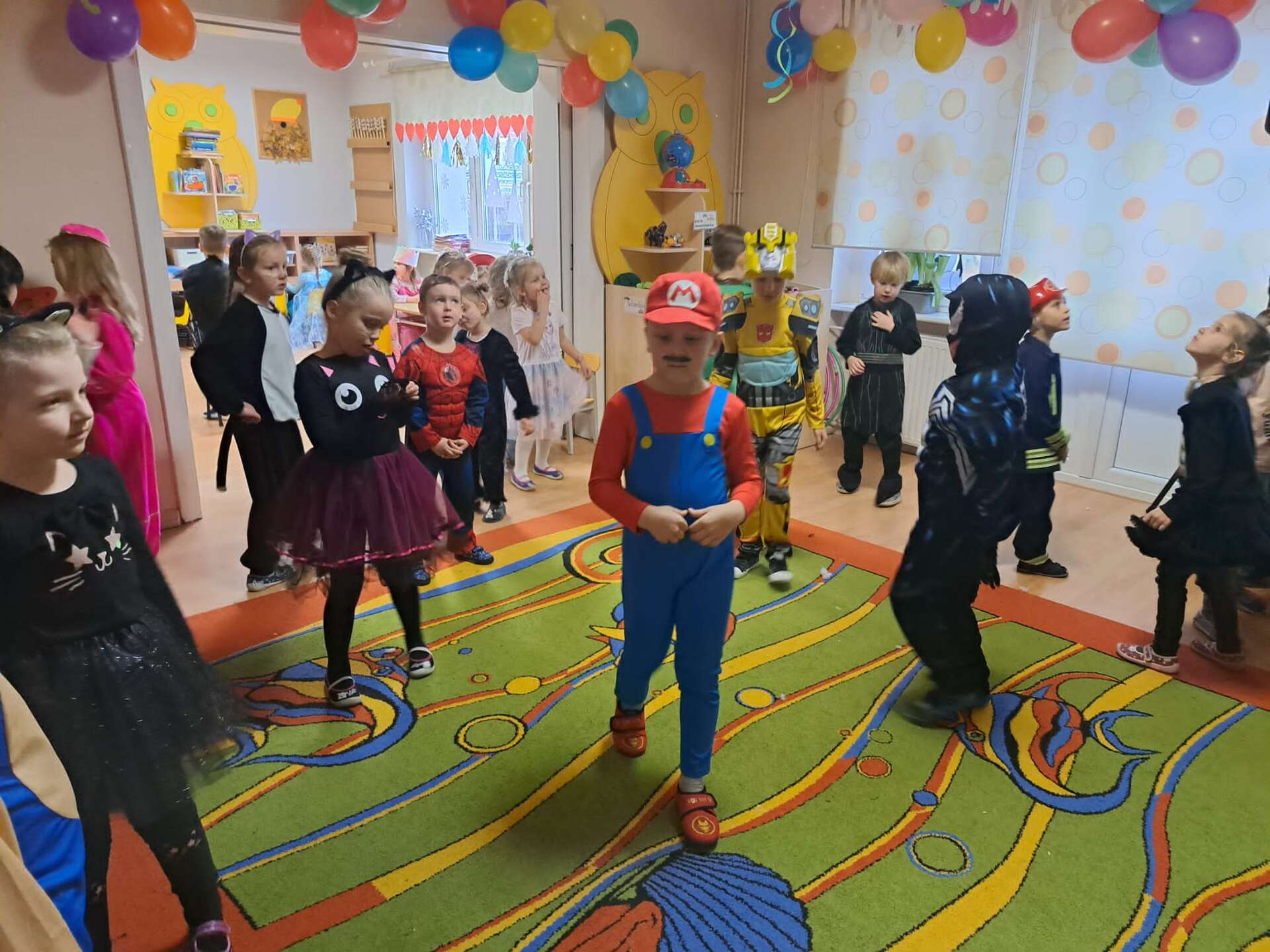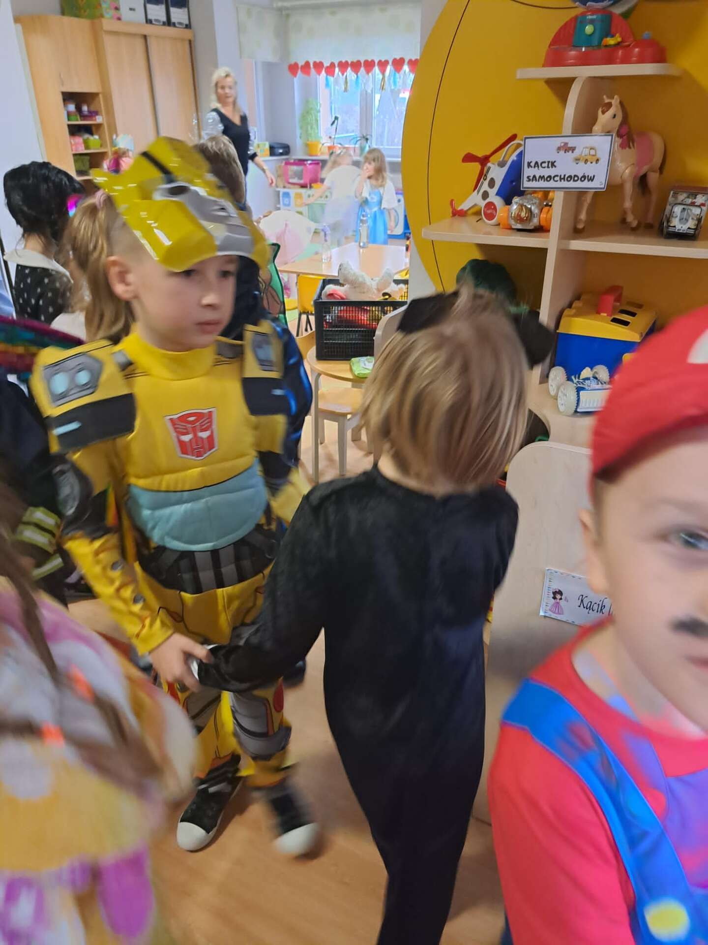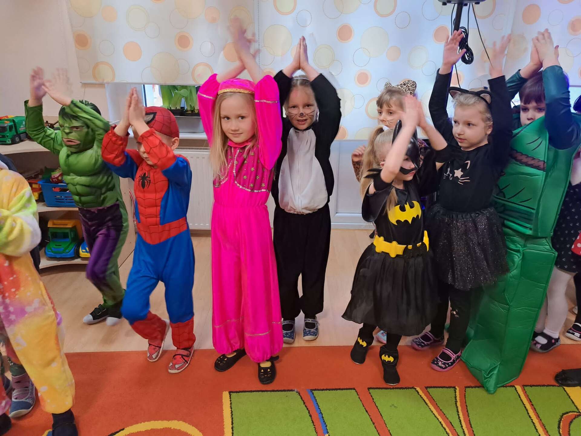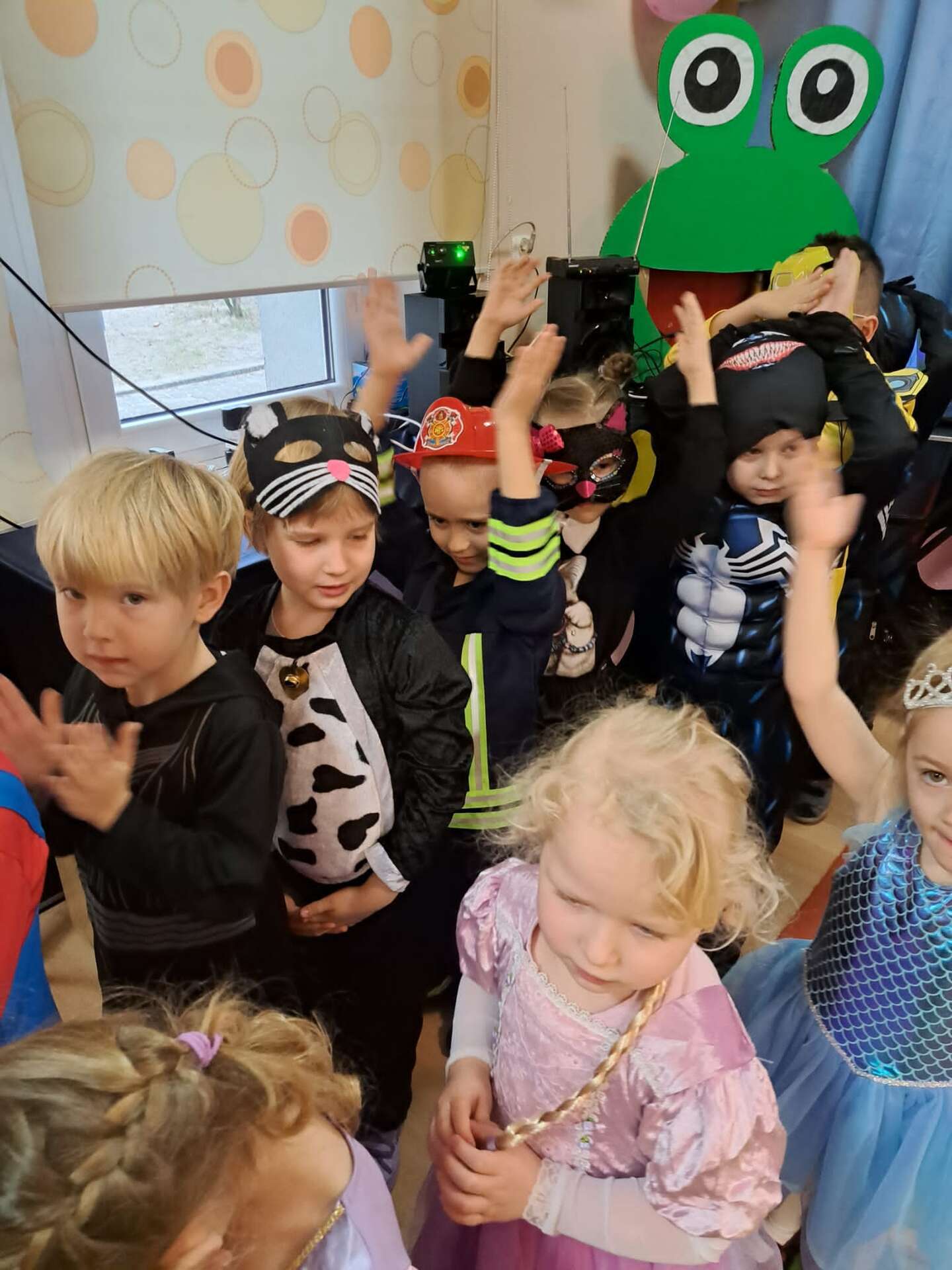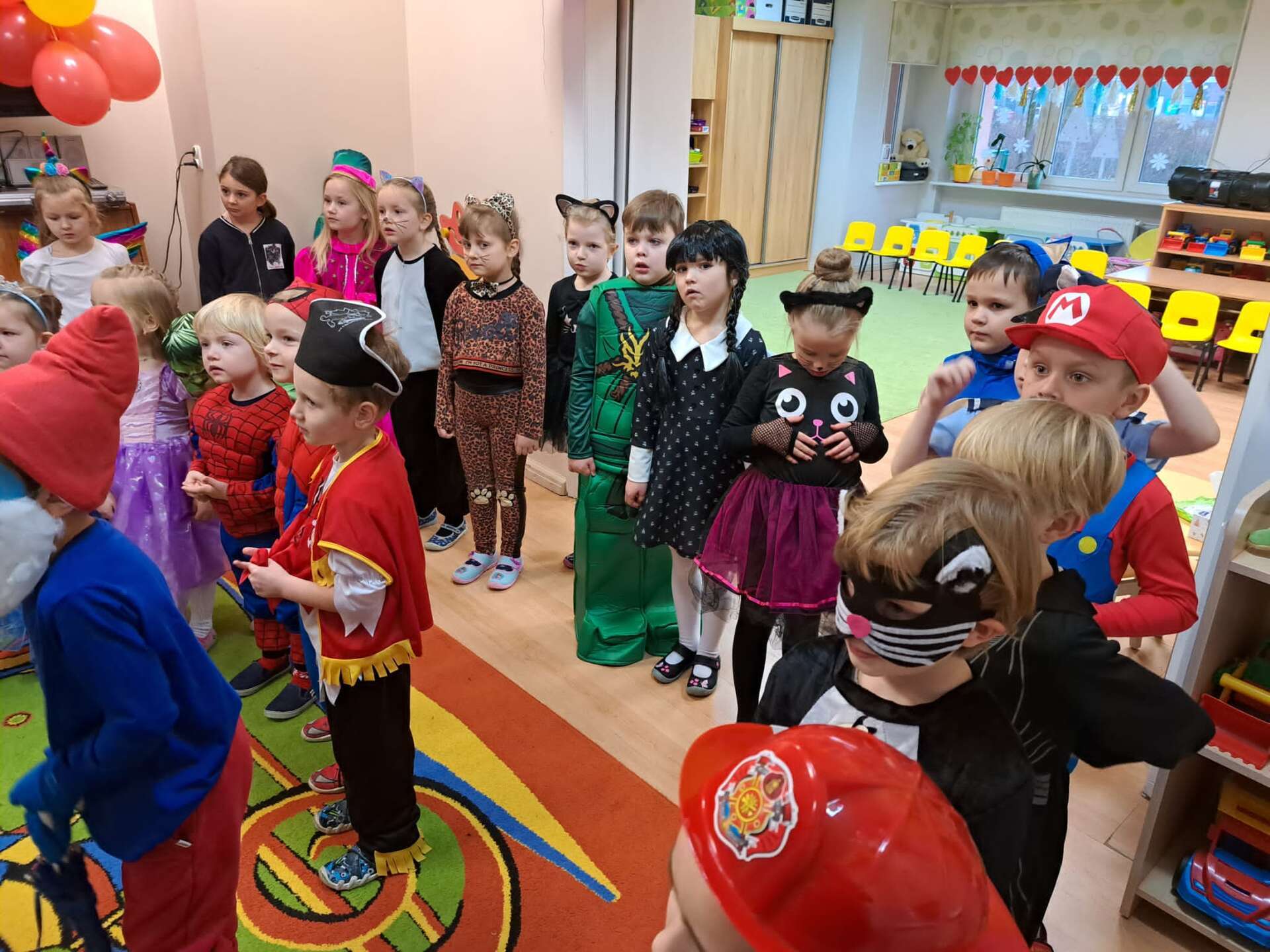 Grupa dzieci ustawiona w "pociąg" bawi się na balu