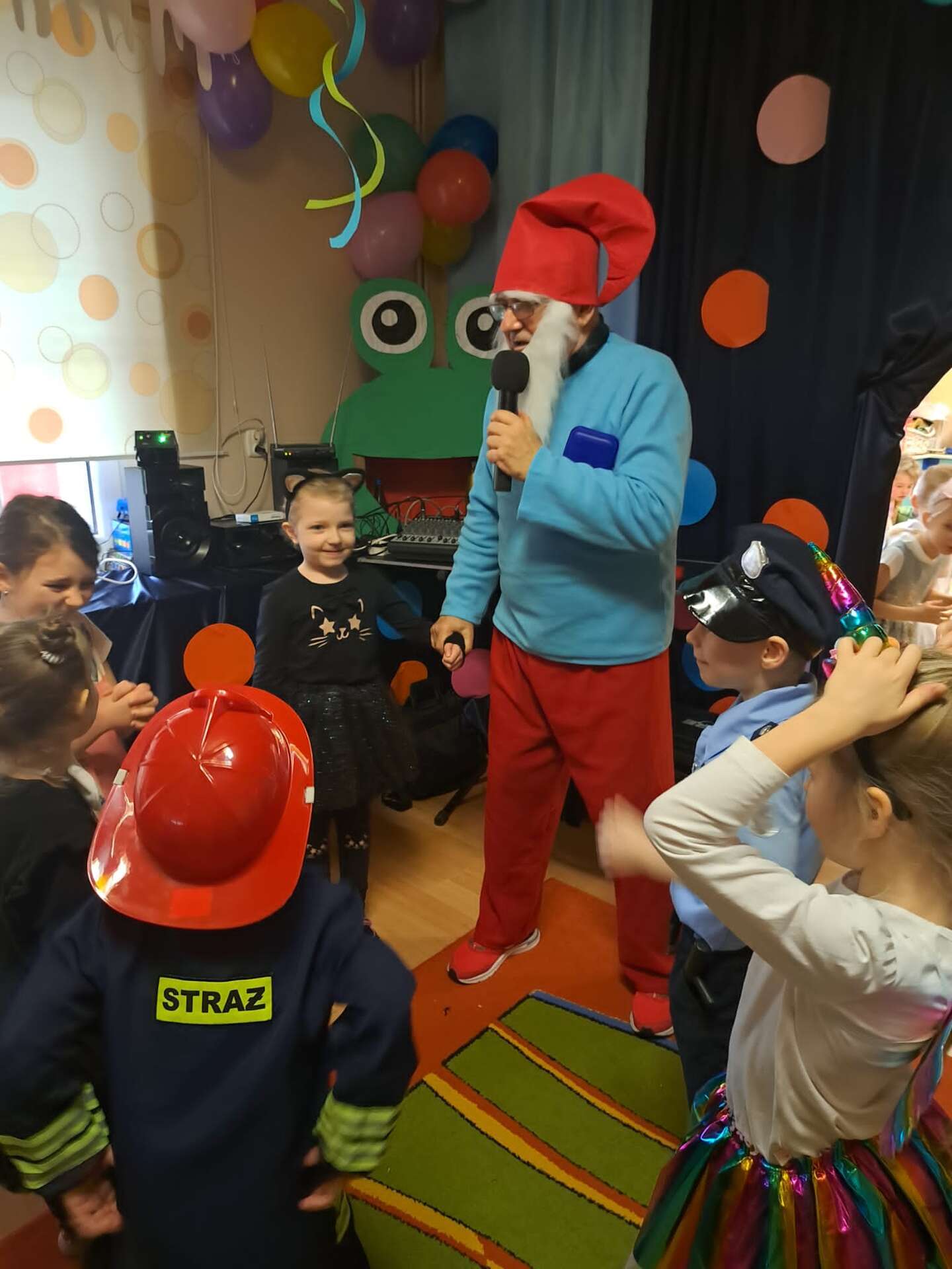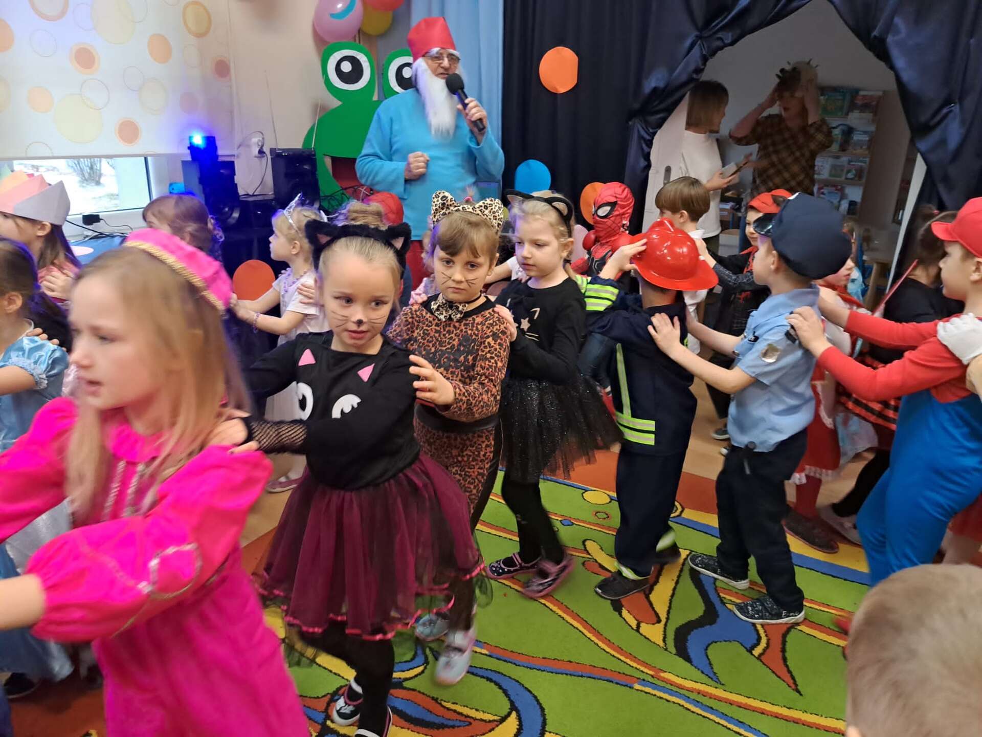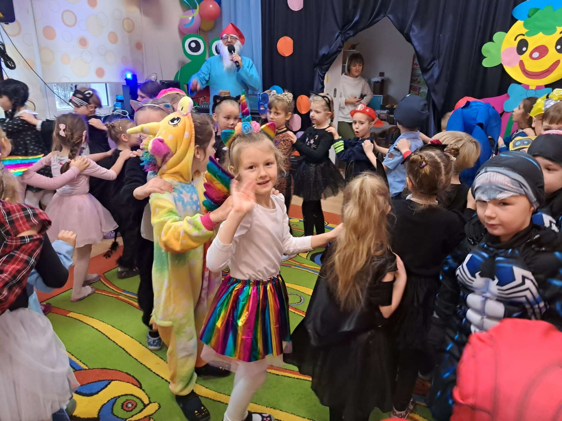 Prowadzący przebrany za smerfa zachęca dzieci do zabawy