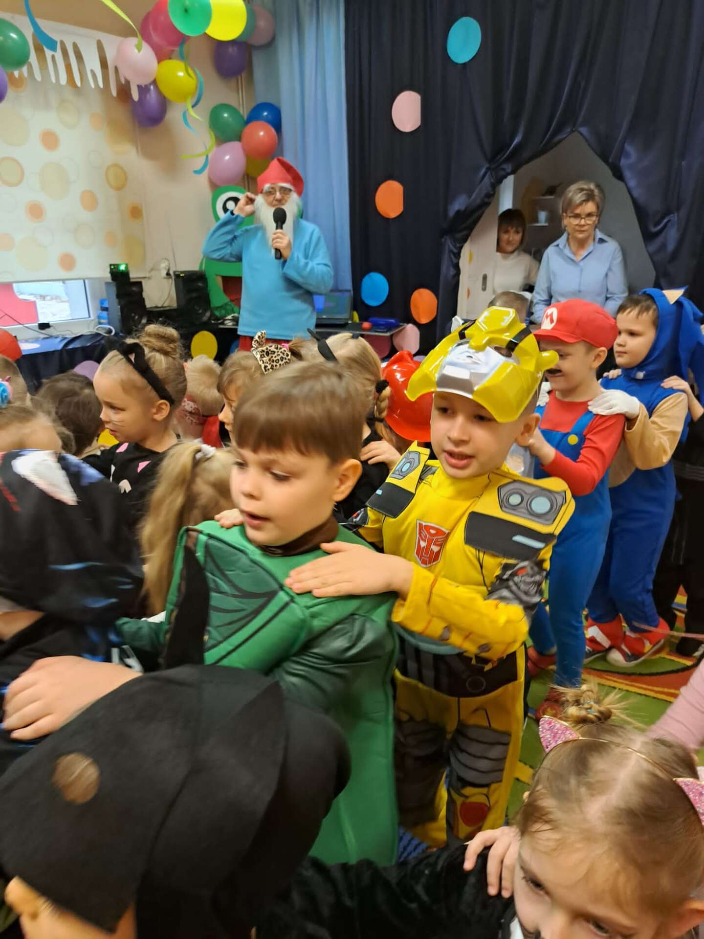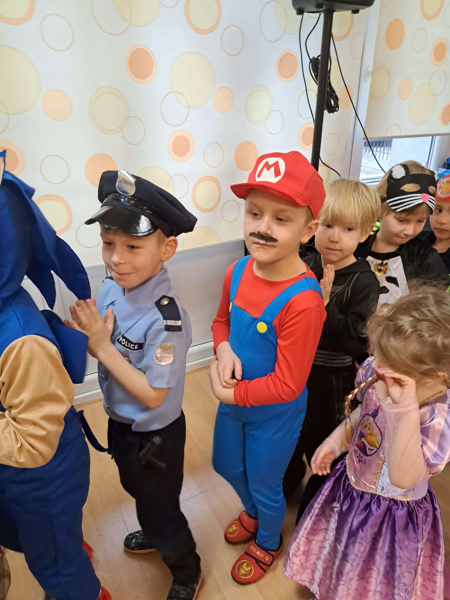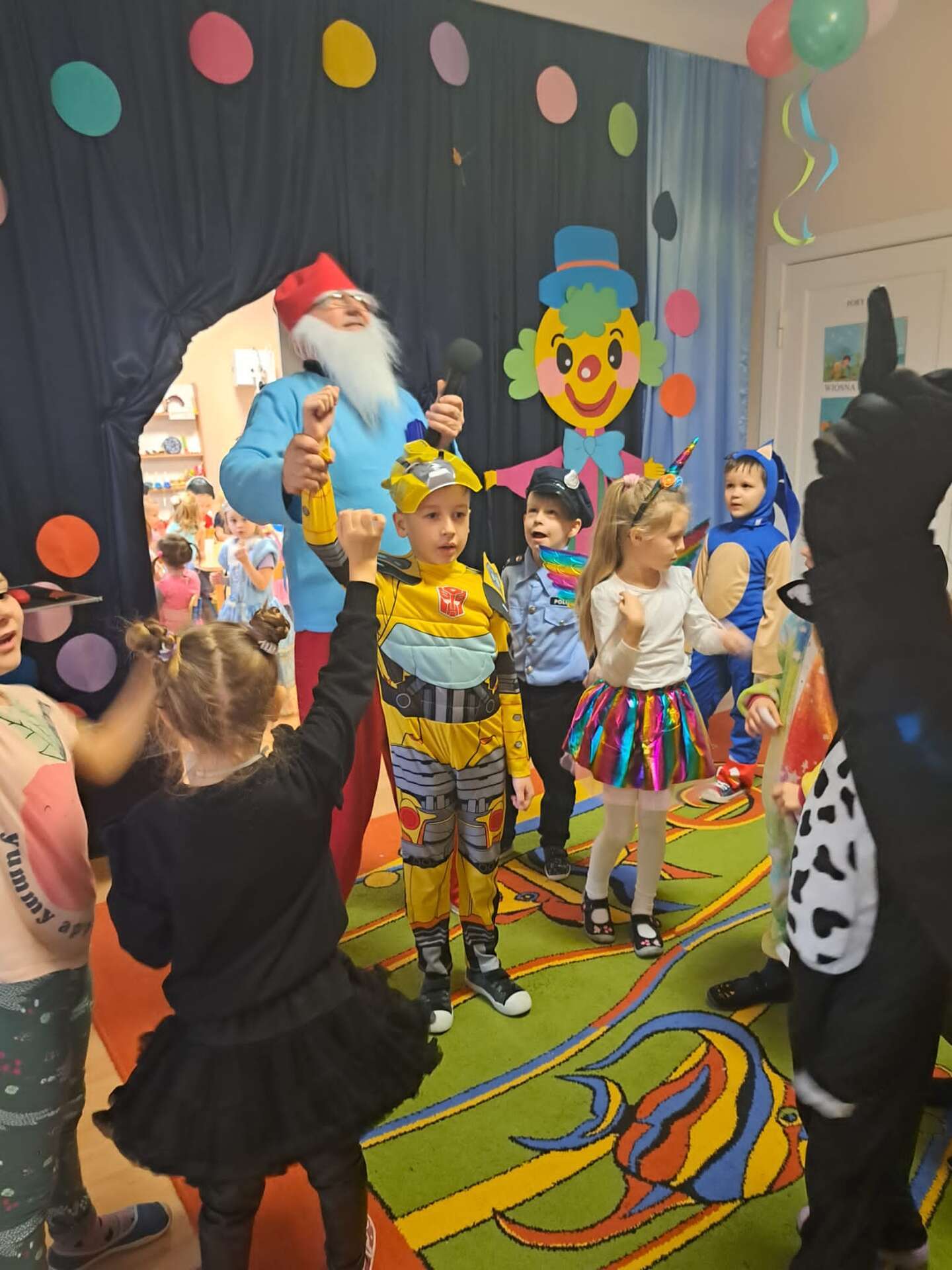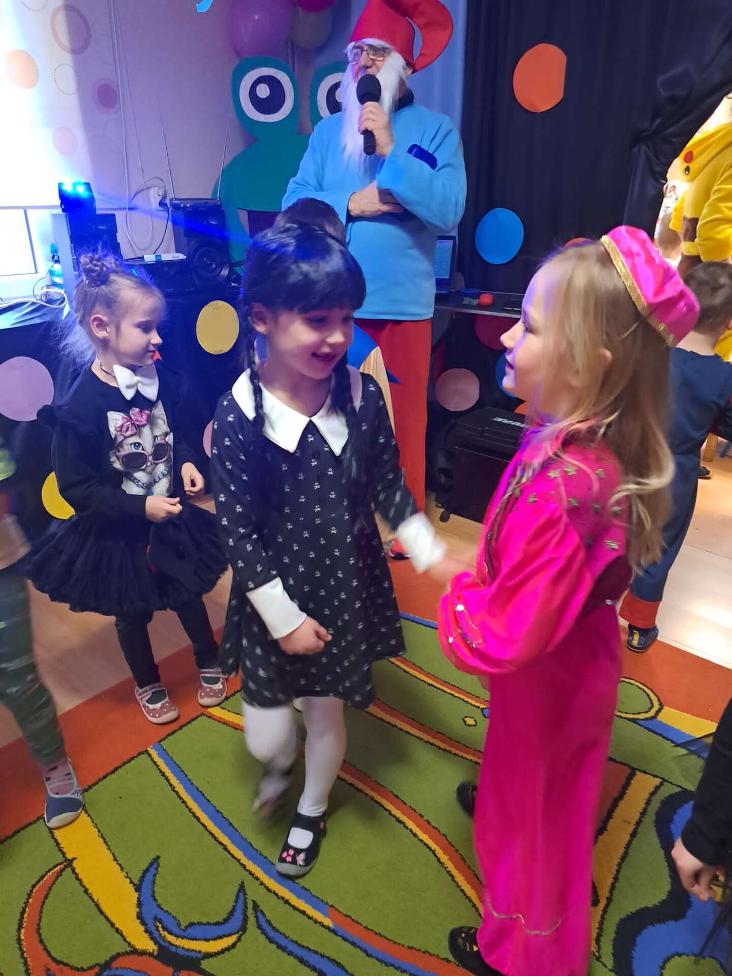 Prowadzący przebrany za smerfa zachęca dzieci do zabawy