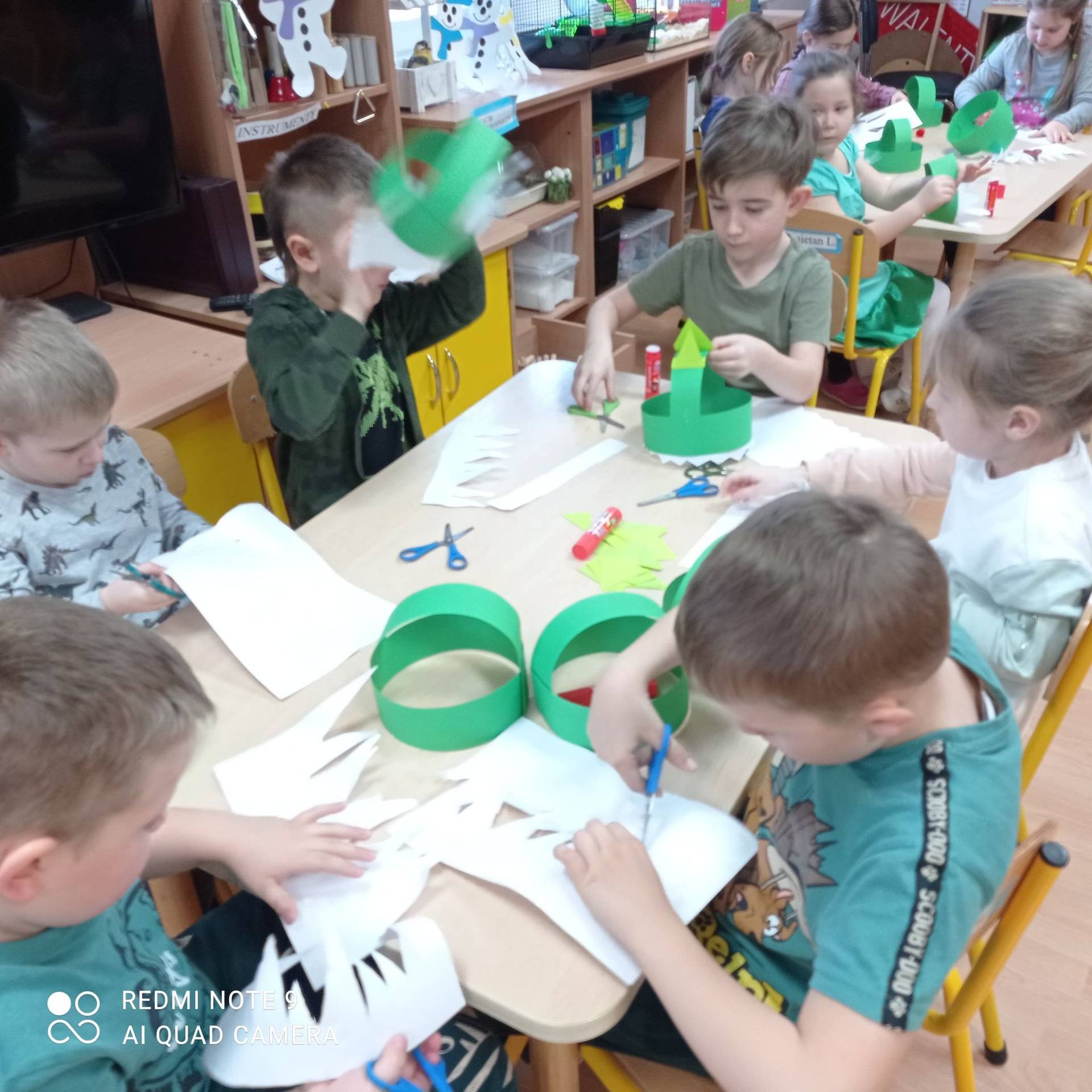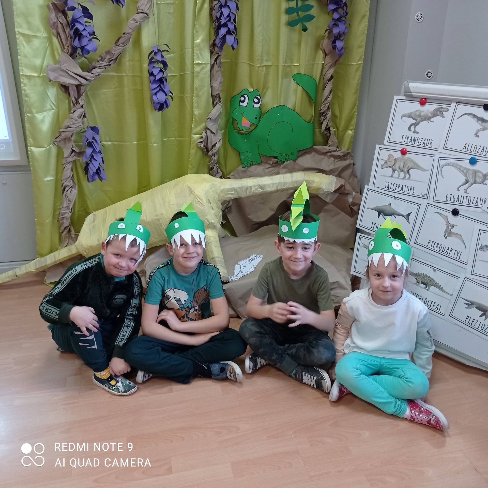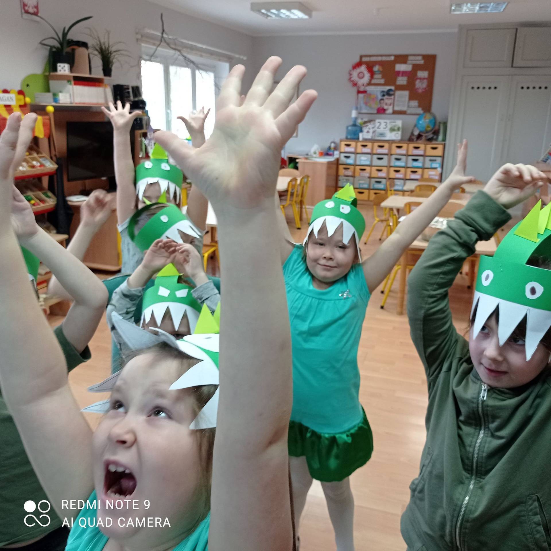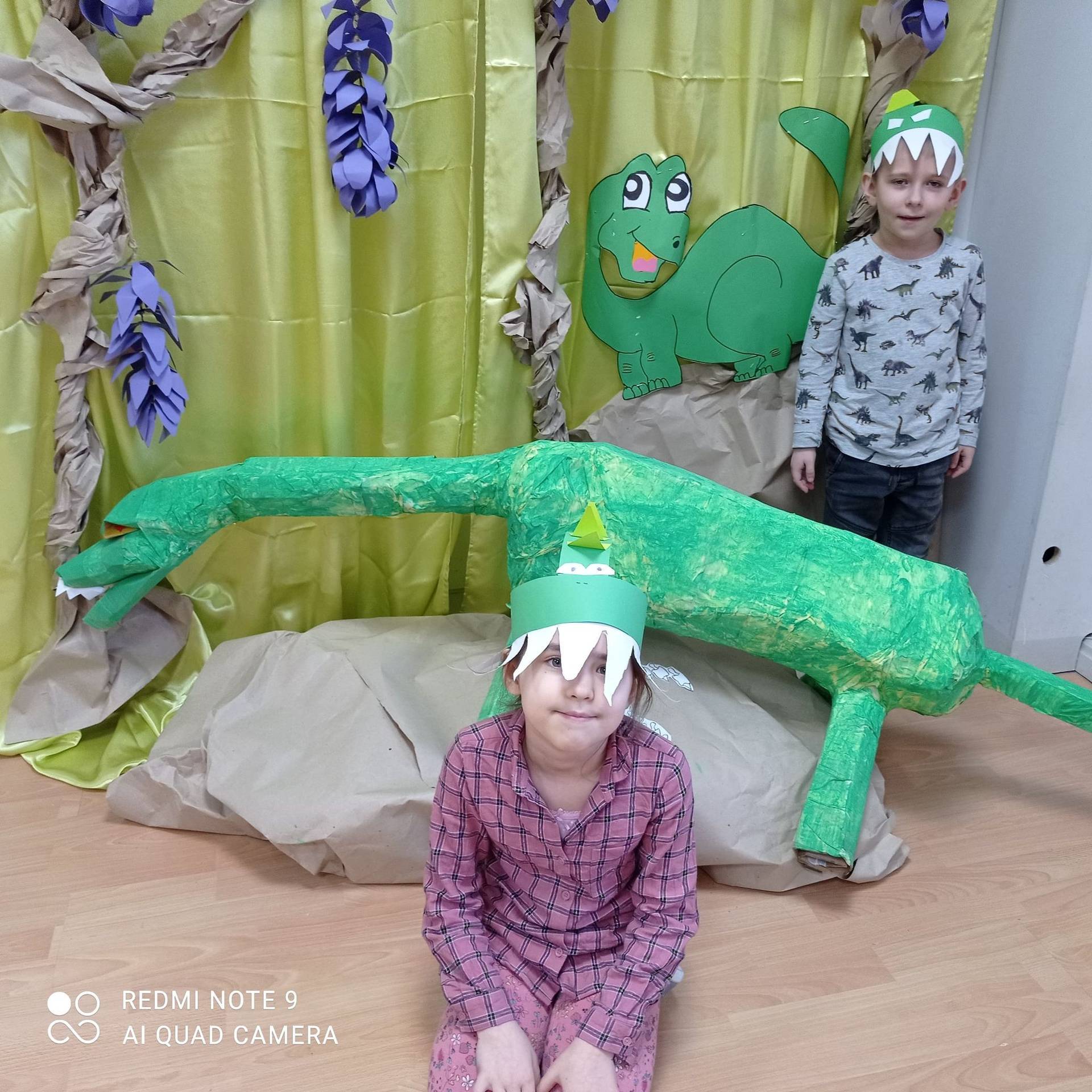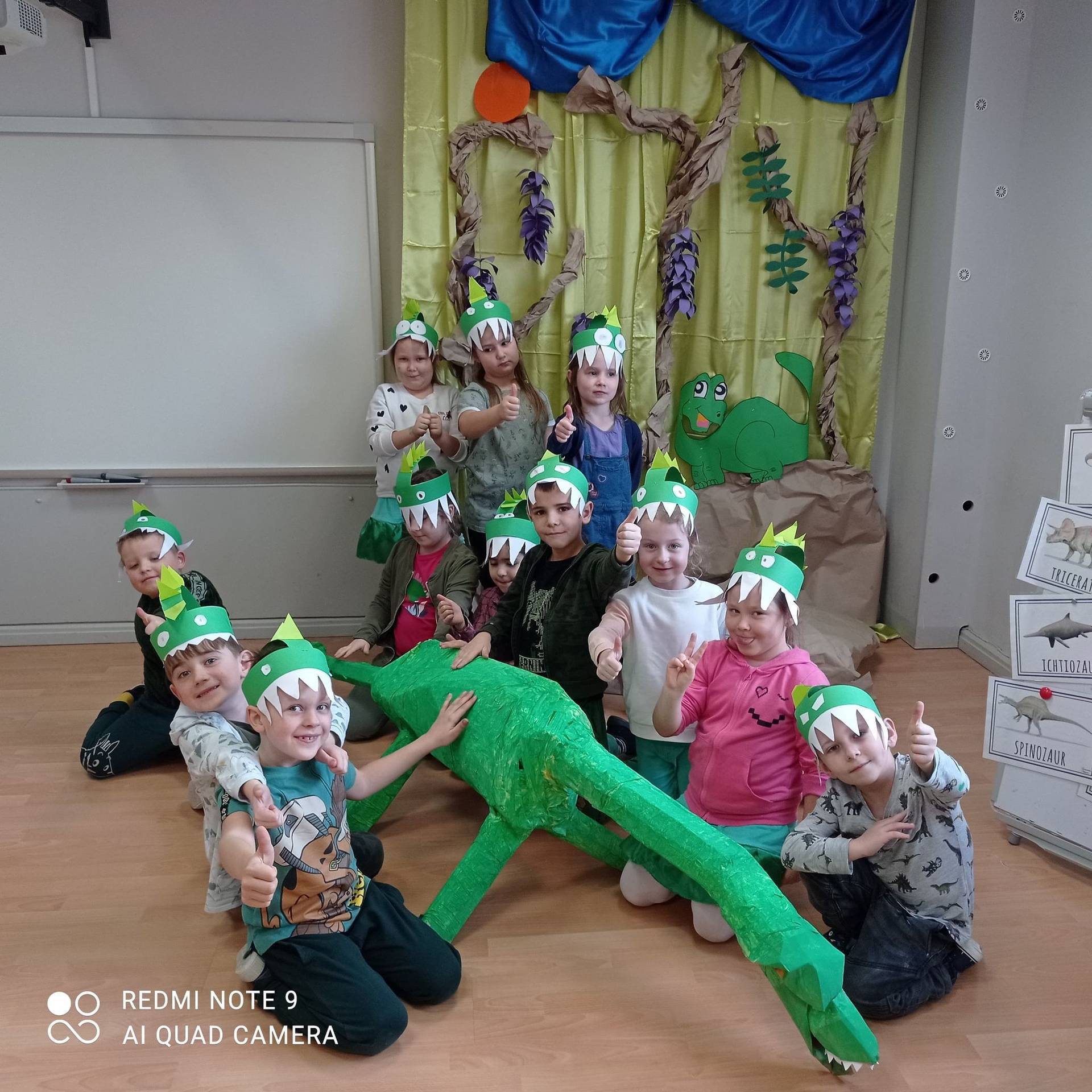 26 lutego przedszkolaki obchodziły Święto prehistorycznych strasznych jaszczurów- Dinozaurów. Tego dnia dzieci przyszły do przedszkola ubrane na zielono. Dzień dinozaura jest idealną okazją do zaznajomienia dzieci i przypomnienia im o niezwykłych mieszkańcach Ziemi, które wyginęły miliony lat temu. Tego dnia dzieci brały udział w zajęciach i zabawach, dzięki którym miały możliwość poznania życia tych niezwykłych wielkich gadów oraz wielu ciekawostek na ich temat. Tygryski z grupy IV wykonały dinozaurowe nakrycia głowy, lepiły dinozaury z masy solnej oraz malowały dinozaura zrobionego z kartonu oraz nadały mu imię "Dinotyg"- czyli dino od dinozaura oraz tyg od tygrysków. Zabawa była na całego.