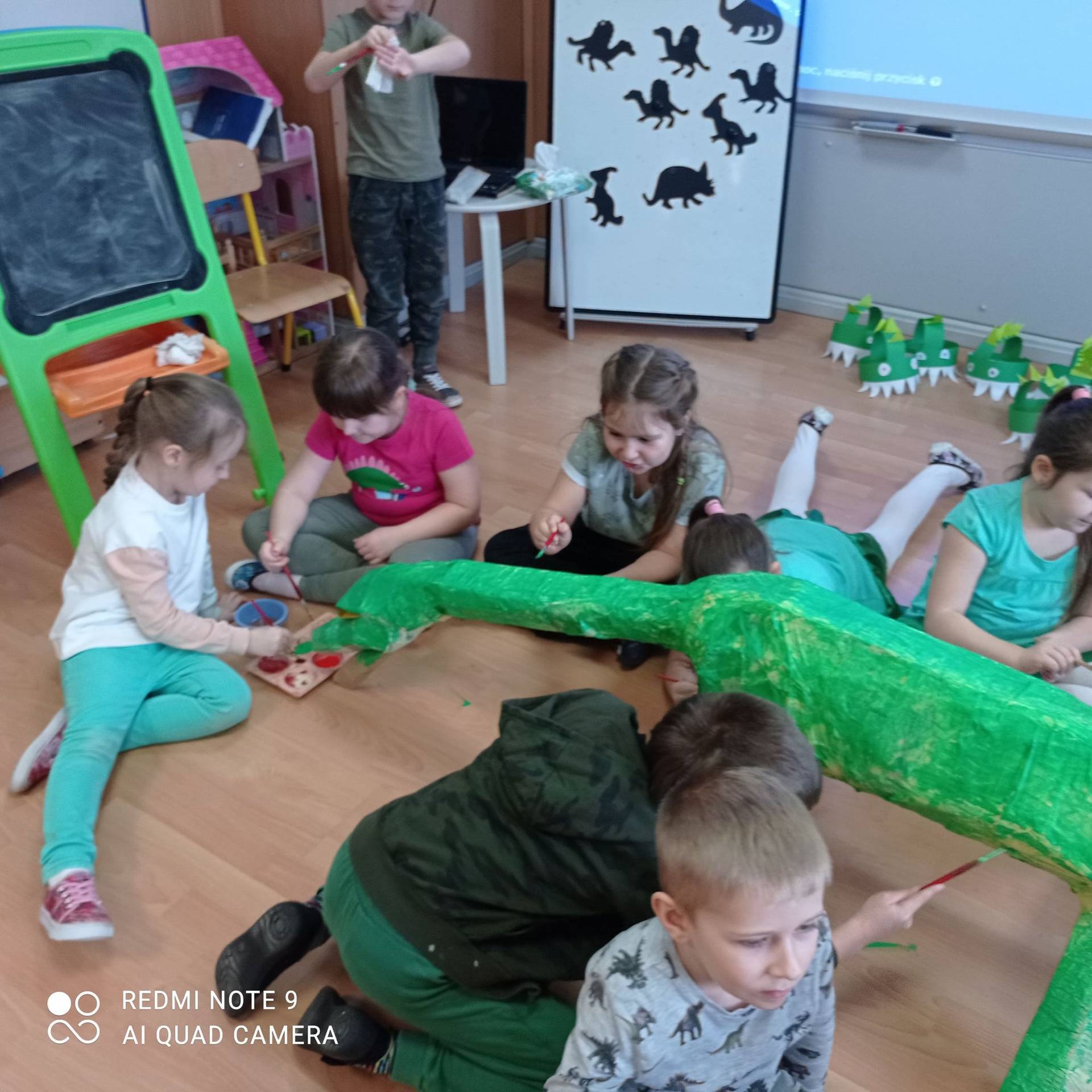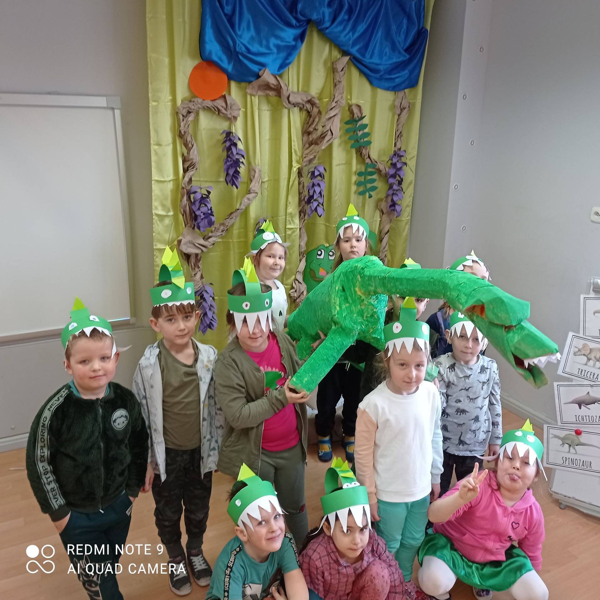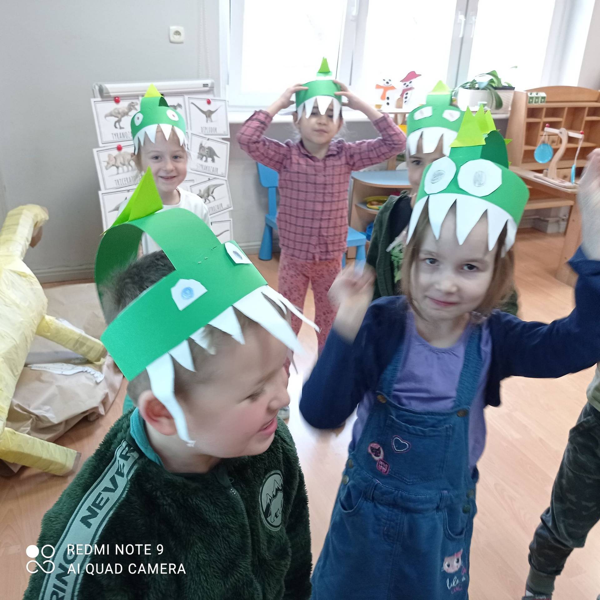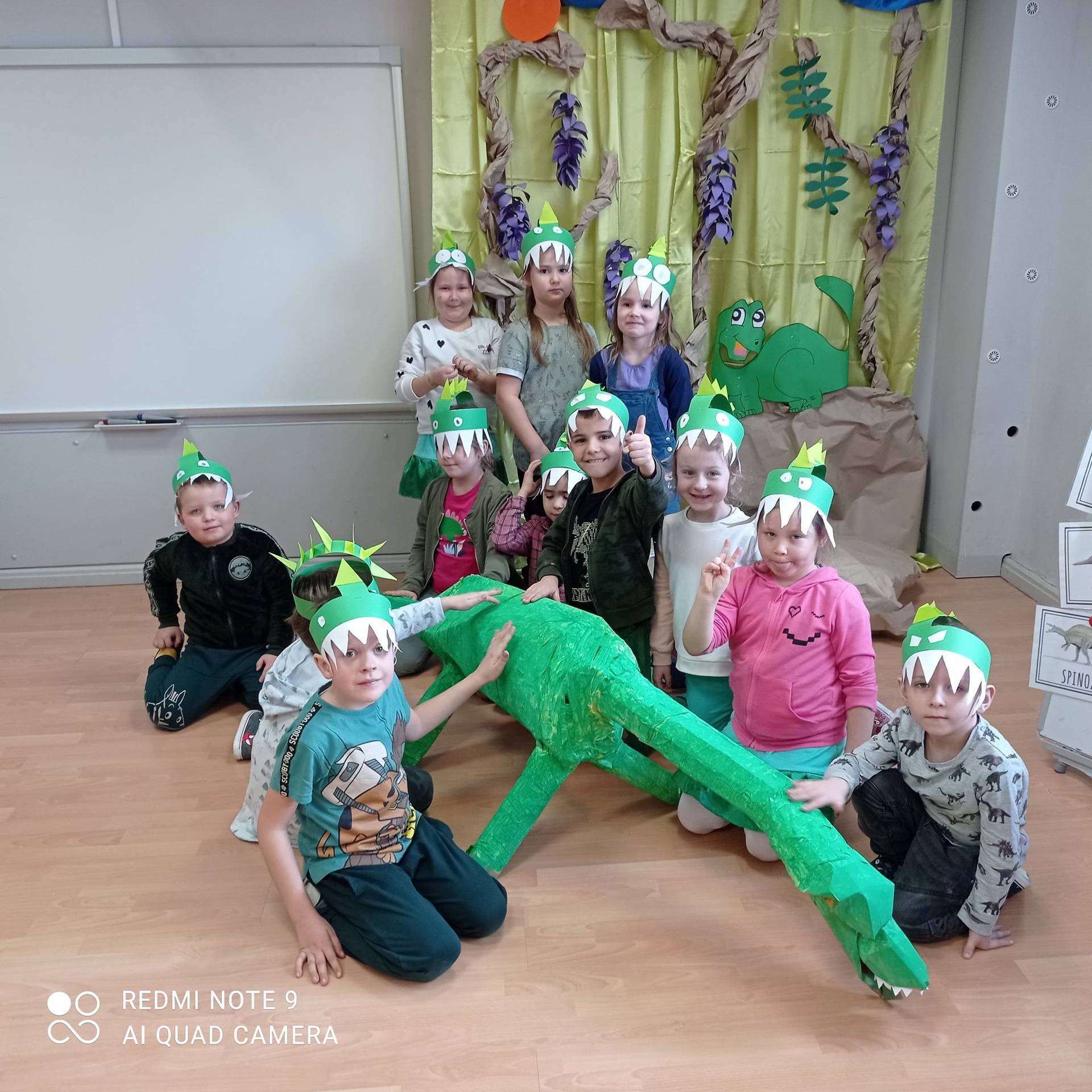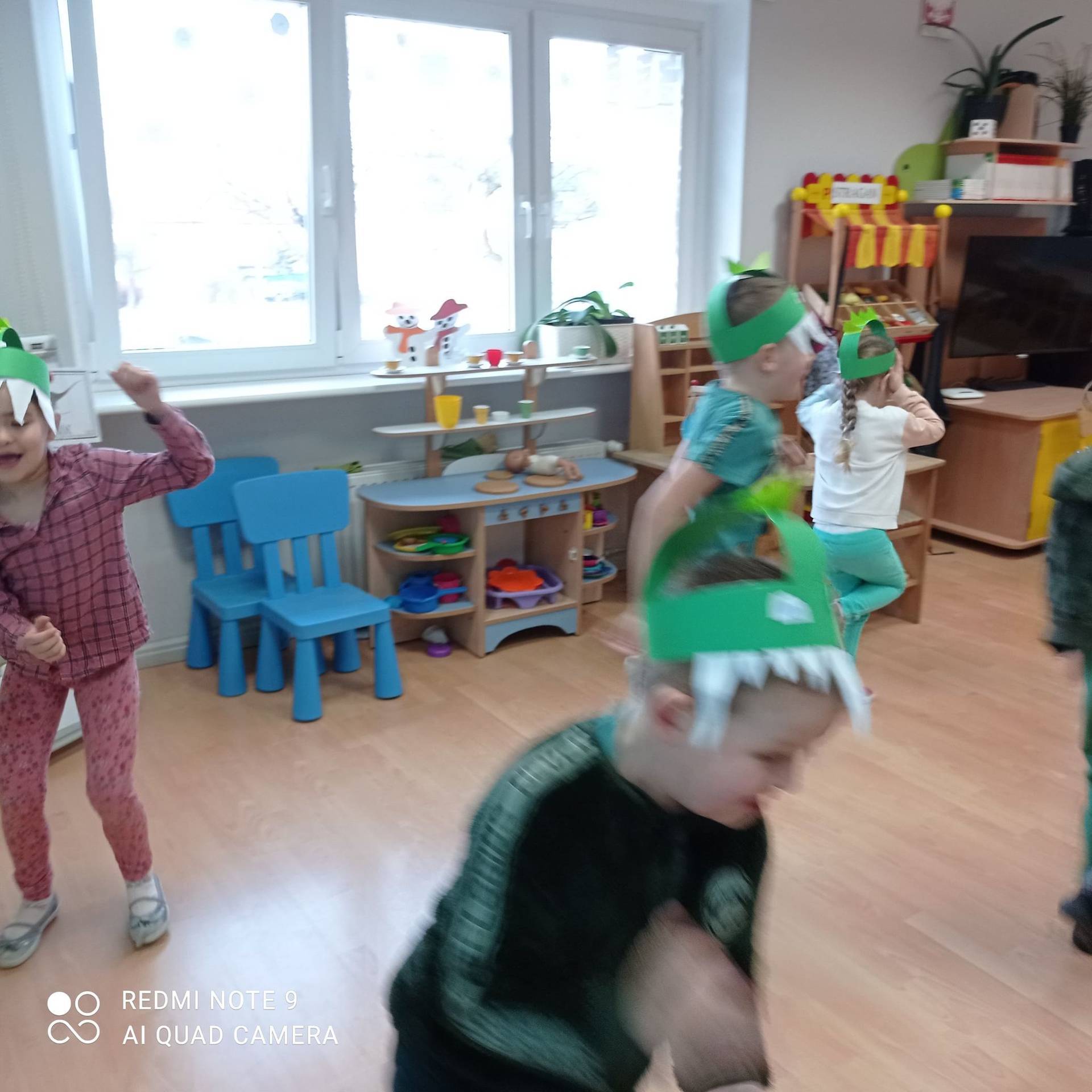 26 lutego przedszkolaki obchodziły Święto prehistorycznych strasznych jaszczurów- Dinozaurów. Tego dnia dzieci przyszły do przedszkola ubrane na zielono. Dzień dinozaura jest idealną okazją do zaznajomienia dzieci i przypomnienia im o niezwykłych mieszkańcach Ziemi, które wyginęły miliony lat temu. Tego dnia dzieci brały udział w zajęciach i zabawach, dzięki którym miały możliwość poznania życia tych niezwykłych wielkich gadów oraz wielu ciekawostek na ich temat. Tygryski z grupy IV wykonały dinozaurowe nakrycia głowy, lepiły dinozaury z masy solnej oraz malowały dinozaura zrobionego z kartonu oraz nadały mu imię "Dinotyg"- czyli dino od dinozaura oraz tyg od tygrysków. Zabawa była na całego.