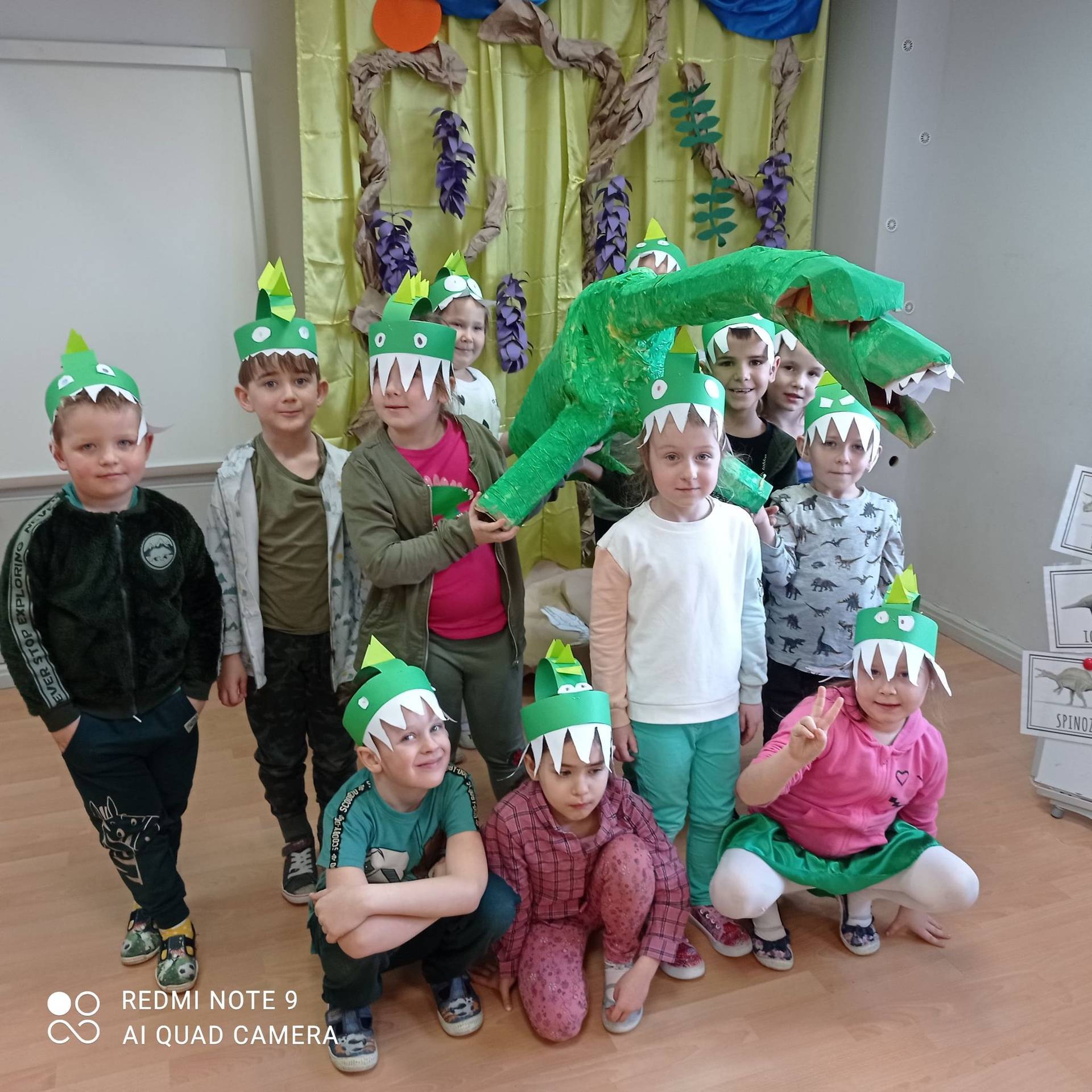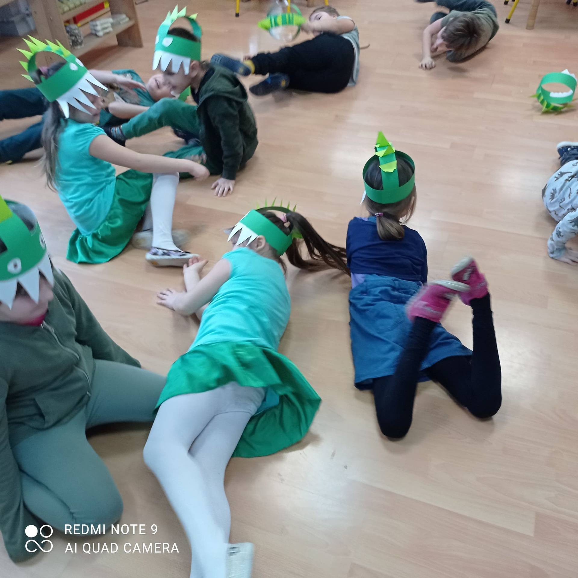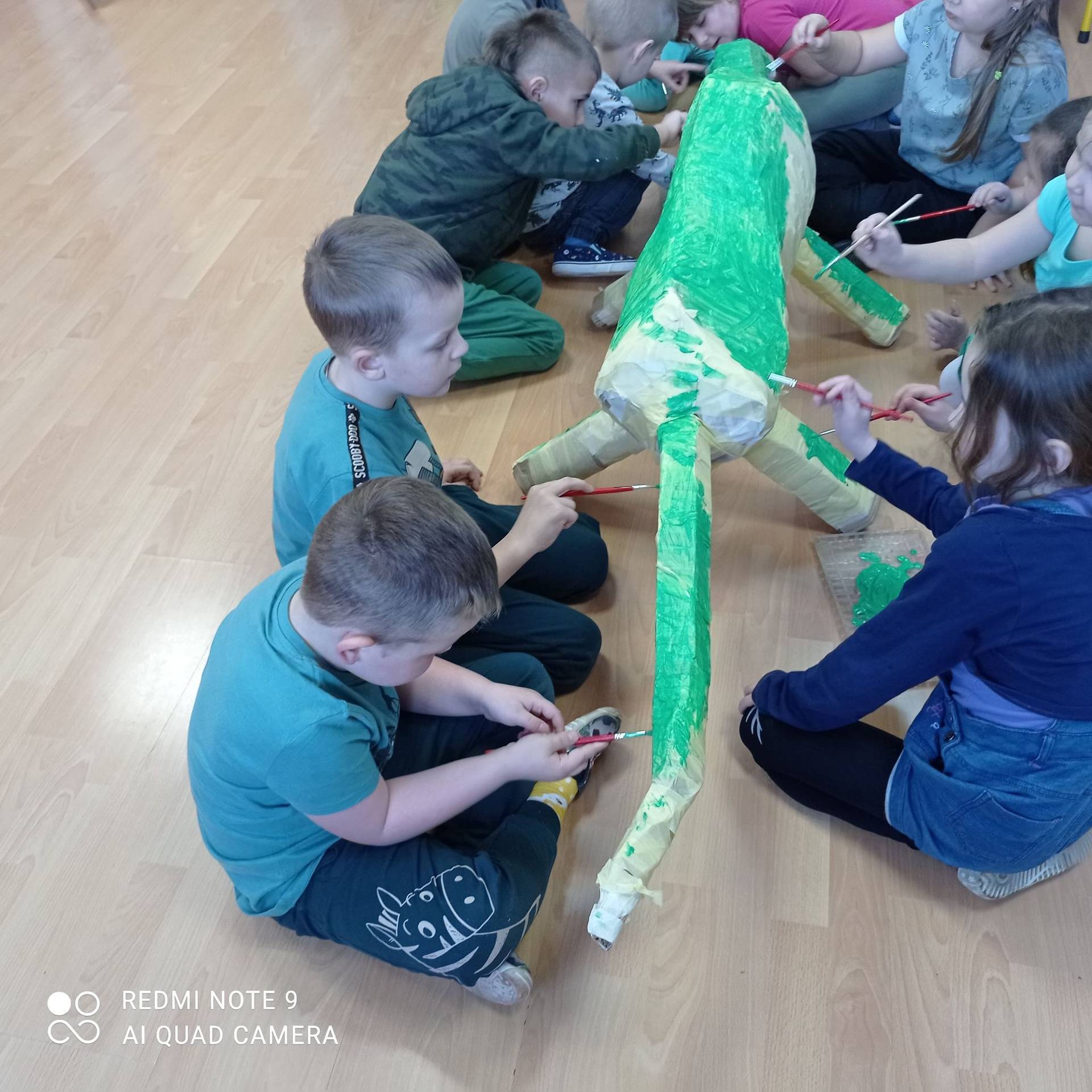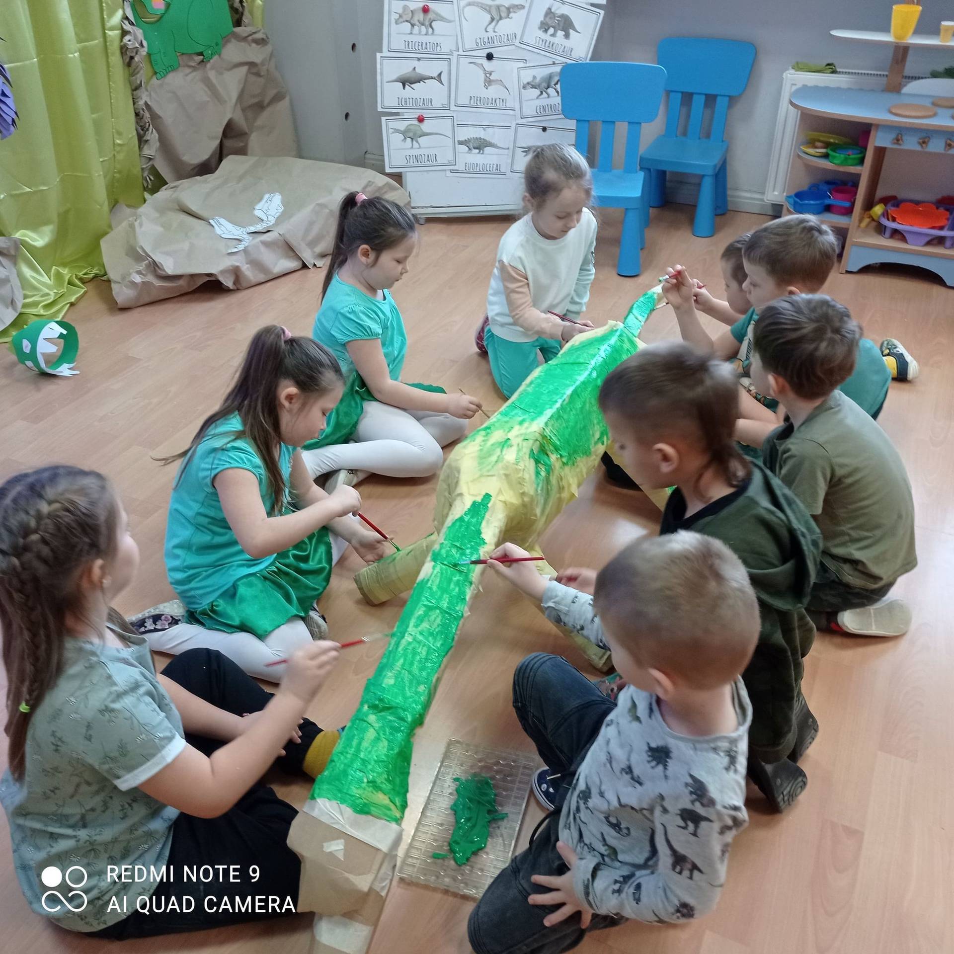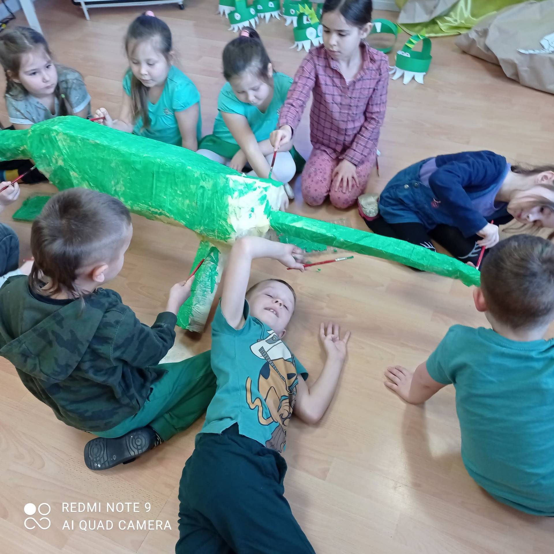 26 lutego przedszkolaki obchodziły Święto prehistorycznych strasznych jaszczurów- Dinozaurów. Tego dnia dzieci przyszły do przedszkola ubrane na zielono. Dzień dinozaura jest idealną okazją do zaznajomienia dzieci i przypomnienia im o niezwykłych mieszkańcach Ziemi, które wyginęły miliony lat temu. Tego dnia dzieci brały udział w zajęciach i zabawach, dzięki którym miały możliwość poznania życia tych niezwykłych wielkich gadów oraz wielu ciekawostek na ich temat. Tygryski z grupy IV wykonały dinozaurowe nakrycia głowy, lepiły dinozaury z masy solnej oraz malowały dinozaura zrobionego z kartonu oraz nadały mu imię "Dinotyg"- czyli dino od dinozaura oraz tyg od tygrysków. Zabawa była na całego.