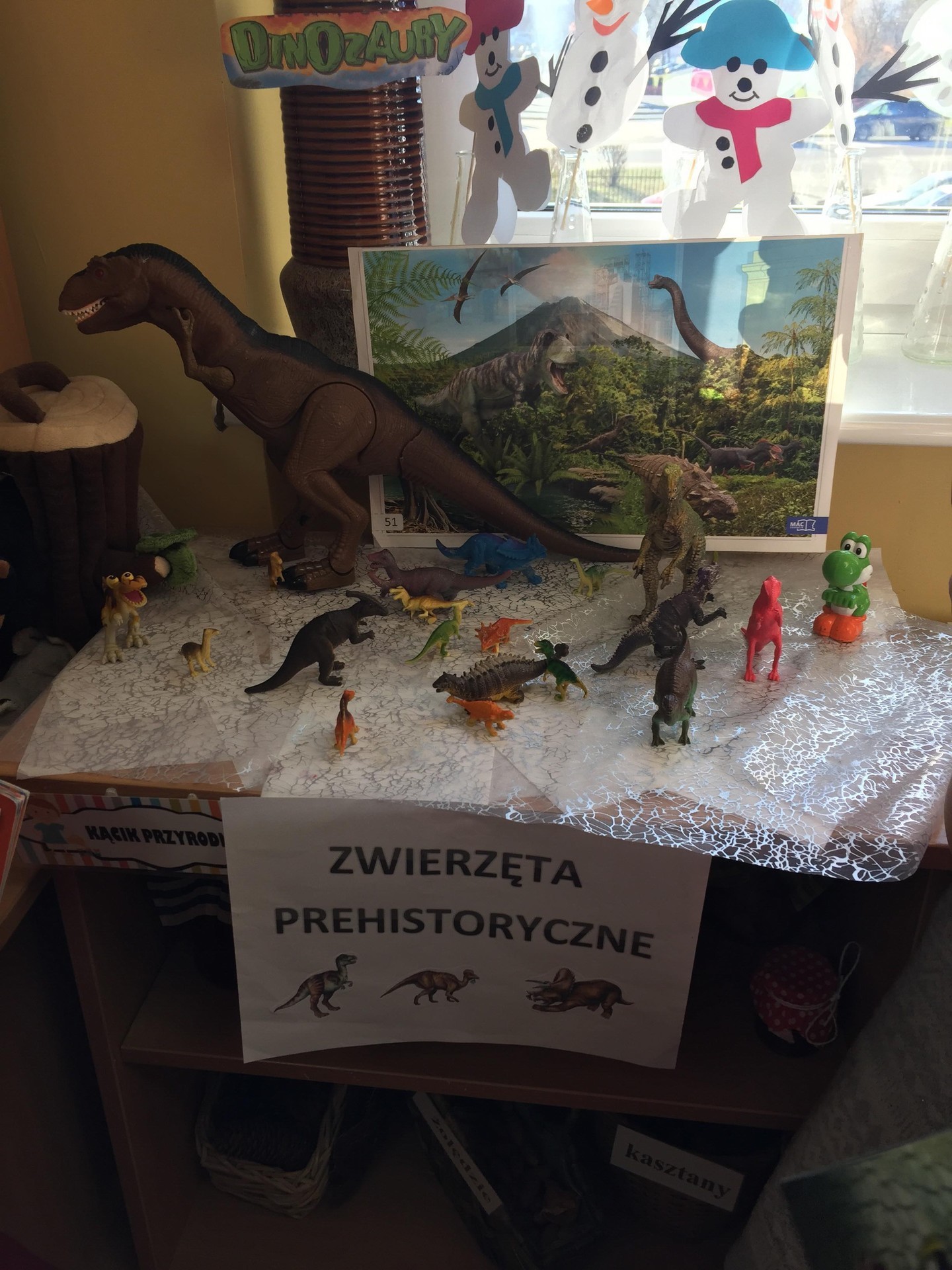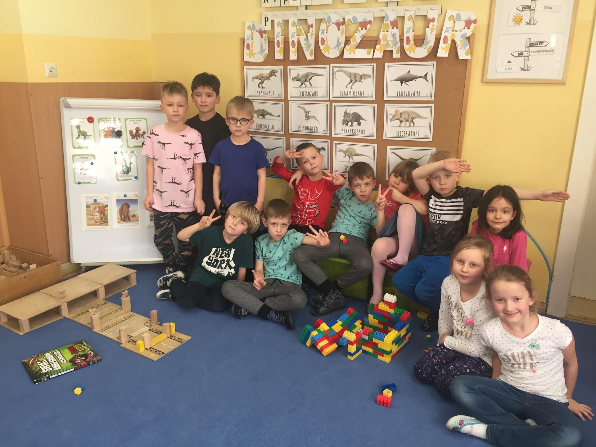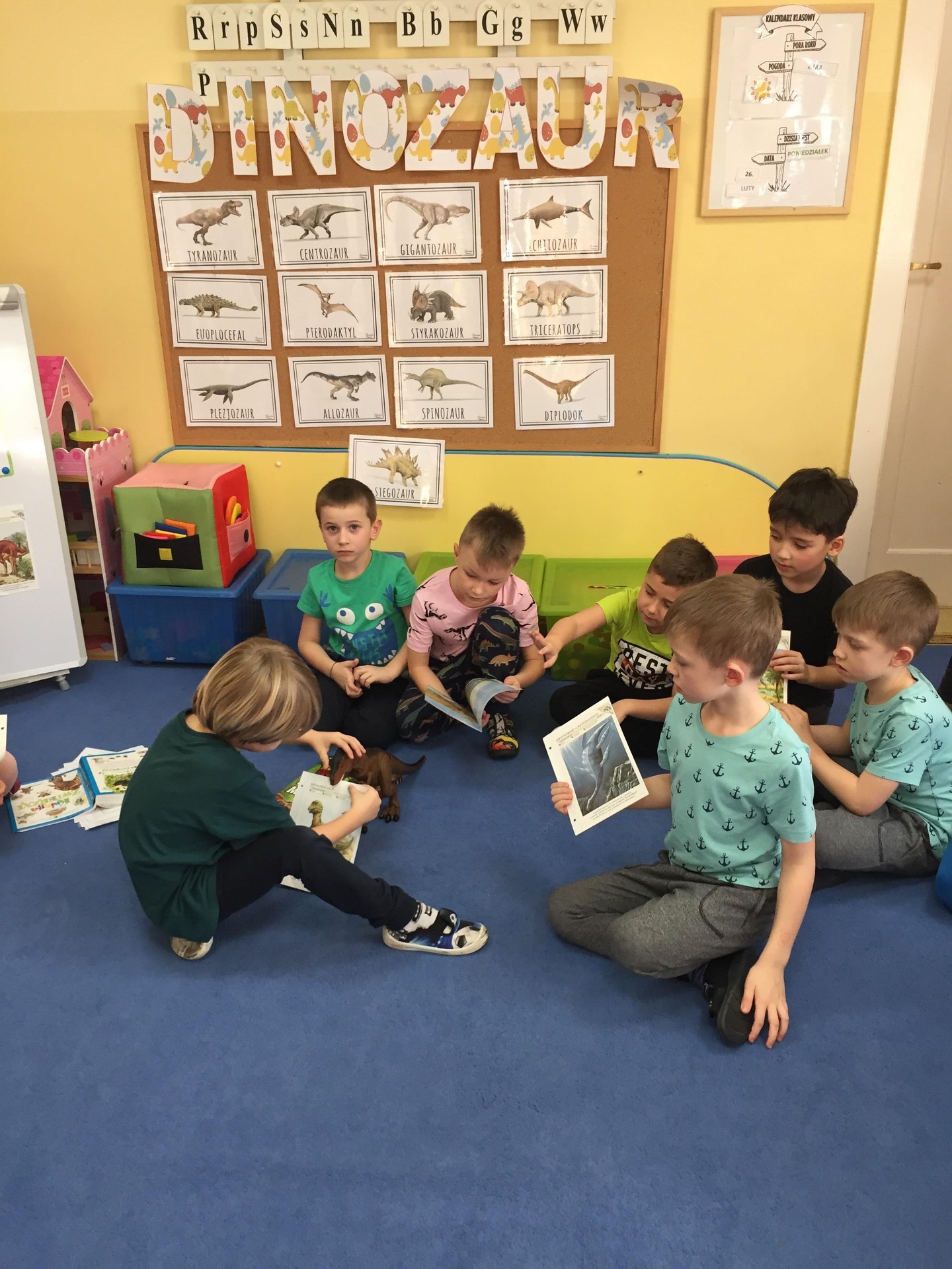 Choć dinozaury dawno już wyginęły to nie przestają fascynować ludzi. Święto tych prehistorycznych stworzeń można spędzić na wiele sposobów. Podczas zajęć poznawali jak wyglądała Ziemia w czasie jury i kredy czyli w czasie kiedy żyły dinozaury, zapoznani zostali również z teorią dotycząca ich wymierania. Wykonywali różne kolorowanki przedstawiające sylwetki dinozaurów lub wymyślali własne dinozaury. Mogli tez pobawić się figurkami dinozaurów i oglądnąć szkielet wielkiego tyranozaura. To był tydzień pełen pracy i radości, rozbudził u wielu pasje i zainteresowania.