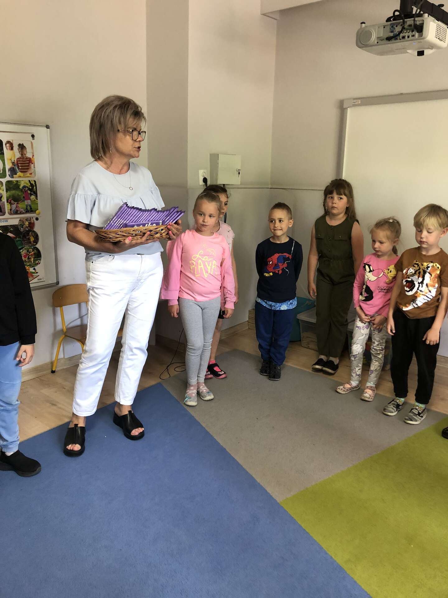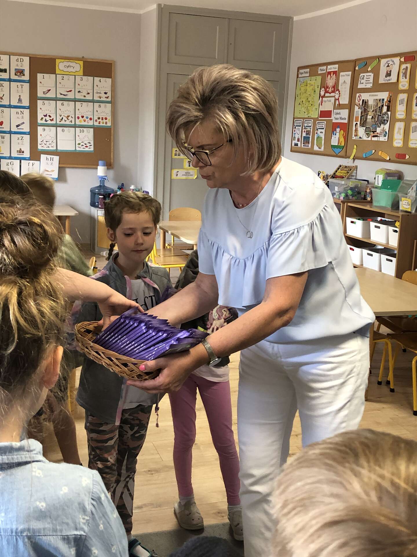 Pani Dyrektor rozdaje czekolady dzieciom