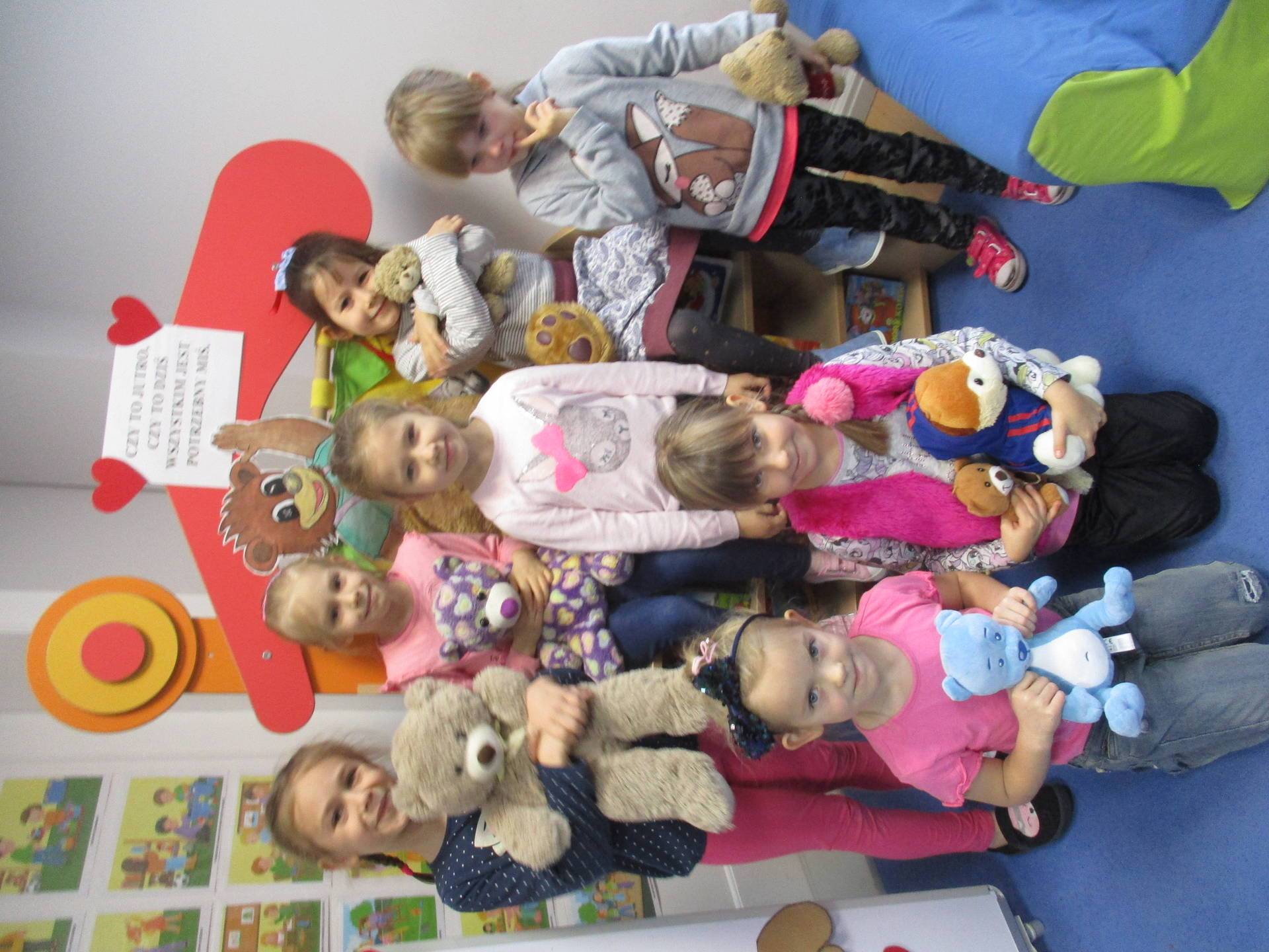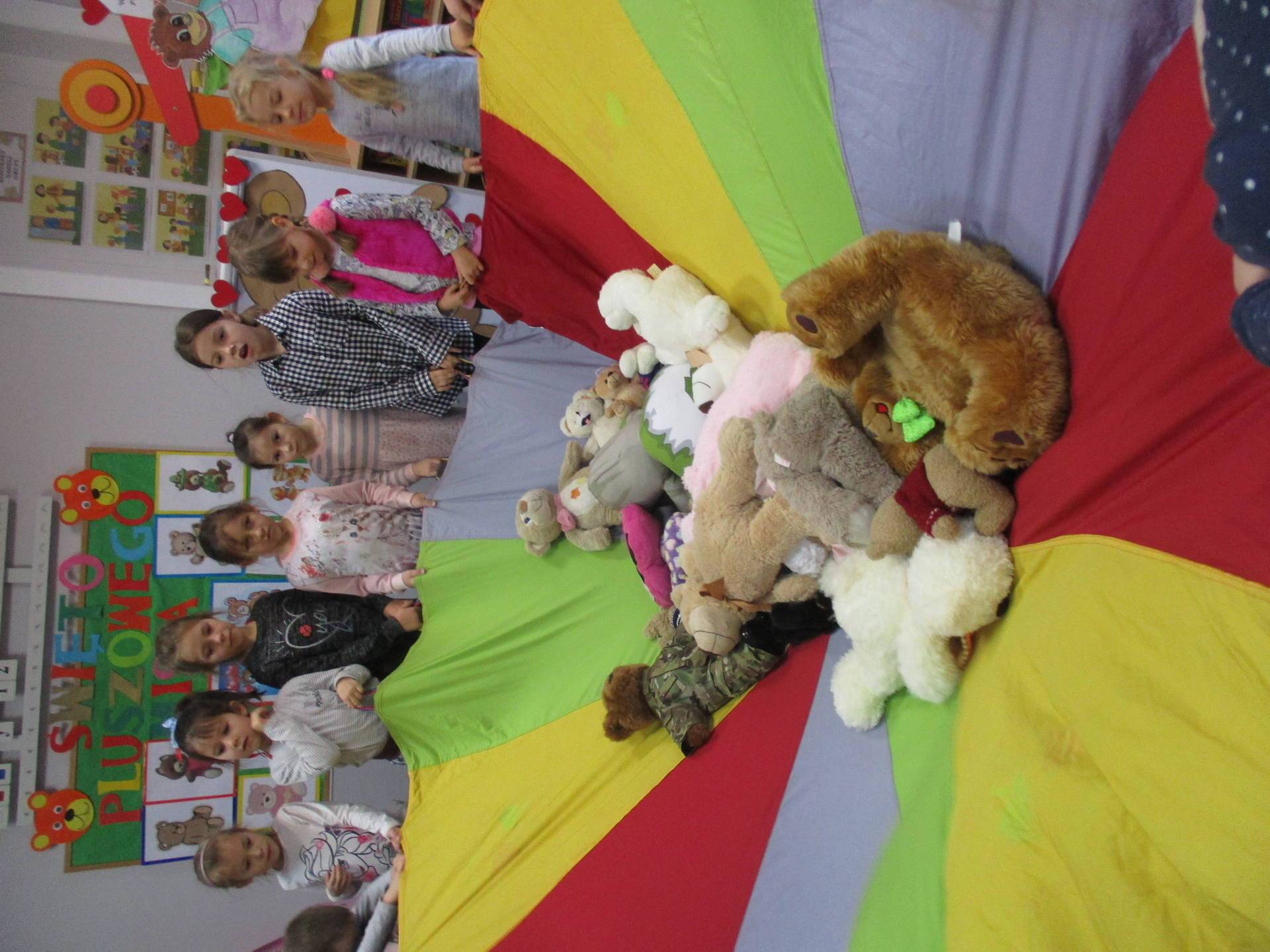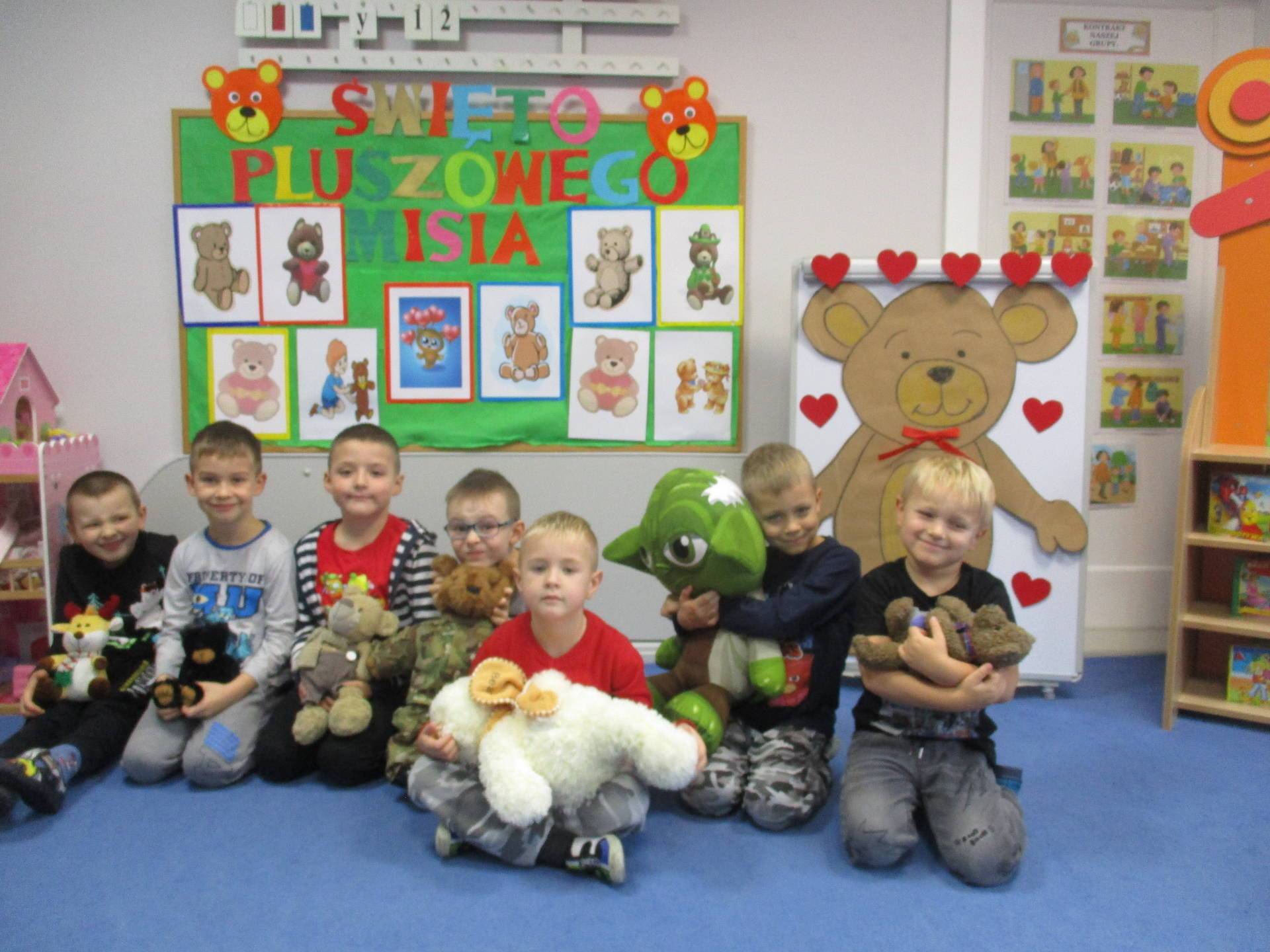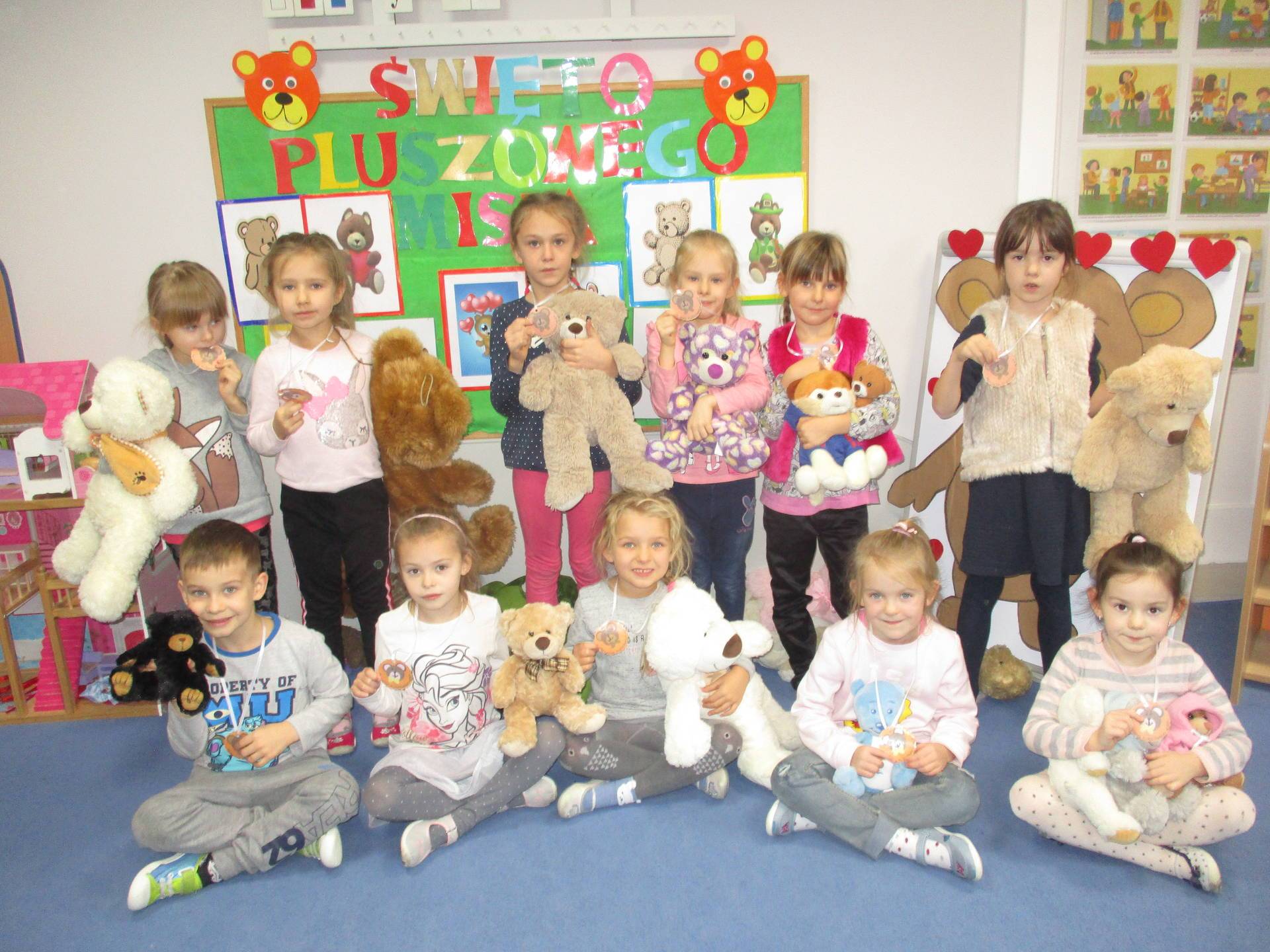 Nasze przedszkolaki w tym dniu przybyły do przedszkola ze swoimi ulubionymi pluszowymi przytulankami. Misie tego dnia opanowały nasze Przedszkole, misie były po prostu wszędzie na krzesełkach, stolikach, parapetach, półeczkach. Przybyły misie małe, średnie i bardzo duże, białe, brązowe itd.