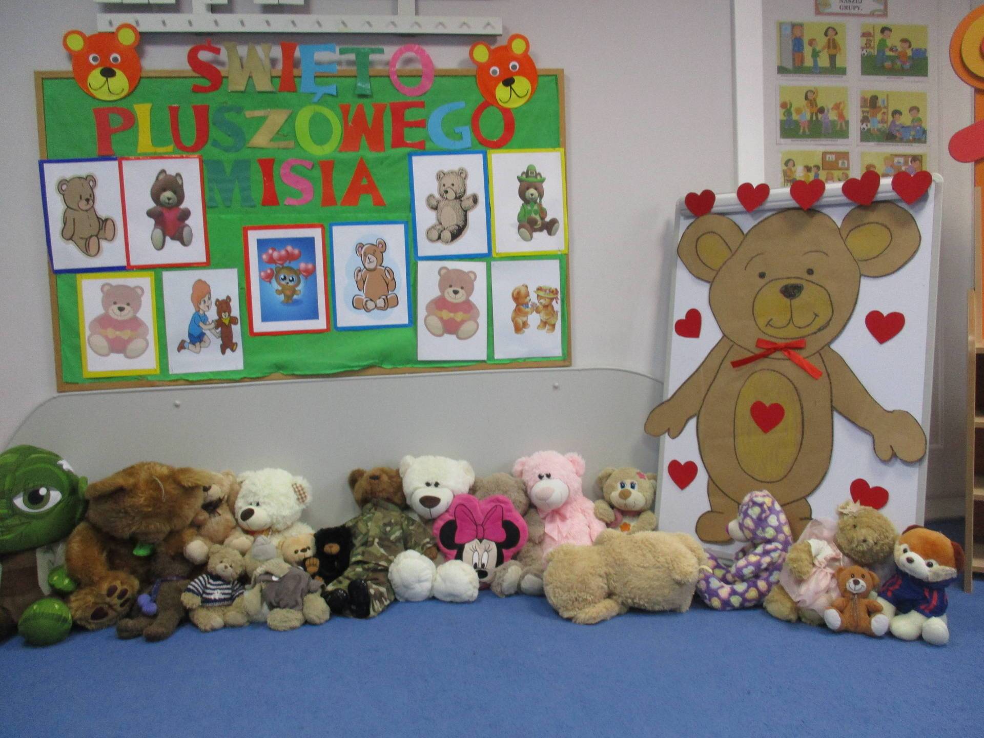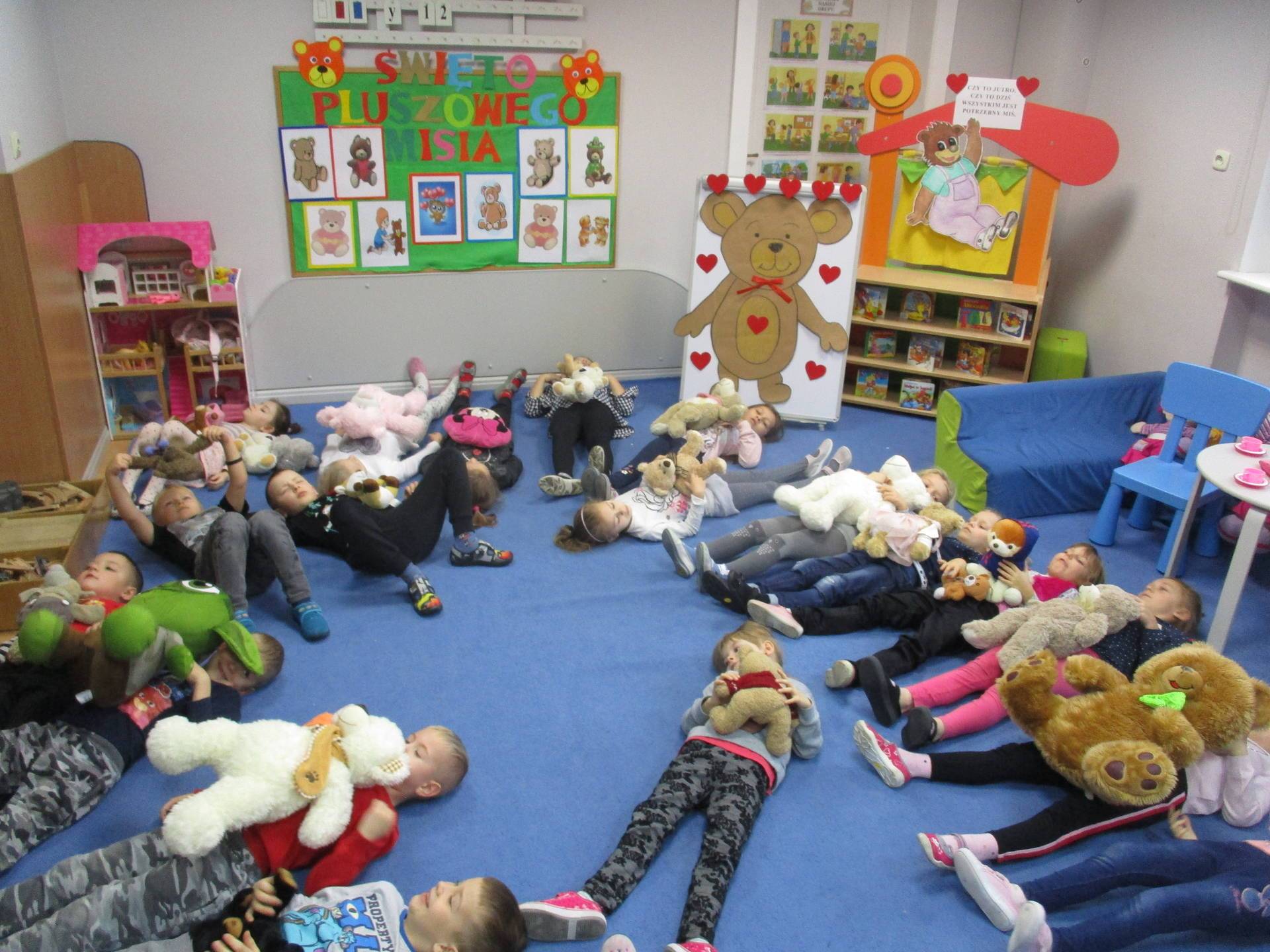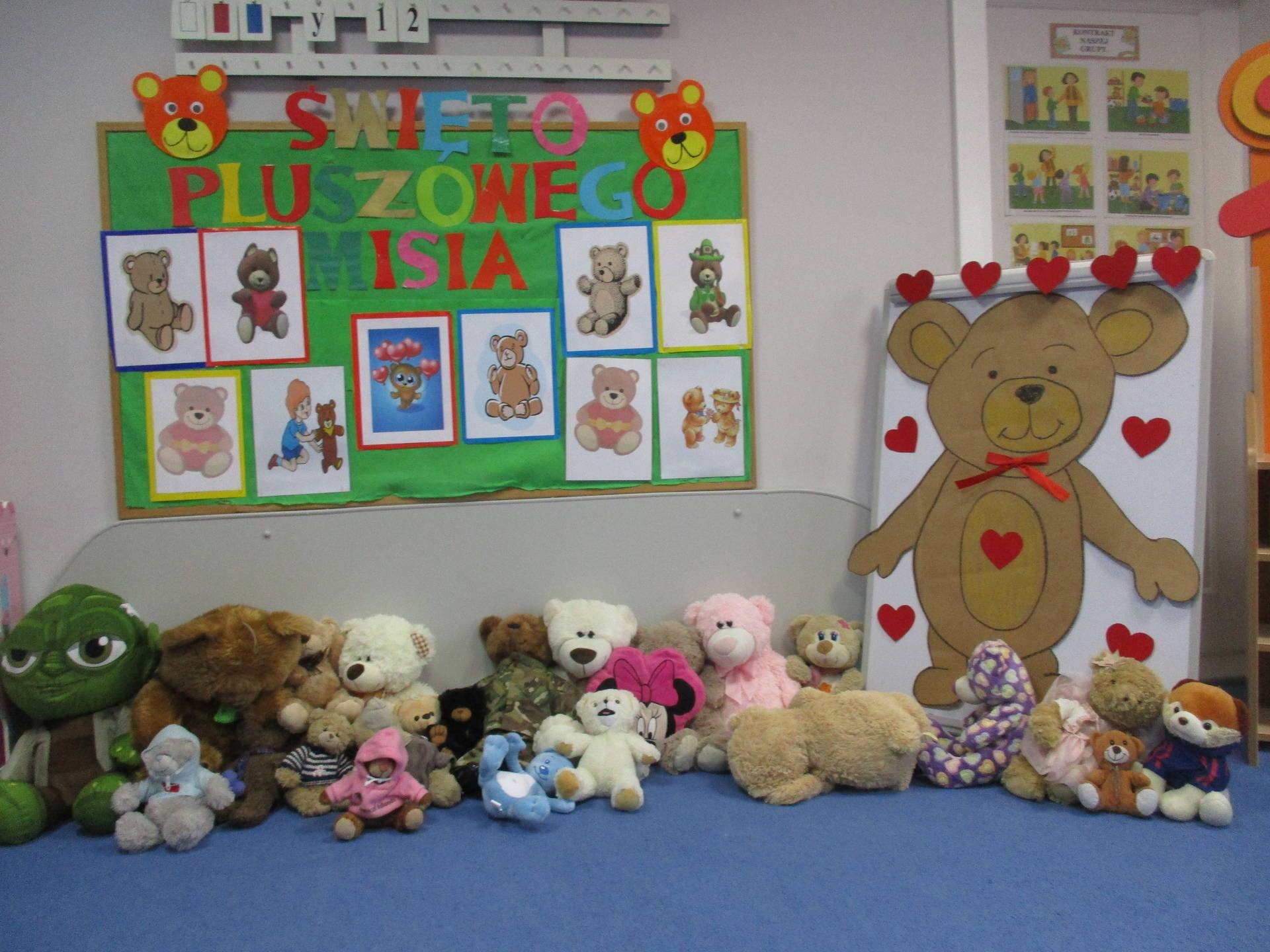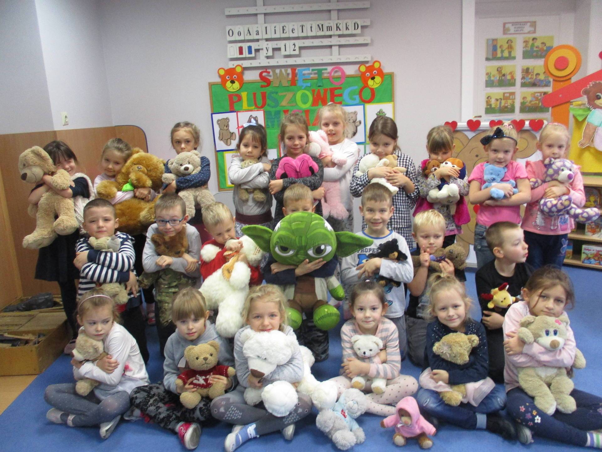 Nasze przedszkolaki w tym dniu przybyły do przedszkola ze swoimi ulubionymi pluszowymi przytulankami. Misie tego dnia opanowały nasze Przedszkole, misie były po prostu wszędzie na krzesełkach, stolikach, parapetach, półeczkach. Przybyły misie małe, średnie i bardzo duże, białe, brązowe itd.
