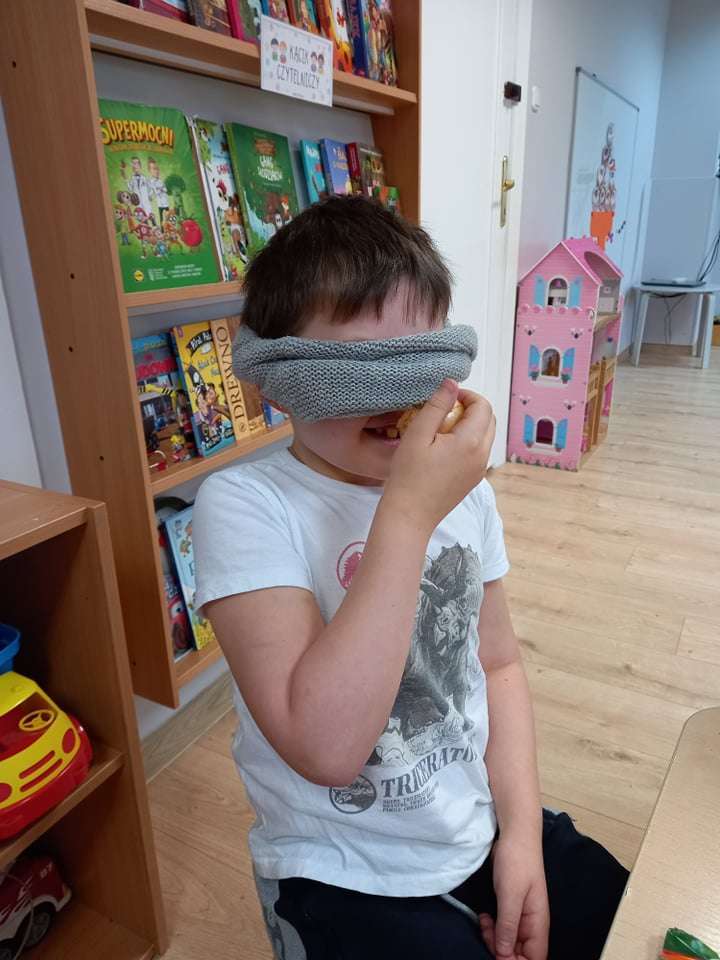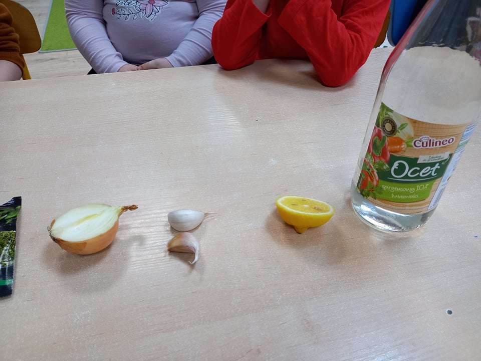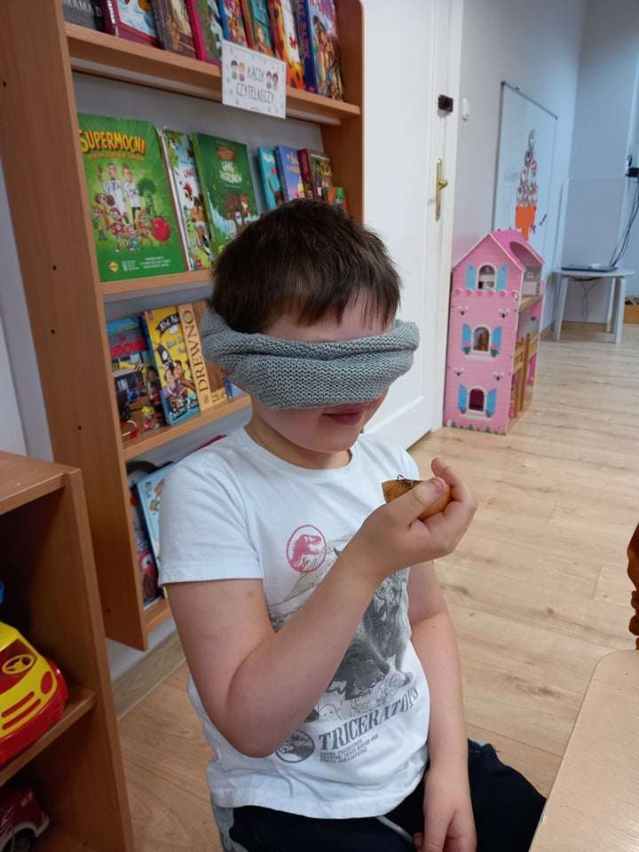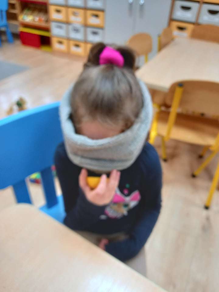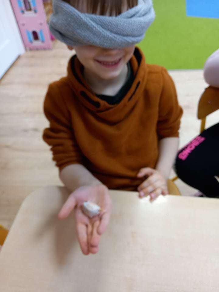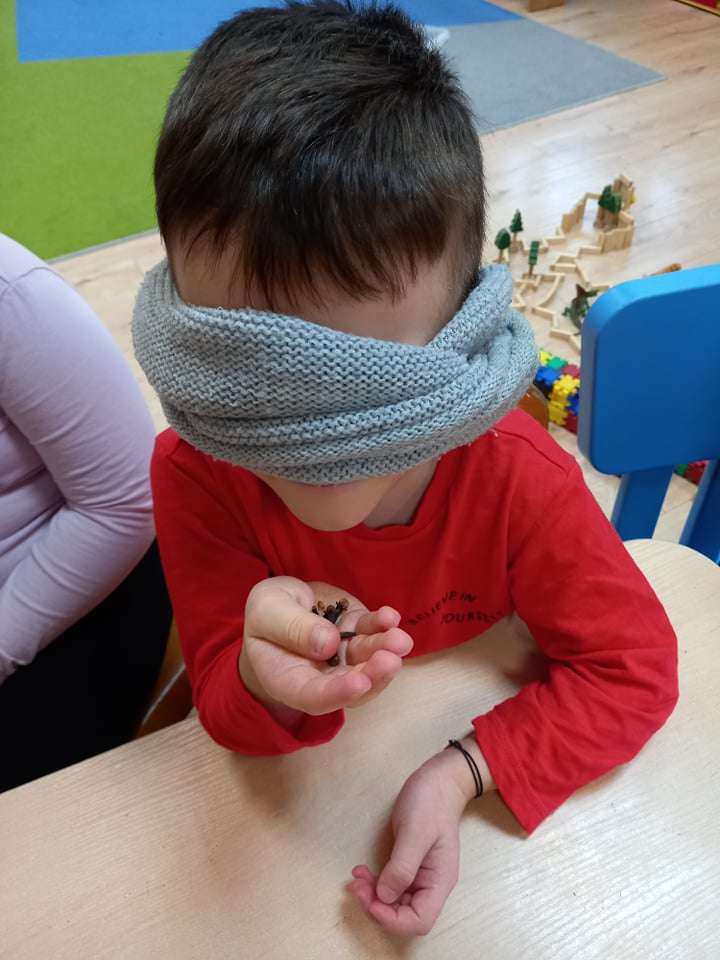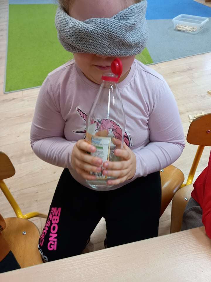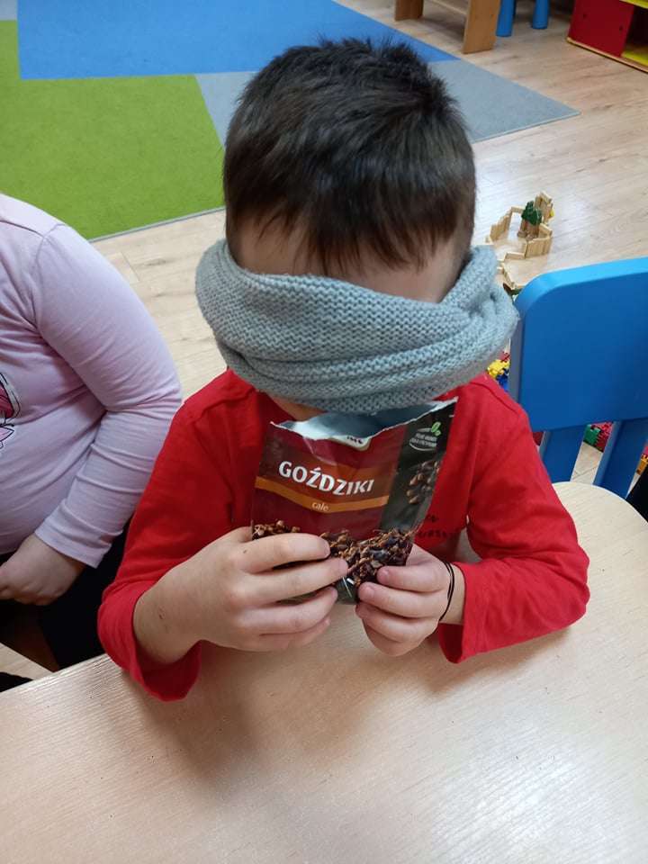 Starszaki zrealizowały lutowe zadanie w ramach projektu ” Gramy zmysłami “. Tym razem dużo pracy miały małe noski. Dzieci wąchały przyprawy, olejki eteryczne, warzywa i owoce. Określały, które zapachy są dla nich przyjemne, a które nie.
