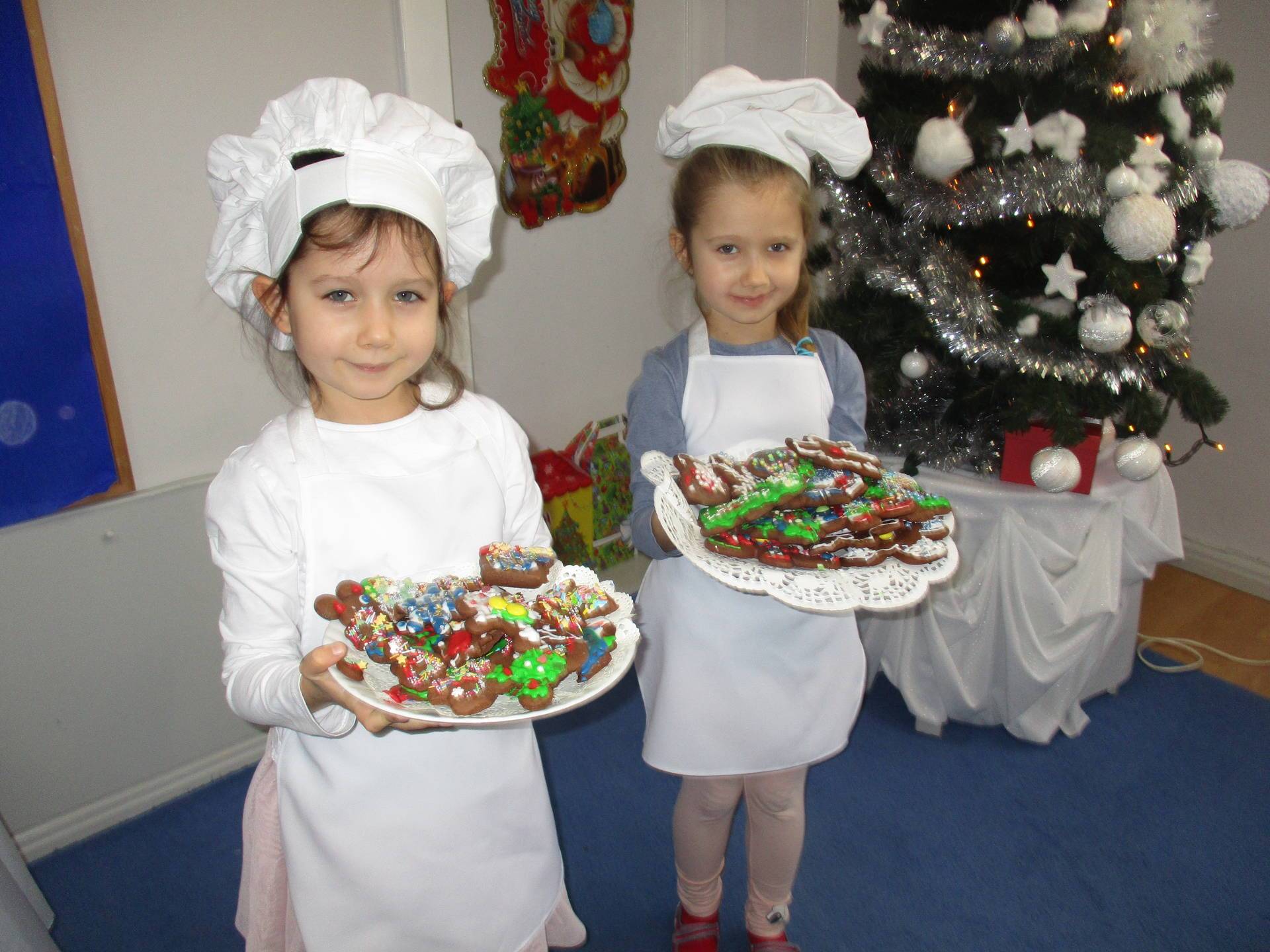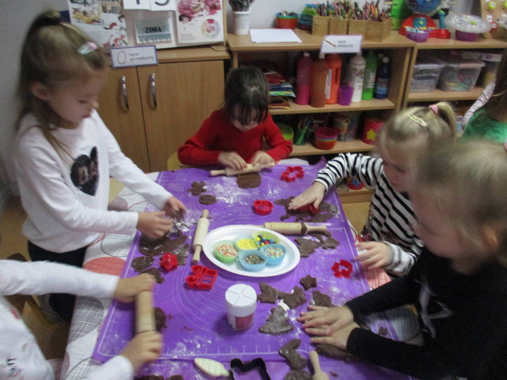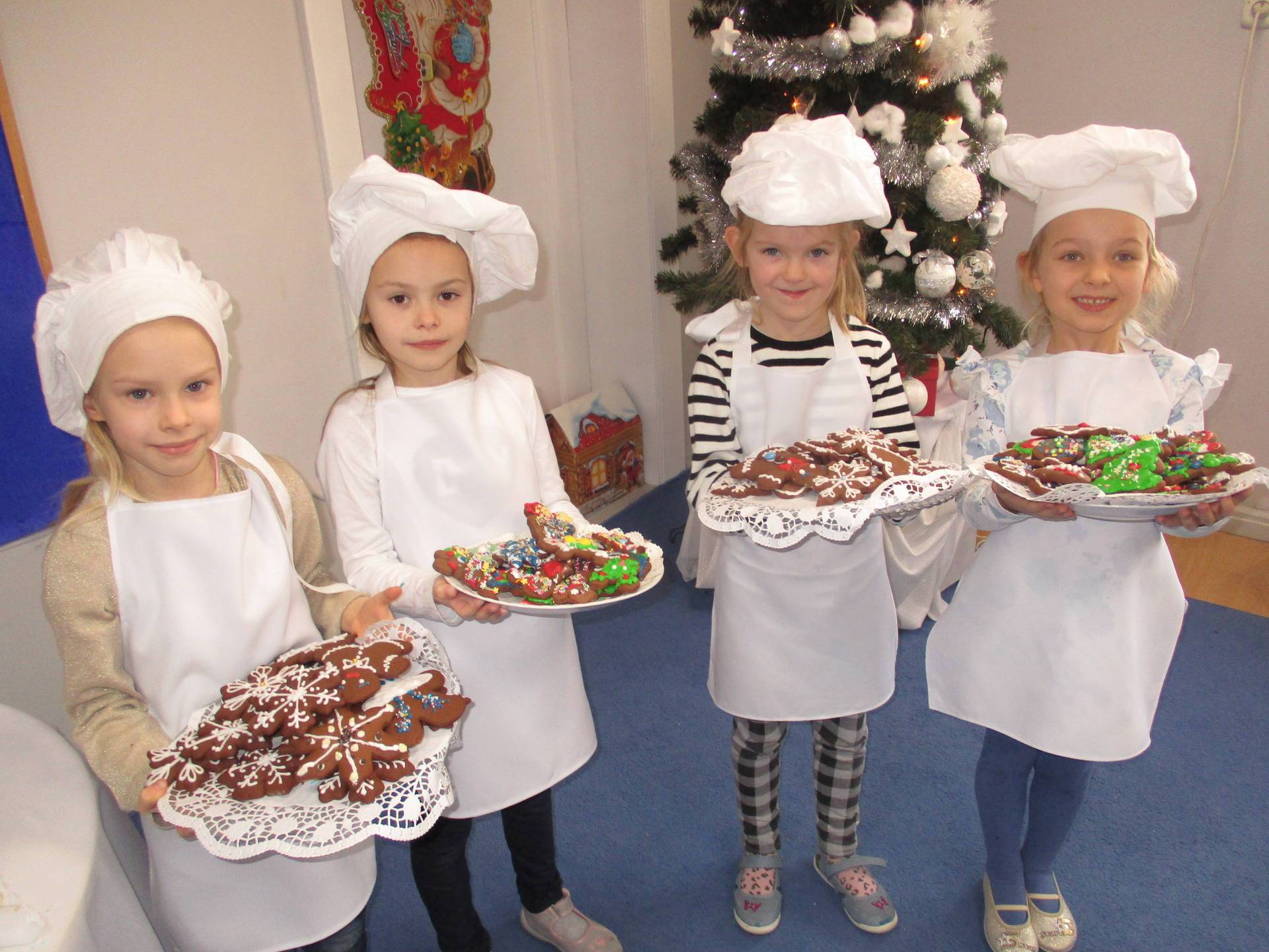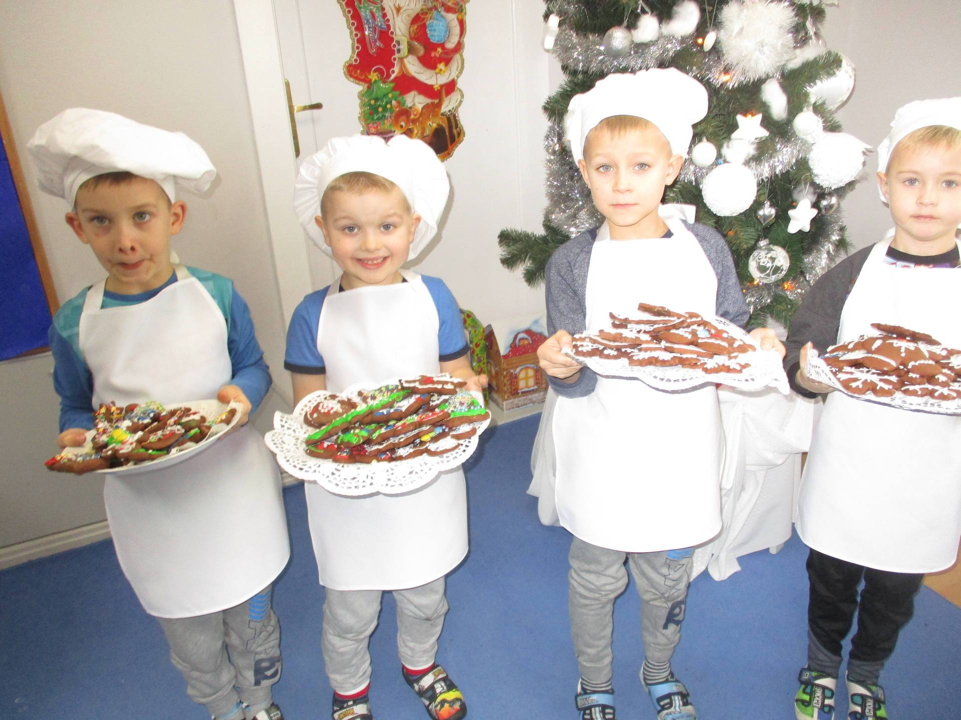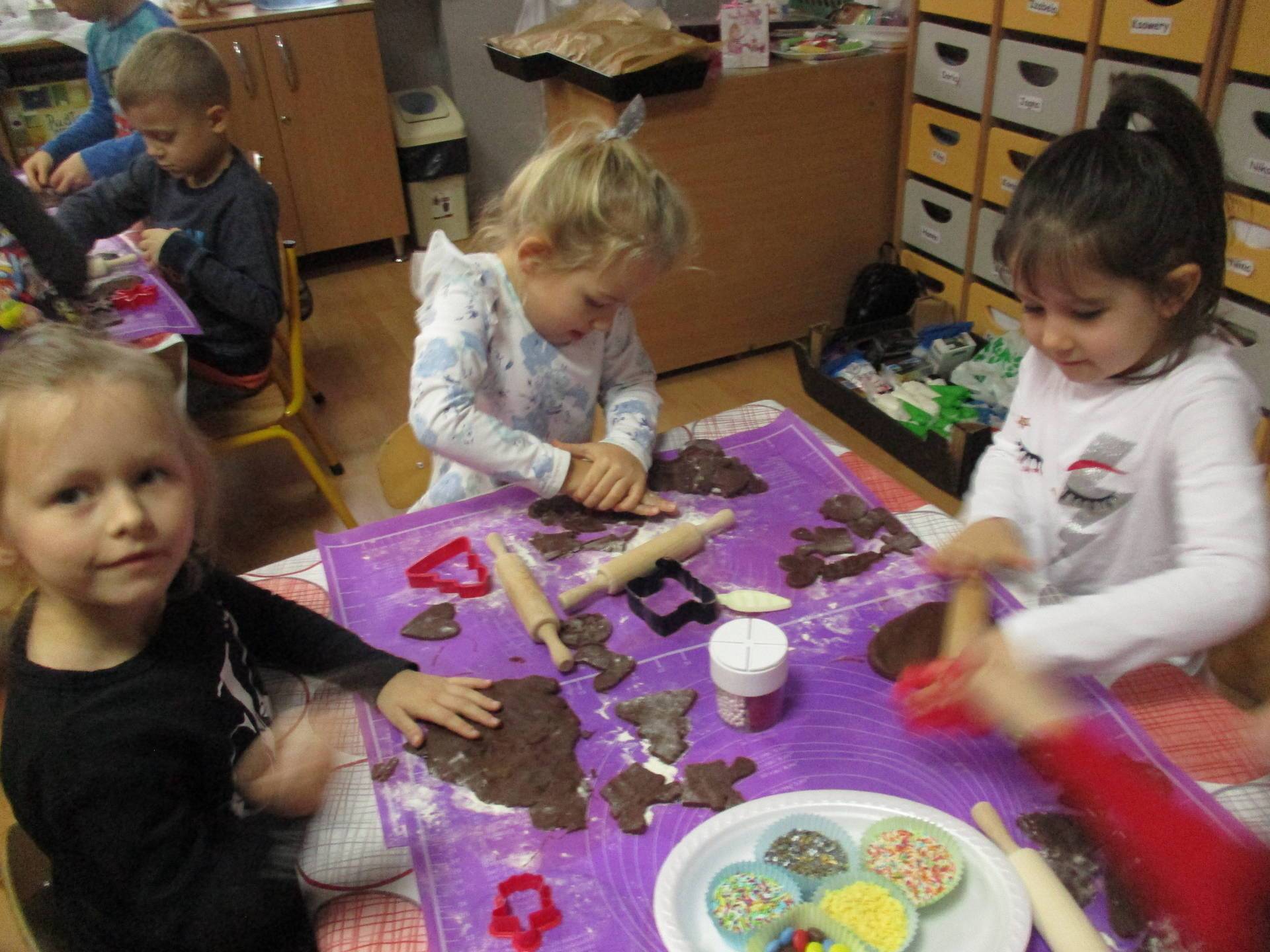 16 grudnia dla 6-latków był bardzo pracowity, bowiem tego dnia piekły one pierniczki. Najpierw odpowiednio się przygotowały dbając o czyste rączki oraz zakładając fartuszki. Poznały też składniki i sposób wykonania ciasta, potrzebne przybory kuchenne a także zasady bezpieczeństwa. Gdy wszystko było gotowe przedszkolaki z ogromnym zapałem i zaangażowaniem zabrały się do pracy – wałkowały ciasto, wykrawały ciasteczka. Efektem naszej pracy były pełne blaszki pierniczków, które zanieśliśmy do kuchni. Tu pod czujnym okiem naszych pań kuchareczek pierniki nabierały koloru piekąc się w piekarniku.