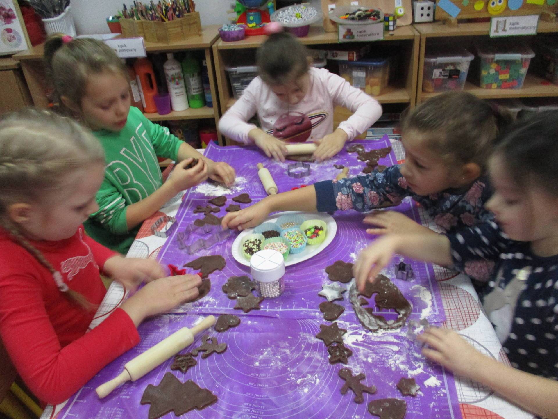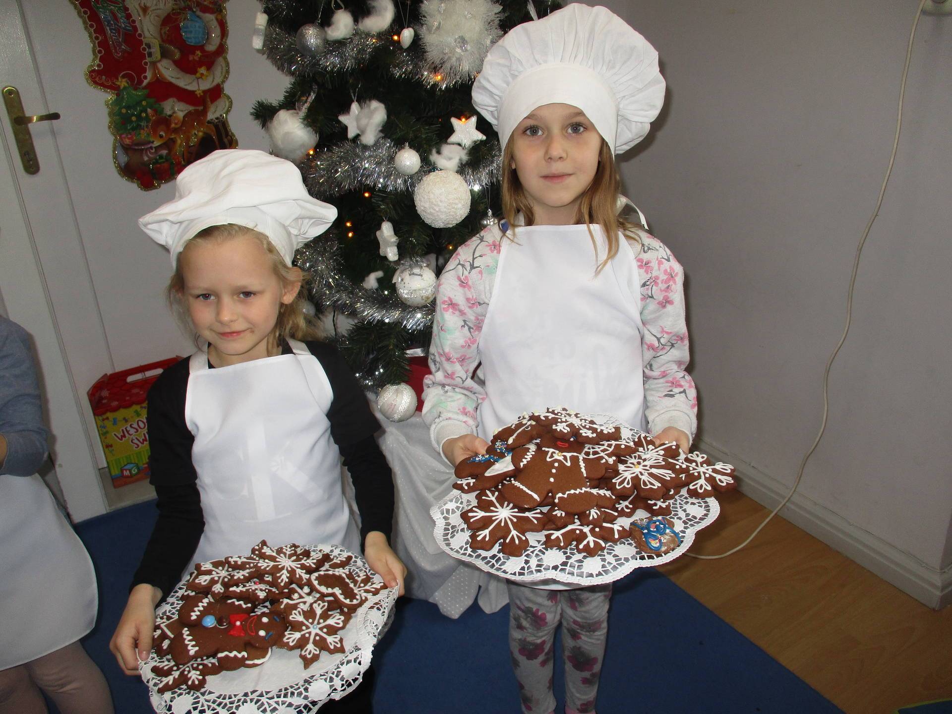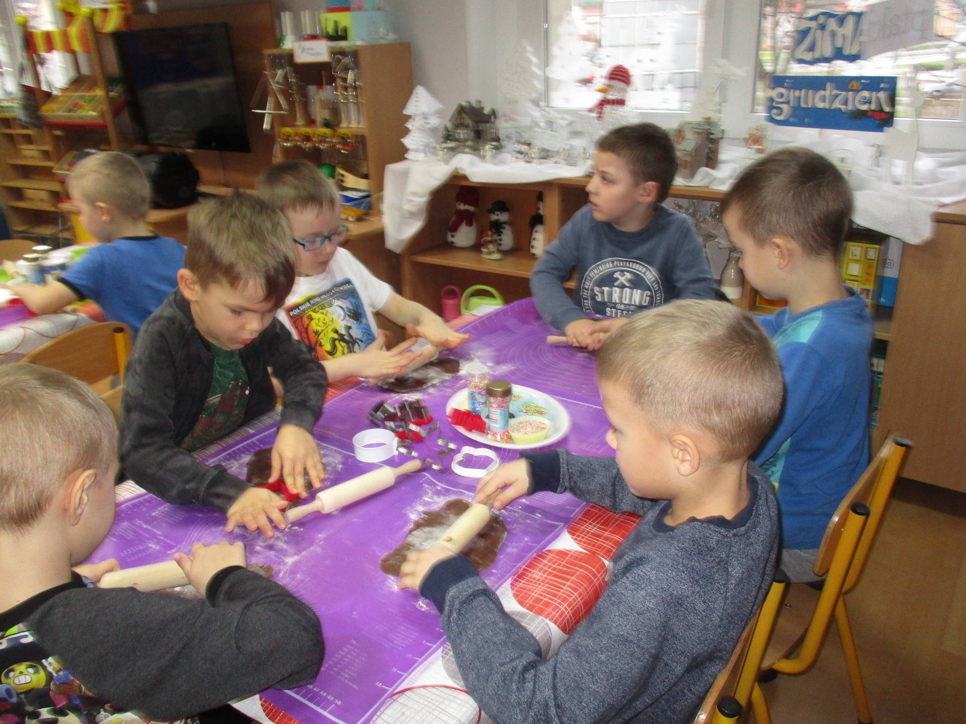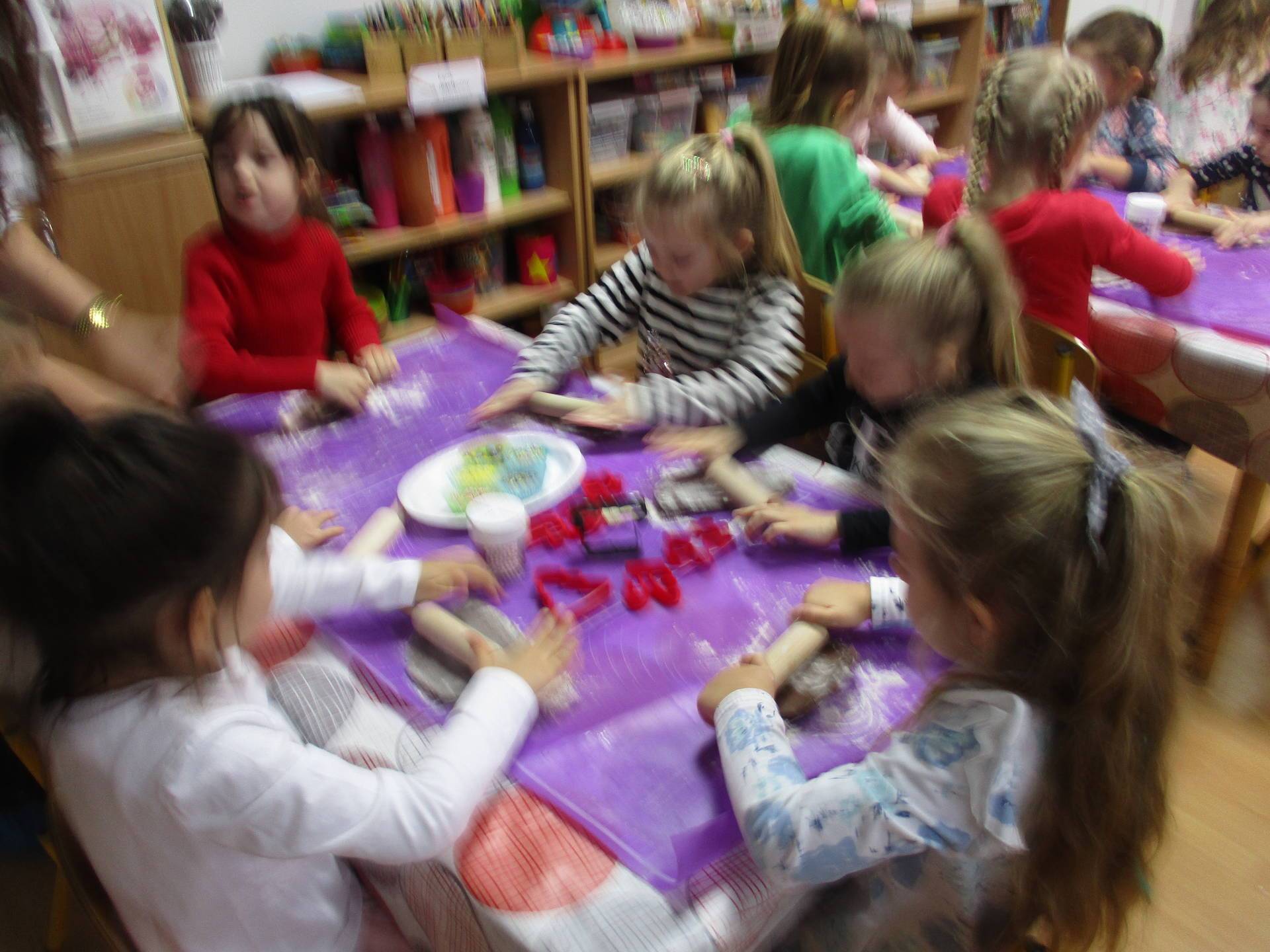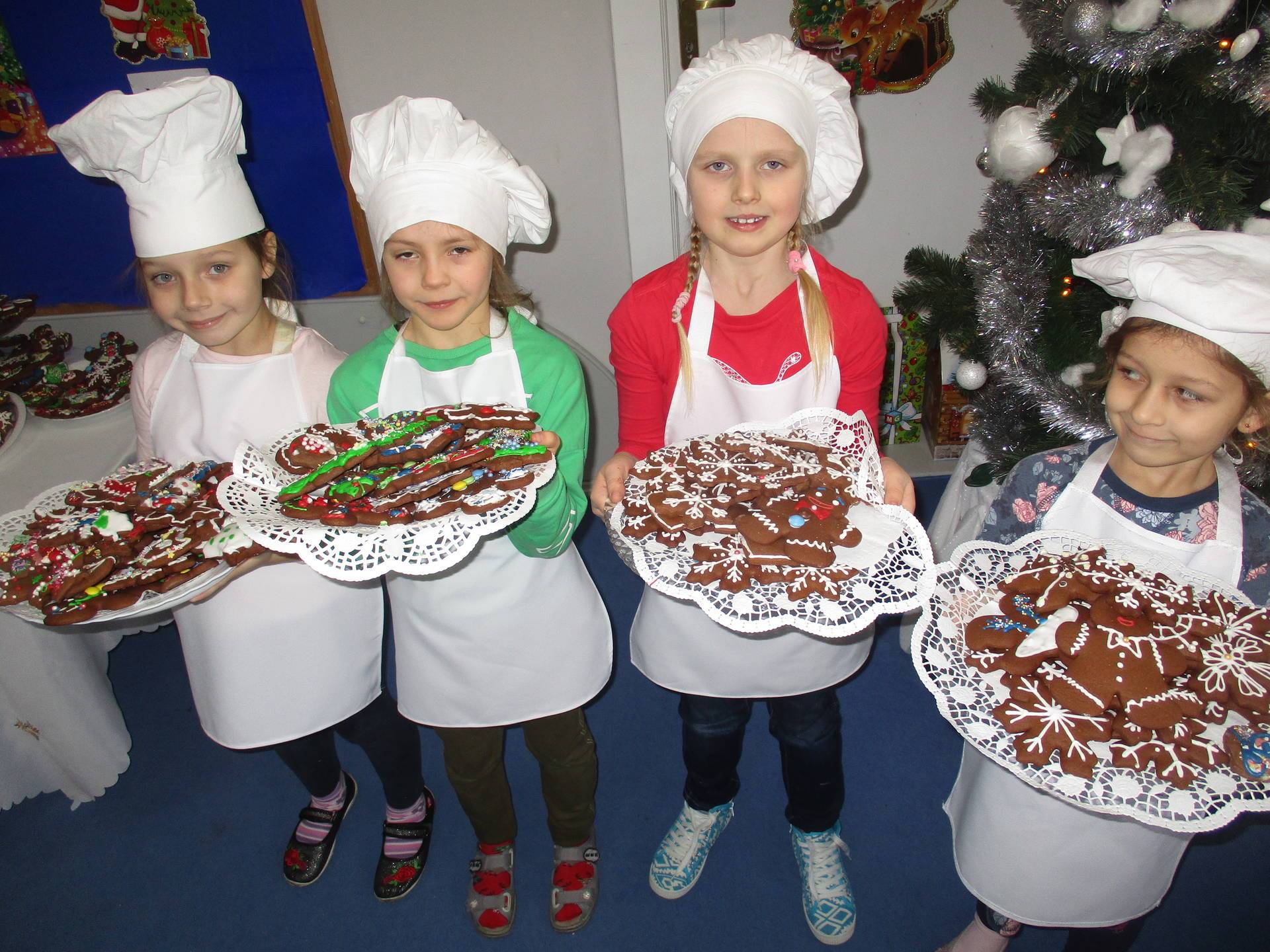 16 grudnia dla 6-latków był bardzo pracowity, bowiem tego dnia piekły one pierniczki. Najpierw odpowiednio się przygotowały dbając o czyste rączki oraz zakładając fartuszki. Poznały też składniki i sposób wykonania ciasta, potrzebne przybory kuchenne a także zasady bezpieczeństwa. Gdy wszystko było gotowe przedszkolaki z ogromnym zapałem i zaangażowaniem zabrały się do pracy – wałkowały ciasto, wykrawały ciasteczka. Efektem naszej pracy były pełne blaszki pierniczków, które zanieśliśmy do kuchni. Tu pod czujnym okiem naszych pań kuchareczek pierniki nabierały koloru piekąc się w piekarniku.