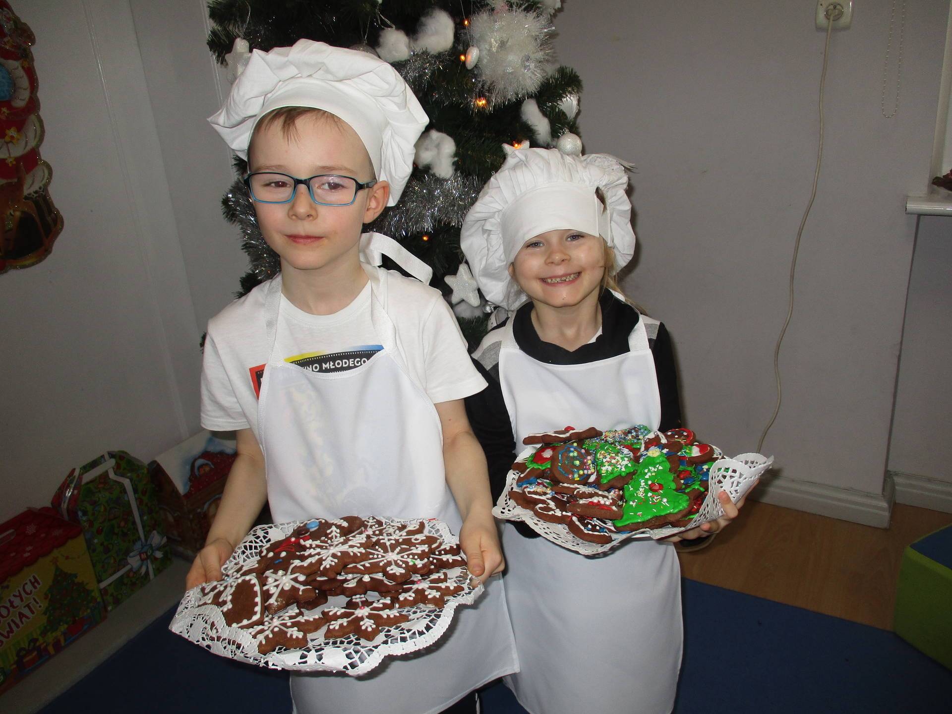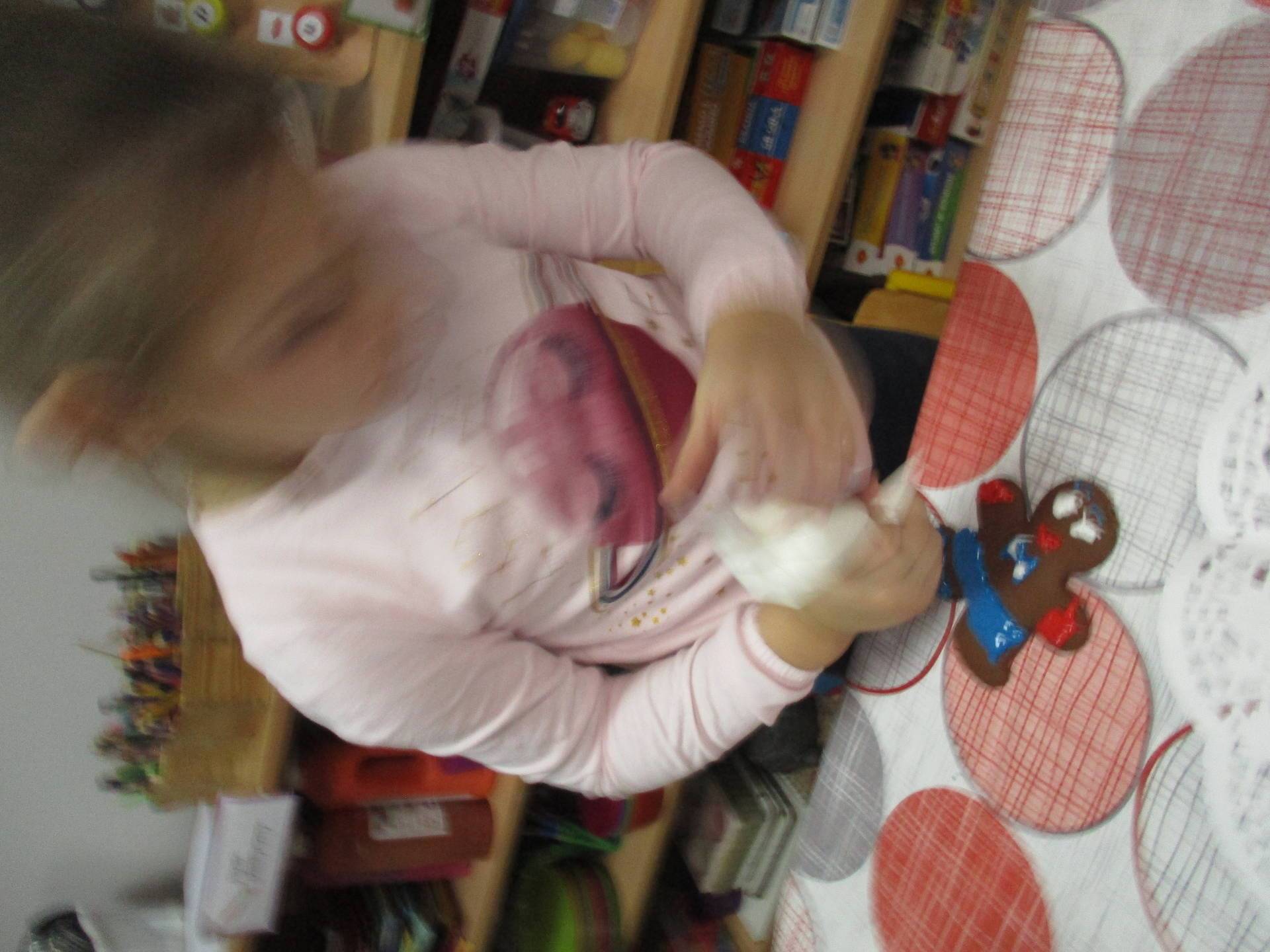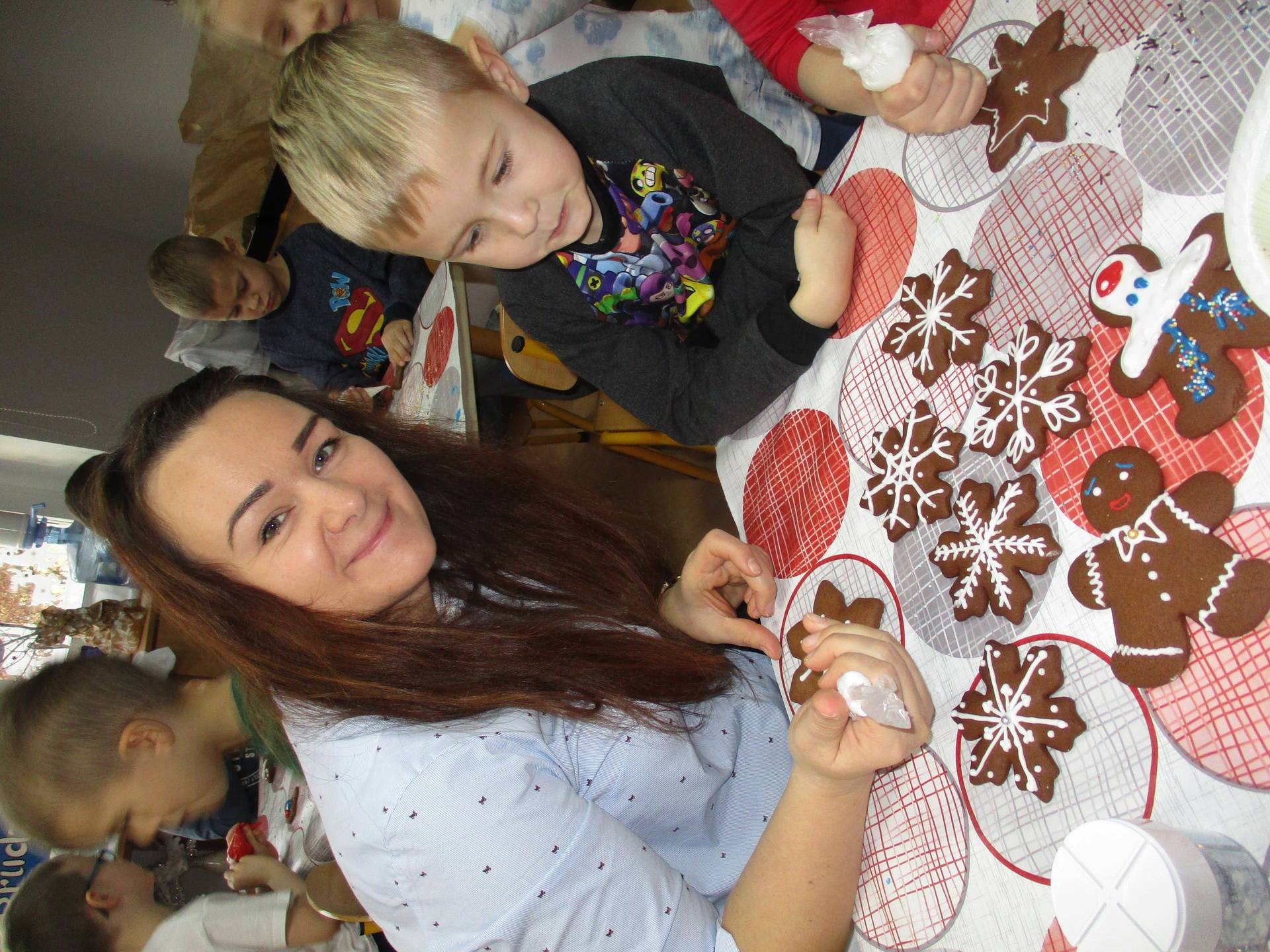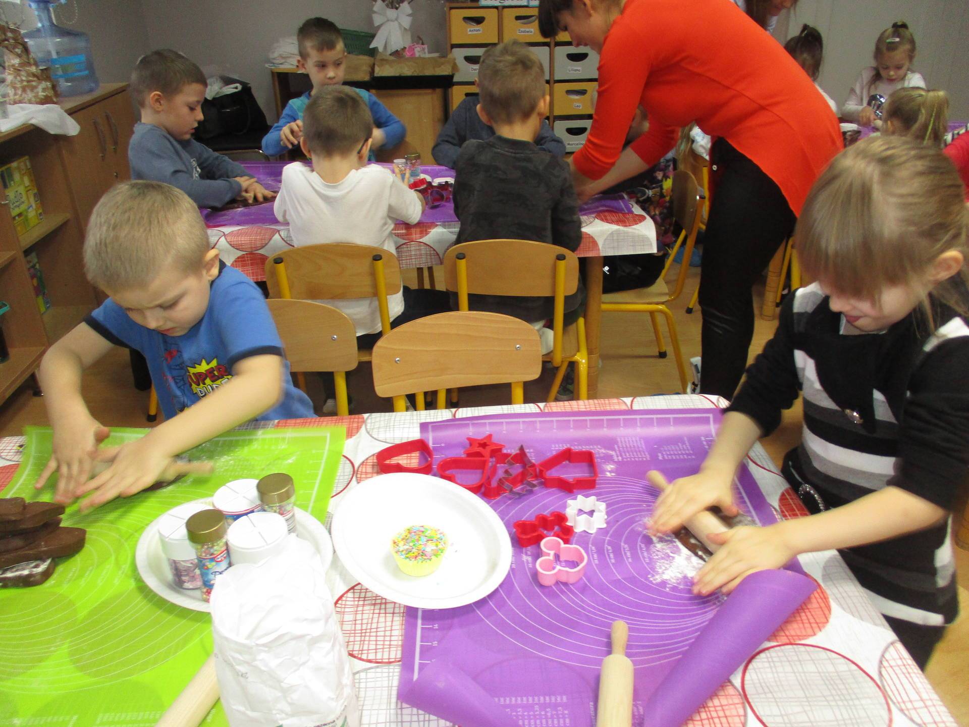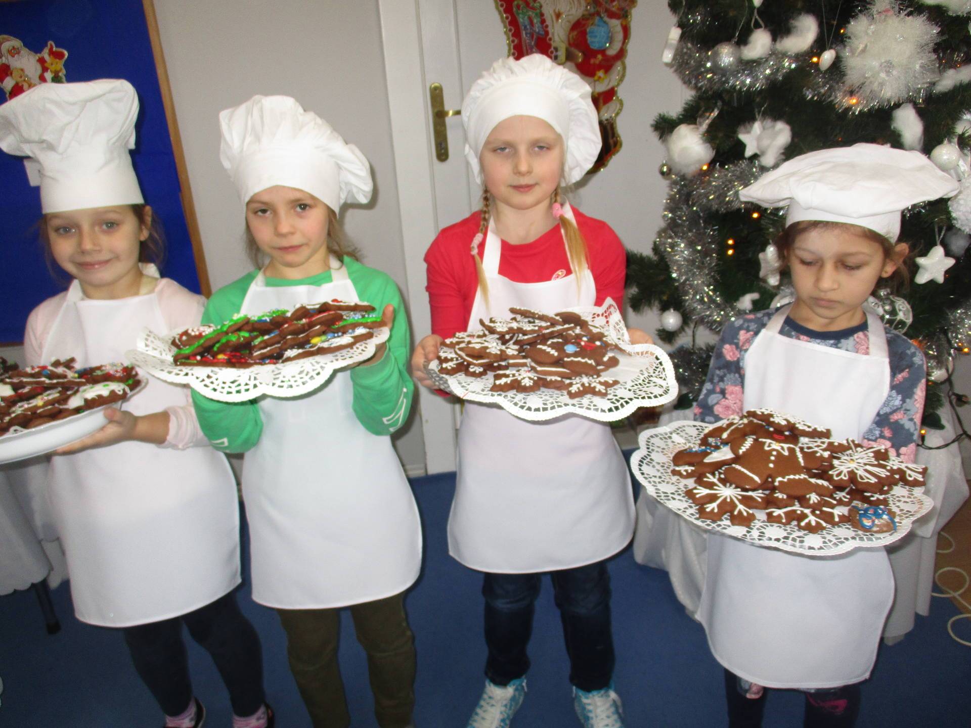 16 grudnia dla 6-latków był bardzo pracowity, bowiem tego dnia piekły one pierniczki. Najpierw odpowiednio się przygotowały dbając o czyste rączki oraz zakładając fartuszki. Poznały też składniki i sposób wykonania ciasta, potrzebne przybory kuchenne a także zasady bezpieczeństwa. Gdy wszystko było gotowe przedszkolaki z ogromnym zapałem i zaangażowaniem zabrały się do pracy – wałkowały ciasto, wykrawały ciasteczka. Efektem naszej pracy były pełne blaszki pierniczków, które zanieśliśmy do kuchni. Tu pod czujnym okiem naszych pań kuchareczek pierniki nabierały koloru piekąc się w piekarniku.