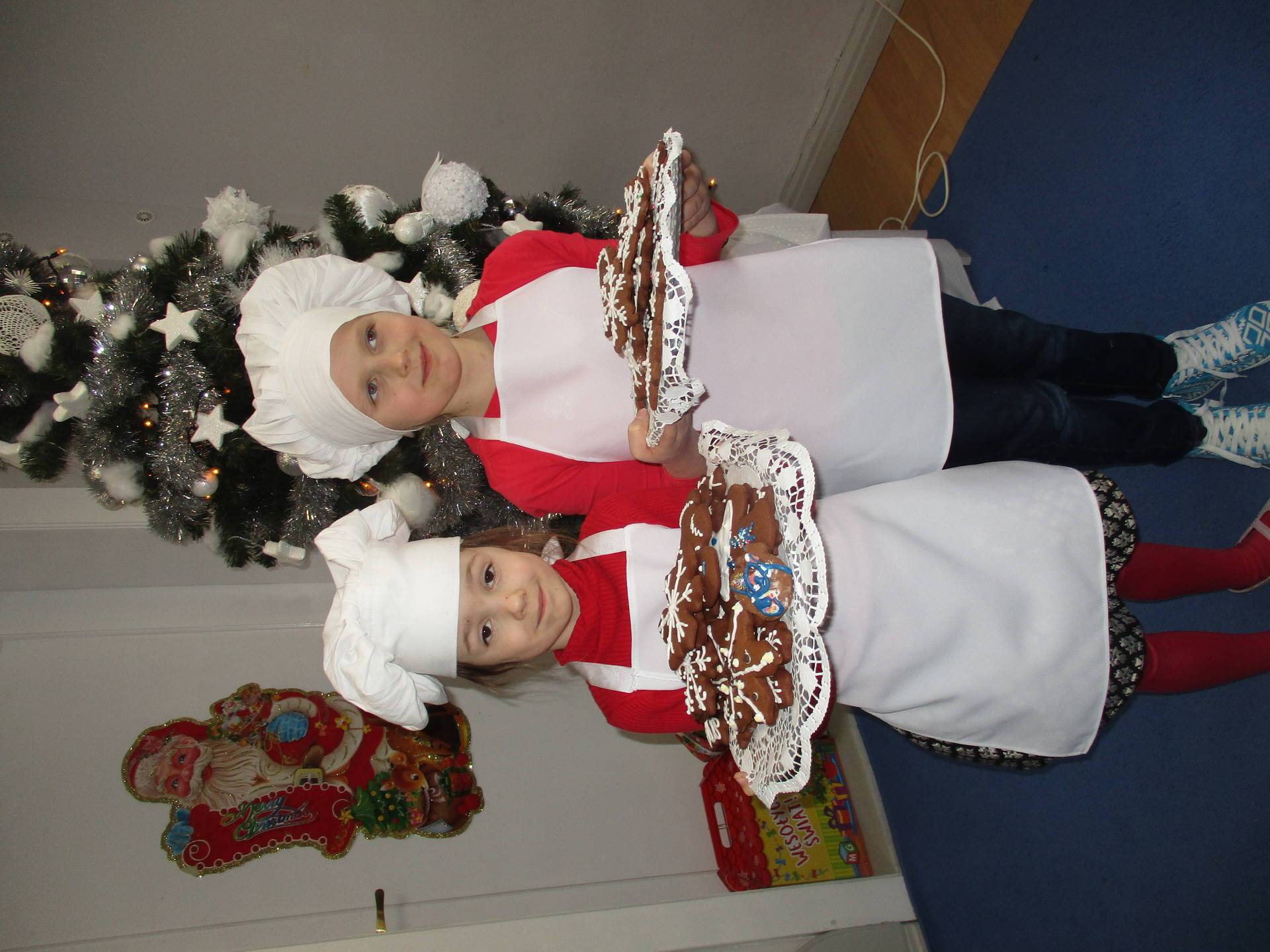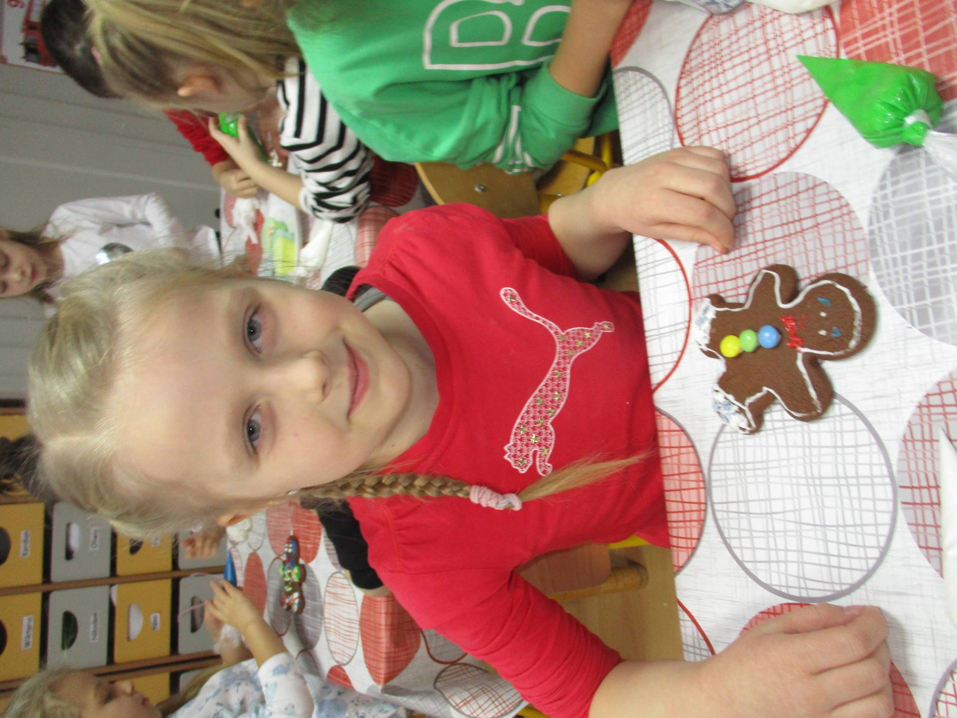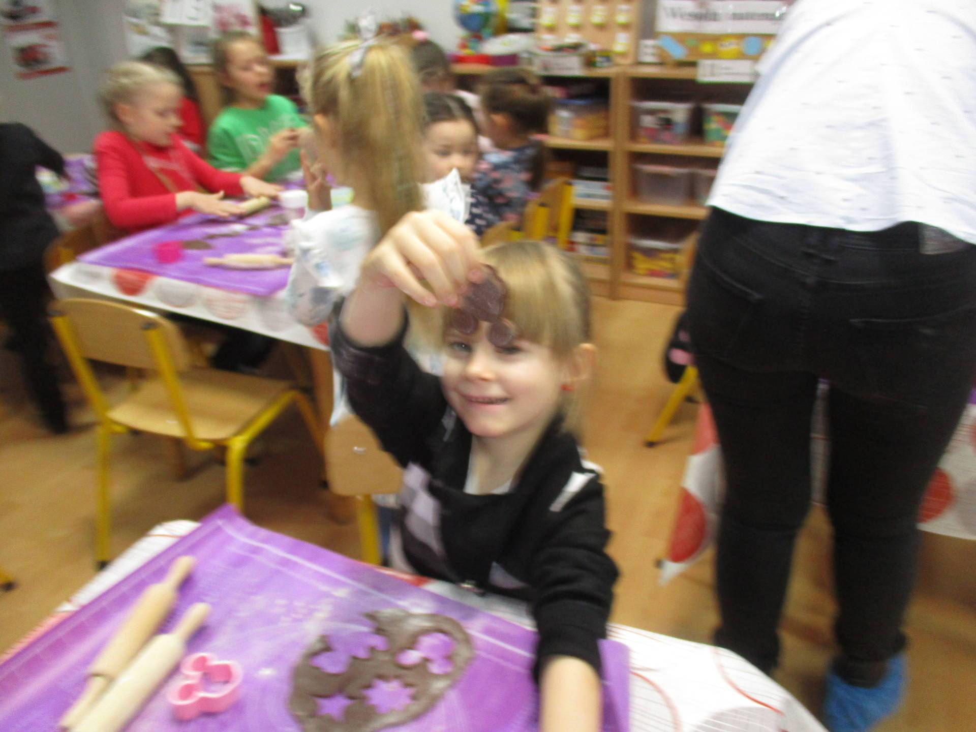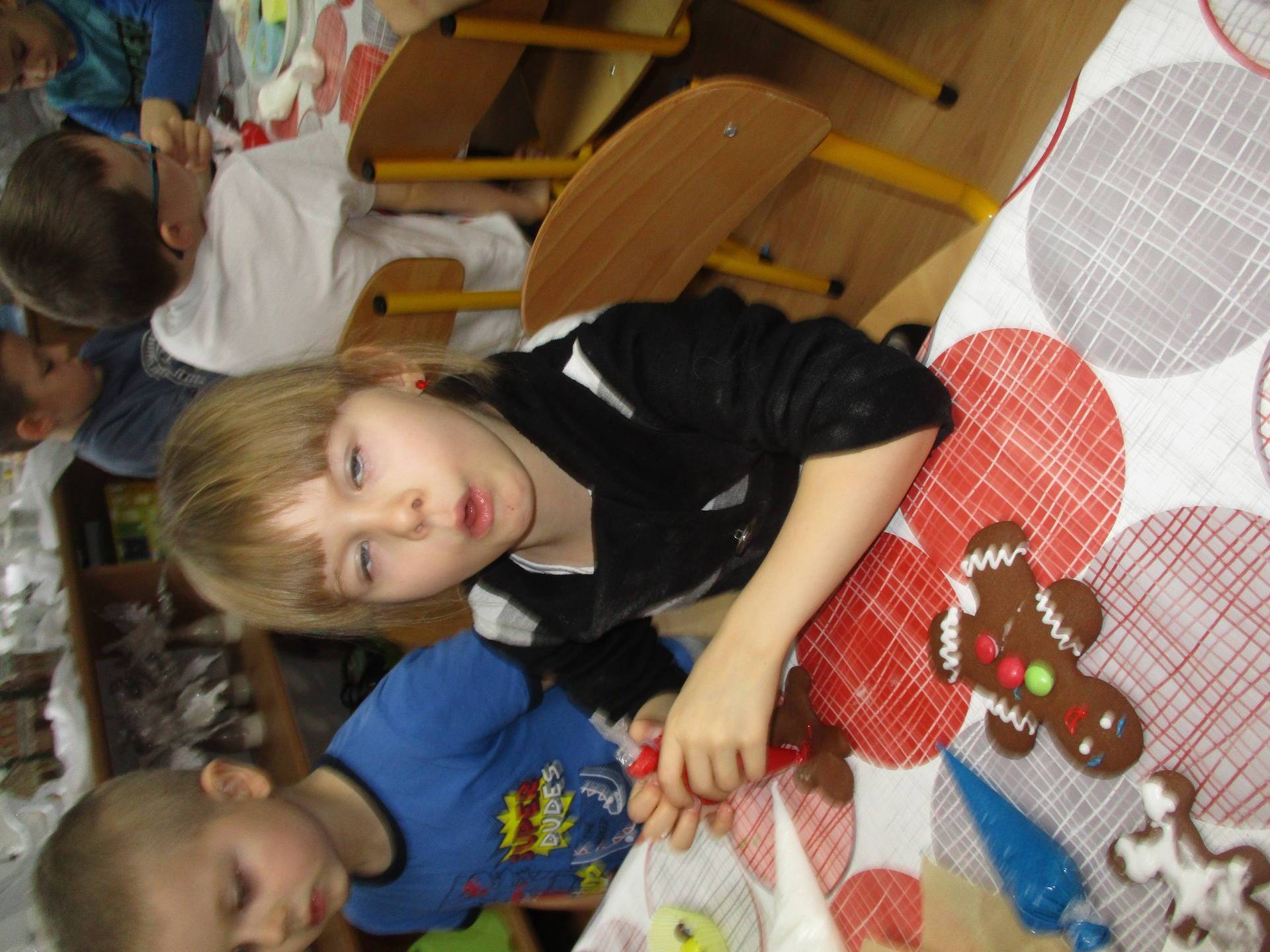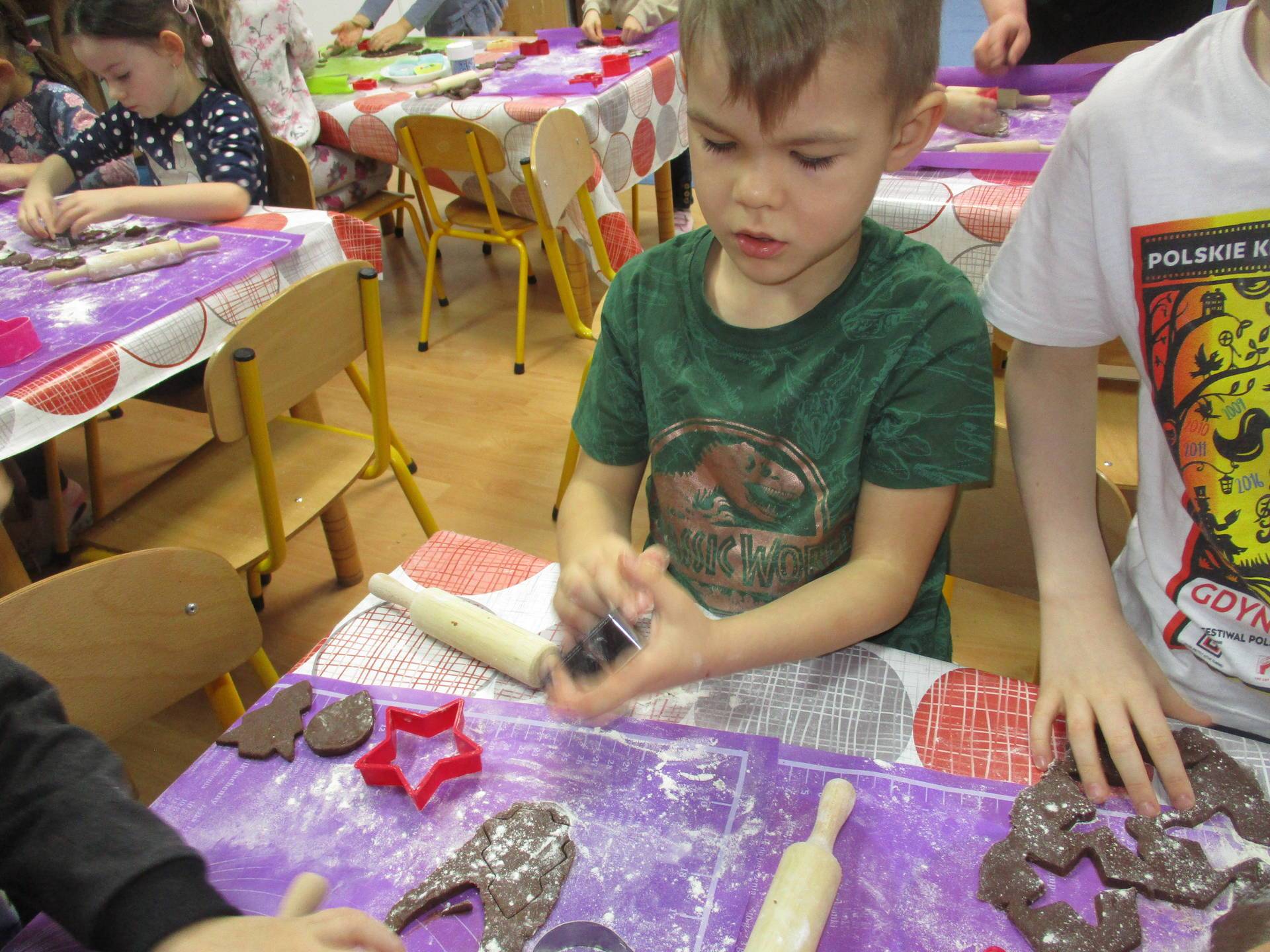 16 grudnia dla 6-latków był bardzo pracowity, bowiem tego dnia piekły one pierniczki. Najpierw odpowiednio się przygotowały dbając o czyste rączki oraz zakładając fartuszki. Poznały też składniki i sposób wykonania ciasta, potrzebne przybory kuchenne a także zasady bezpieczeństwa. Gdy wszystko było gotowe przedszkolaki z ogromnym zapałem i zaangażowaniem zabrały się do pracy – wałkowały ciasto, wykrawały ciasteczka. Efektem naszej pracy były pełne blaszki pierniczków, które zanieśliśmy do kuchni. Tu pod czujnym okiem naszych pań kuchareczek pierniki nabierały koloru piekąc się w piekarniku.