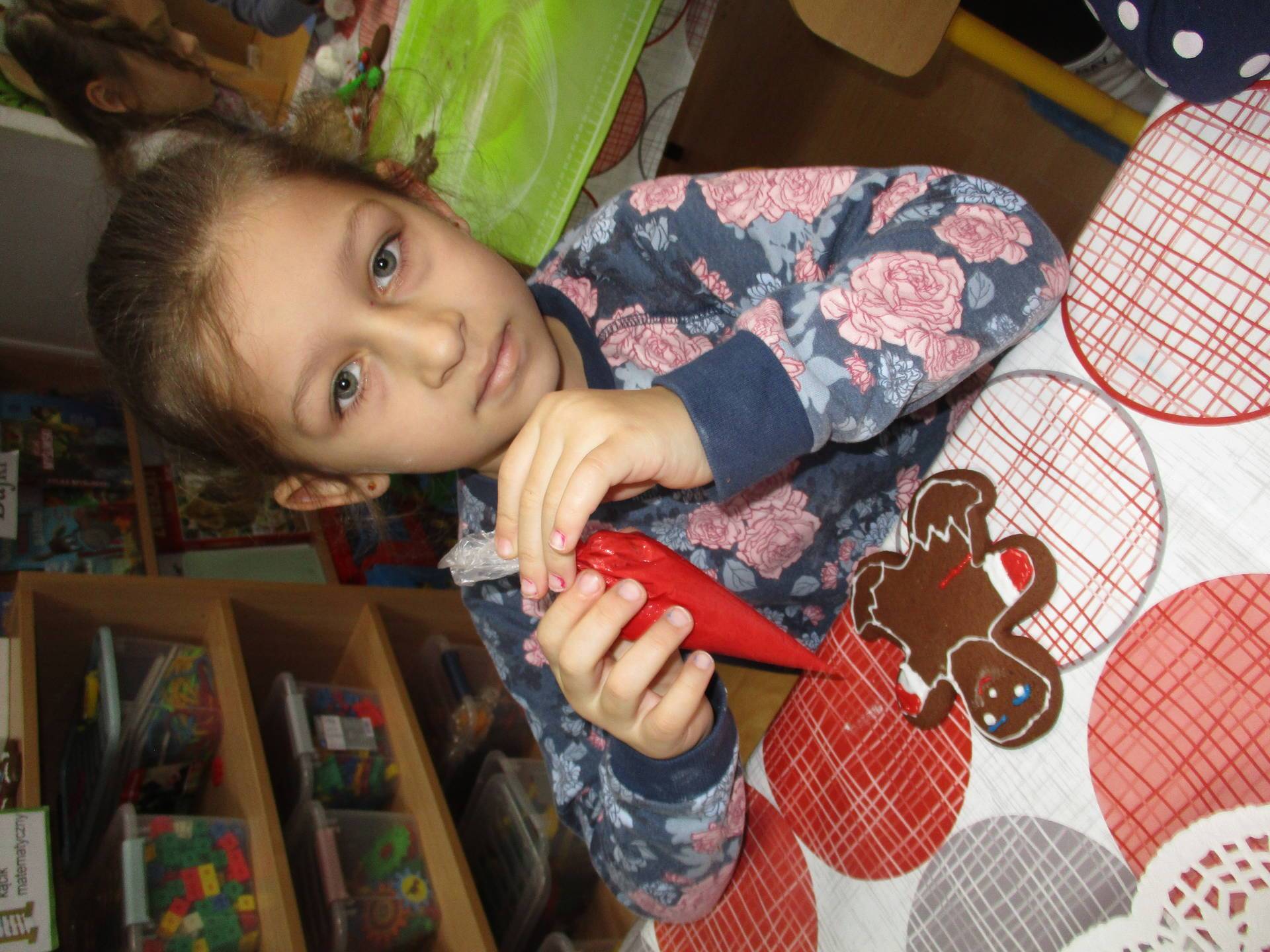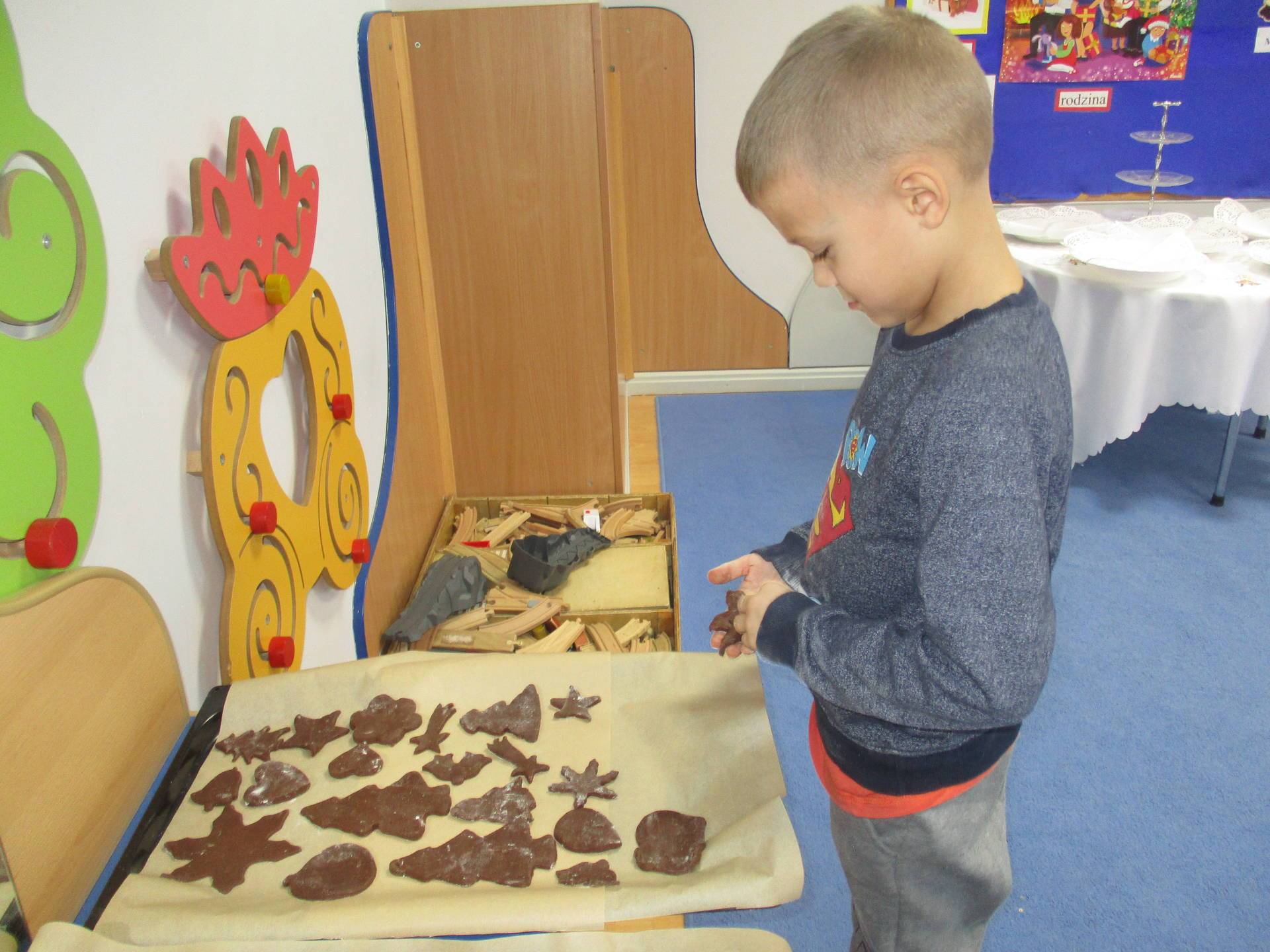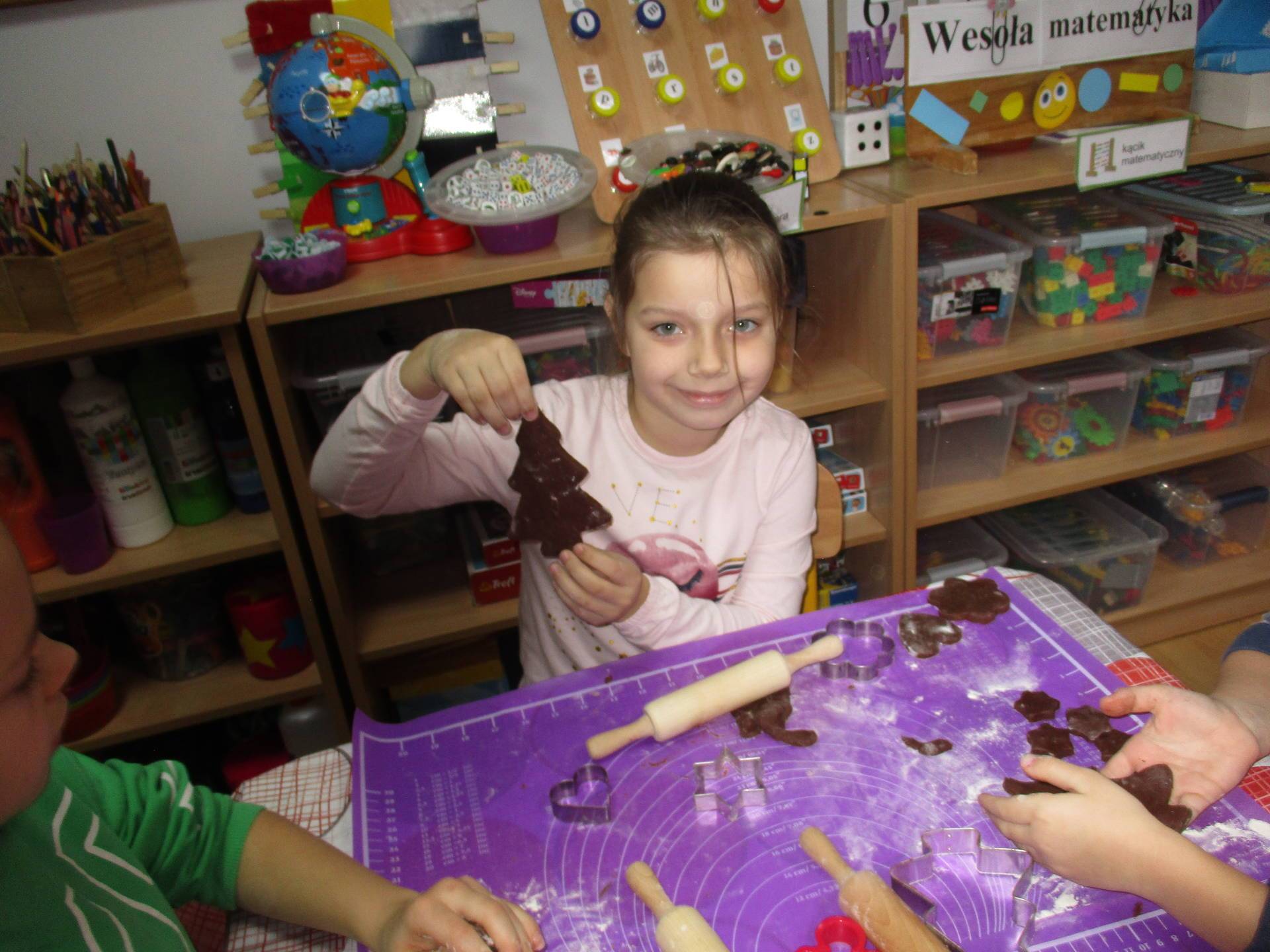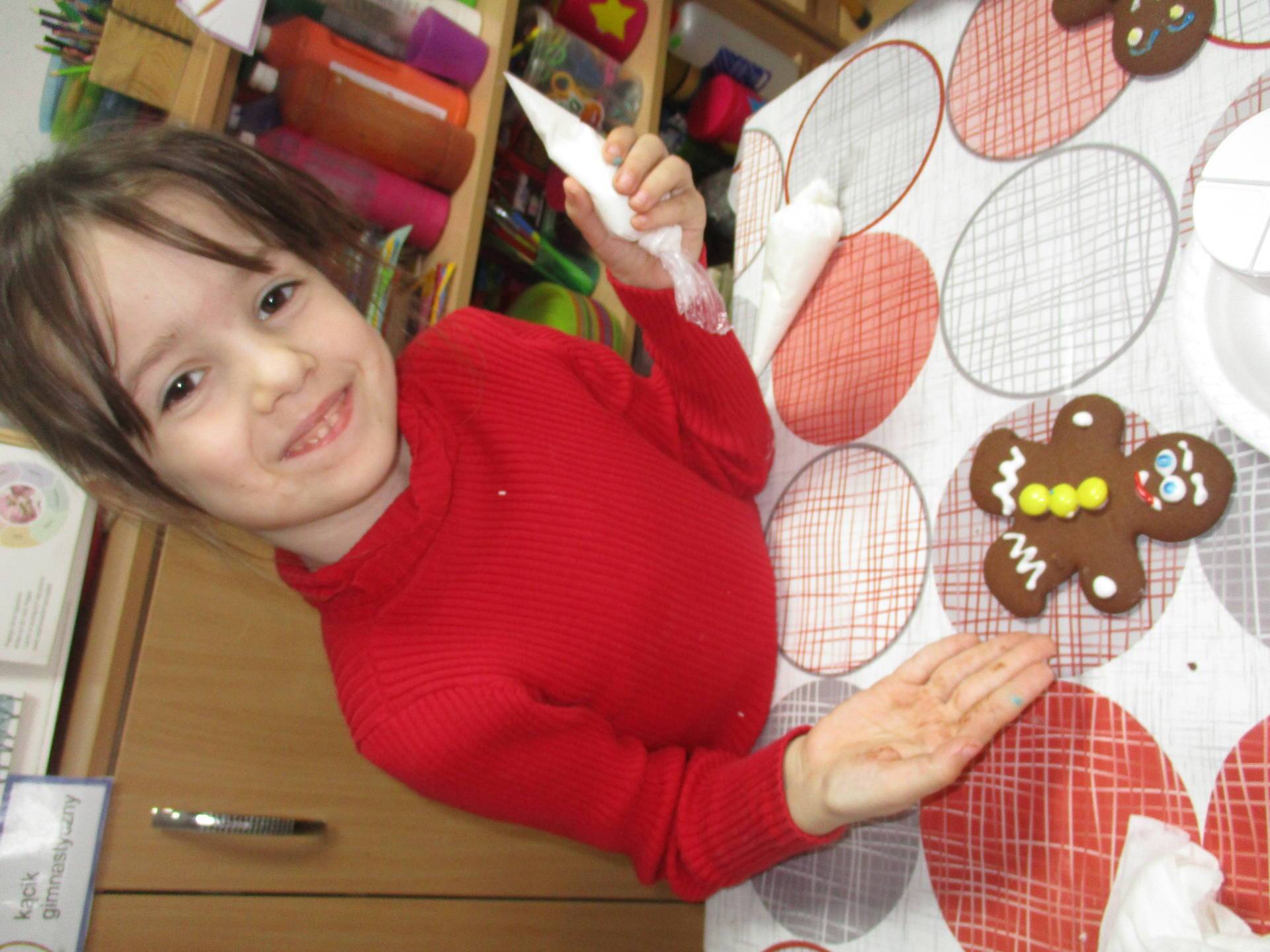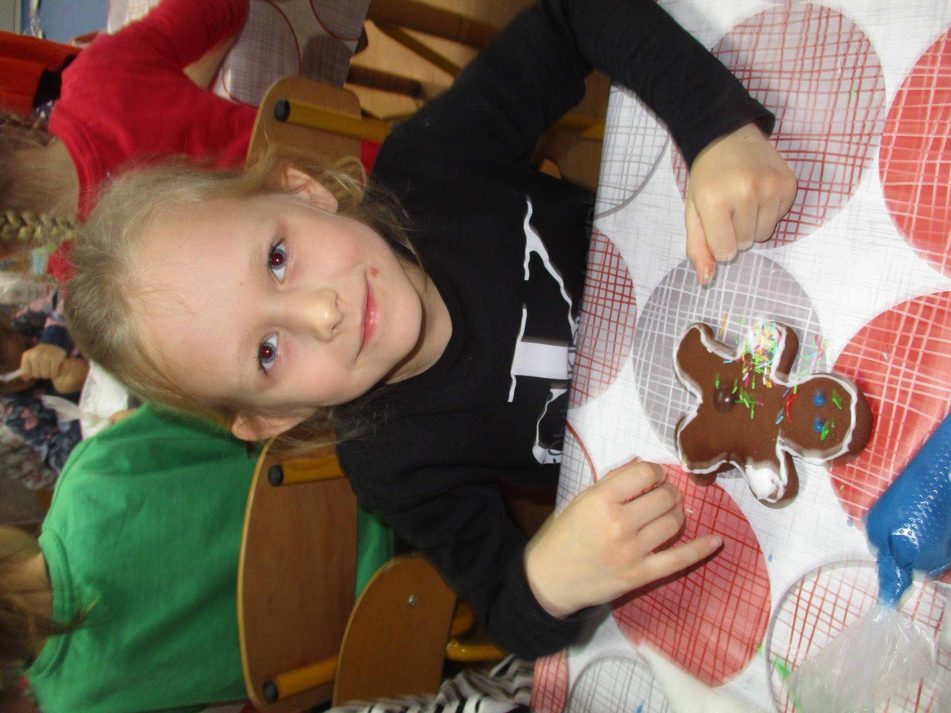16 grudnia dla 6-latków był bardzo pracowity, bowiem tego dnia piekły one pierniczki. Najpierw odpowiednio się przygotowały dbając o czyste rączki oraz zakładając fartuszki. Poznały też składniki i sposób wykonania ciasta, potrzebne przybory kuchenne a także zasady bezpieczeństwa. Gdy wszystko było gotowe przedszkolaki z ogromnym zapałem i zaangażowaniem zabrały się do pracy – wałkowały ciasto, wykrawały ciasteczka. Efektem naszej pracy były pełne blaszki pierniczków, które zanieśliśmy do kuchni. Tu pod czujnym okiem naszych pań kuchareczek pierniki nabierały koloru piekąc się w piekarniku.
