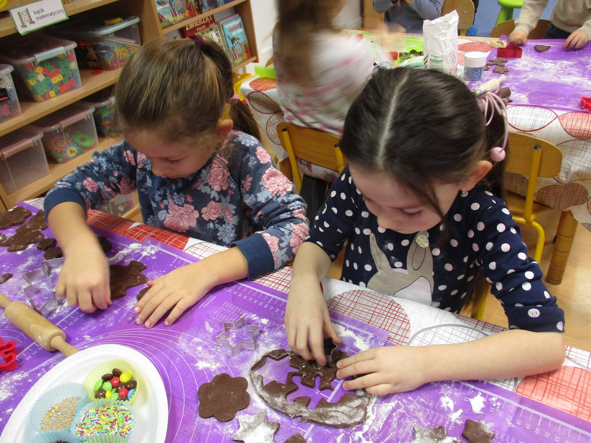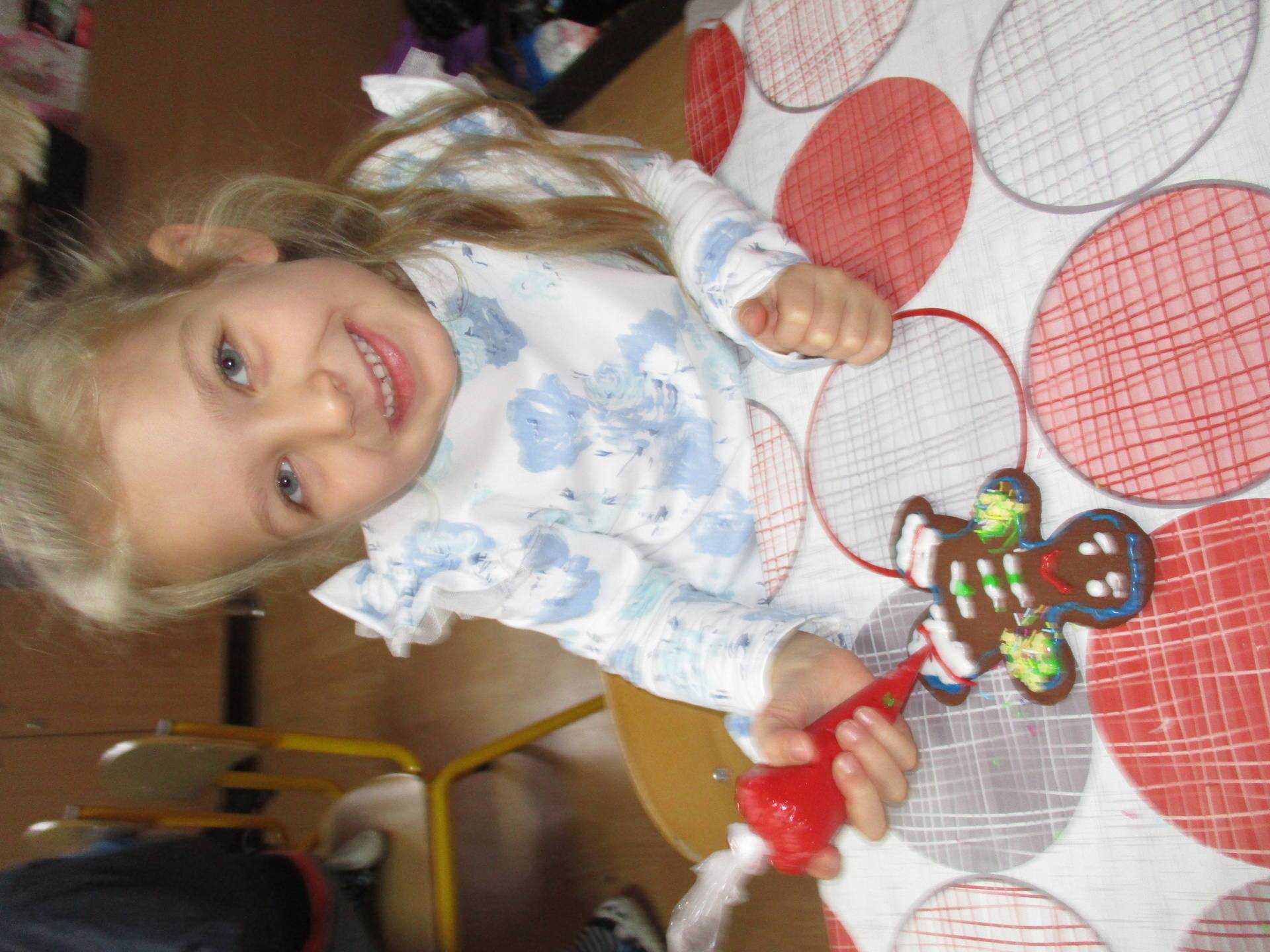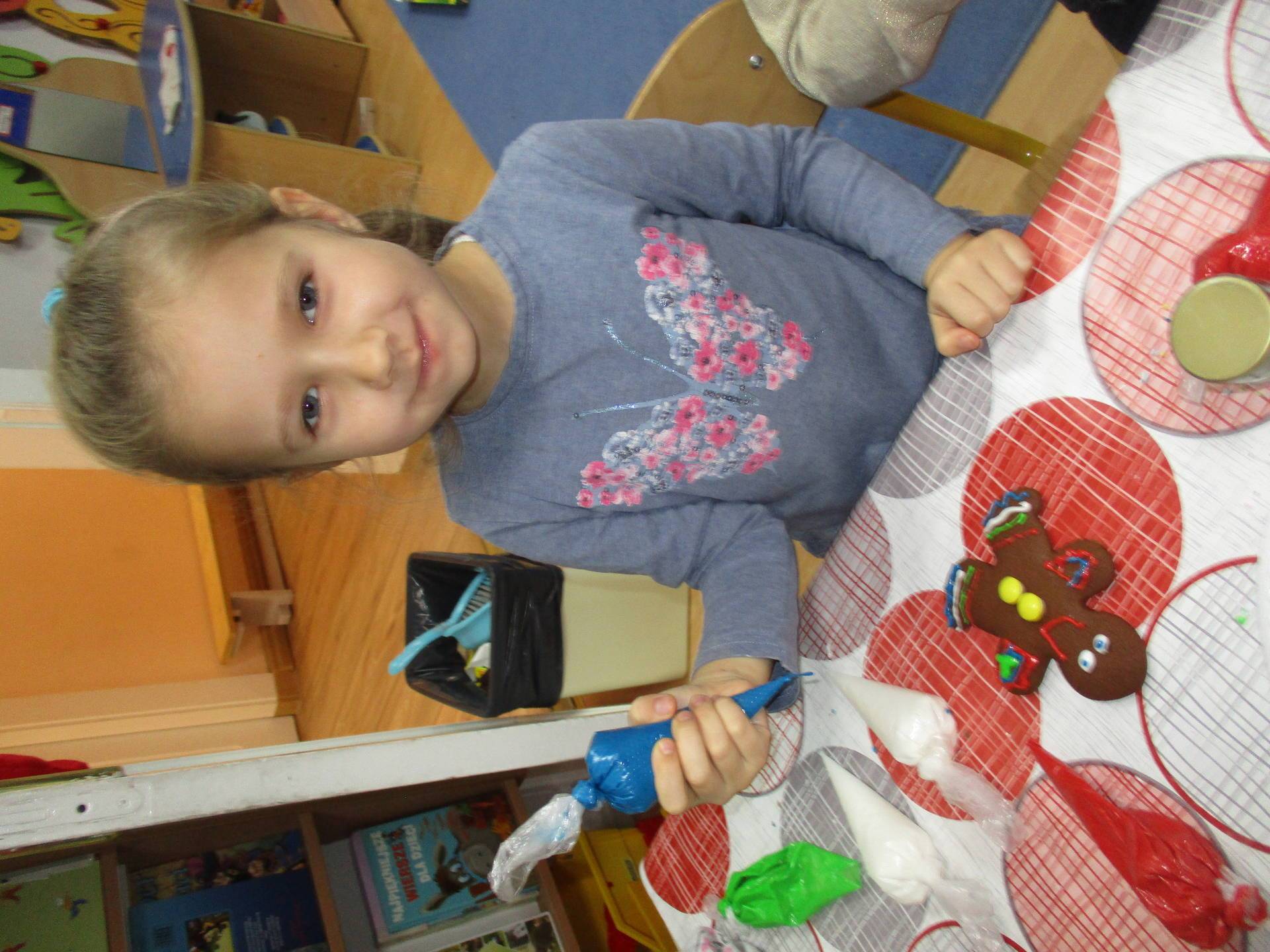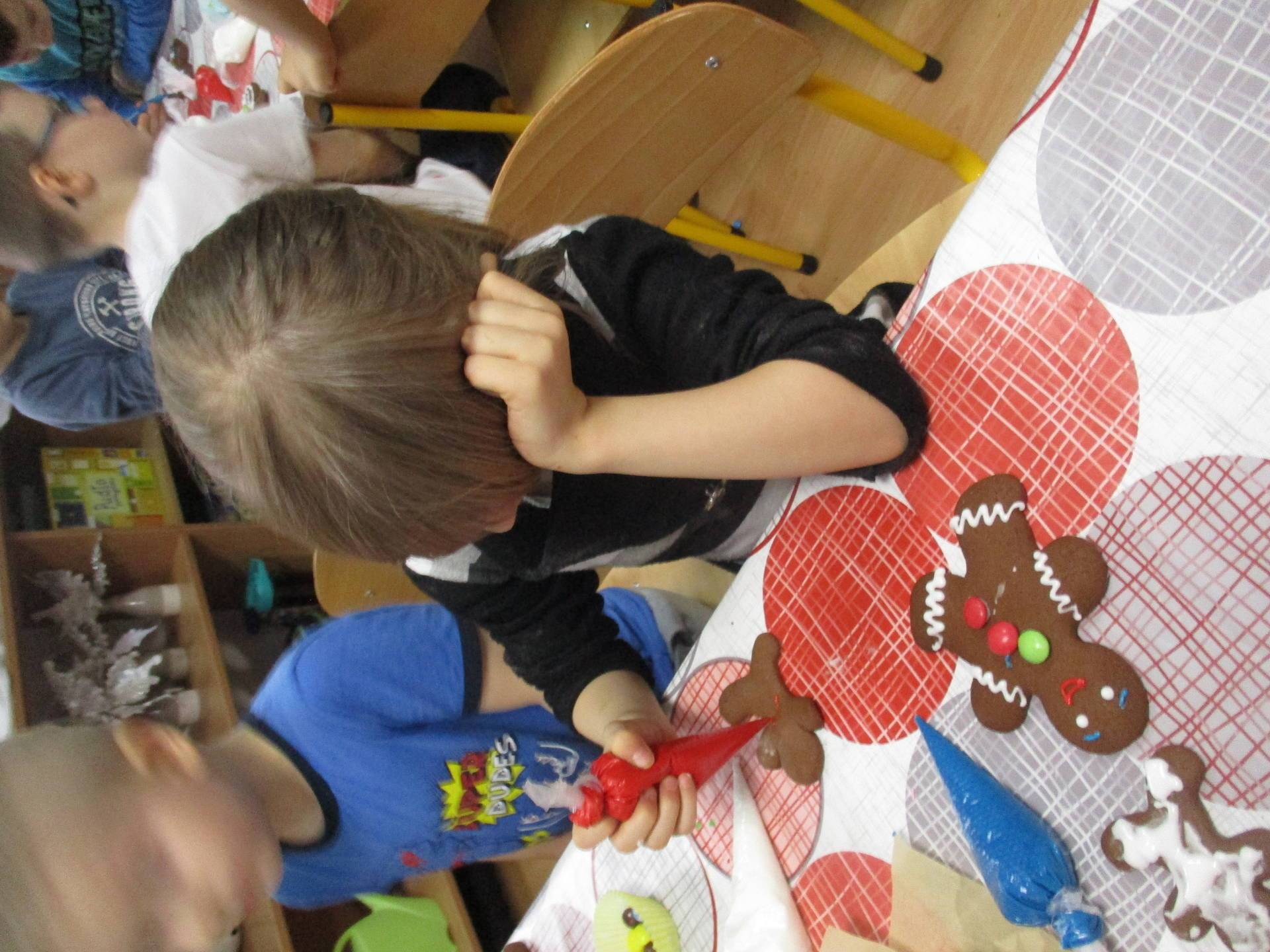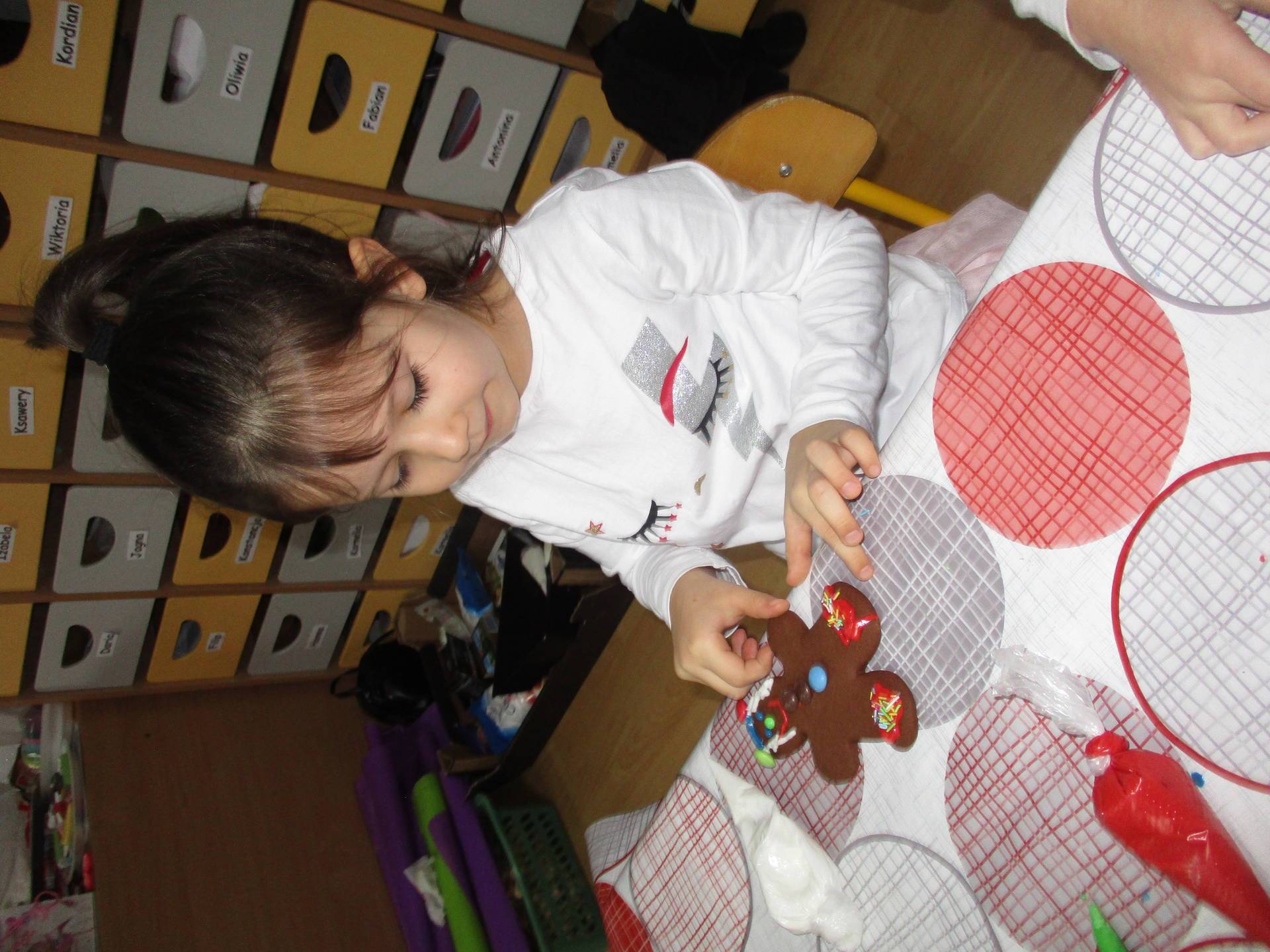 16 grudnia dla 6-latków był bardzo pracowity, bowiem tego dnia piekły one pierniczki. Najpierw odpowiednio się przygotowały dbając o czyste rączki oraz zakładając fartuszki. Poznały też składniki i sposób wykonania ciasta, potrzebne przybory kuchenne a także zasady bezpieczeństwa. Gdy wszystko było gotowe przedszkolaki z ogromnym zapałem i zaangażowaniem zabrały się do pracy – wałkowały ciasto, wykrawały ciasteczka. Efektem naszej pracy były pełne blaszki pierniczków, które zanieśliśmy do kuchni. Tu pod czujnym okiem naszych pań kuchareczek pierniki nabierały koloru piekąc się w piekarniku.