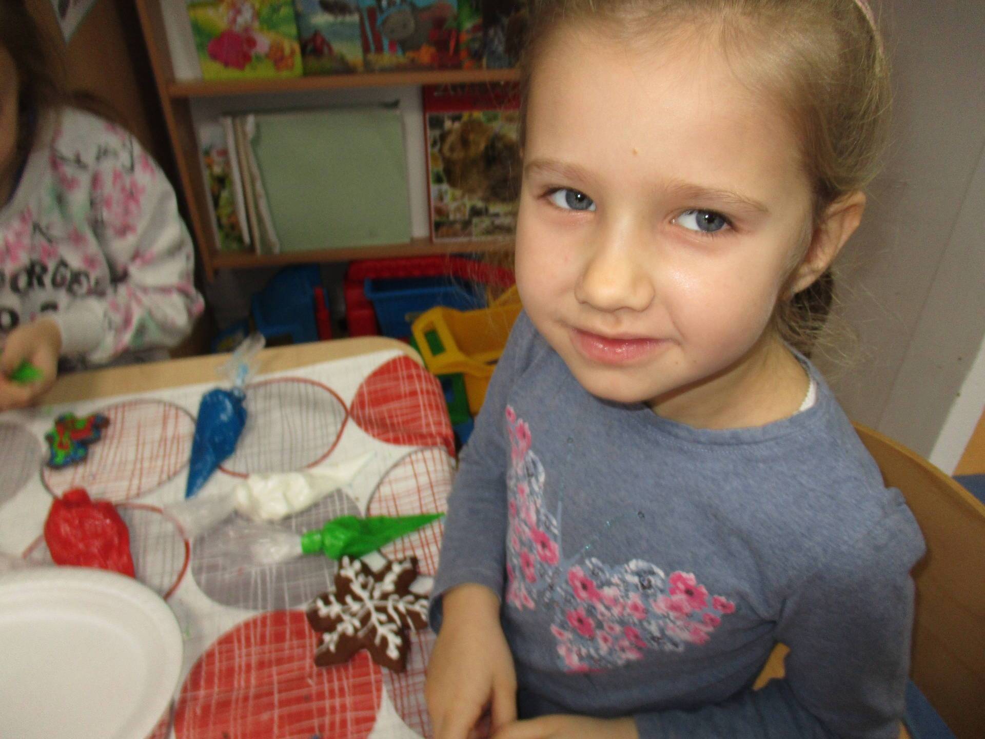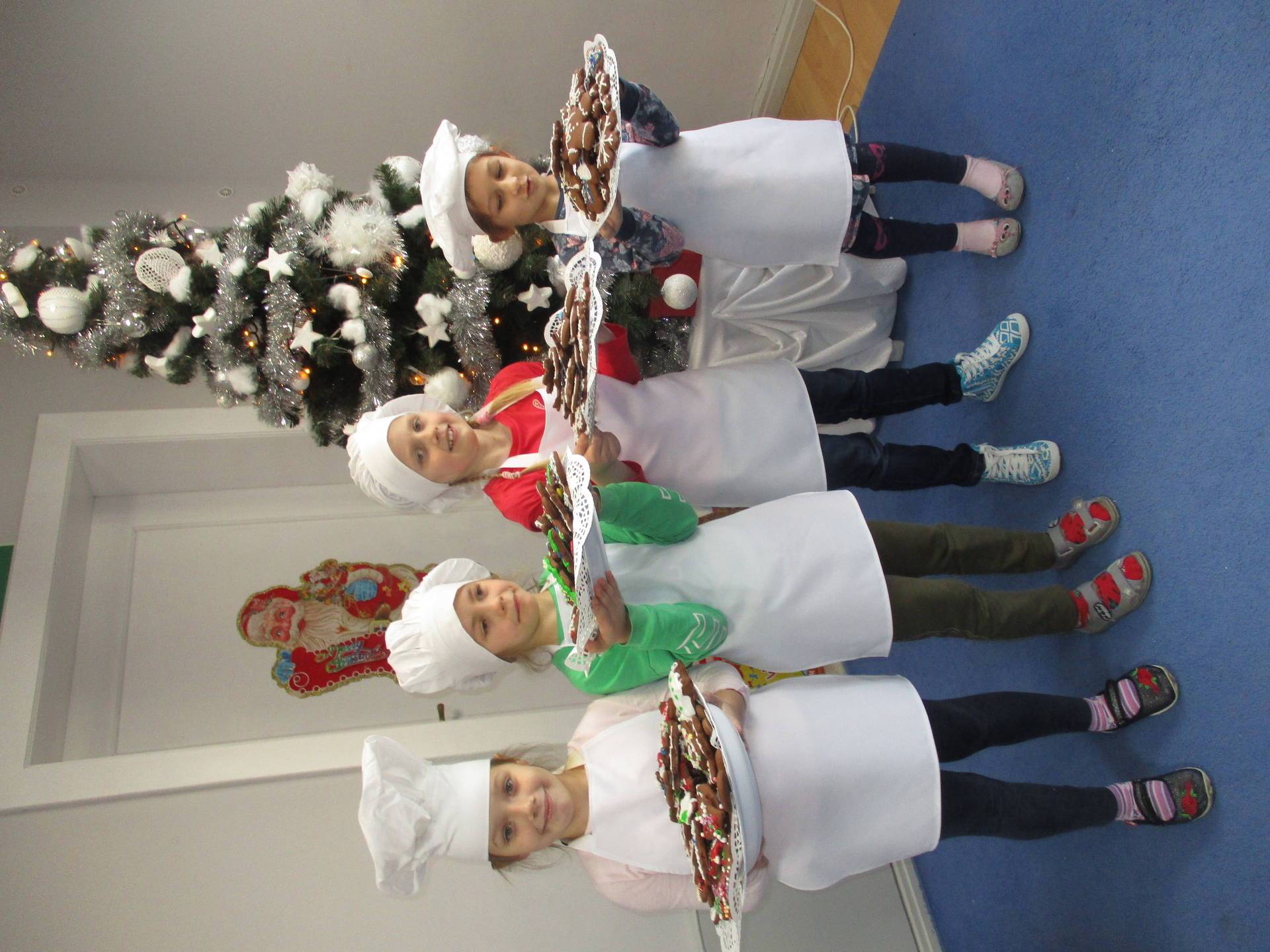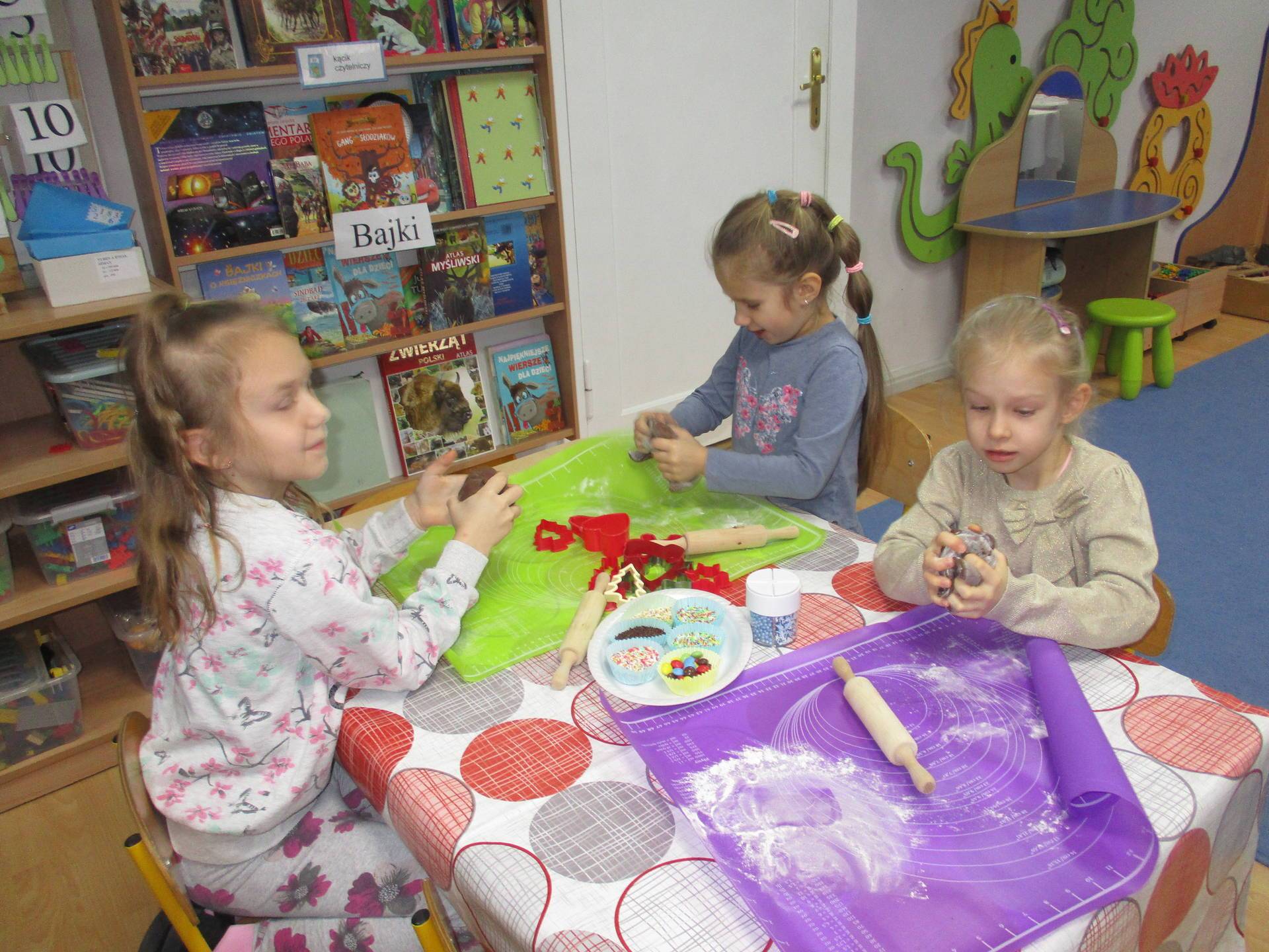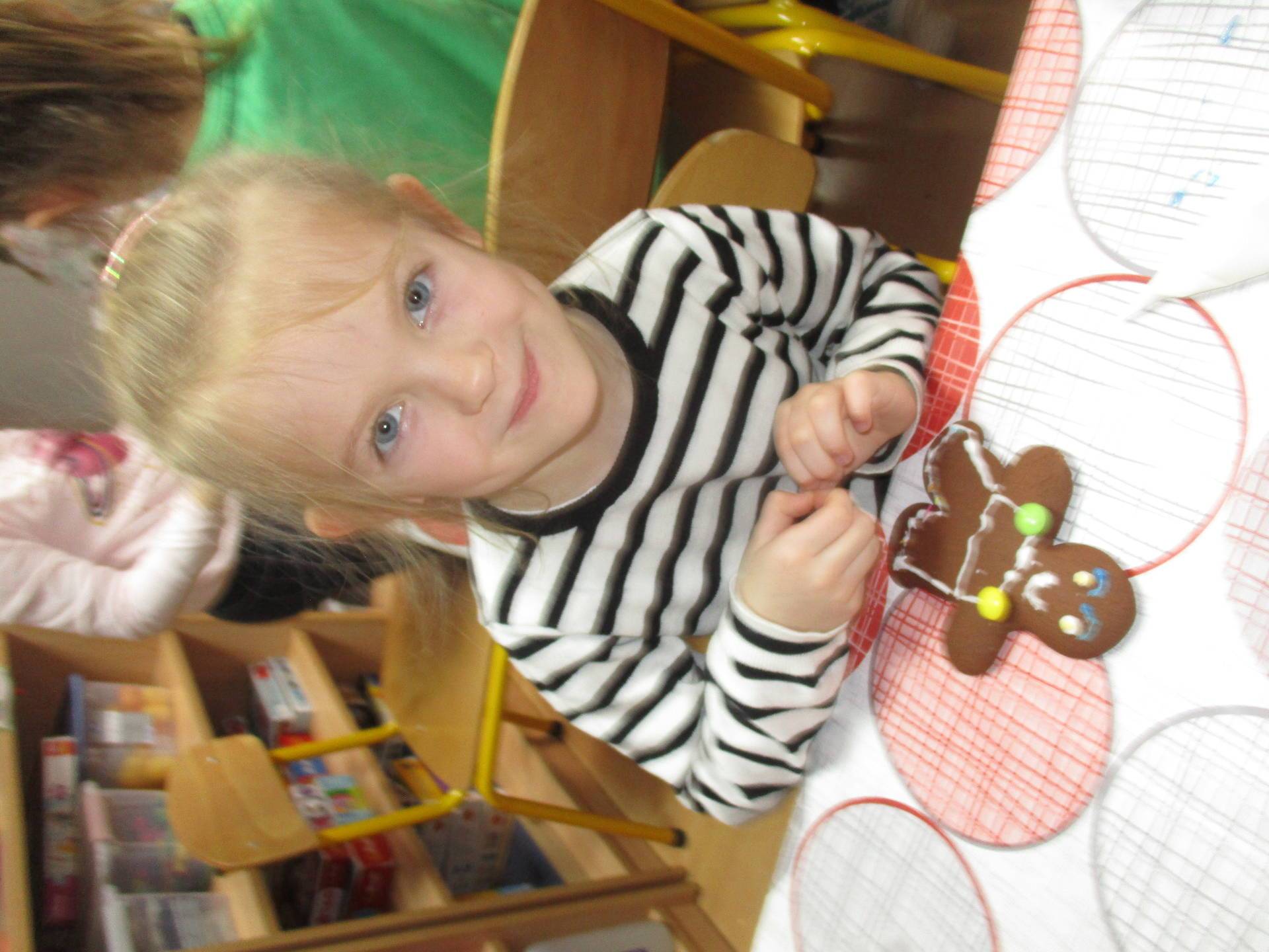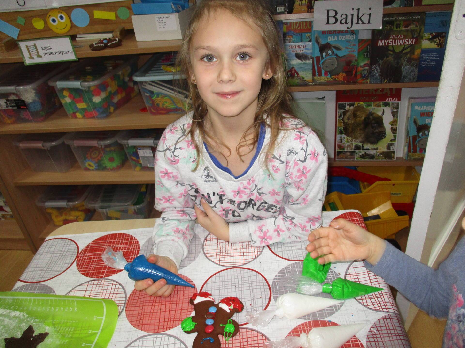 16 grudnia dla 6-latków był bardzo pracowity, bowiem tego dnia piekły one pierniczki. Najpierw odpowiednio się przygotowały dbając o czyste rączki oraz zakładając fartuszki. Poznały też składniki i sposób wykonania ciasta, potrzebne przybory kuchenne a także zasady bezpieczeństwa. Gdy wszystko było gotowe przedszkolaki z ogromnym zapałem i zaangażowaniem zabrały się do pracy – wałkowały ciasto, wykrawały ciasteczka. Efektem naszej pracy były pełne blaszki pierniczków, które zanieśliśmy do kuchni. Tu pod czujnym okiem naszych pań kuchareczek pierniki nabierały koloru piekąc się w piekarniku.