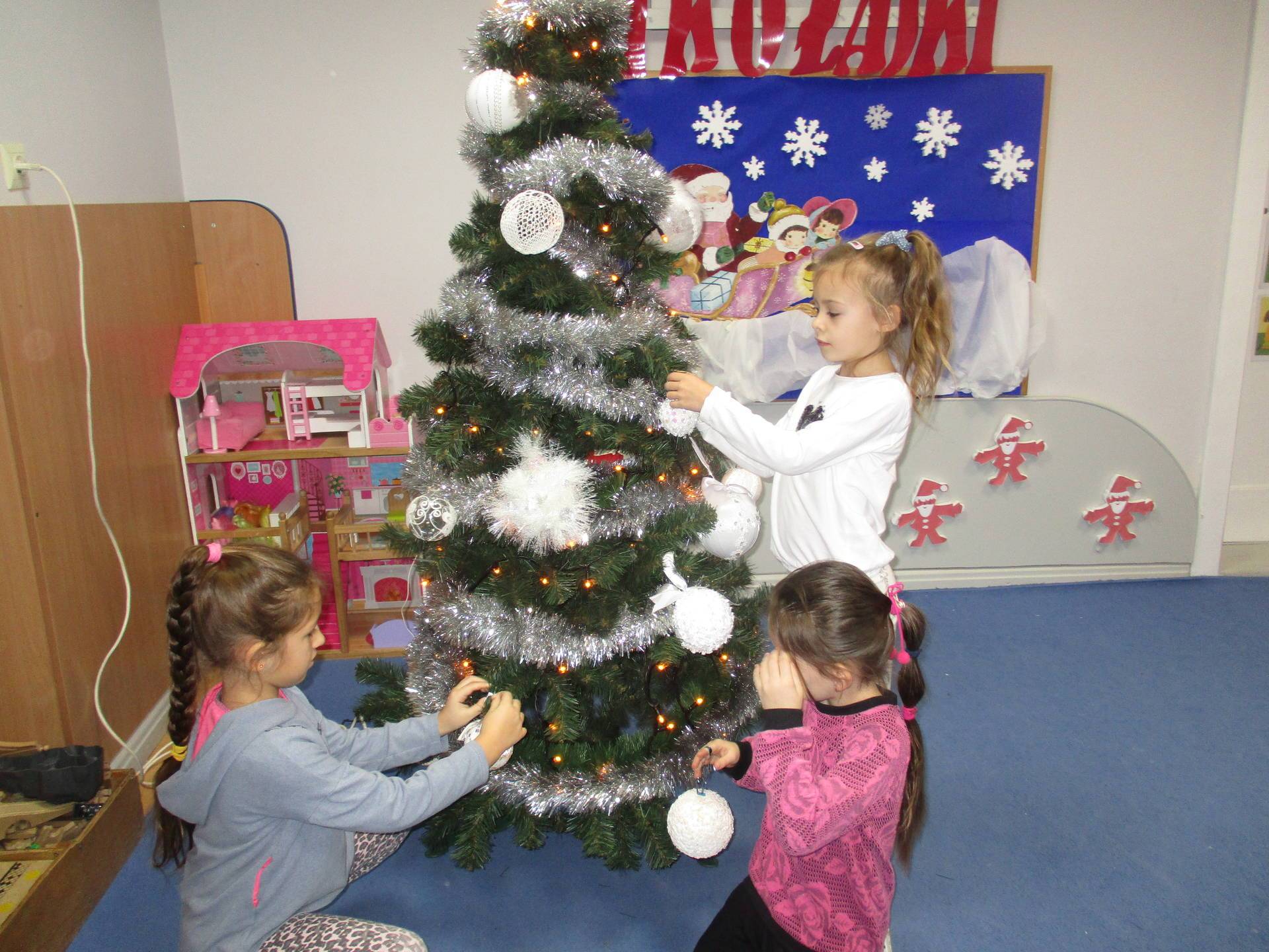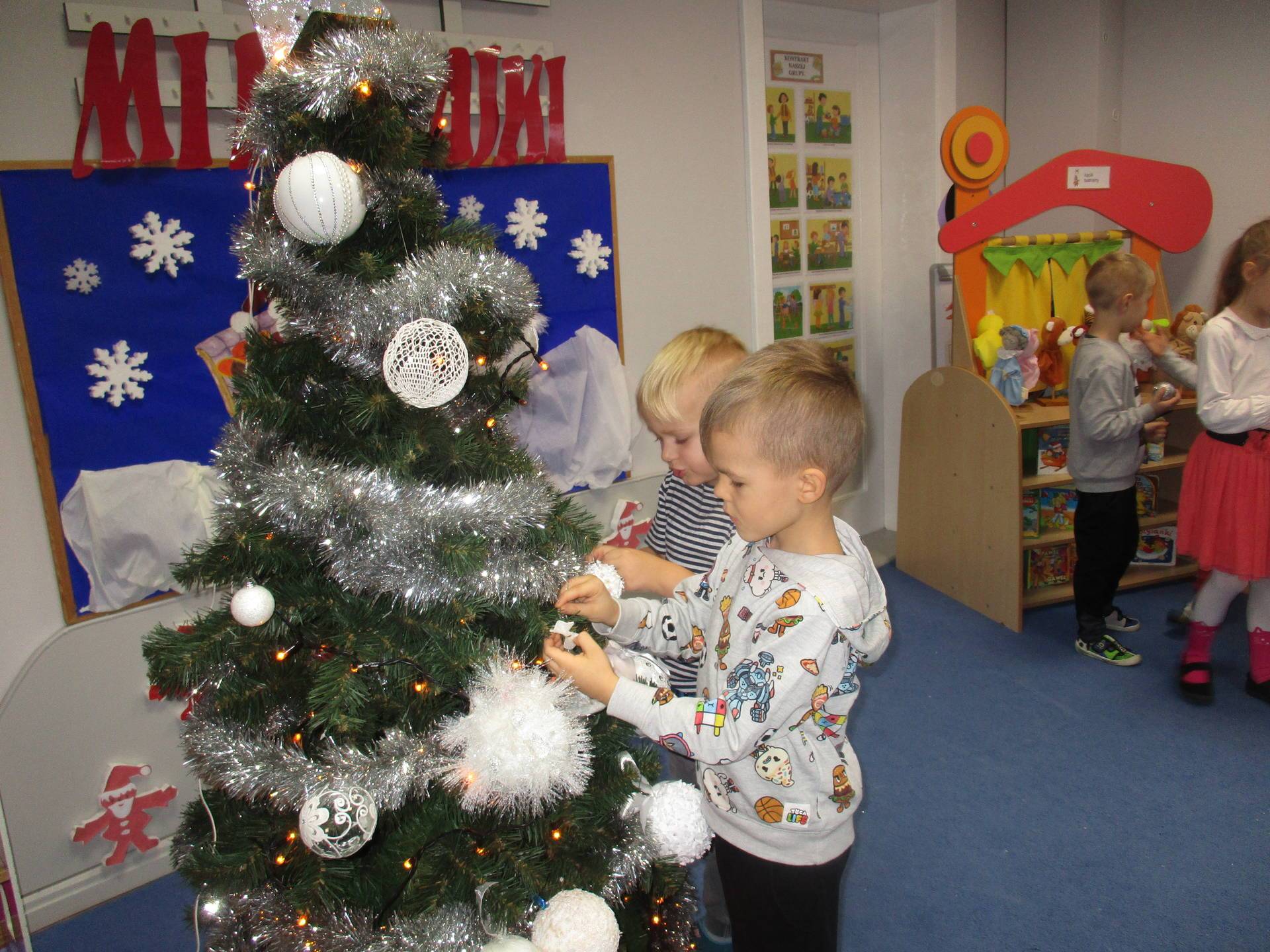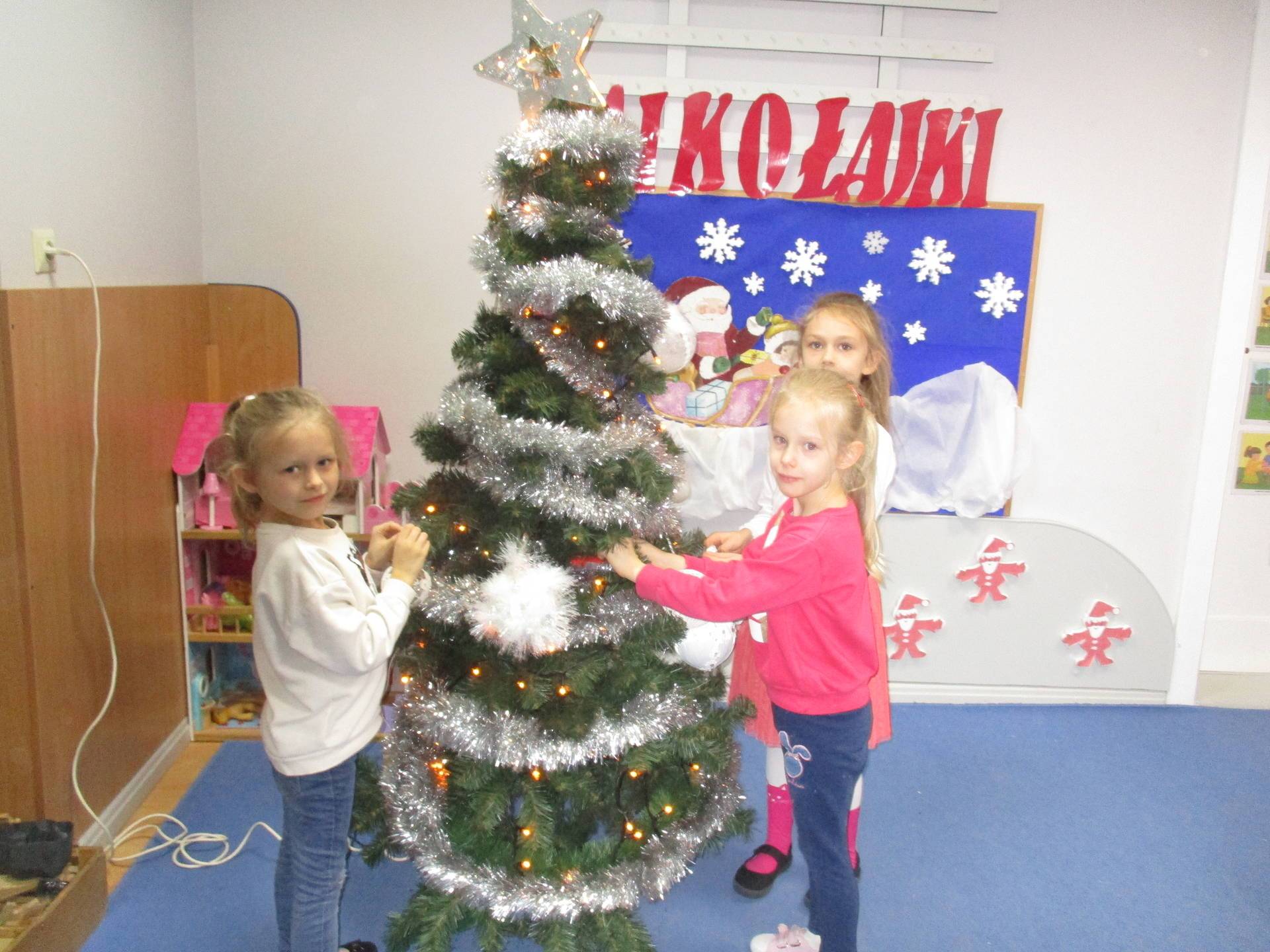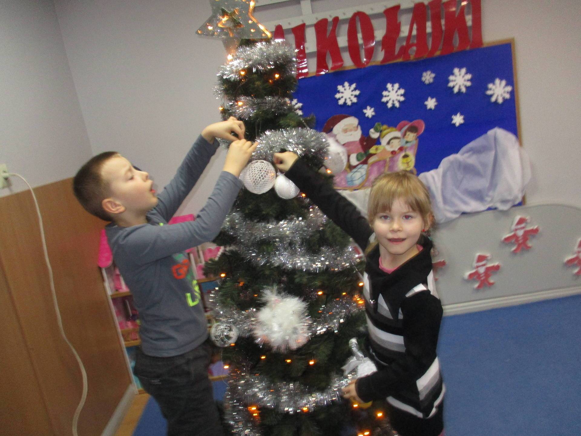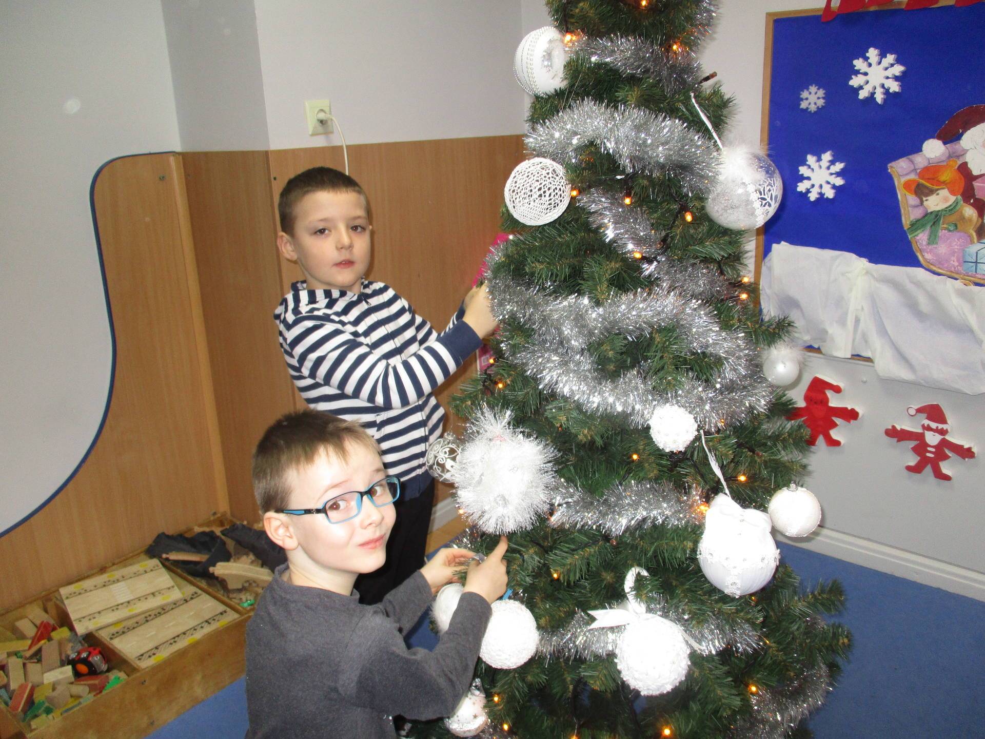 Zbliżają się święta Bożego Narodzenia a ich głównym symbolem jest choinka. I również w przedszkolu ją ubieraliśmy. Bombki, łańcuchy i lampki, każde dziecko chciało pomóc i z radością ozdabiało nasze grupowe drzewko.