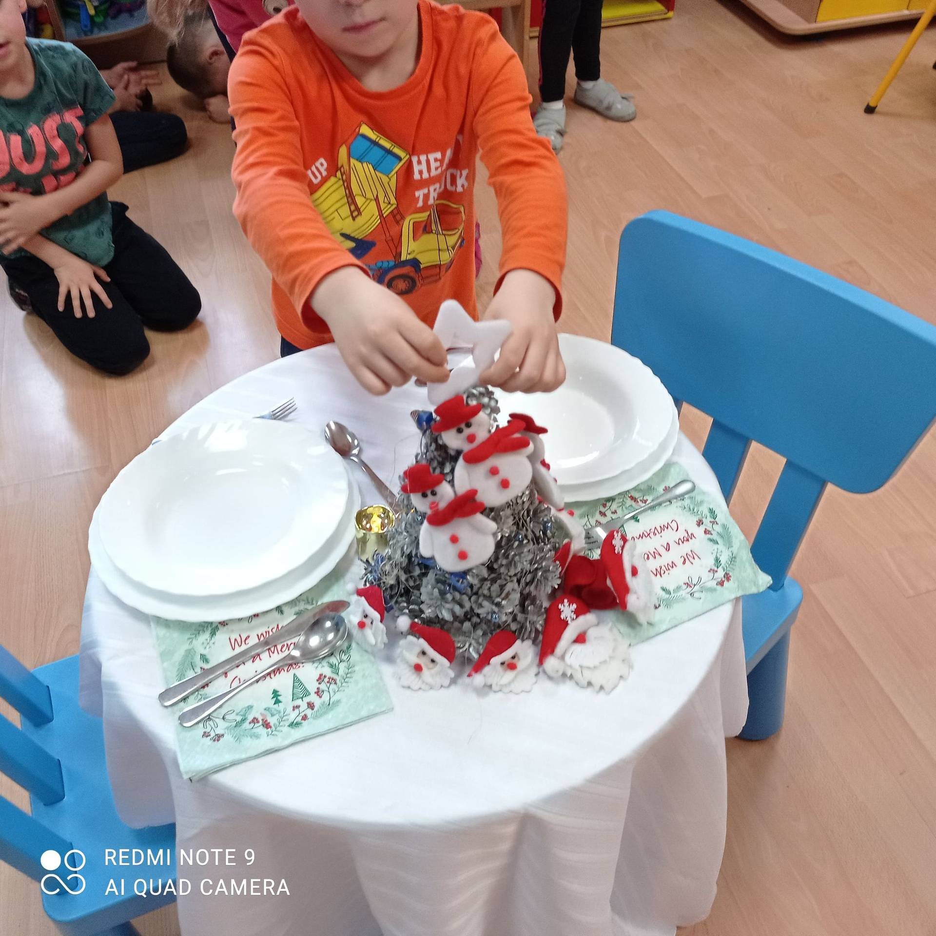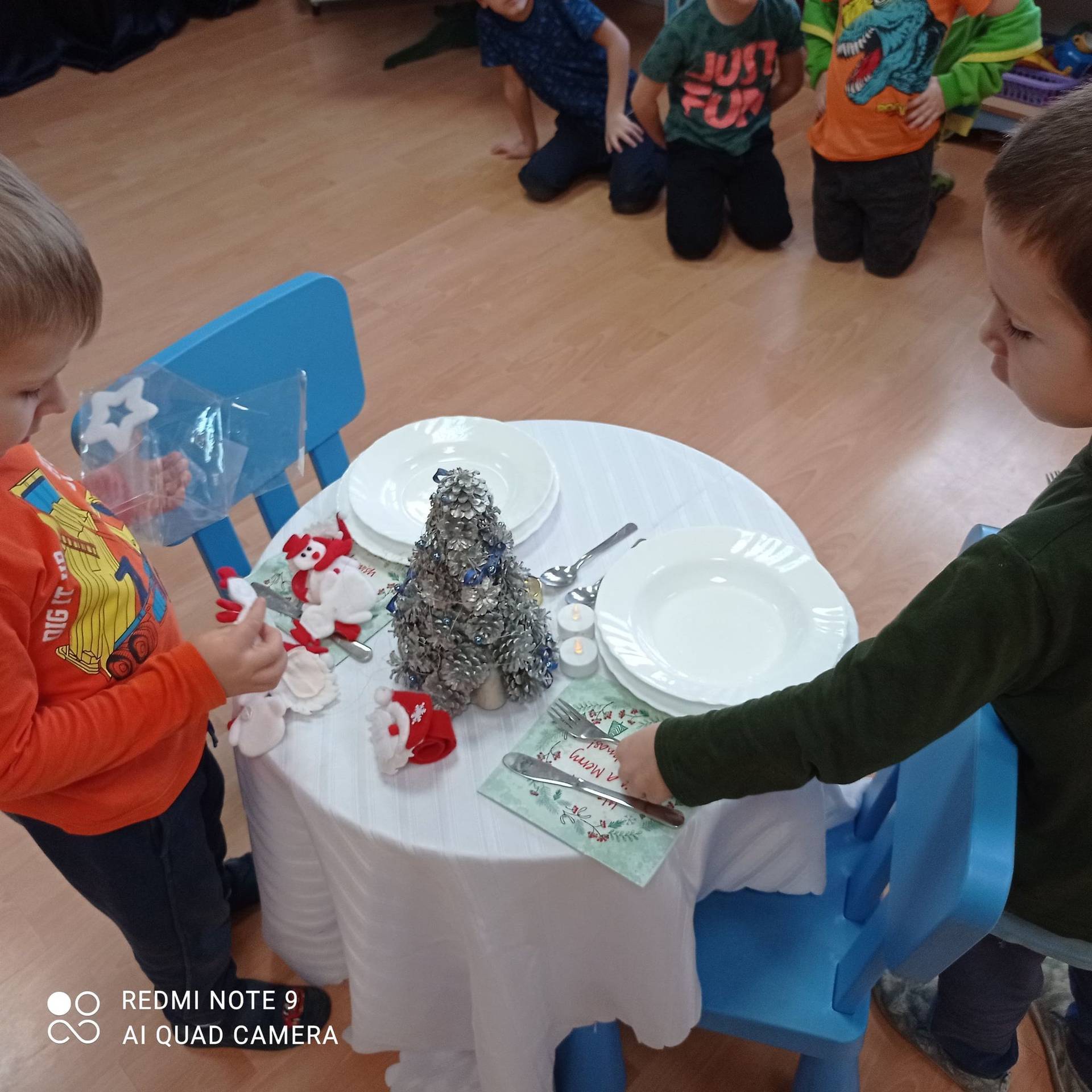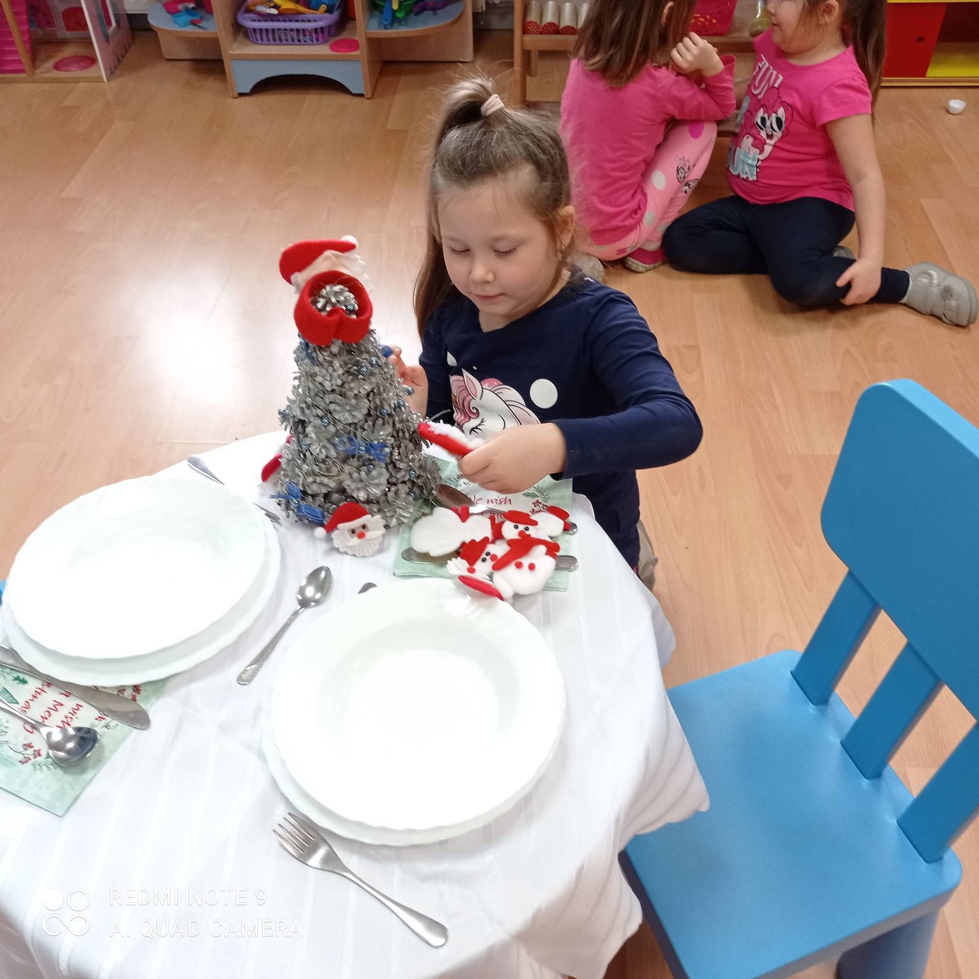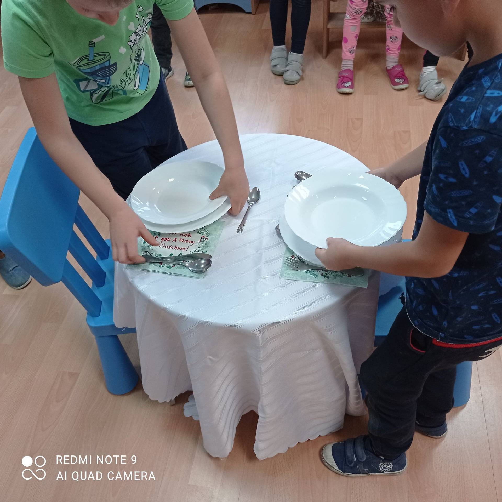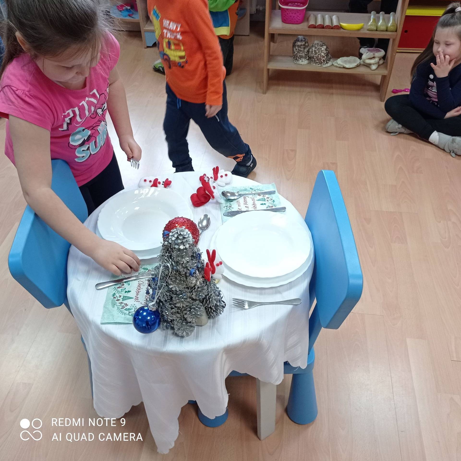 Dzieci uczyły się w jaki sposób prawidłowo ułożyć naczynia i sztućce na stole. Każde dziecko miało okazję samo nakryć do stołu i przekonały się, że to wcale nie jest takie proste. Przedszkolaki chętnie angażują się w zadania, które same muszą wykonać. Daje im to wiele radości i ogromną satysfakcję. Dodatkowo dzieci uczyły się składania serwetki na Wigilijny stół.