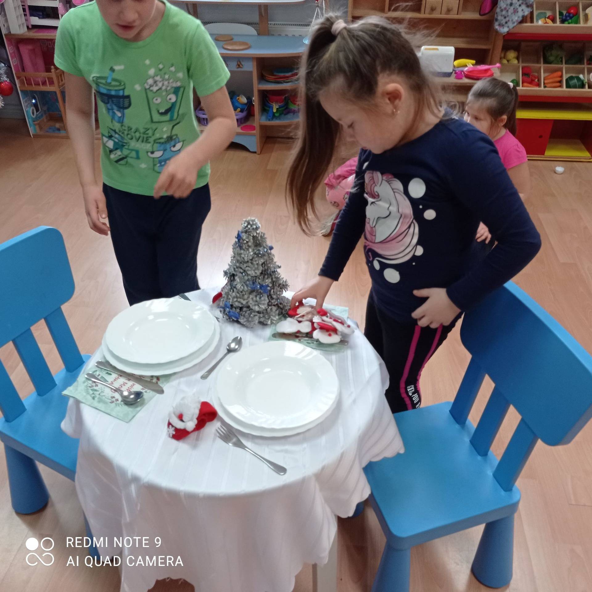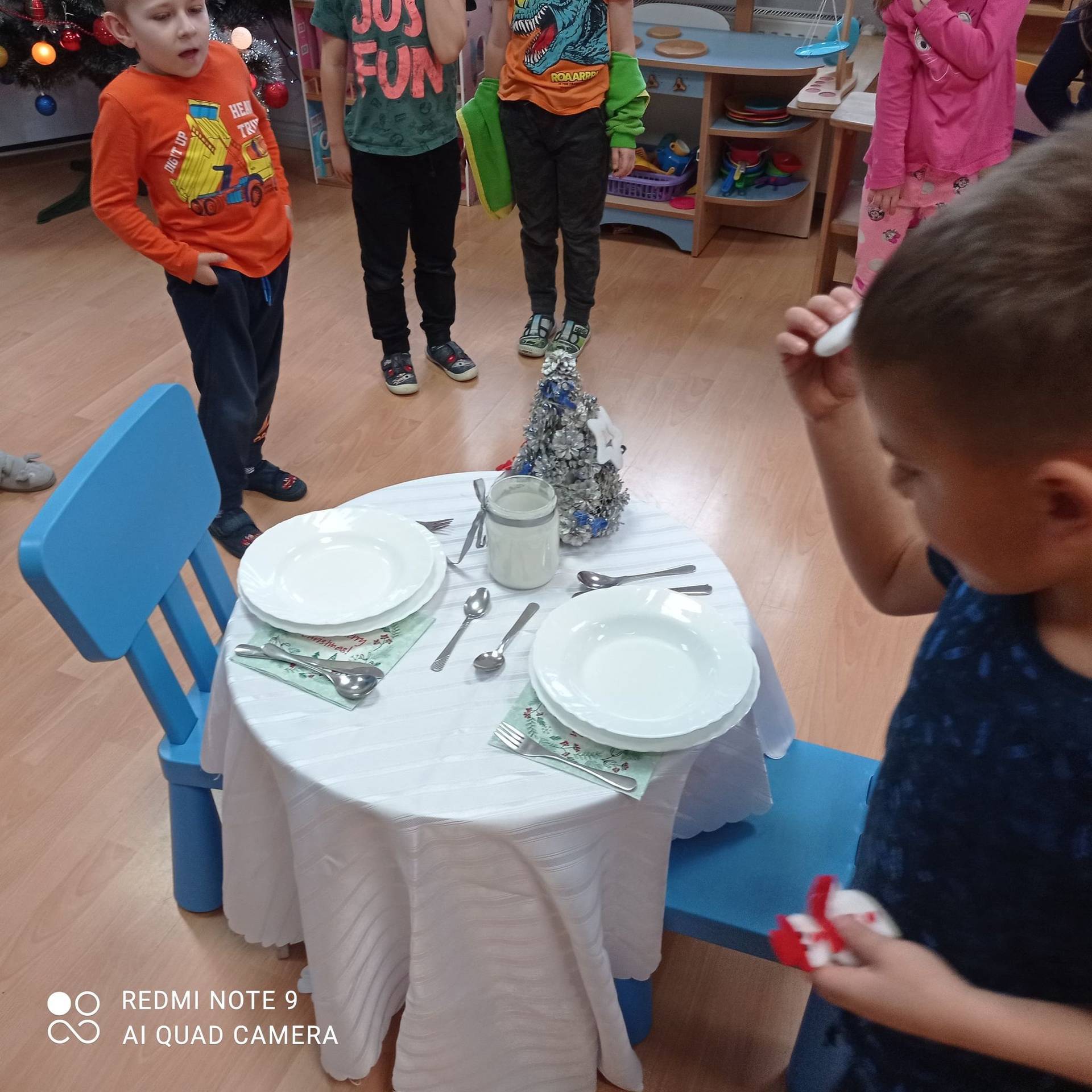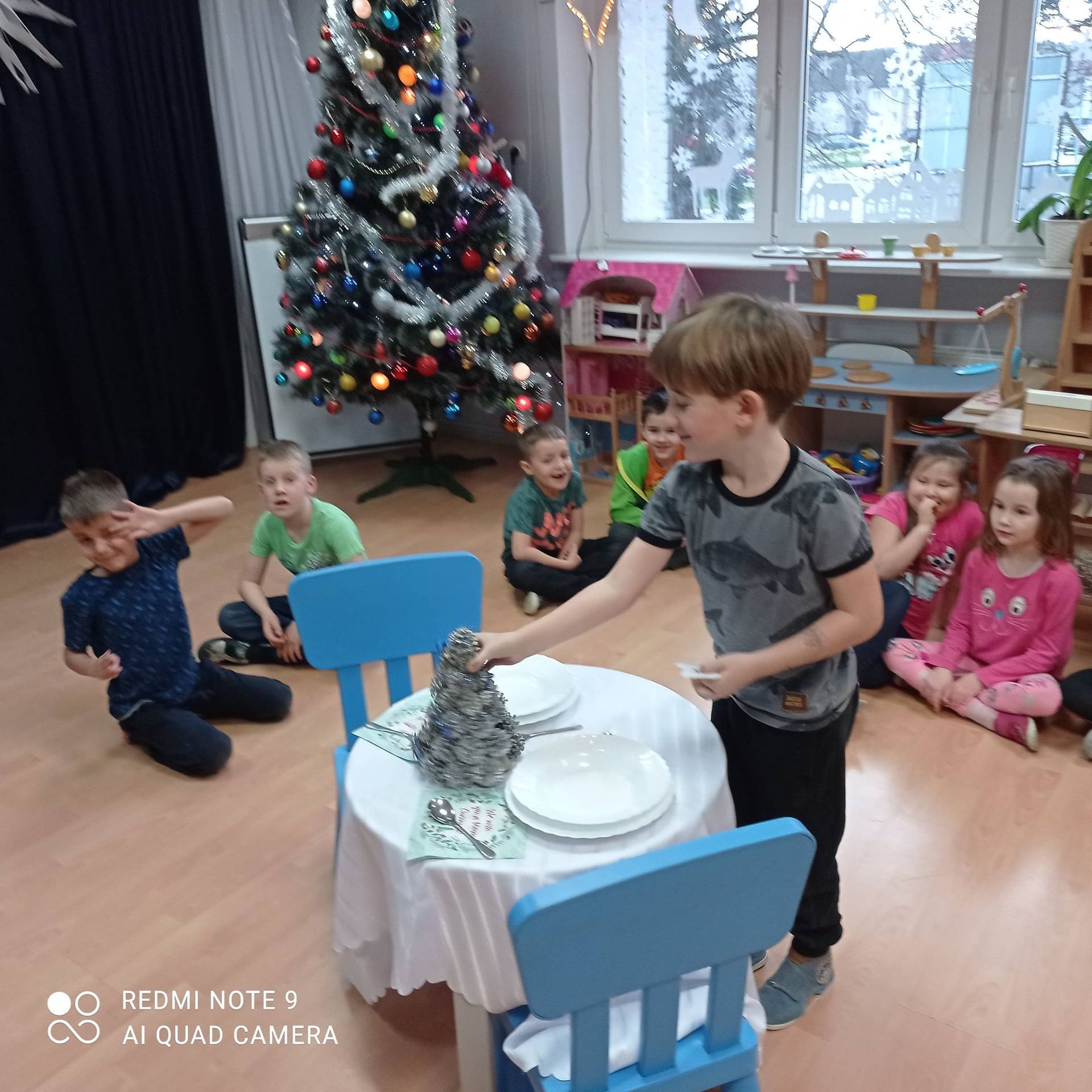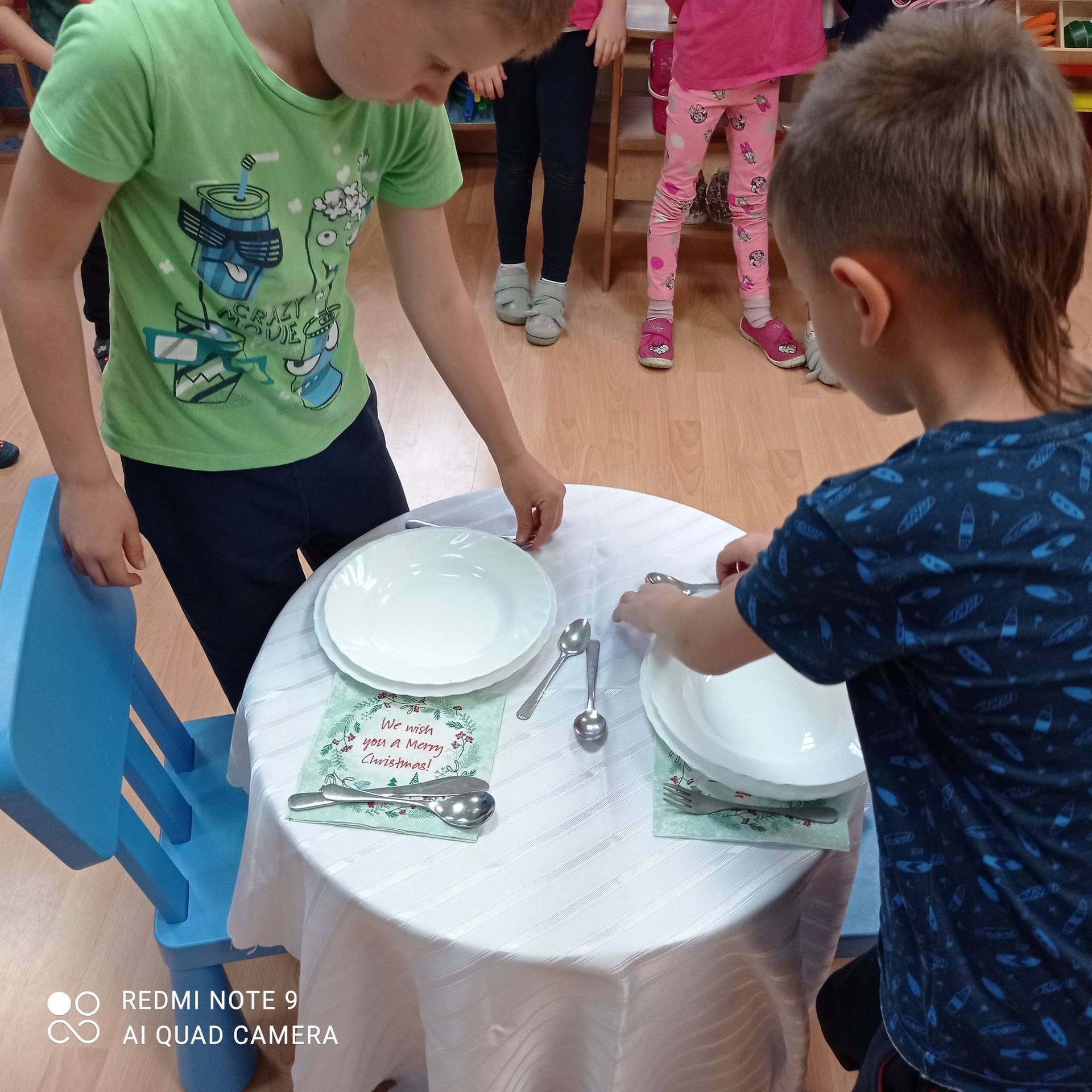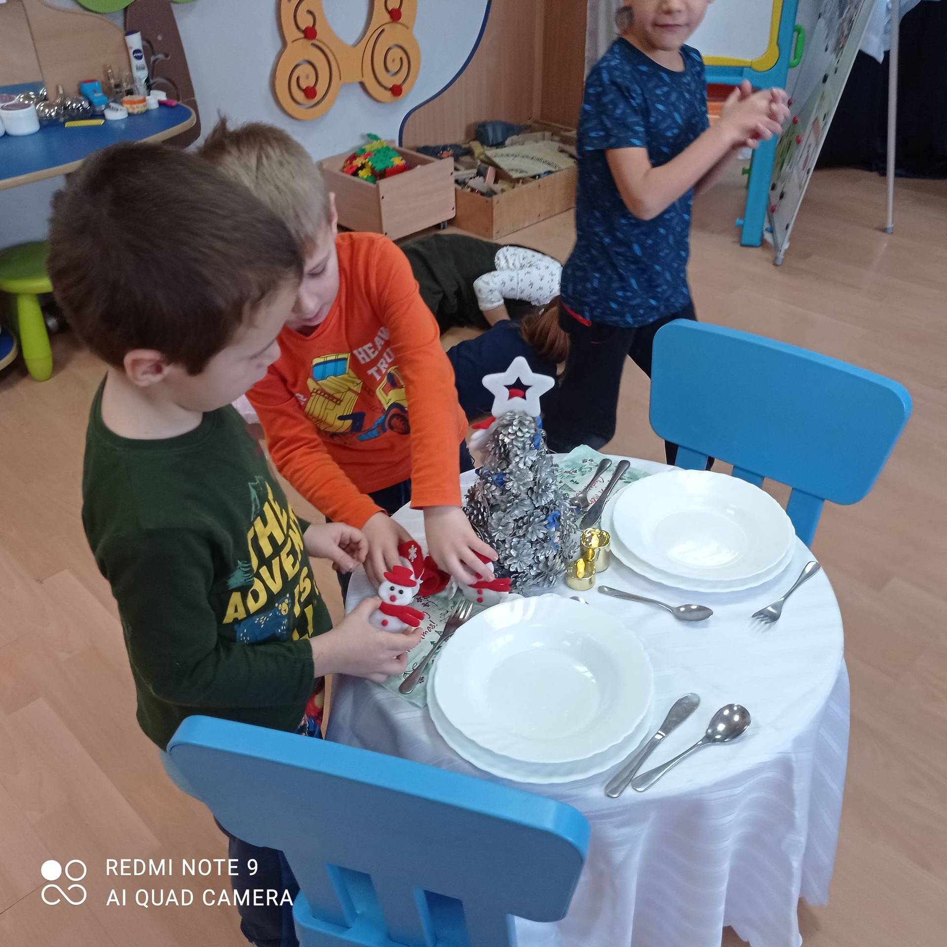 Dzieci uczyły się w jaki sposób prawidłowo ułożyć naczynia i sztućce na stole. Każde dziecko miało okazję samo nakryć do stołu i przekonały się, że to wcale nie jest takie proste. Przedszkolaki chętnie angażują się w zadania, które same muszą wykonać. Daje im to wiele radości i ogromną satysfakcję. Dodatkowo dzieci uczyły się składania serwetki na Wigilijny stół.