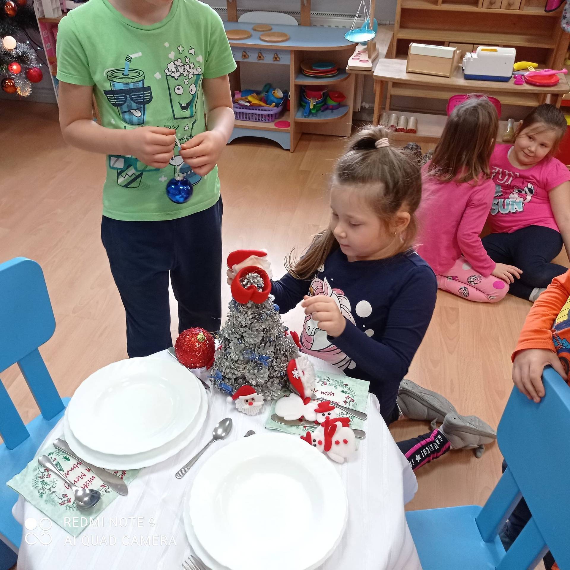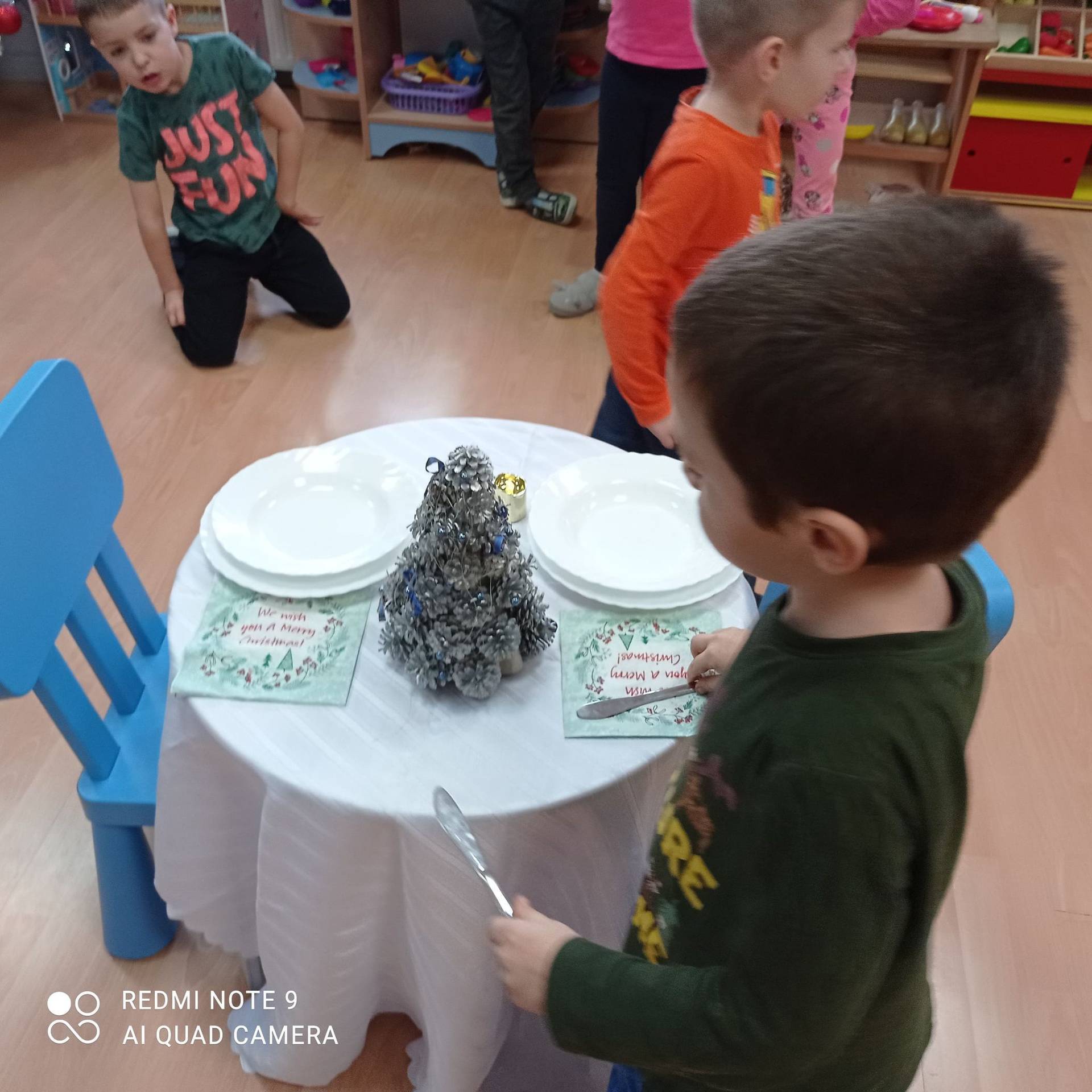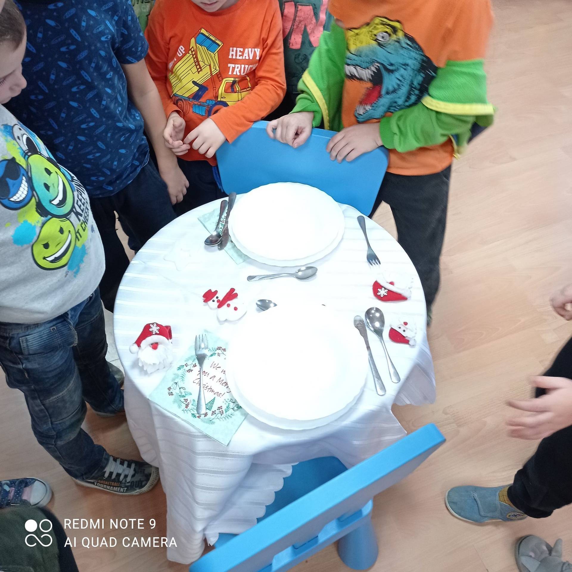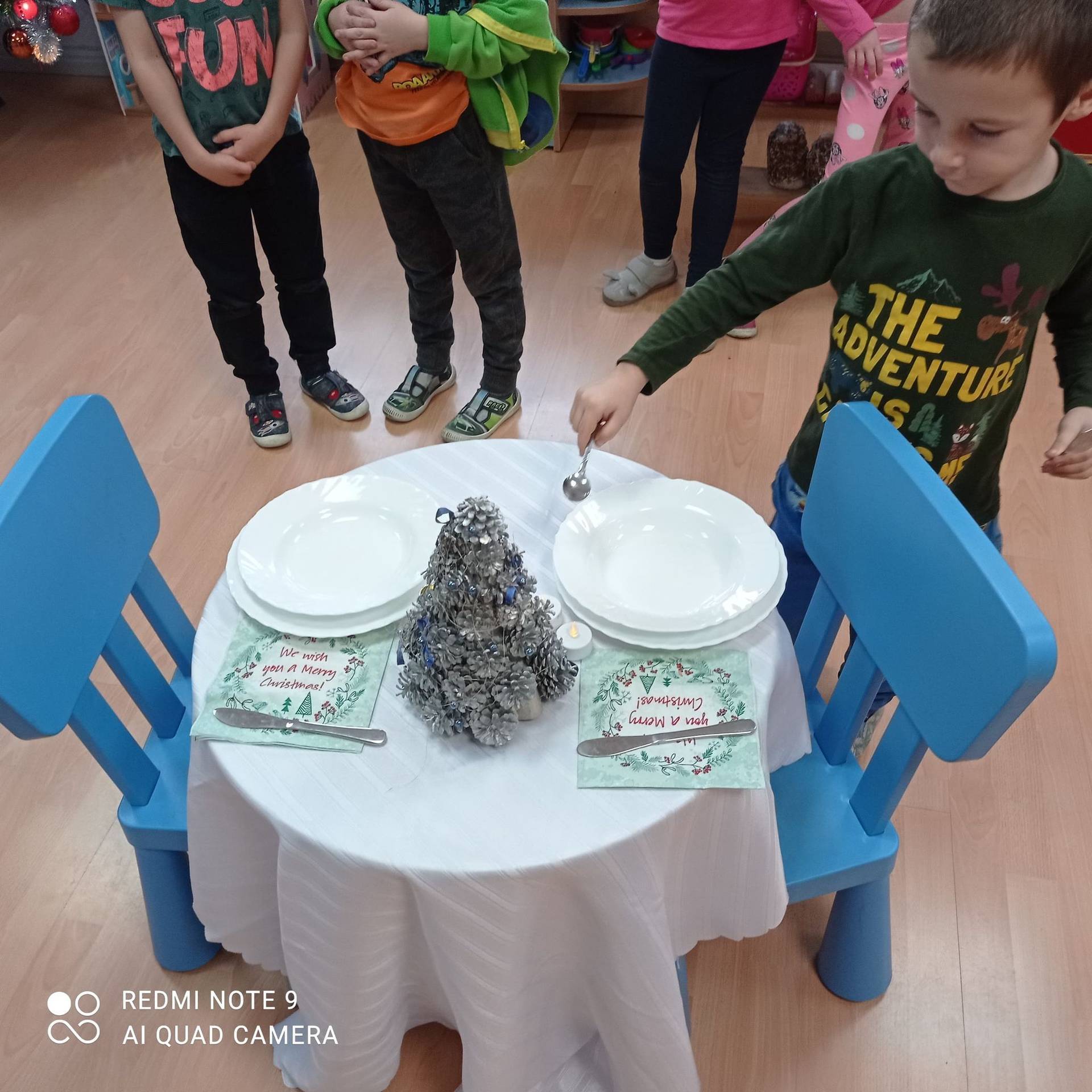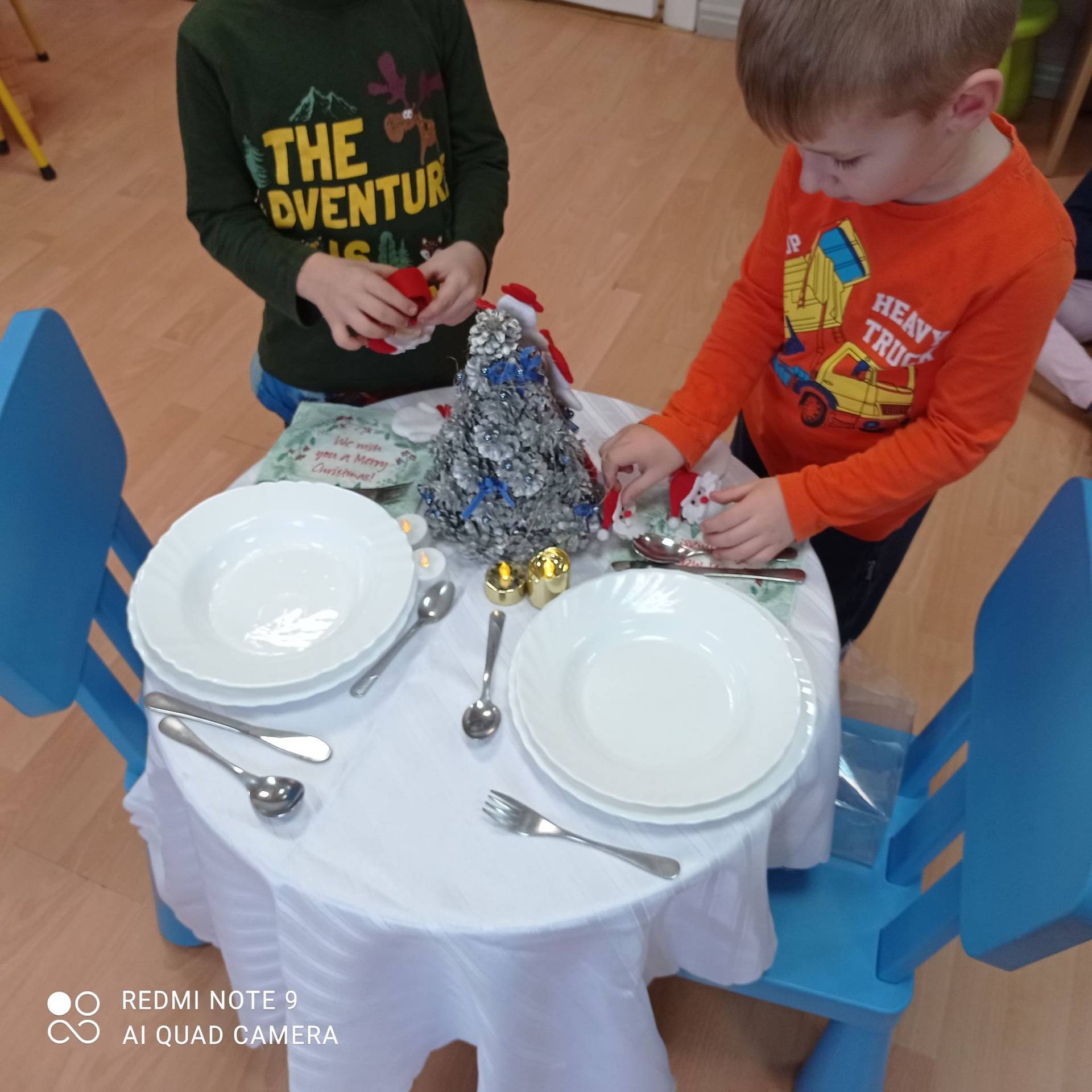 Dzieci uczyły się w jaki sposób prawidłowo ułożyć naczynia i sztućce na stole. Każde dziecko miało okazję samo nakryć do stołu i przekonały się, że to wcale nie jest takie proste. Przedszkolaki chętnie angażują się w zadania, które same muszą wykonać. Daje im to wiele radości i ogromną satysfakcję. Dodatkowo dzieci uczyły się składania serwetki na Wigilijny stół.