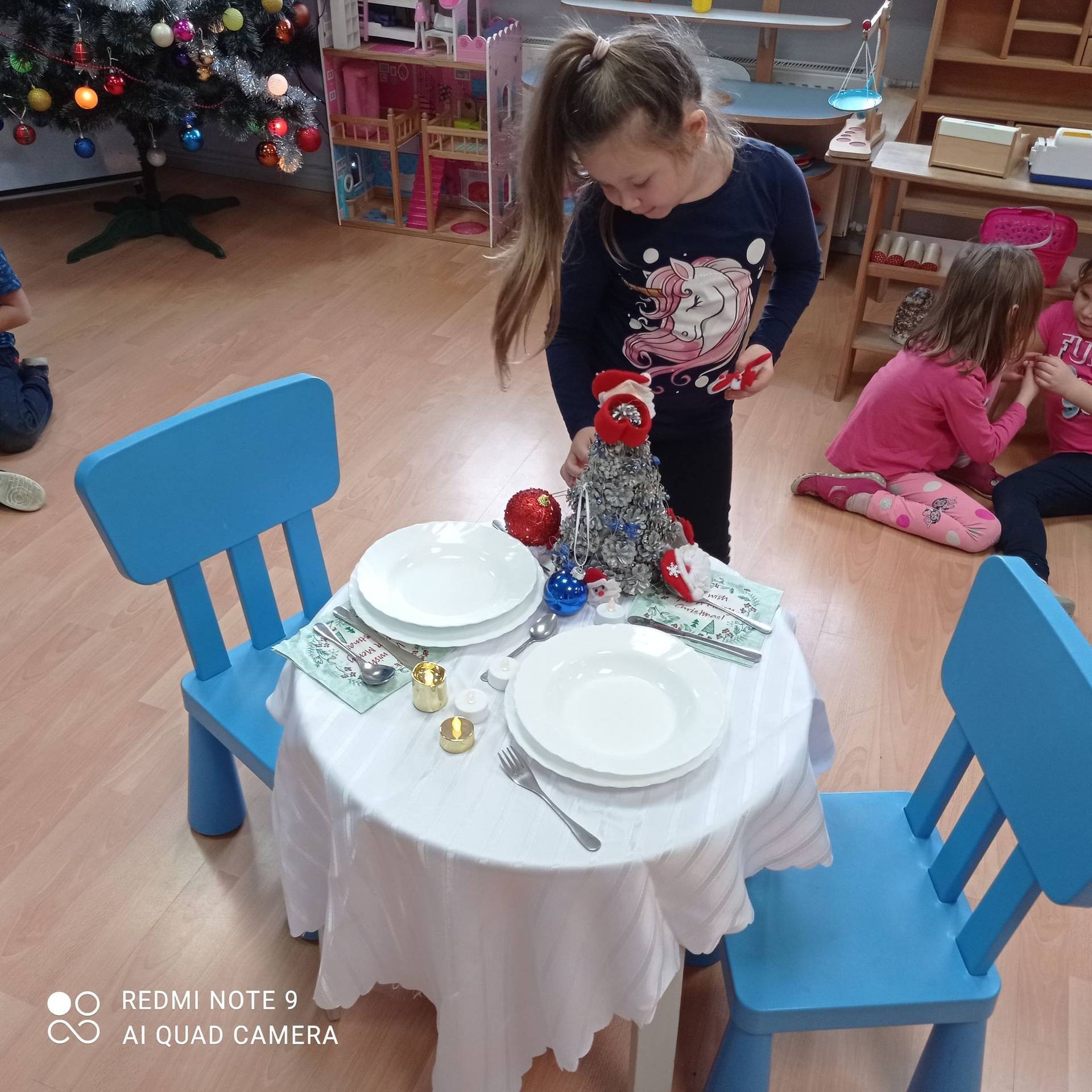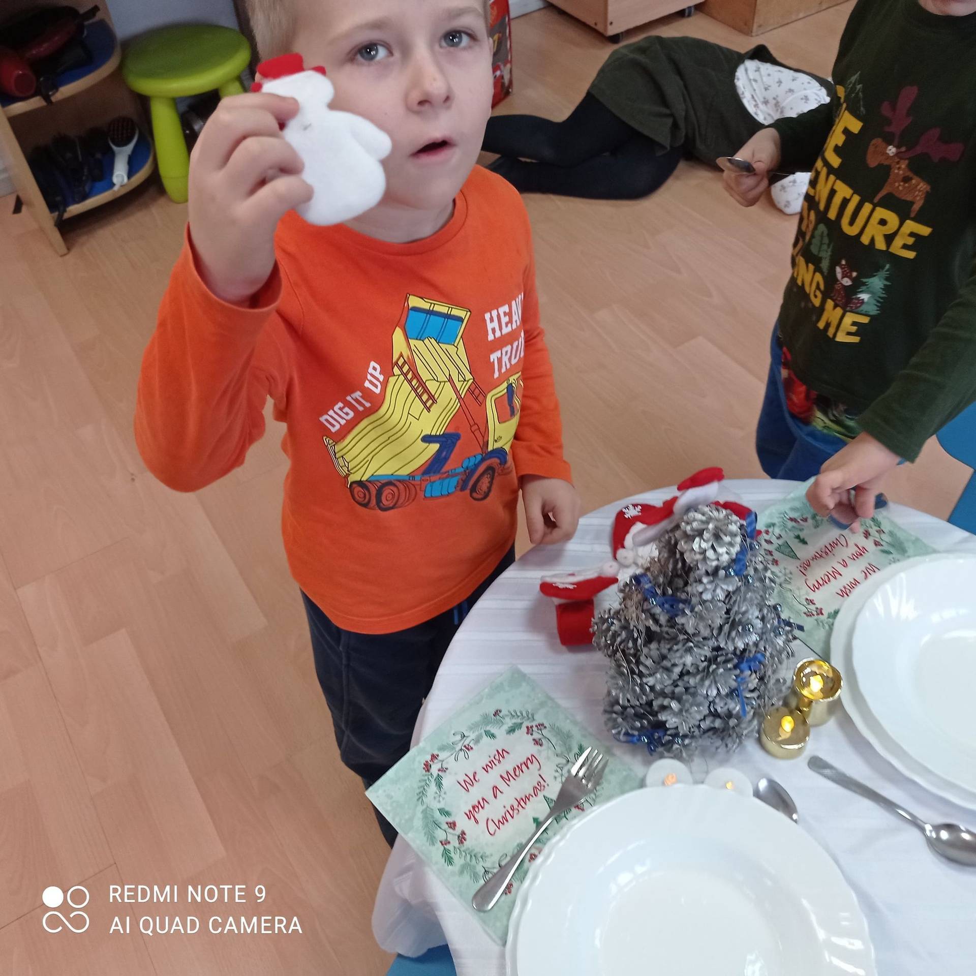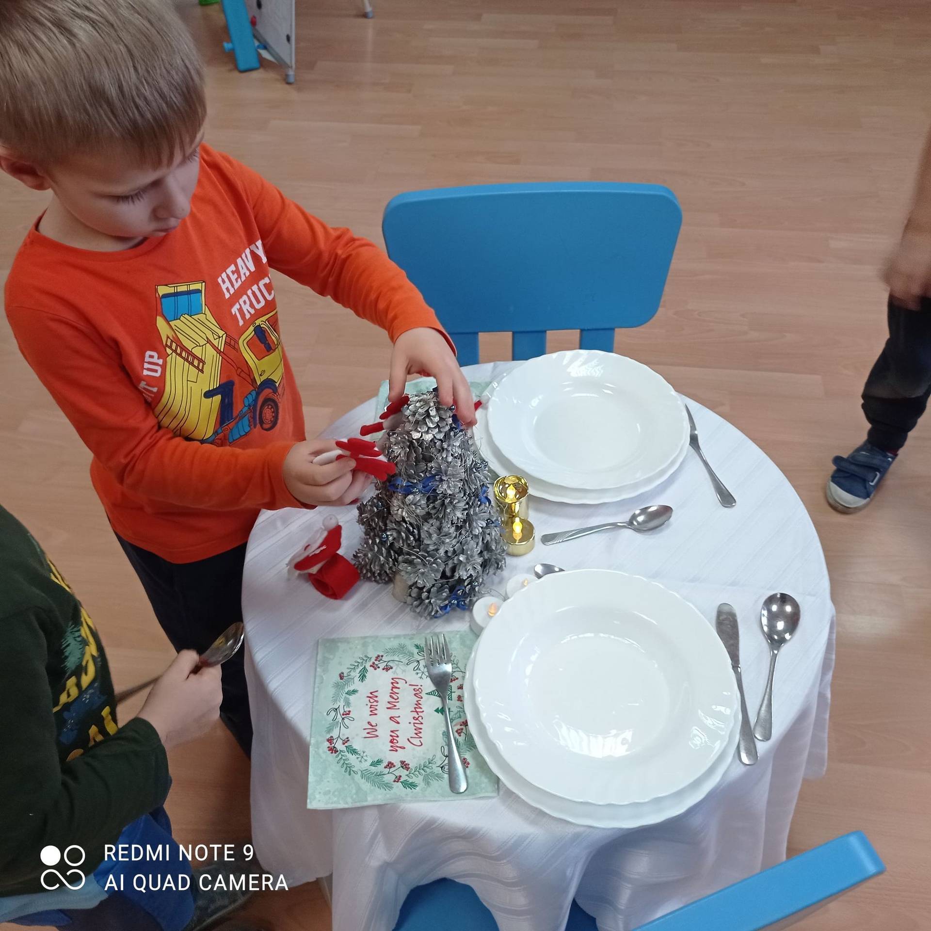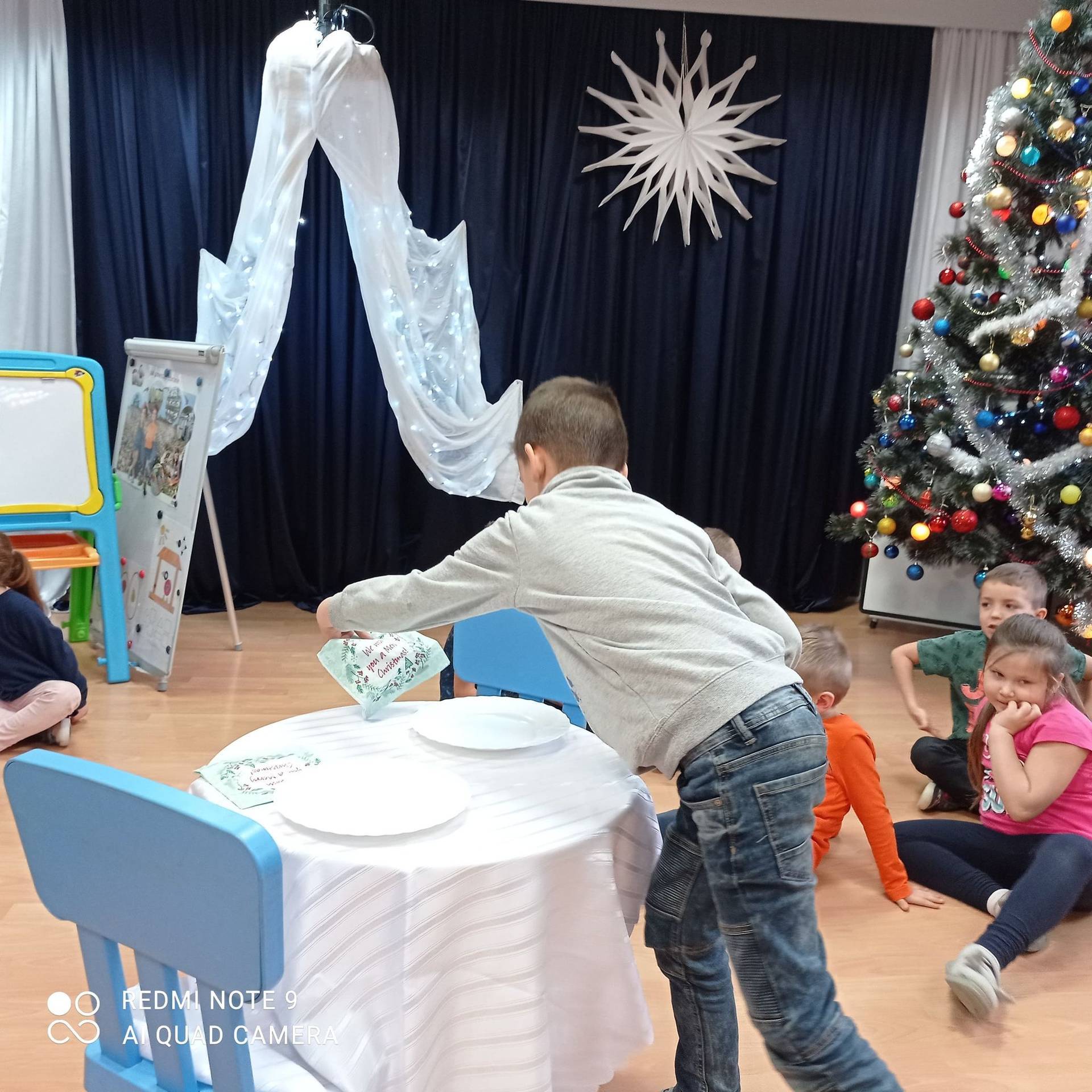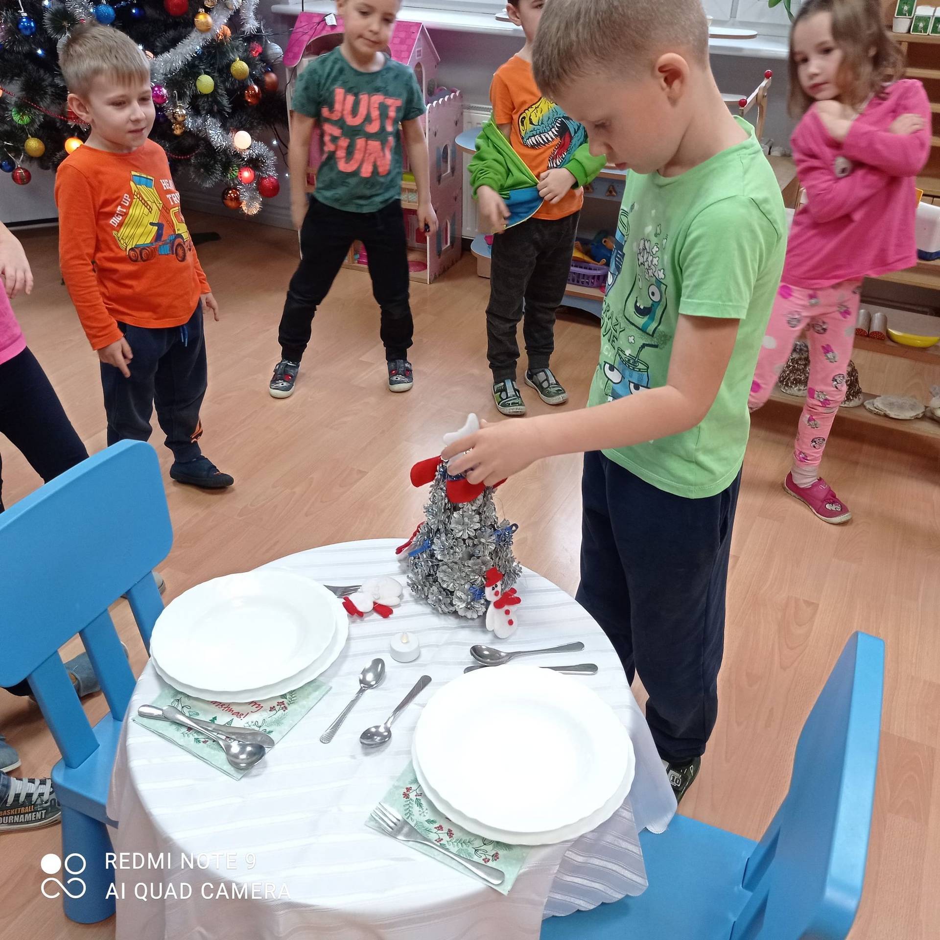 Dzieci uczyły się w jaki sposób prawidłowo ułożyć naczynia i sztućce na stole. Każde dziecko miało okazję samo nakryć do stołu i przekonały się, że to wcale nie jest takie proste. Przedszkolaki chętnie angażują się w zadania, które same muszą wykonać. Daje im to wiele radości i ogromną satysfakcję. Dodatkowo dzieci uczyły się składania serwetki na Wigilijny stół.
