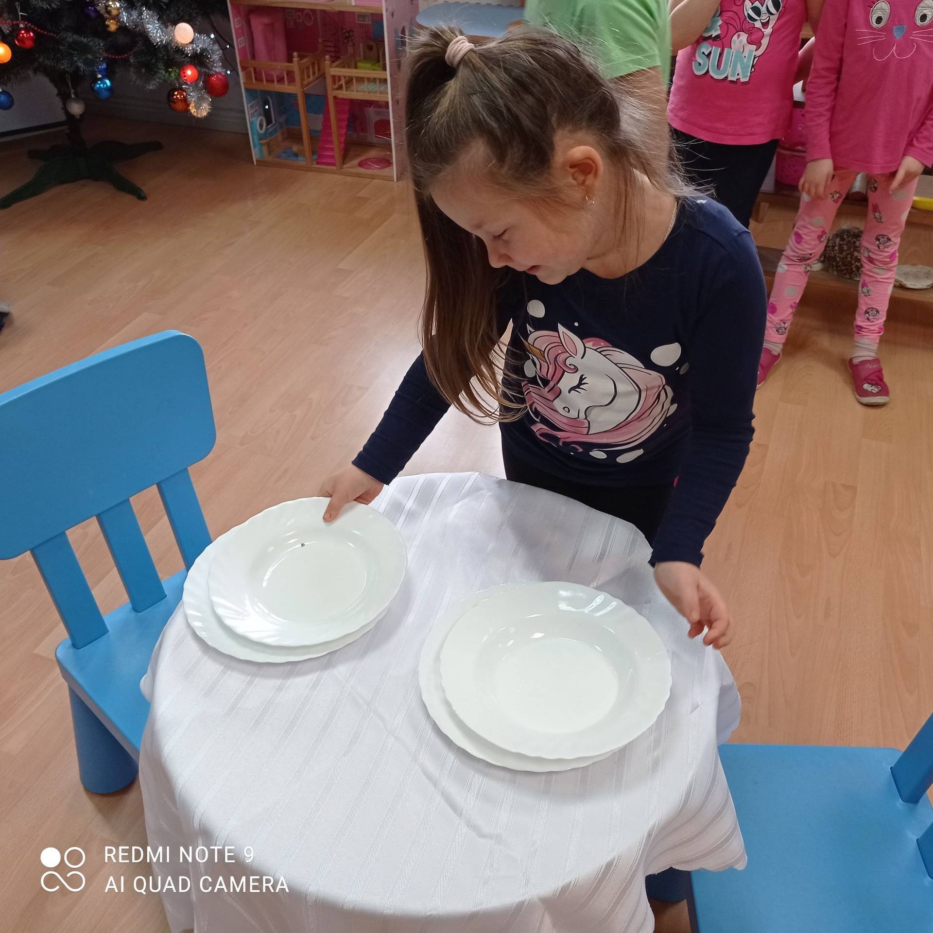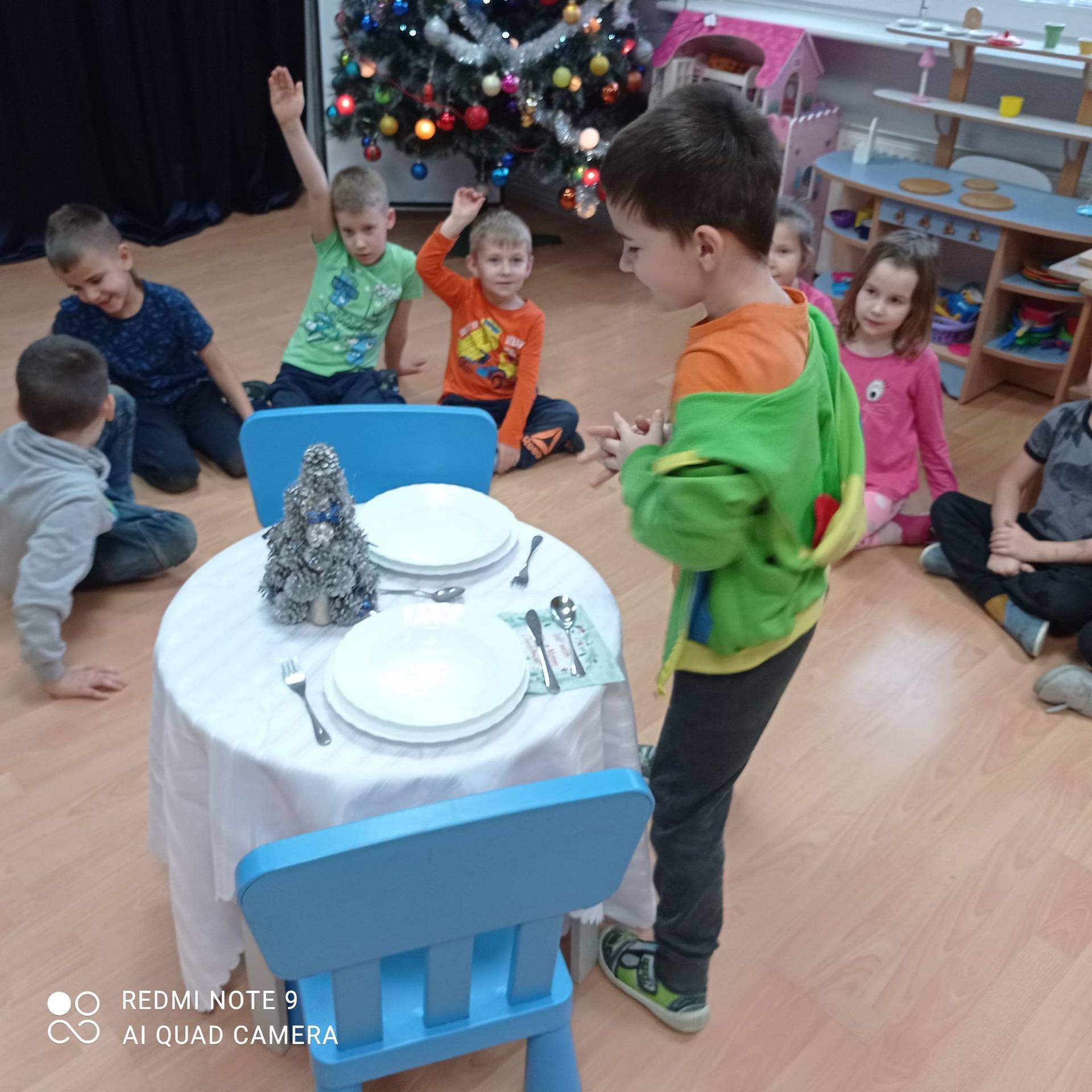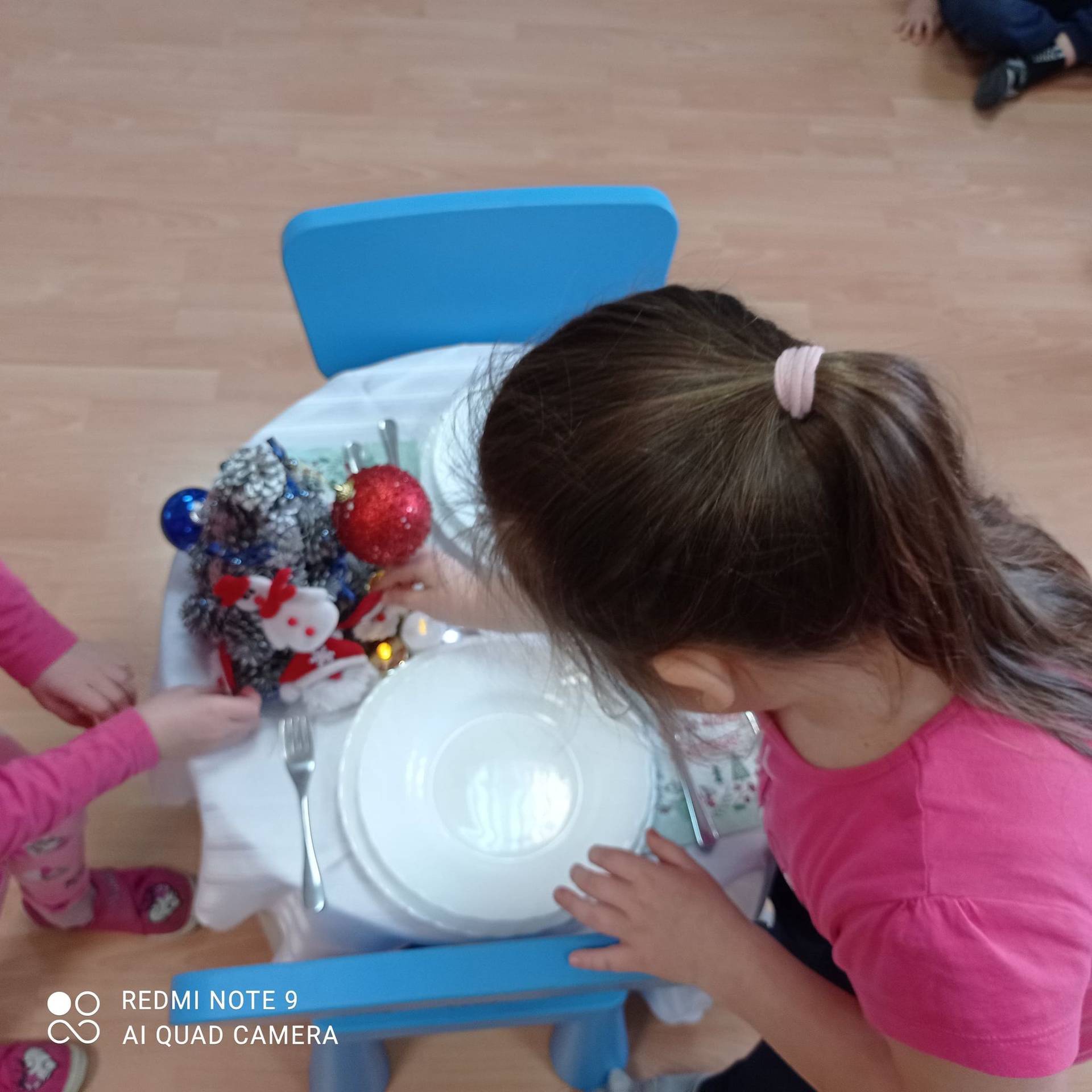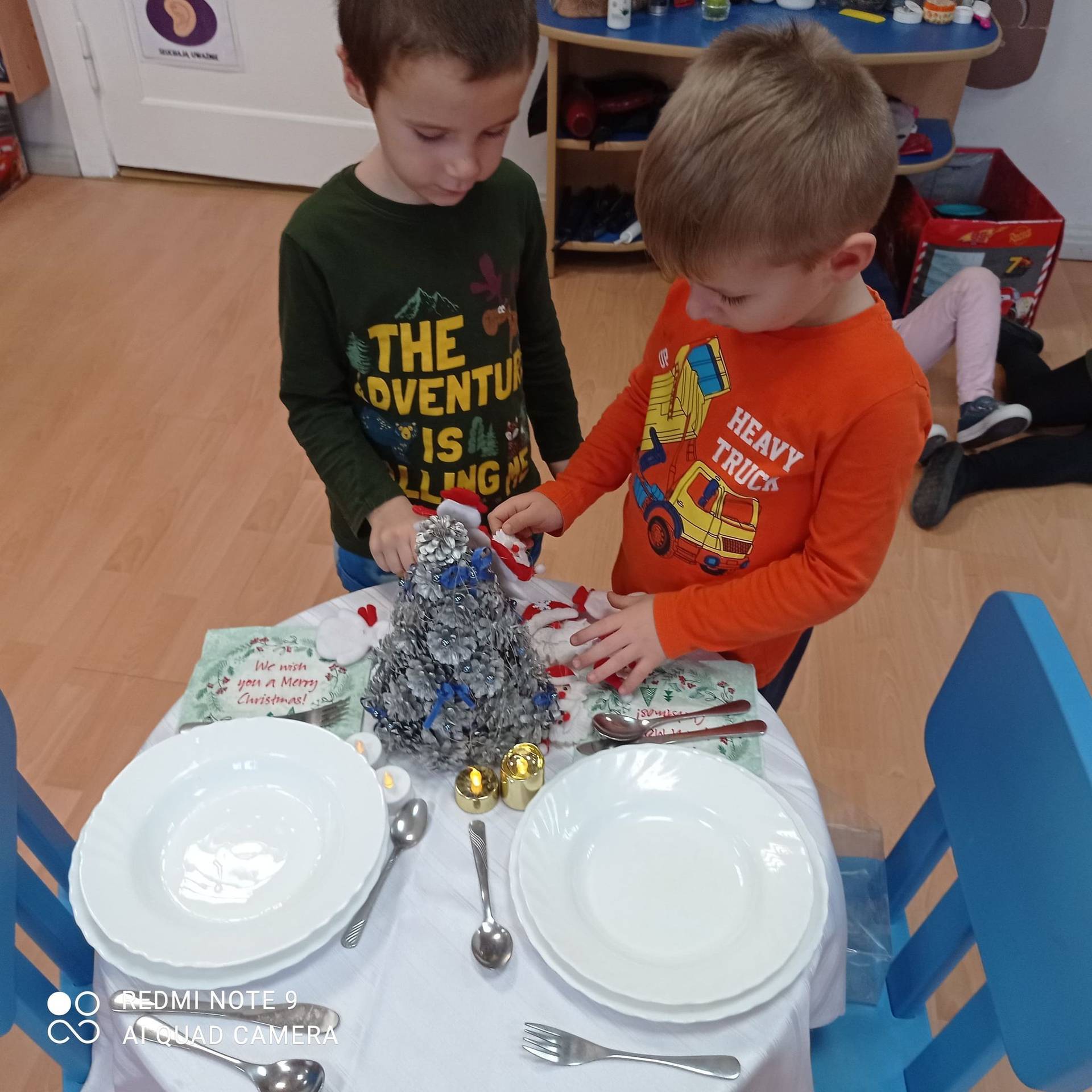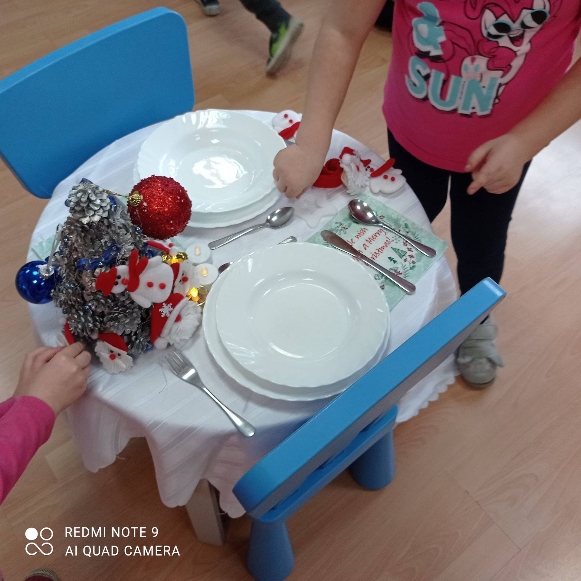 Dzieci uczyły się w jaki sposób prawidłowo ułożyć naczynia i sztućce na stole. Każde dziecko miało okazję samo nakryć do stołu i przekonały się, że to wcale nie jest takie proste. Przedszkolaki chętnie angażują się w zadania, które same muszą wykonać. Daje im to wiele radości i ogromną satysfakcję. Dodatkowo dzieci uczyły się składania serwetki na Wigilijny stół.