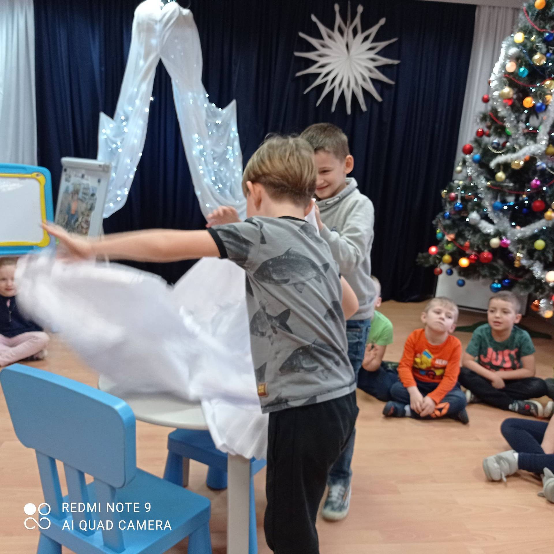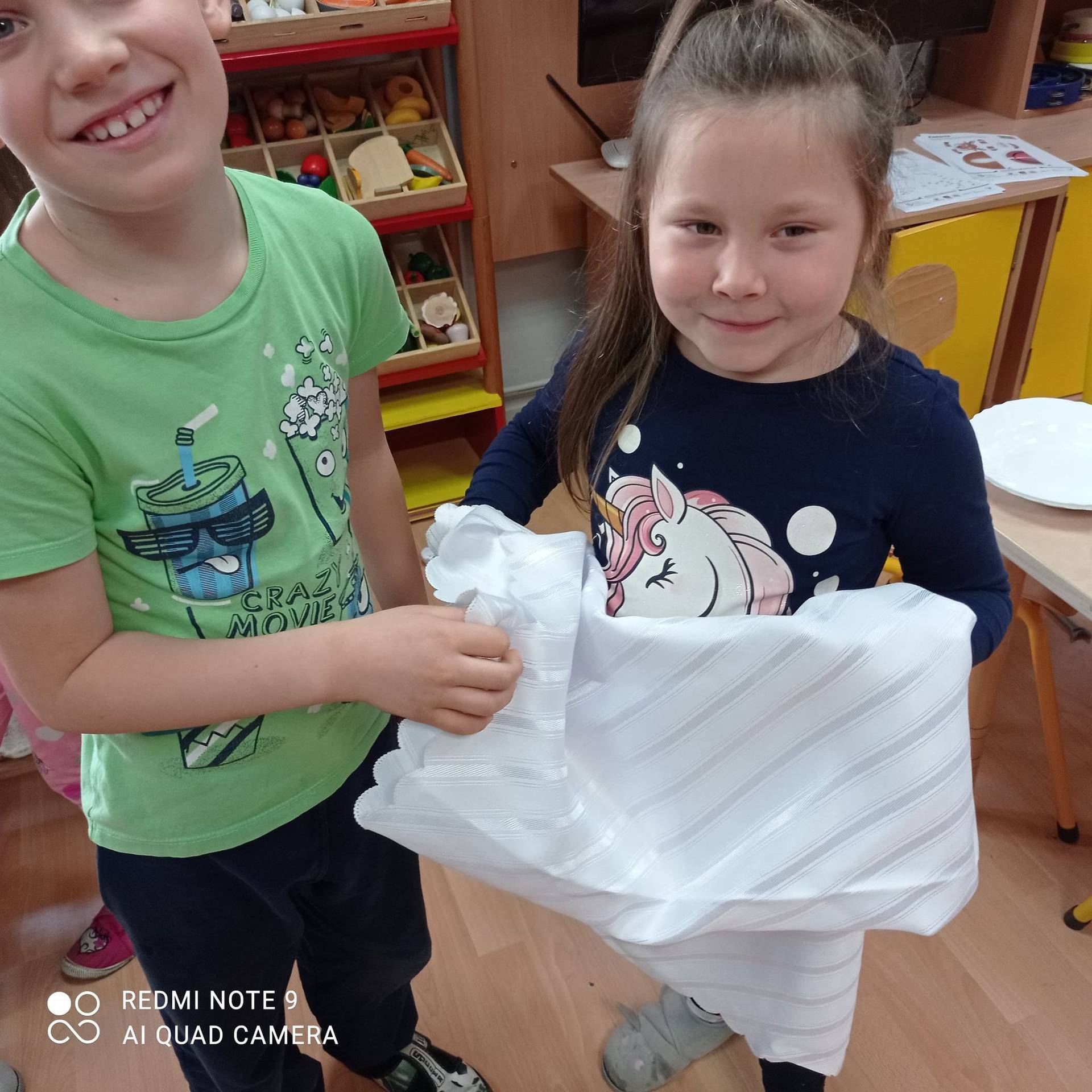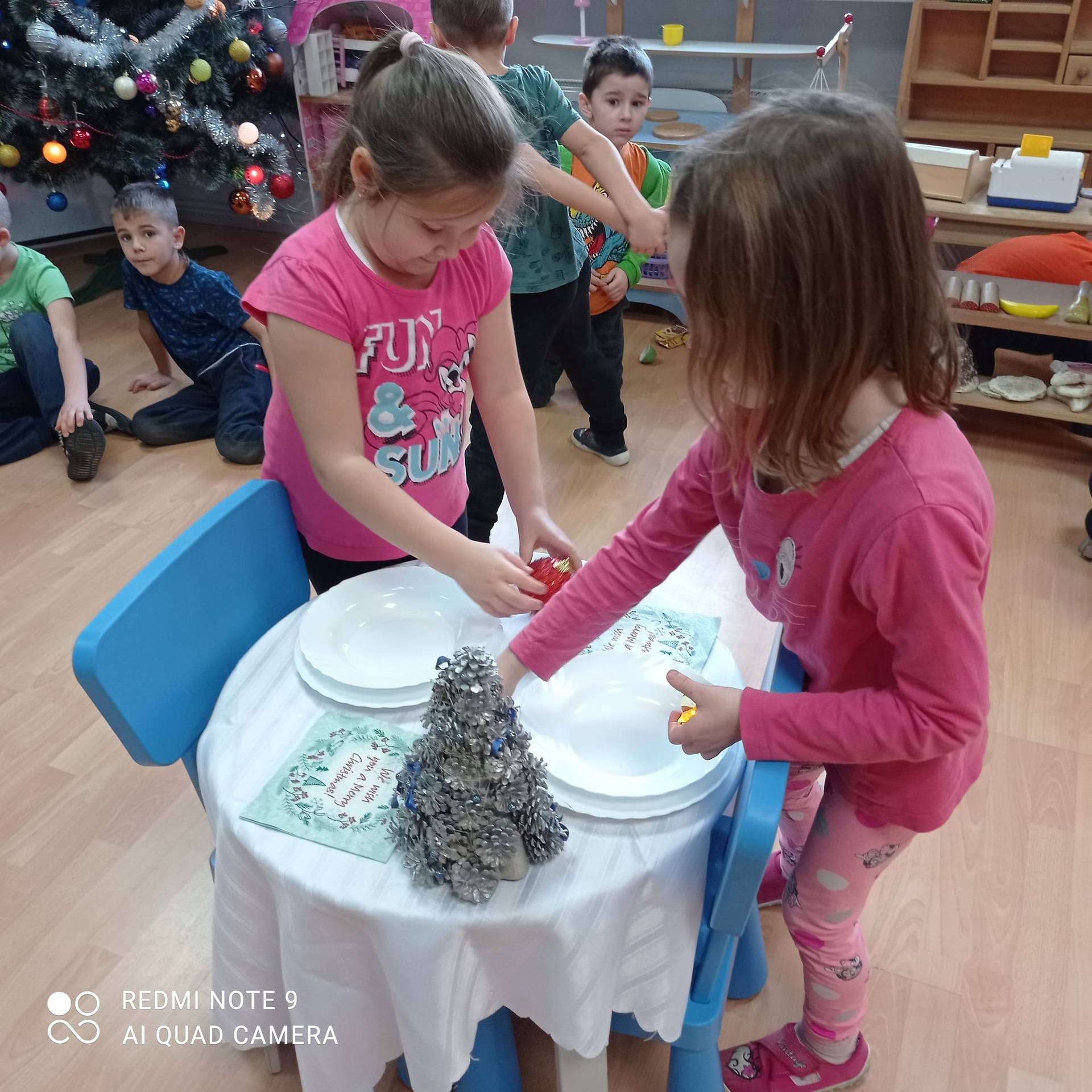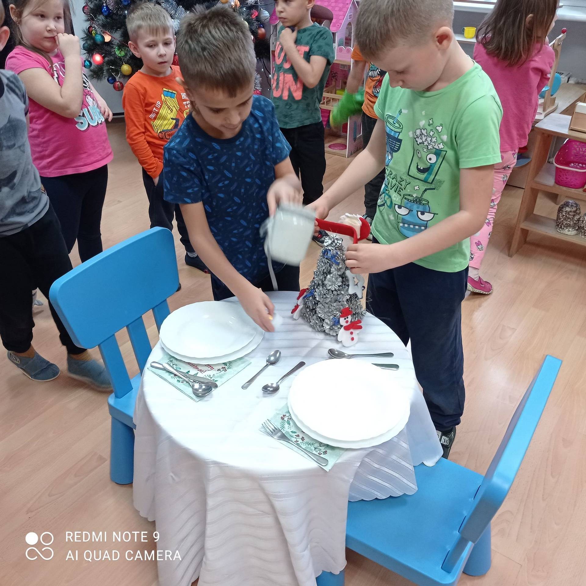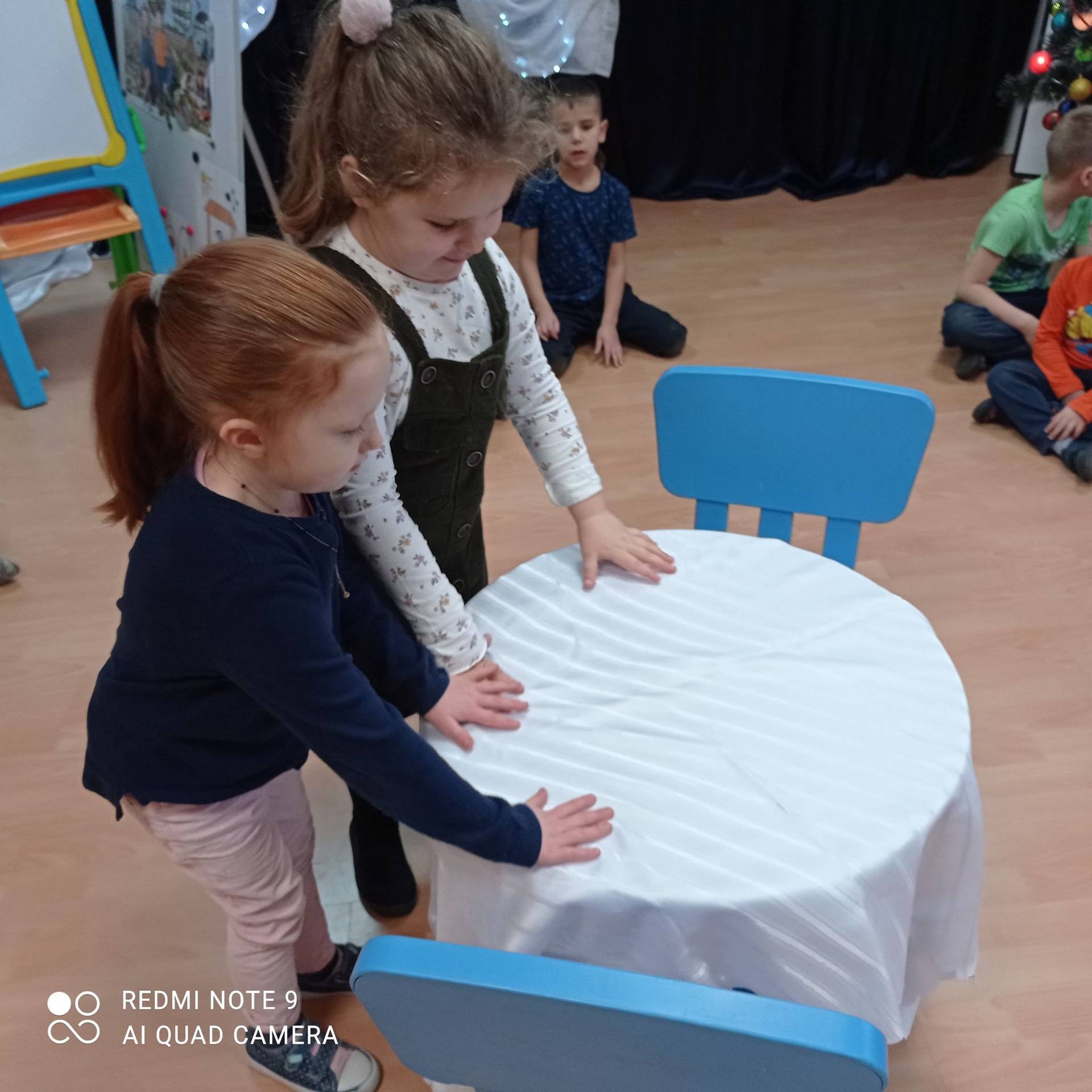Dzieci uczyły się w jaki sposób prawidłowo ułożyć naczynia i sztućce na stole. Każde dziecko miało okazję samo nakryć do stołu i przekonały się, że to wcale nie jest takie proste. Przedszkolaki chętnie angażują się w zadania, które same muszą wykonać. Daje im to wiele radości i ogromną satysfakcję. Dodatkowo dzieci uczyły się składania serwetki na Wigilijny stół.