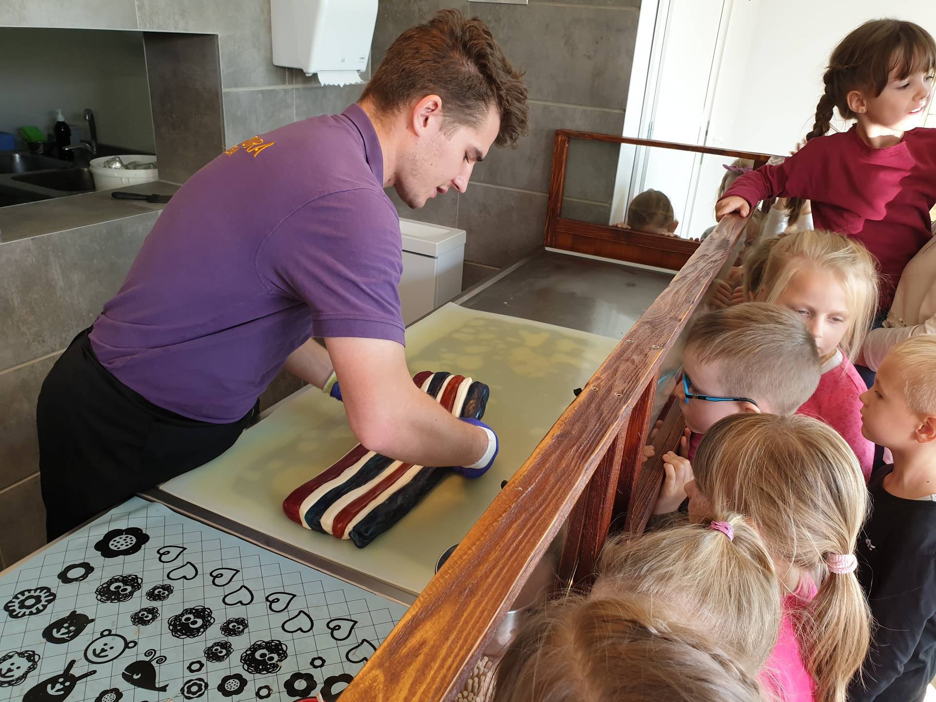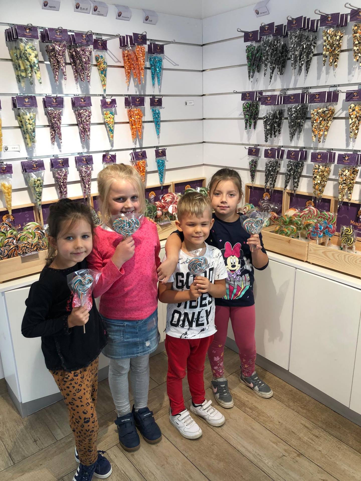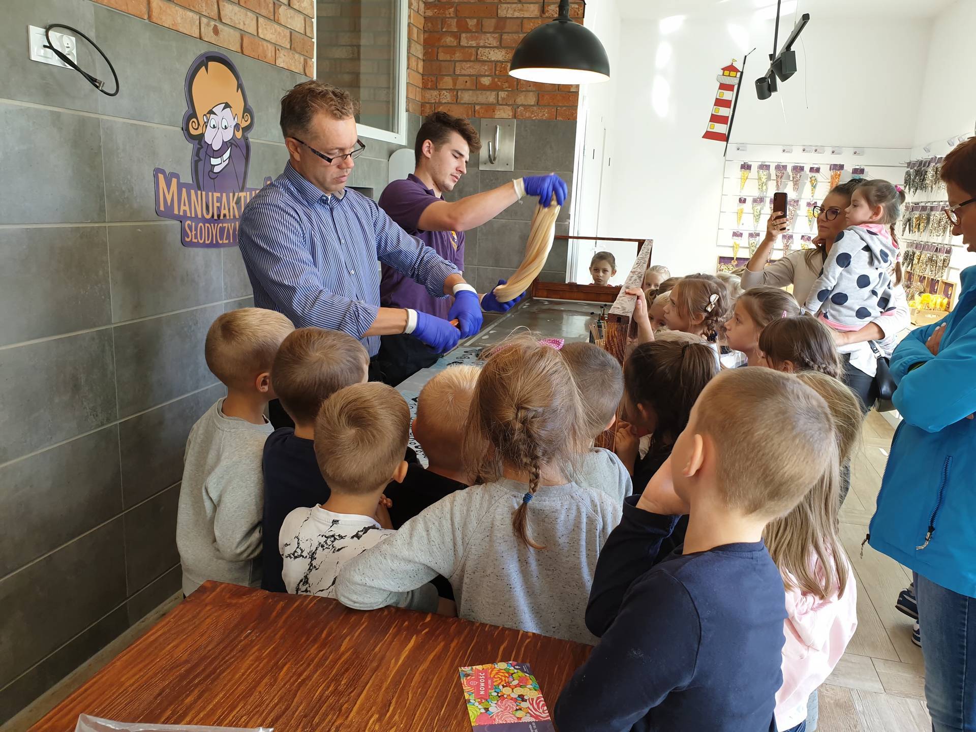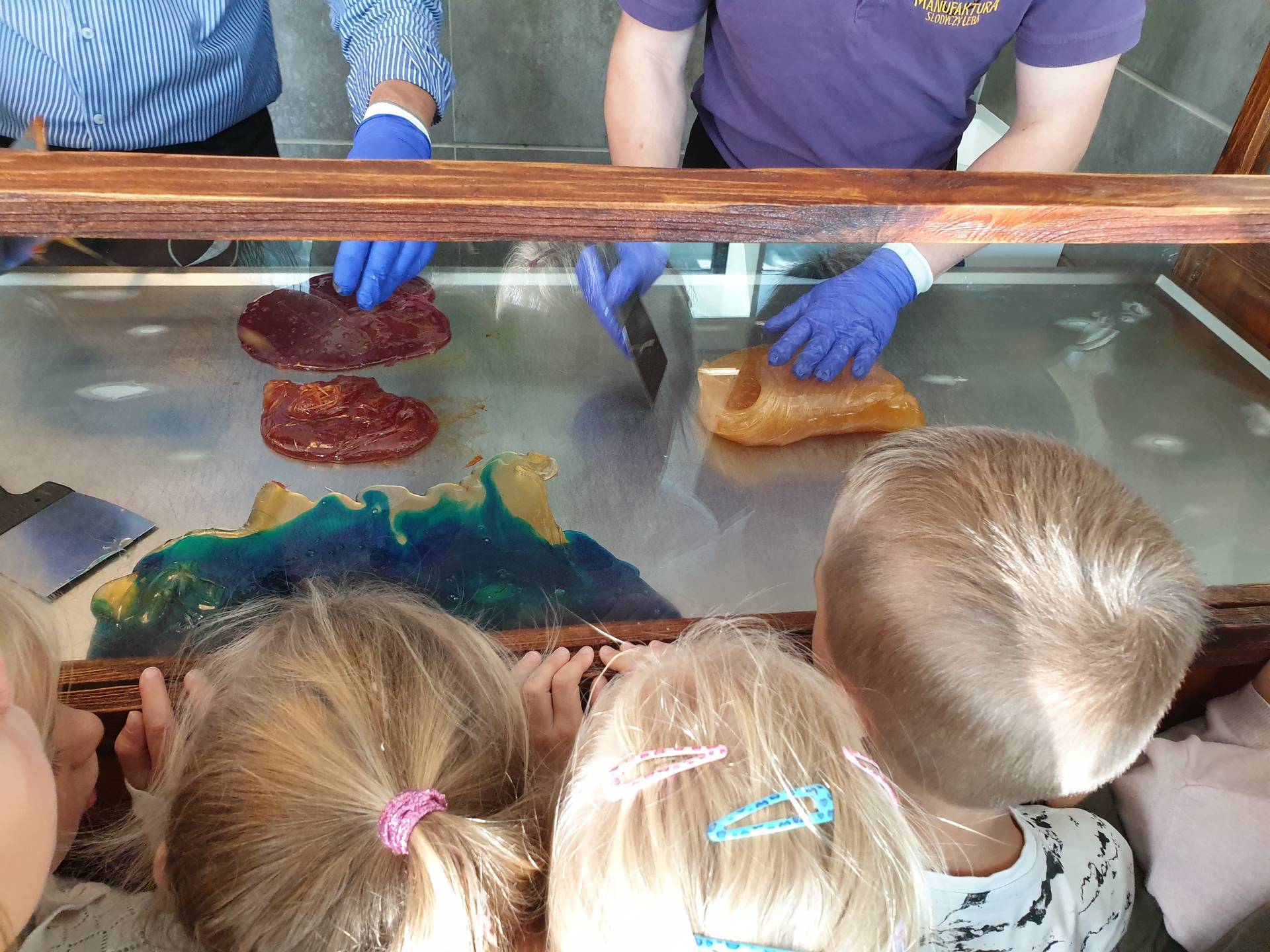 19 września 2019 nasze przedszkolaki spotkała niezwykła frajda, a mianowicie były na wycieczce w Manufakturze Słodyczy w Łebie. Miały okazję na żywo obserwować produkcję kolorowych cukierków i lizaków w przeróżnych smakach, a także samodzielnie przygotowały swoje lizaki. Do domu otrzymały też cukierkowe rożki. Uśmiechnięte i zadowolone wróciły do przedszkola, a w domu delektowały się smakiem cukierków i lizaków.